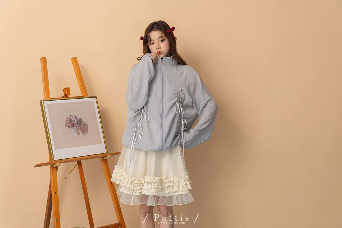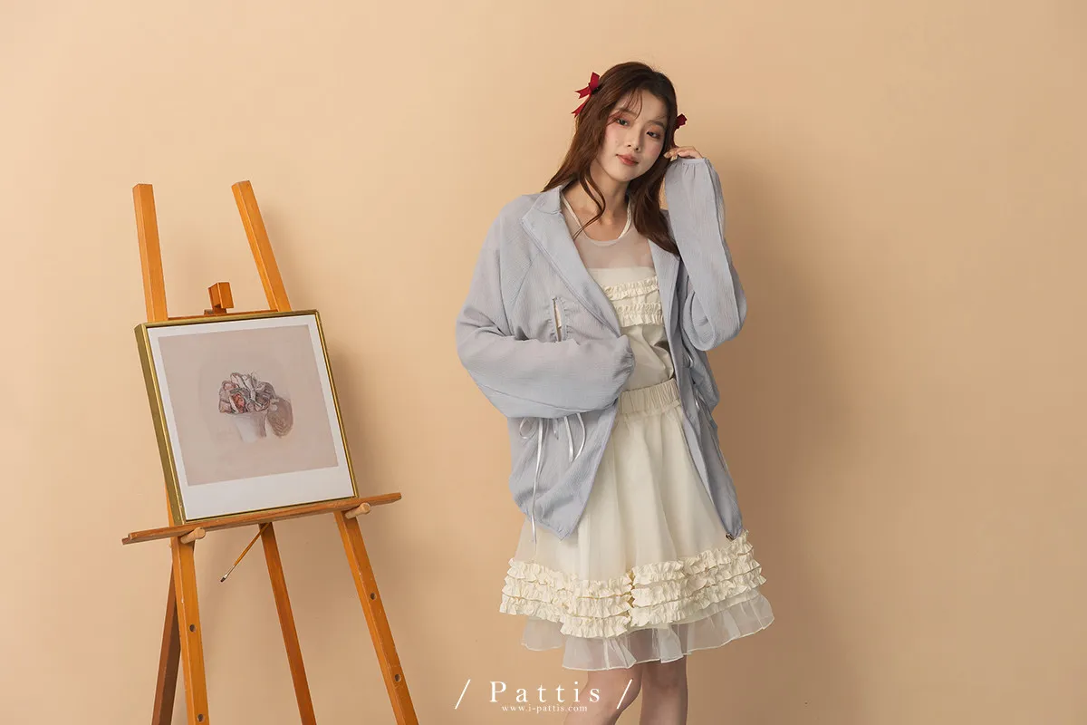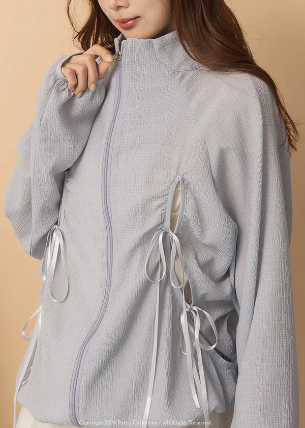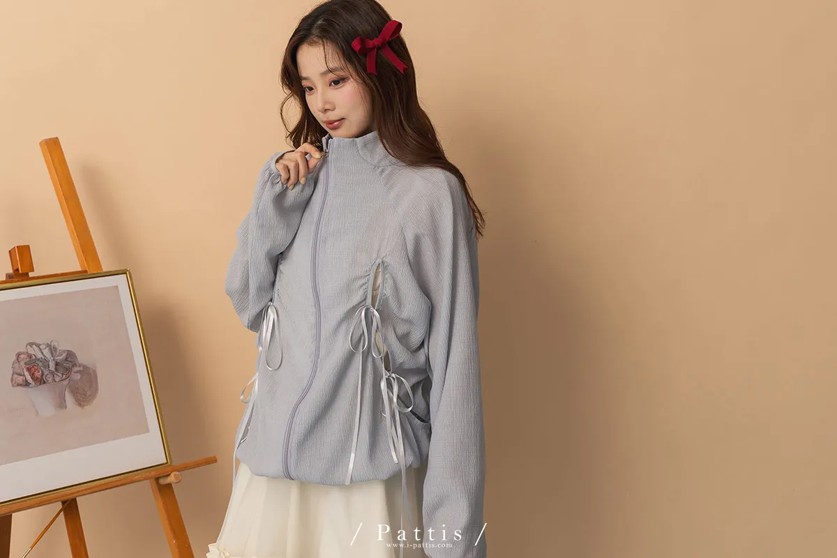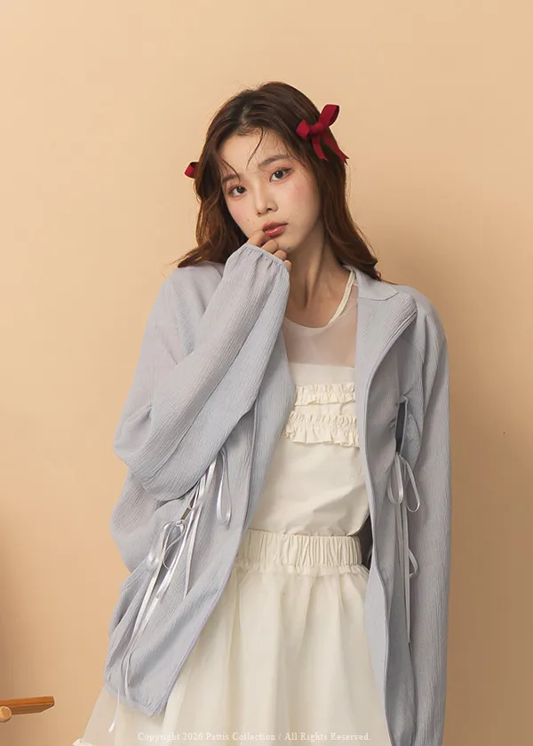 僅限今日的保護色 | 縷空蝴蝶結緞帶拉鍊清透防曬感外套(淺藍)