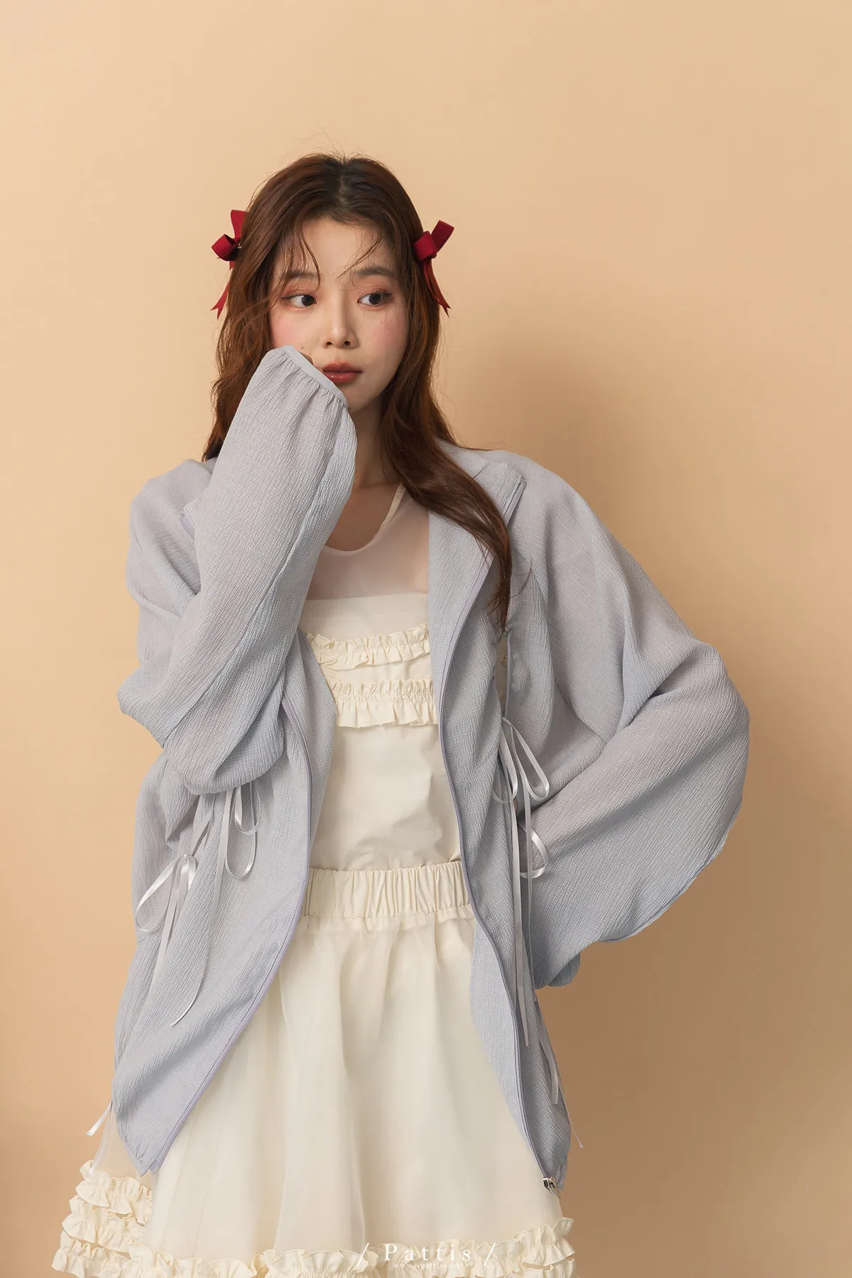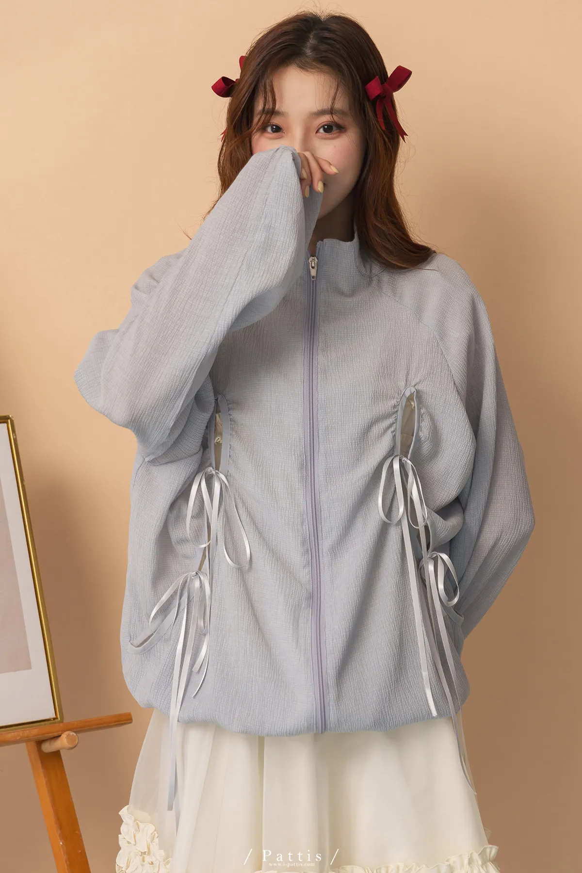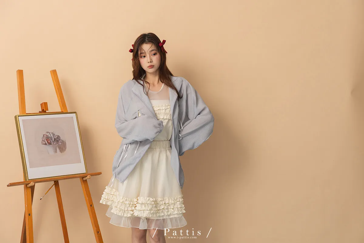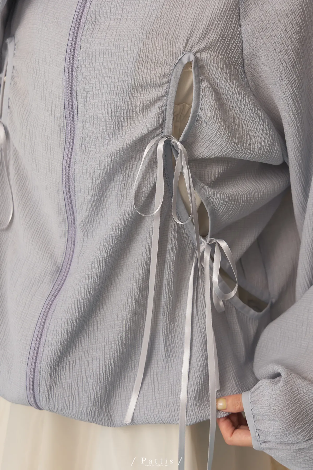 僅限今日的保護色 | 縷空蝴蝶結緞帶拉鍊清透防曬感外套(淺藍)