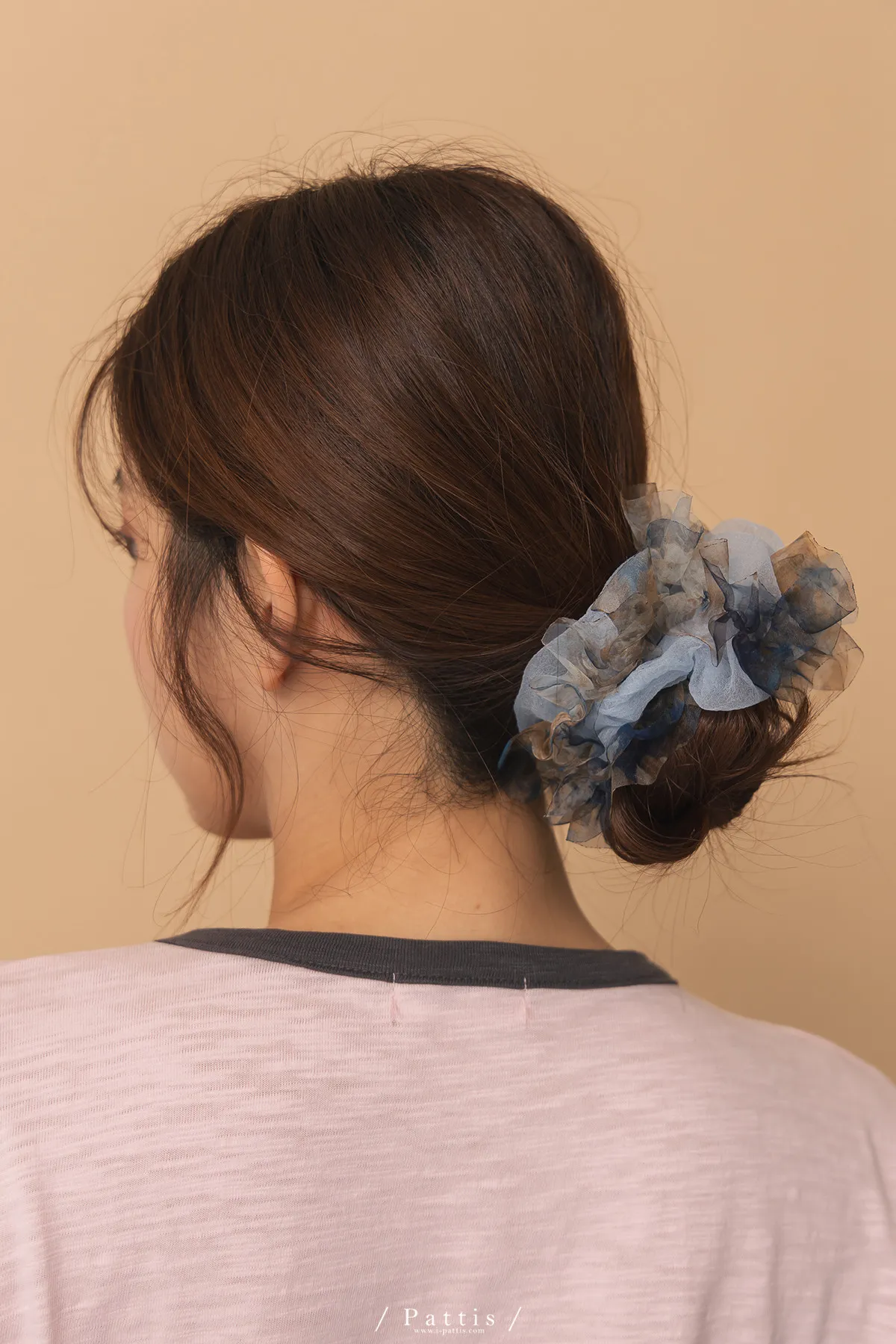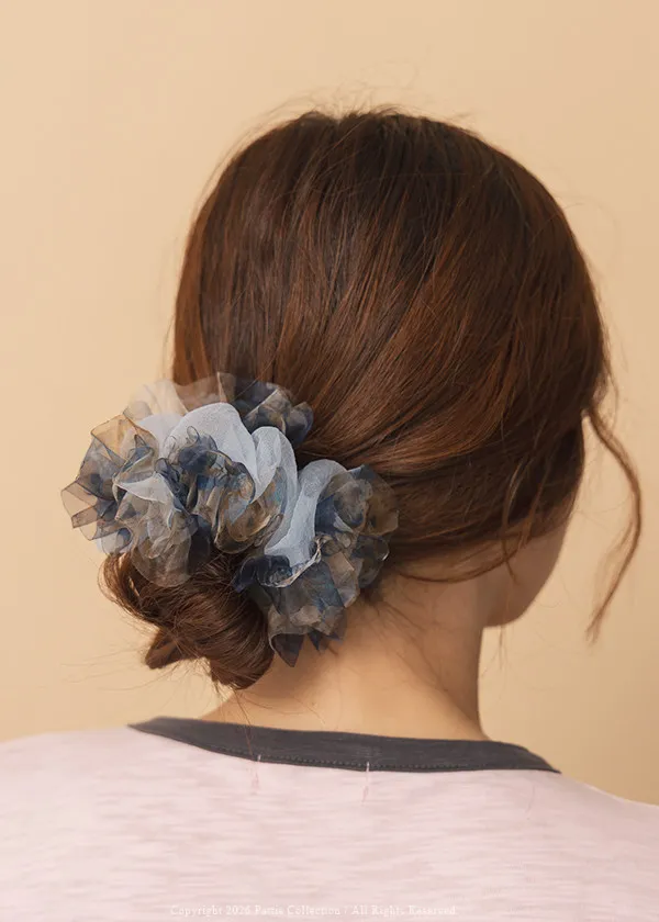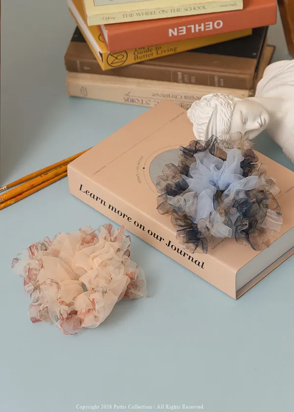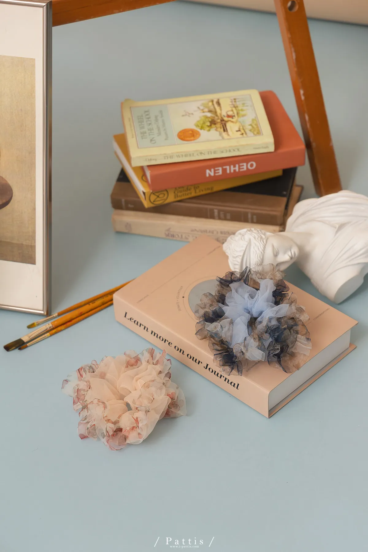 油畫印花雙色拼接網紗髮圈(粉橘/灰藍)