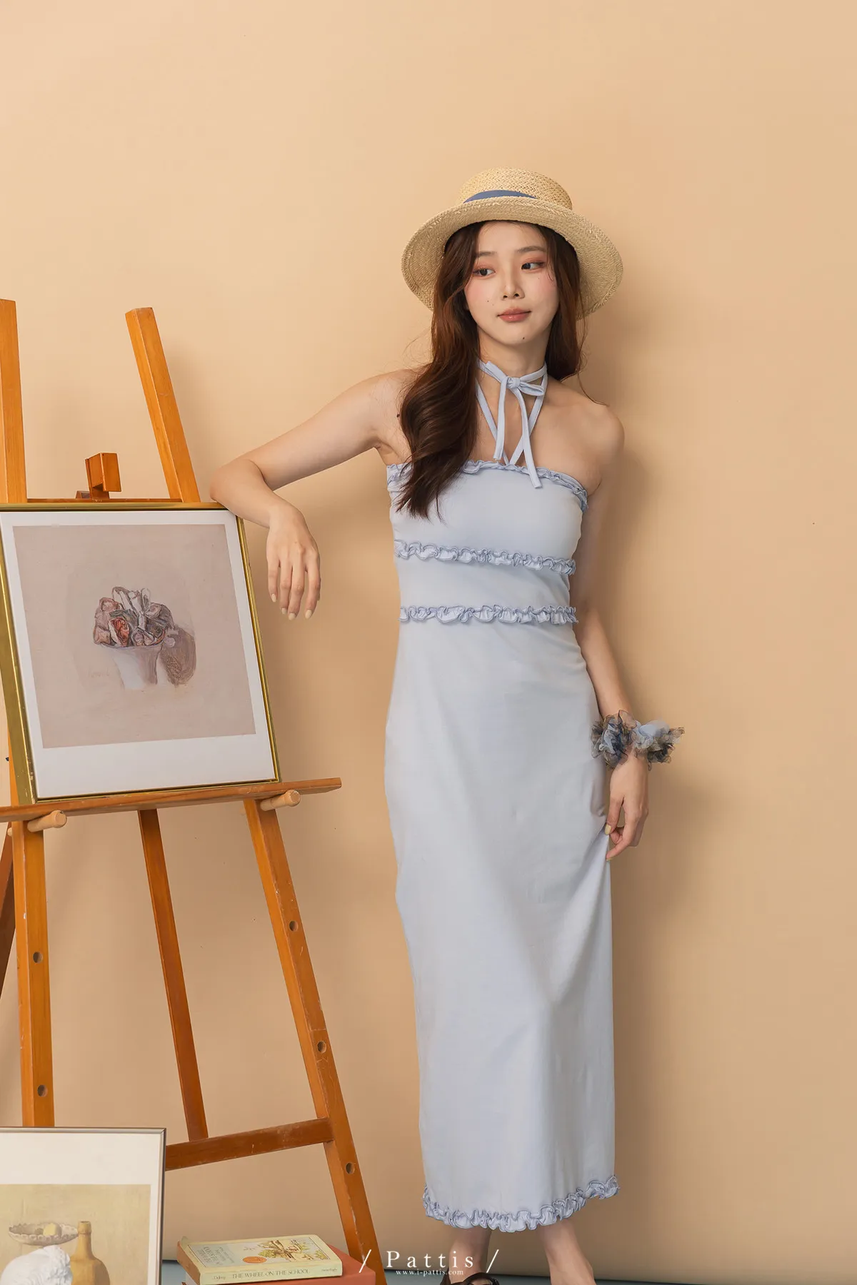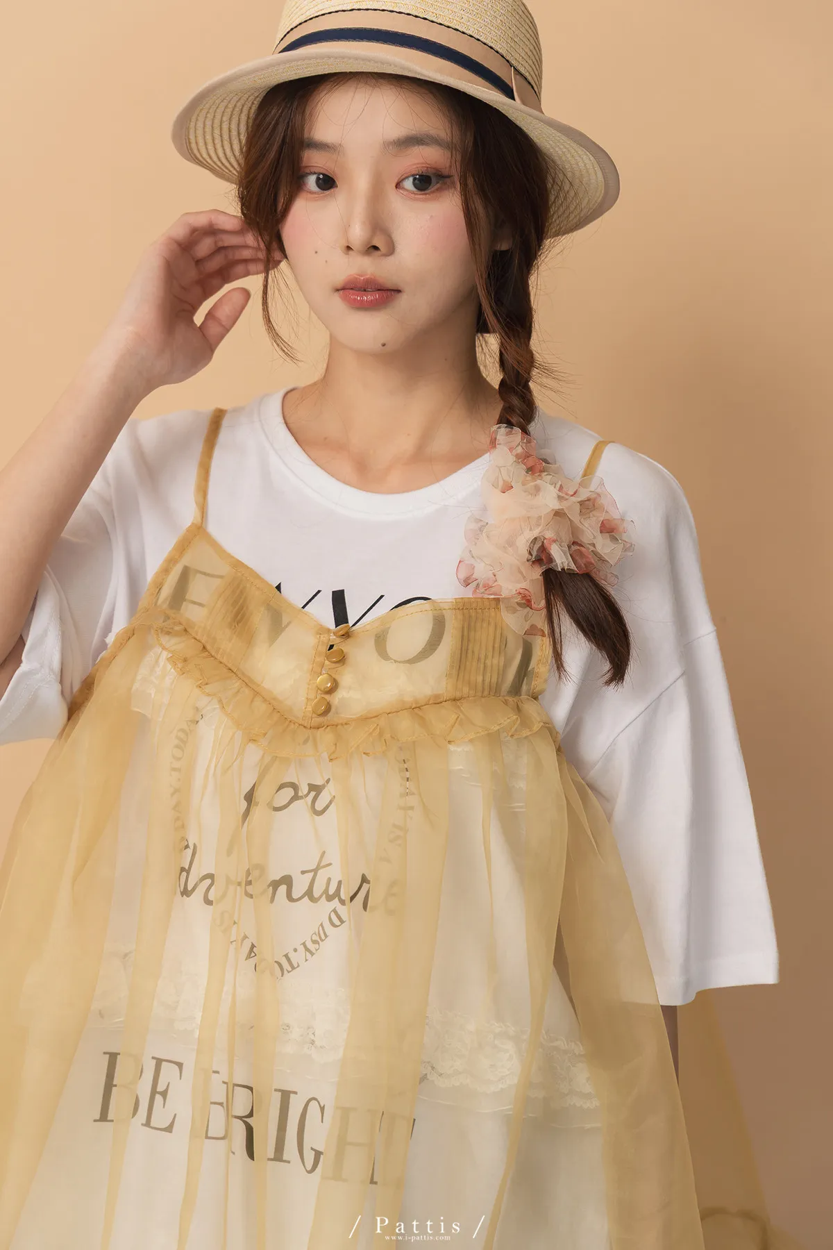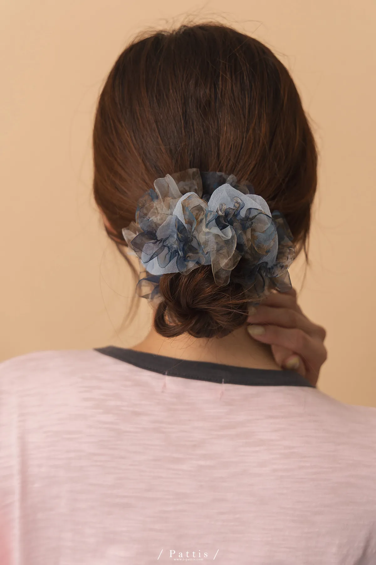油畫印花雙色拼接網紗髮圈(粉橘/灰藍)