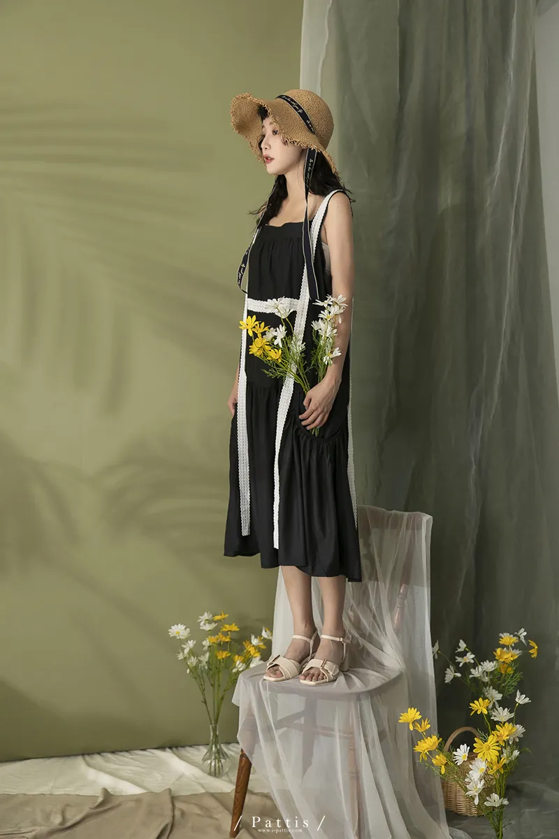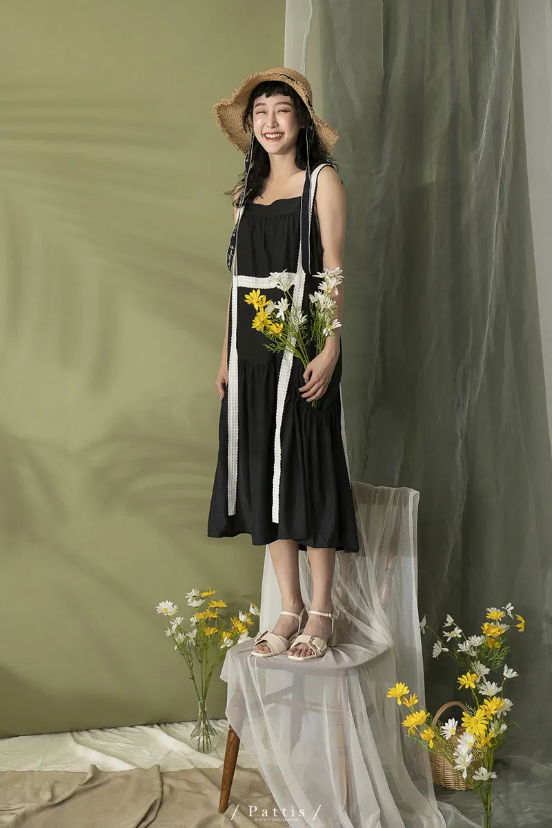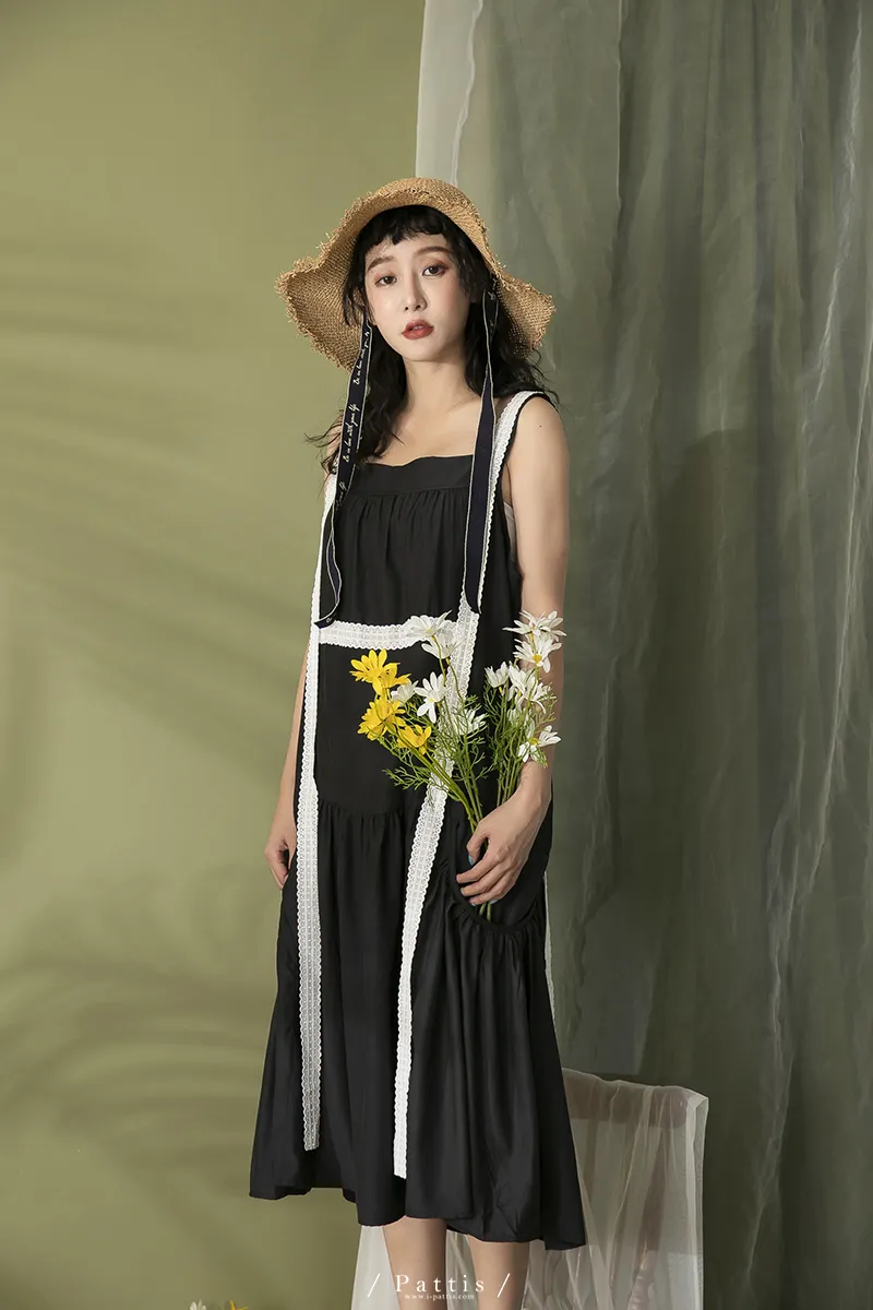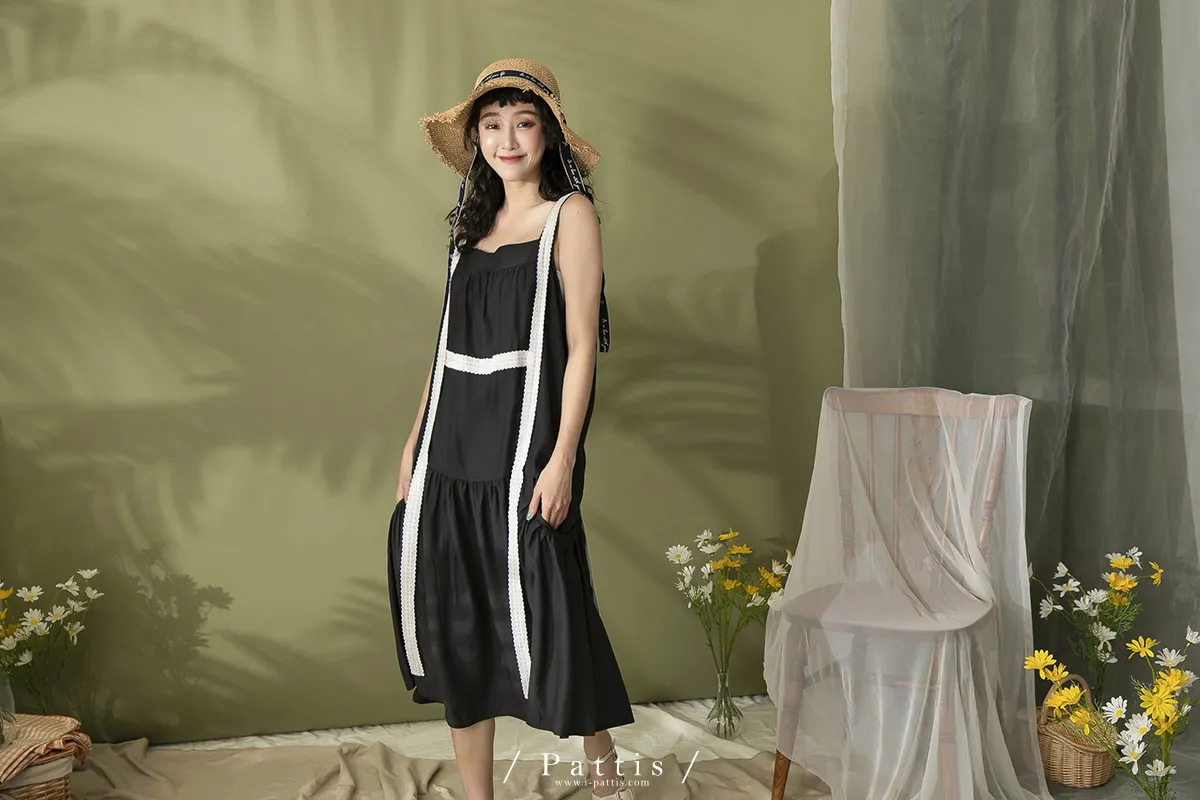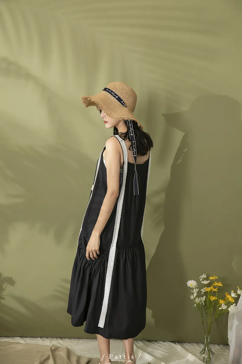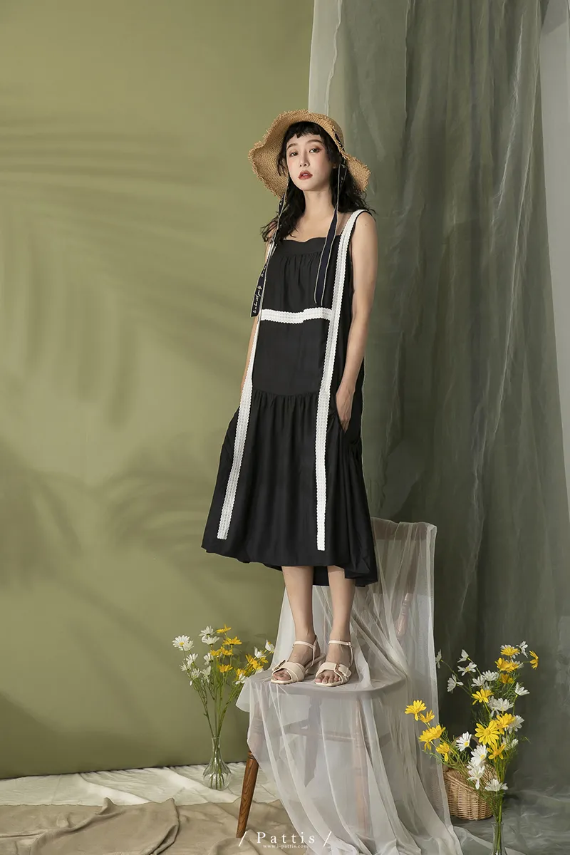 青檸泡泡酒 | 綴蕾絲大口袋背心洋裝(黑)