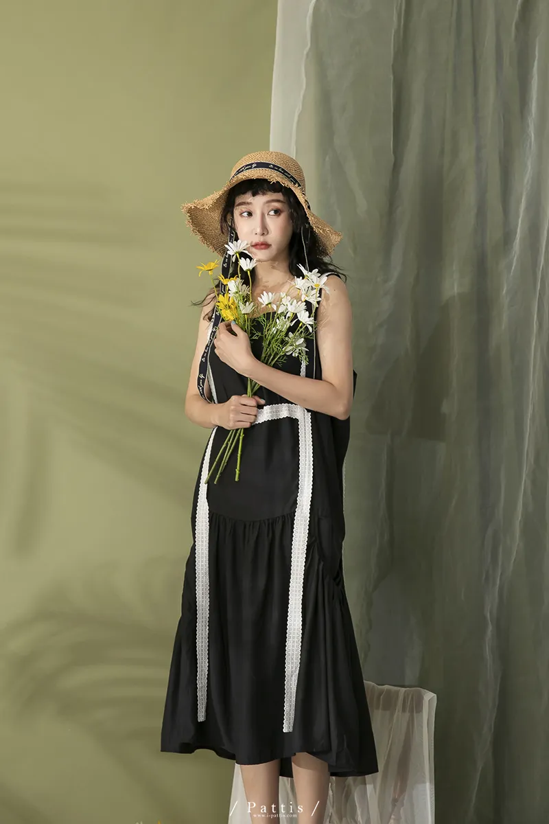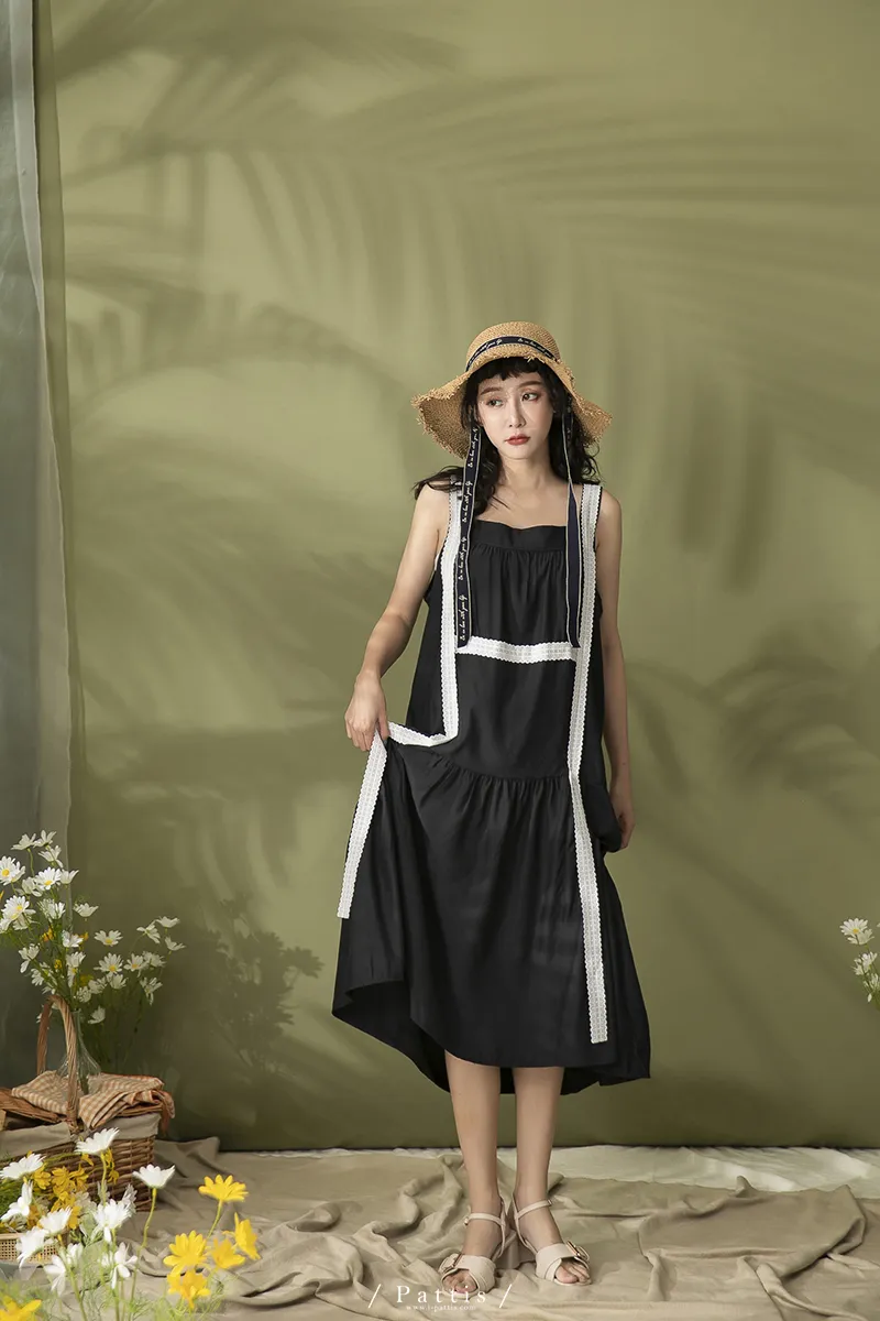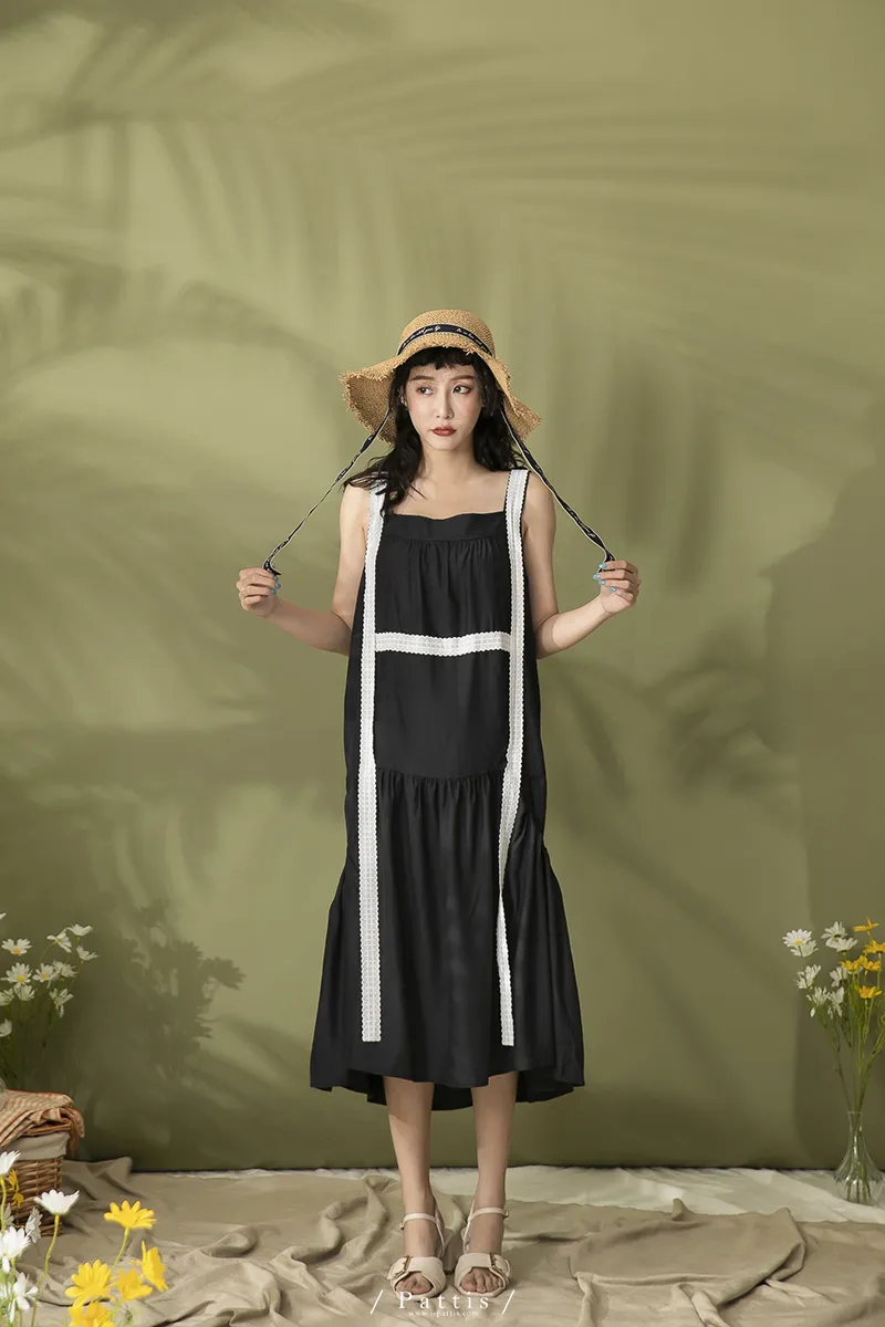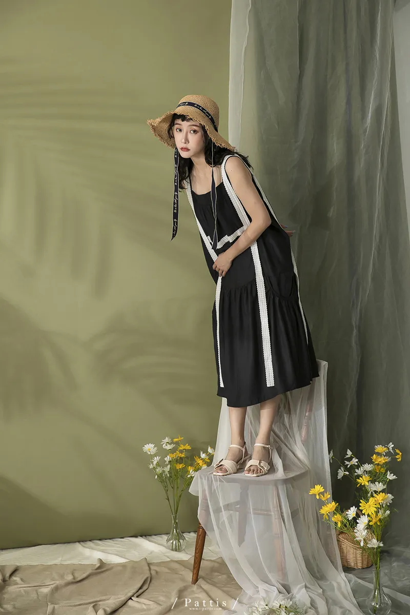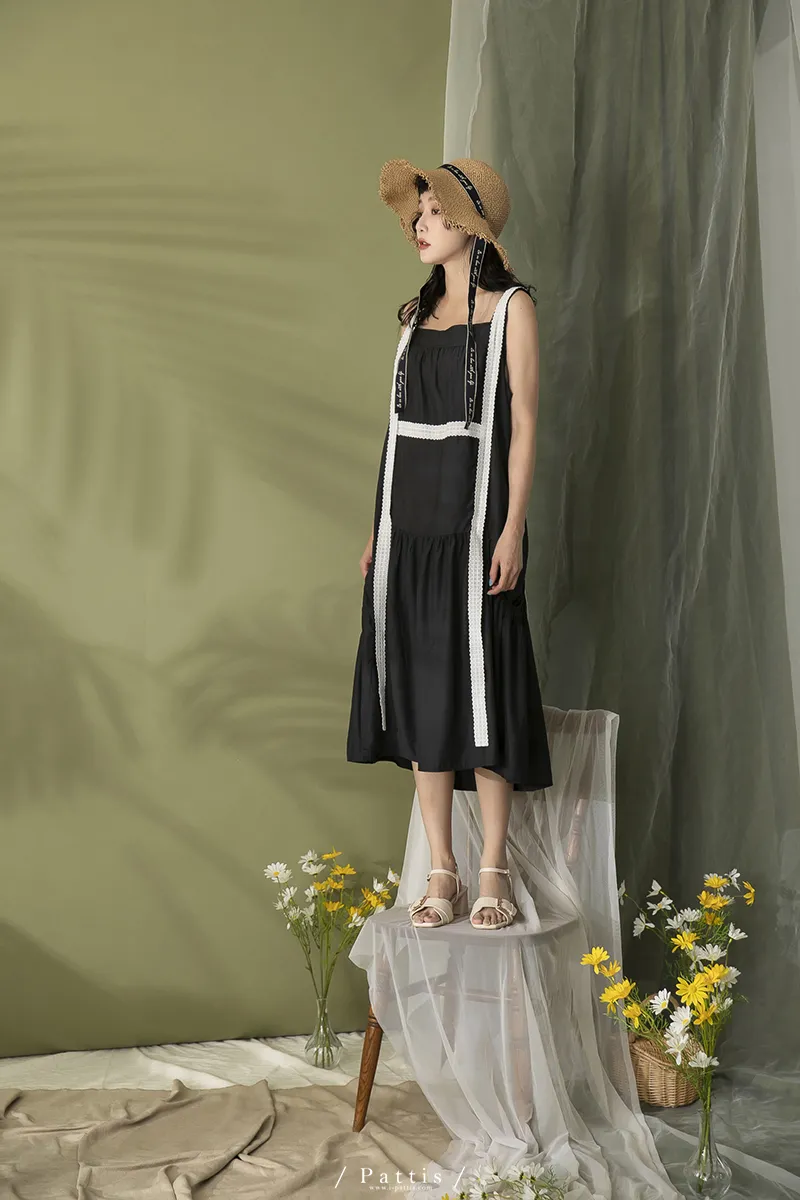 青檸泡泡酒 | 綴蕾絲大口袋背心洋裝(黑)