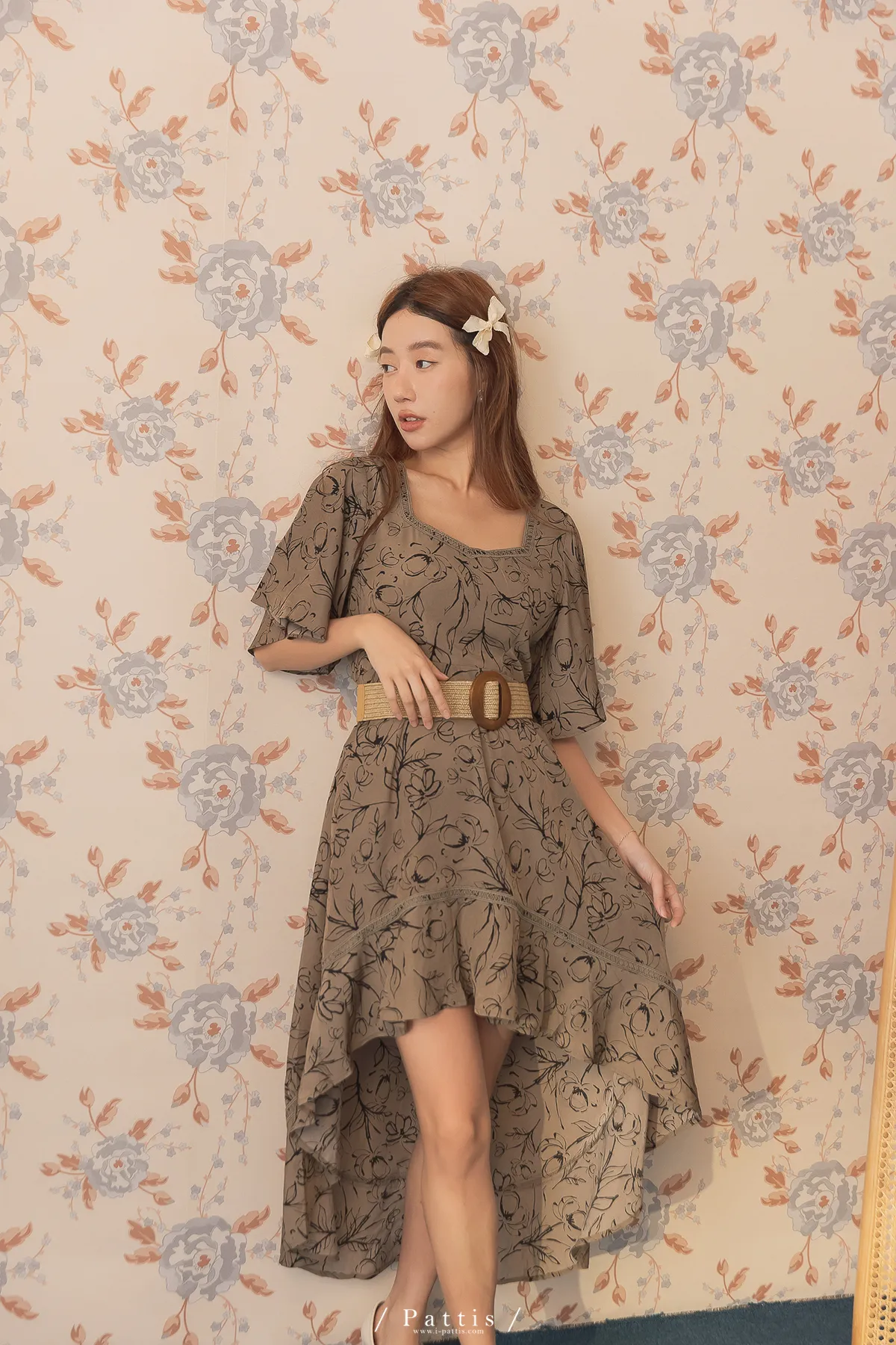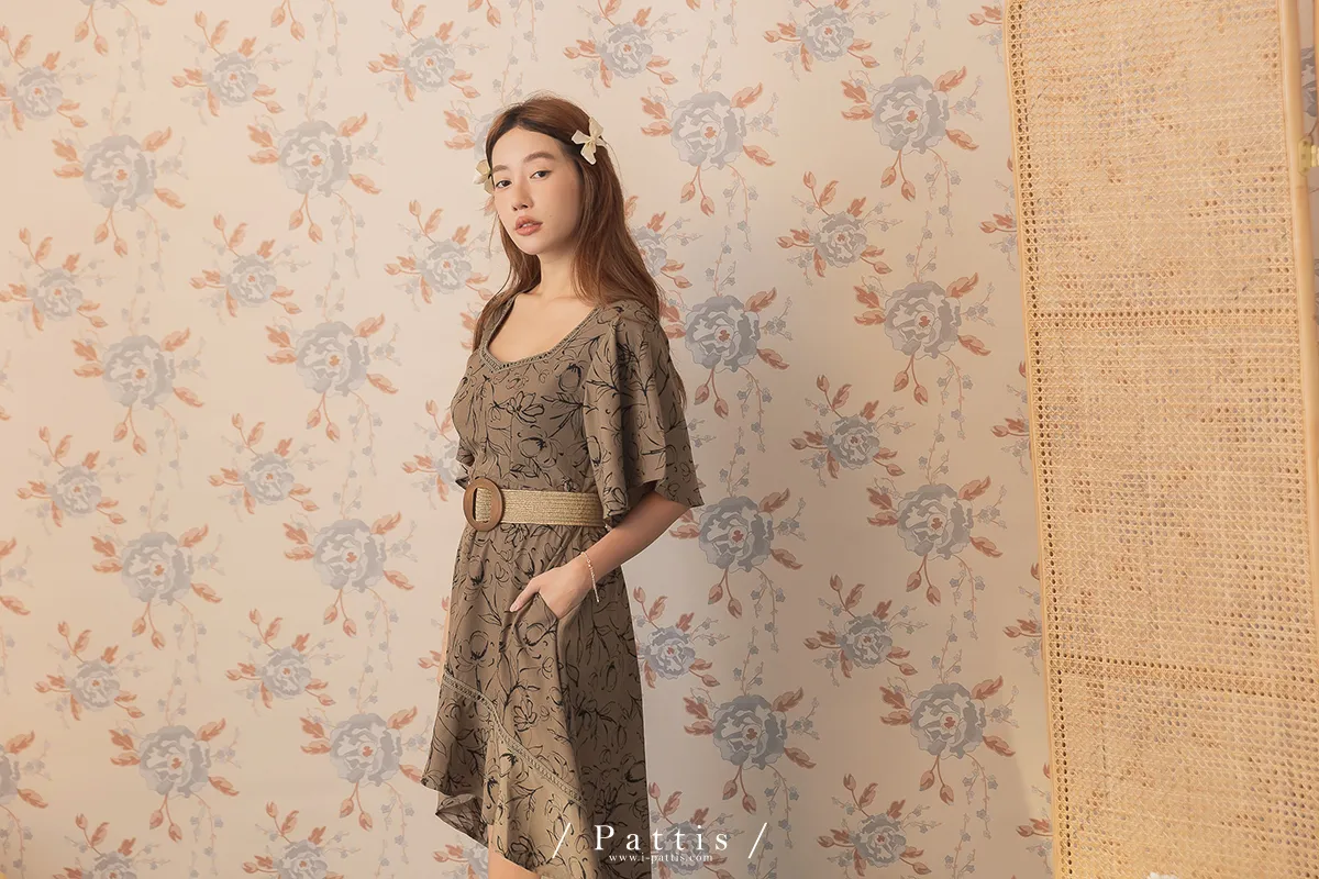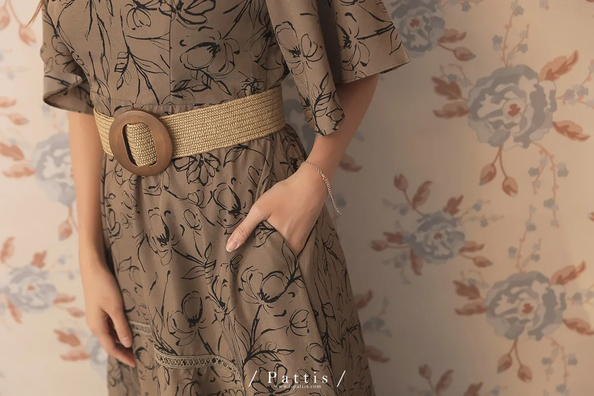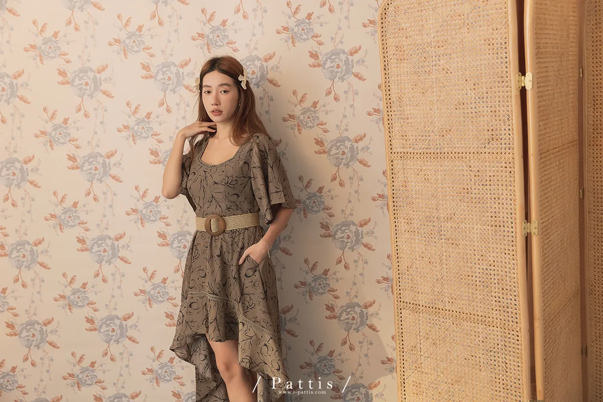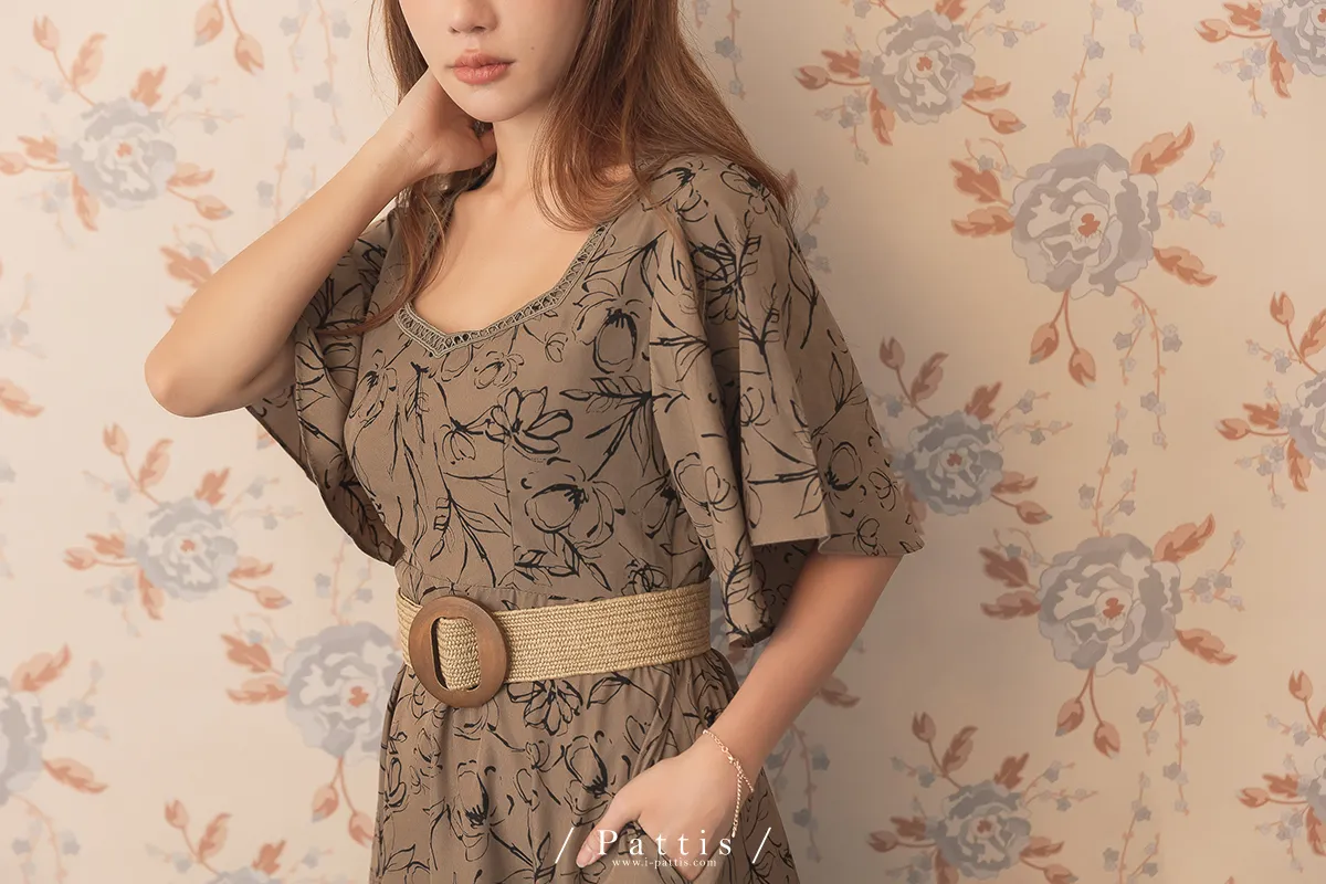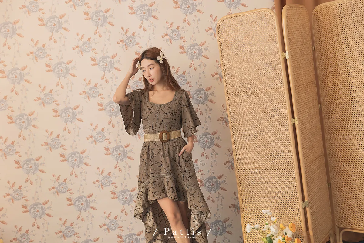 雨林內的優雅探險 | 前短後長綴蕾絲印花洋裝(深綠)