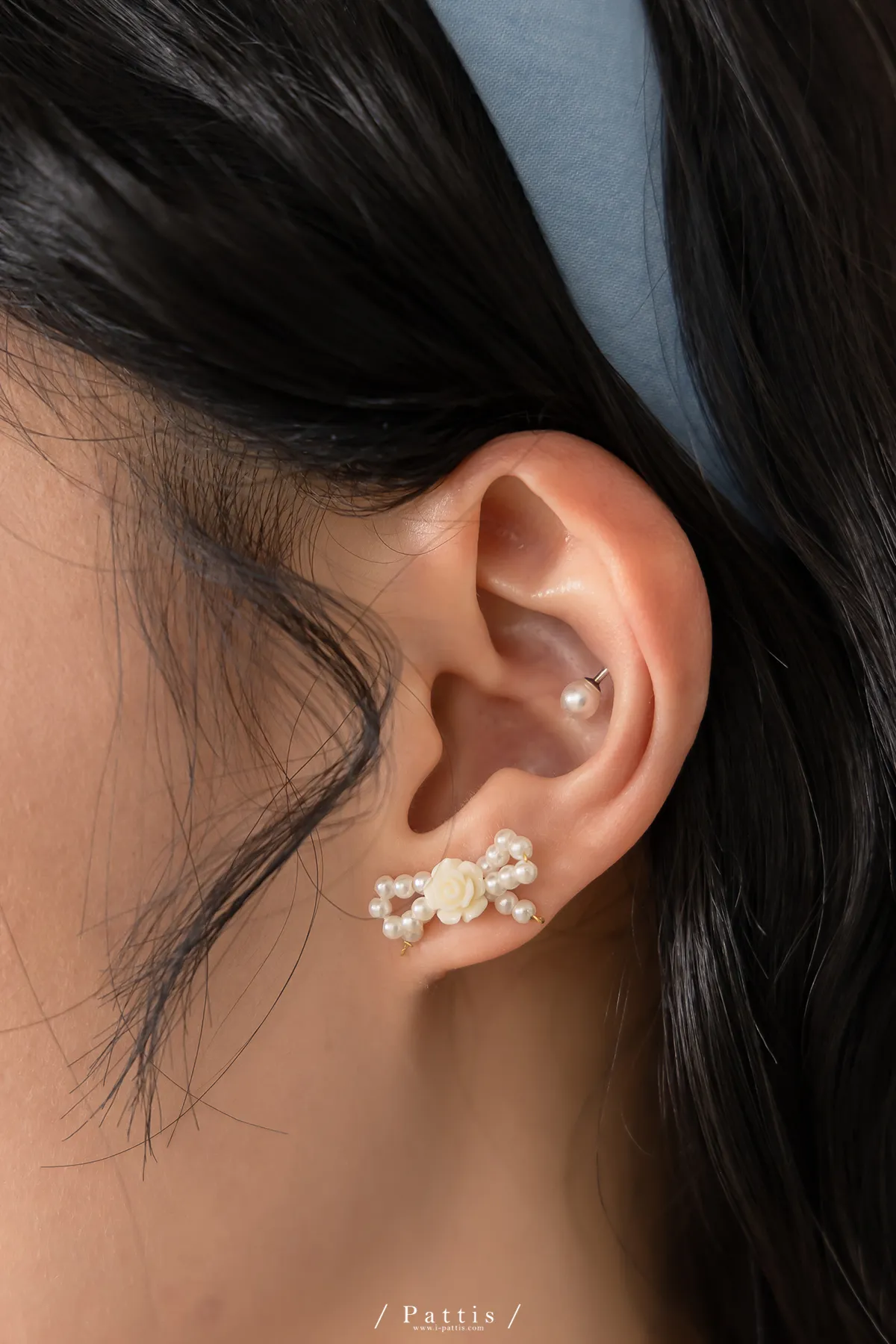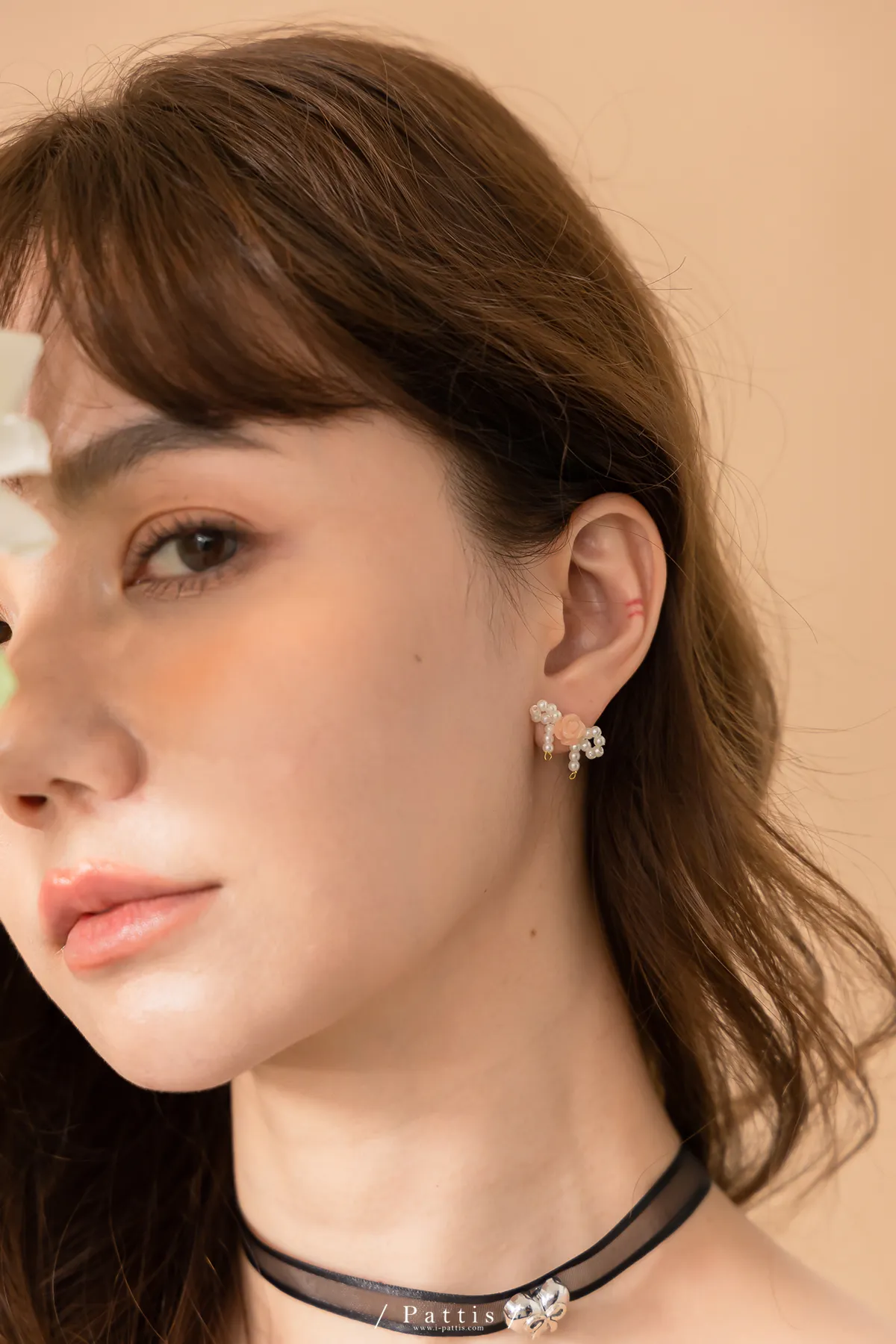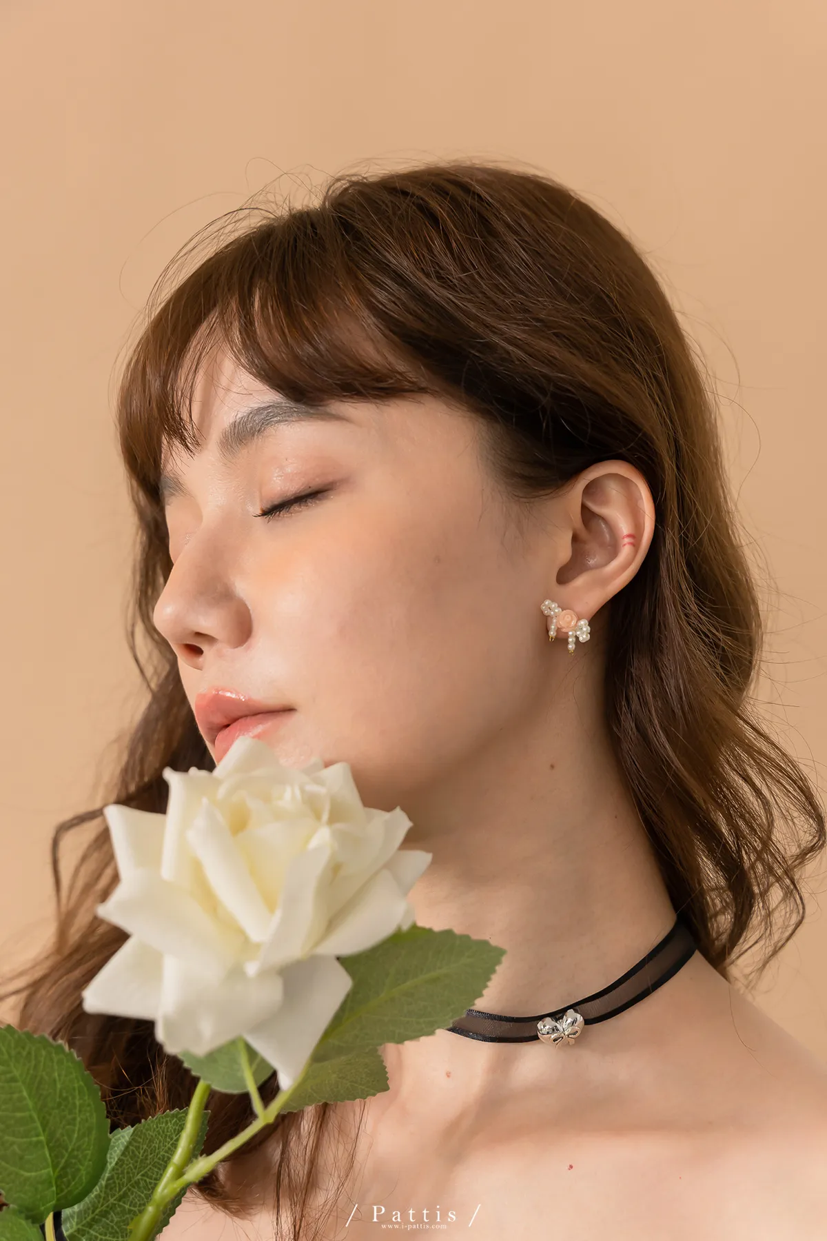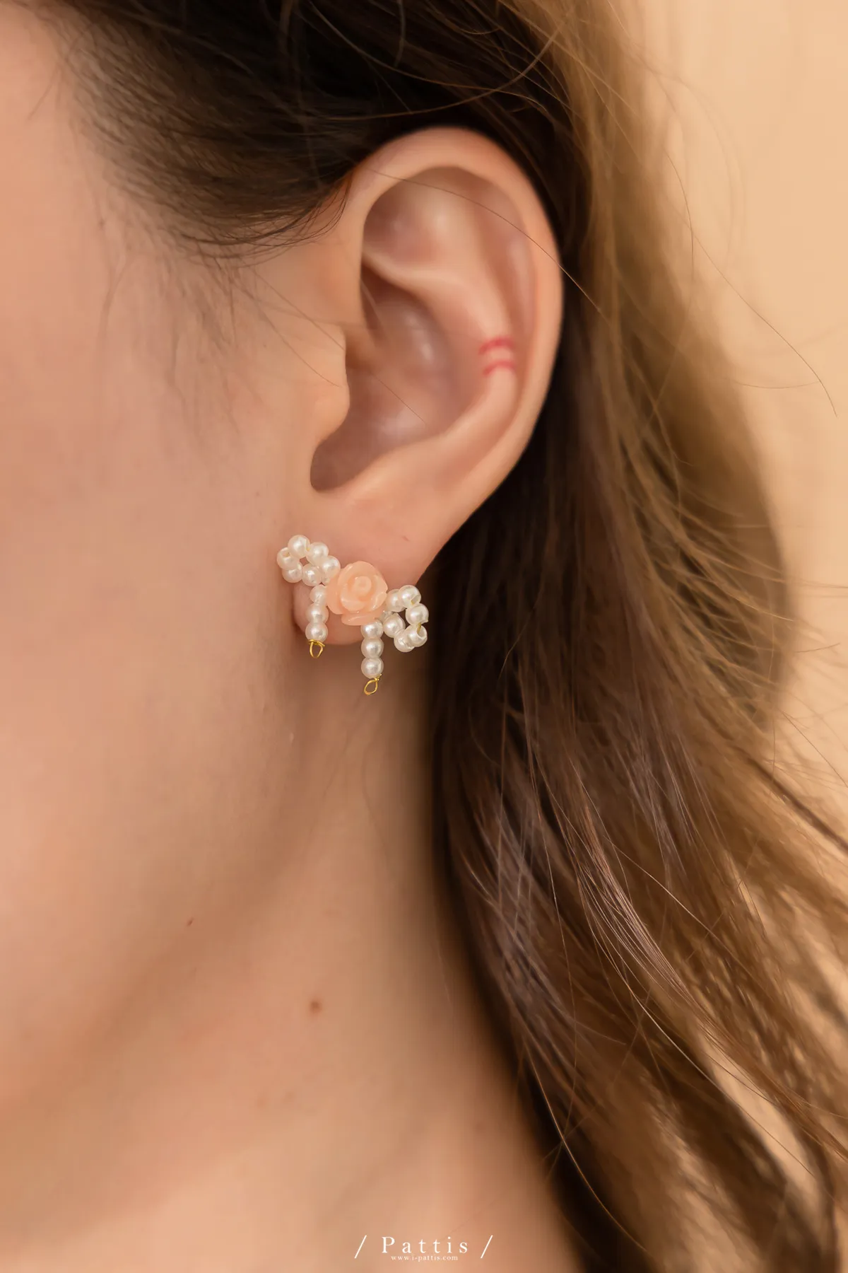 蝴蝶結造型珍珠玫瑰耳環(白/粉)