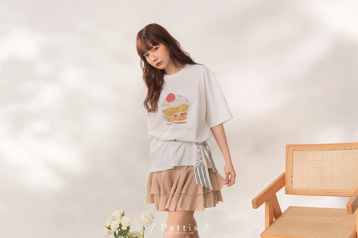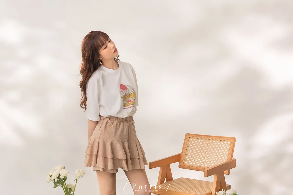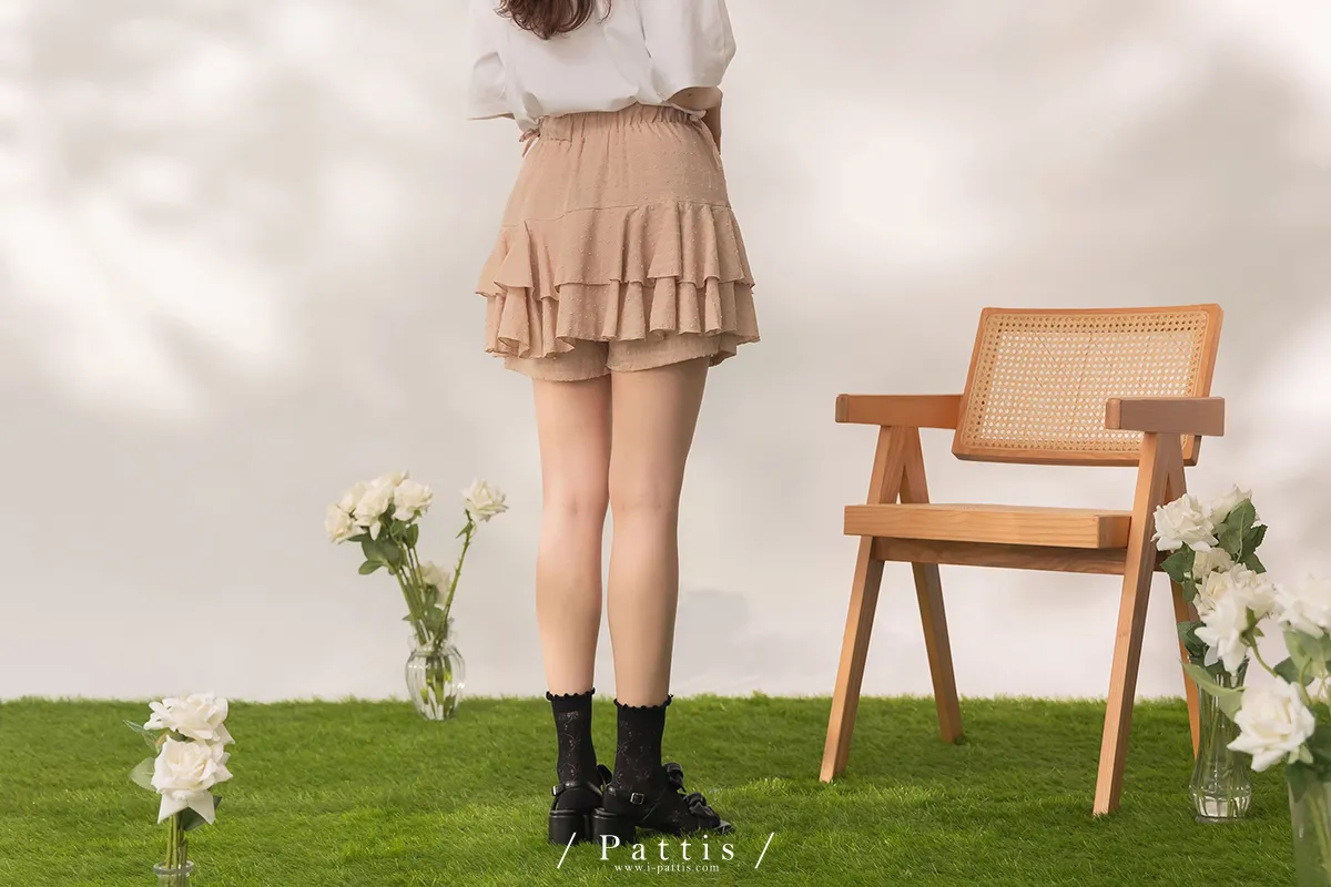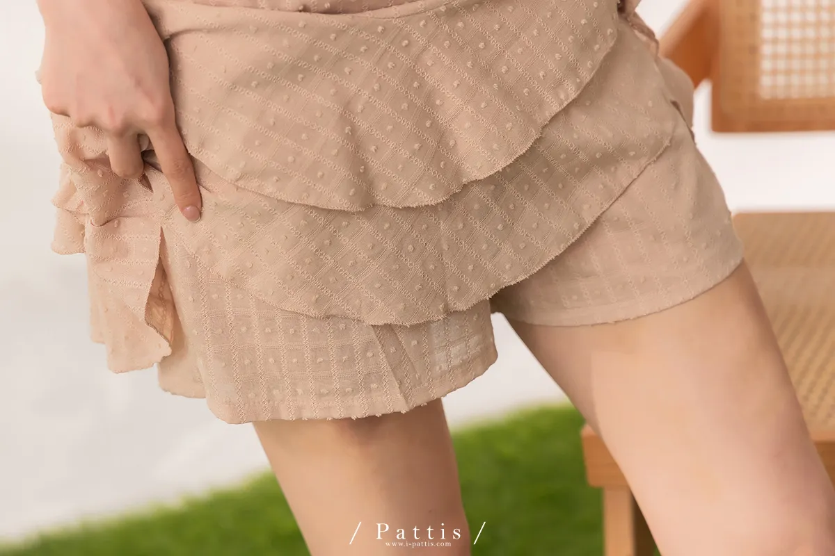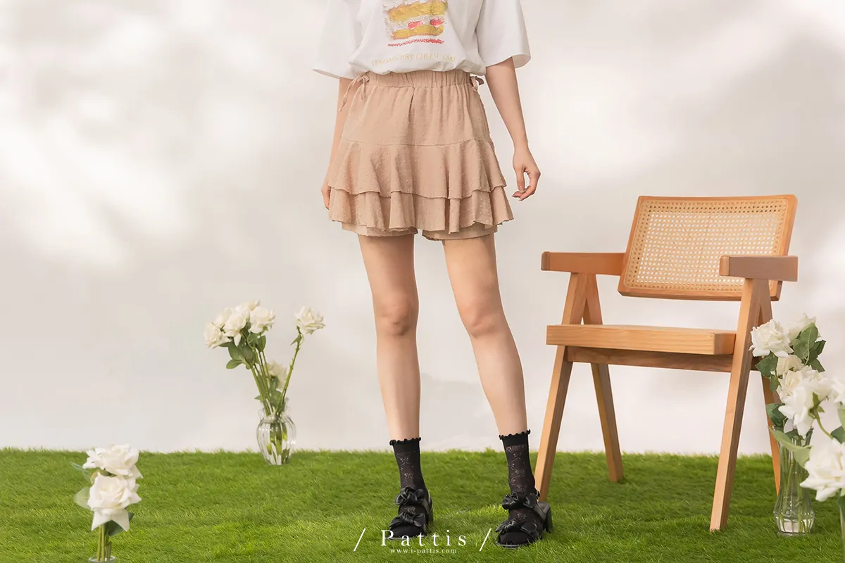 (現貨) 栗子與黑栗奶油塔 | 點點浮雕格紋蛋糕抽繩短褲裙(奶茶棕)