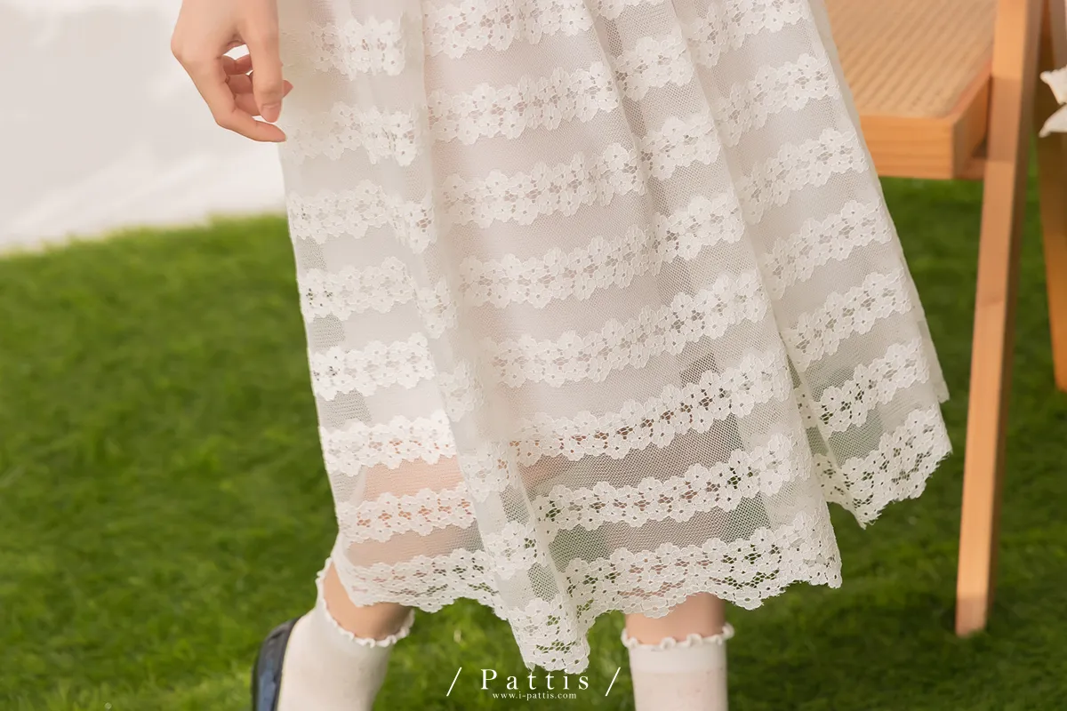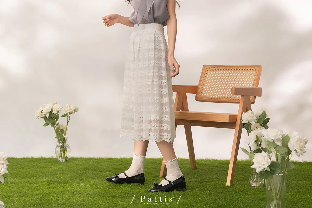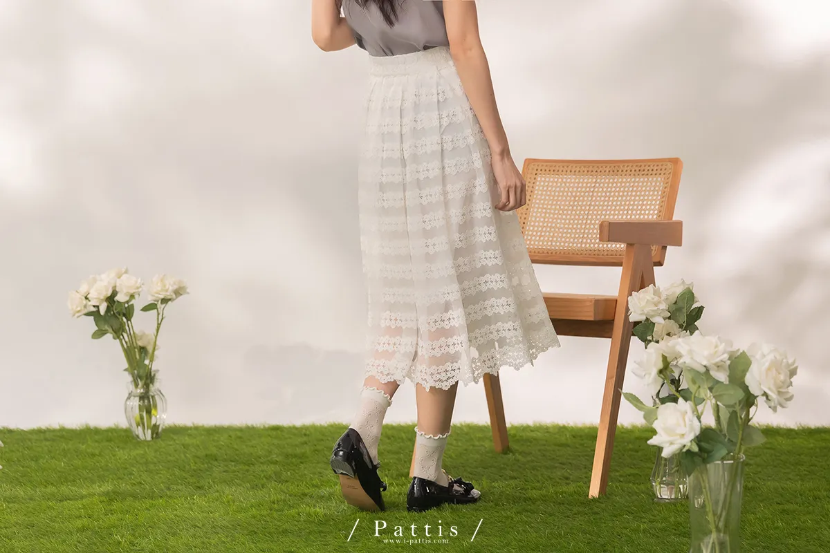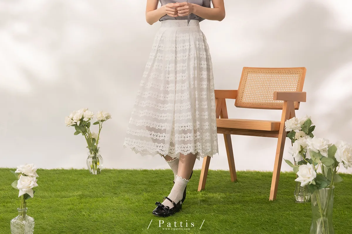 (現貨) 花朵綴成你的樂譜 | 蕾絲布雙層造型高腰百褶裙(白)