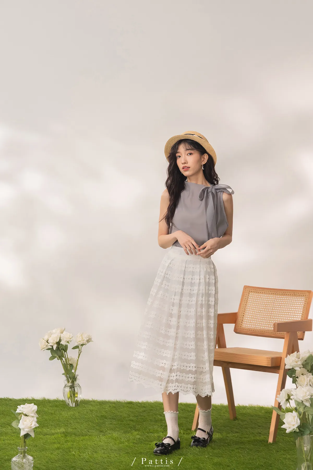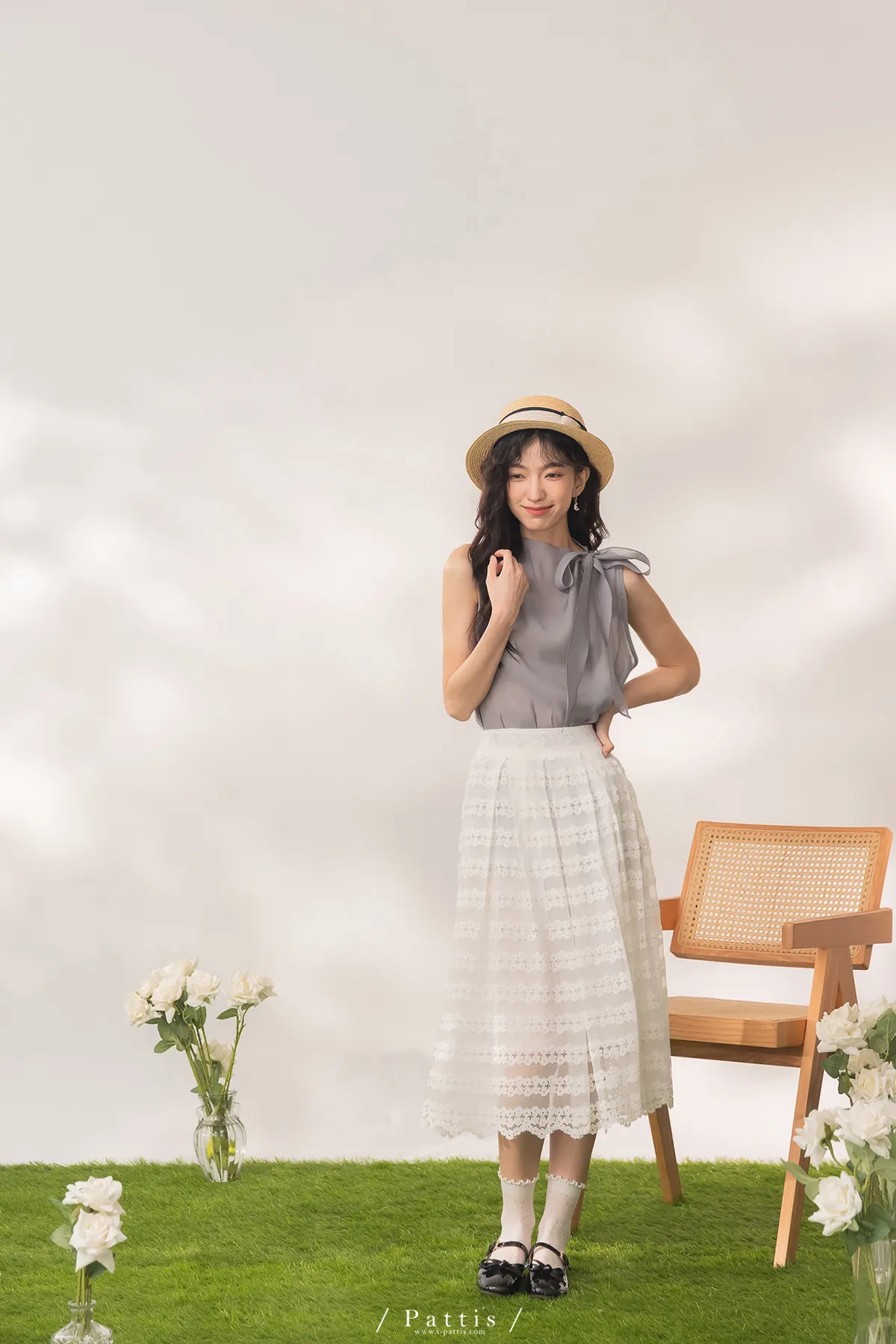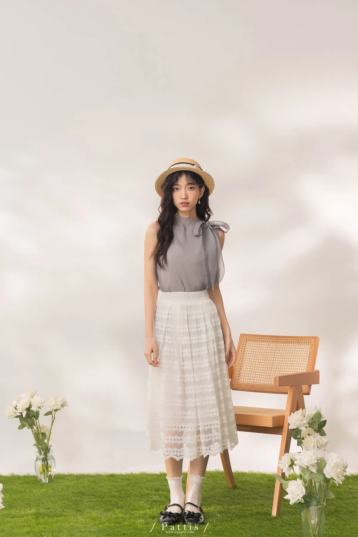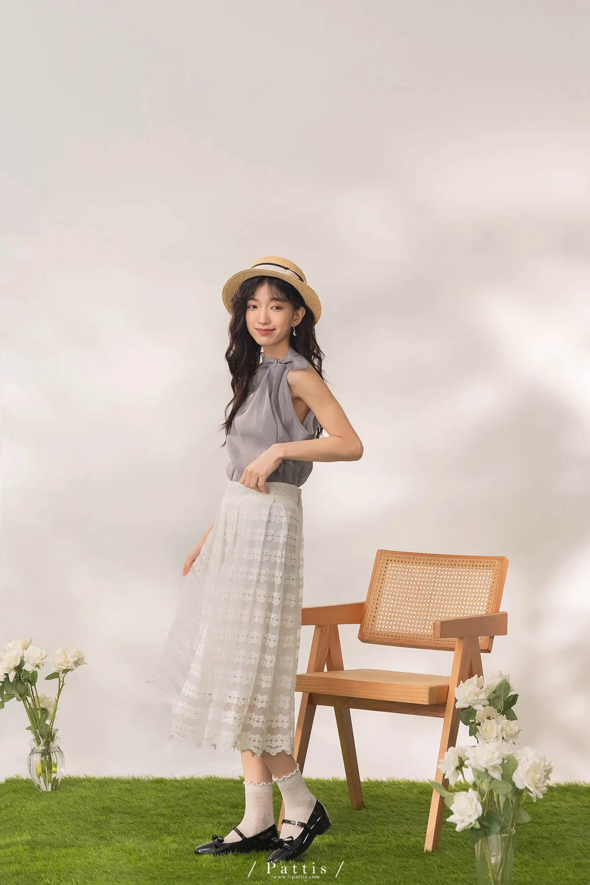 (現貨) 花朵綴成你的樂譜 | 蕾絲布雙層造型高腰百褶裙(白)