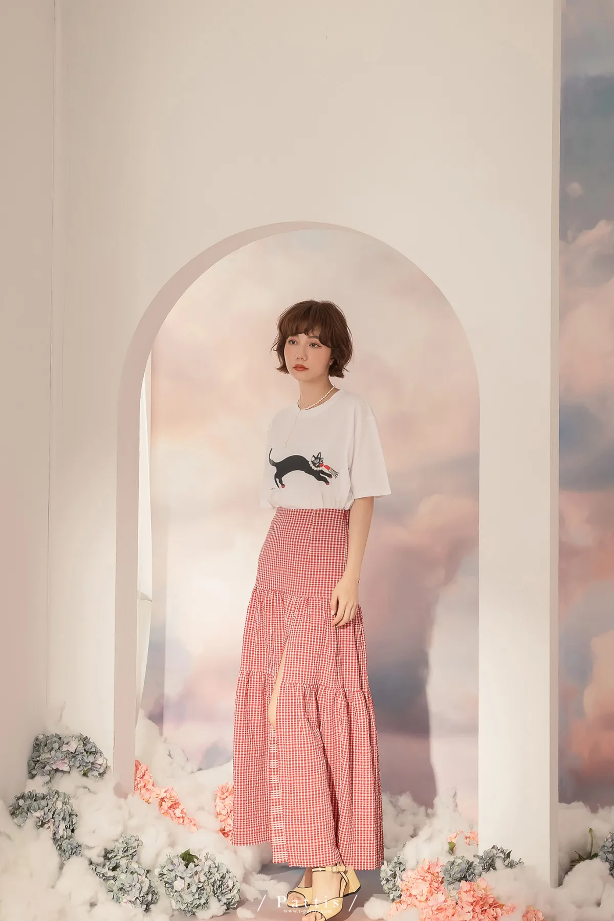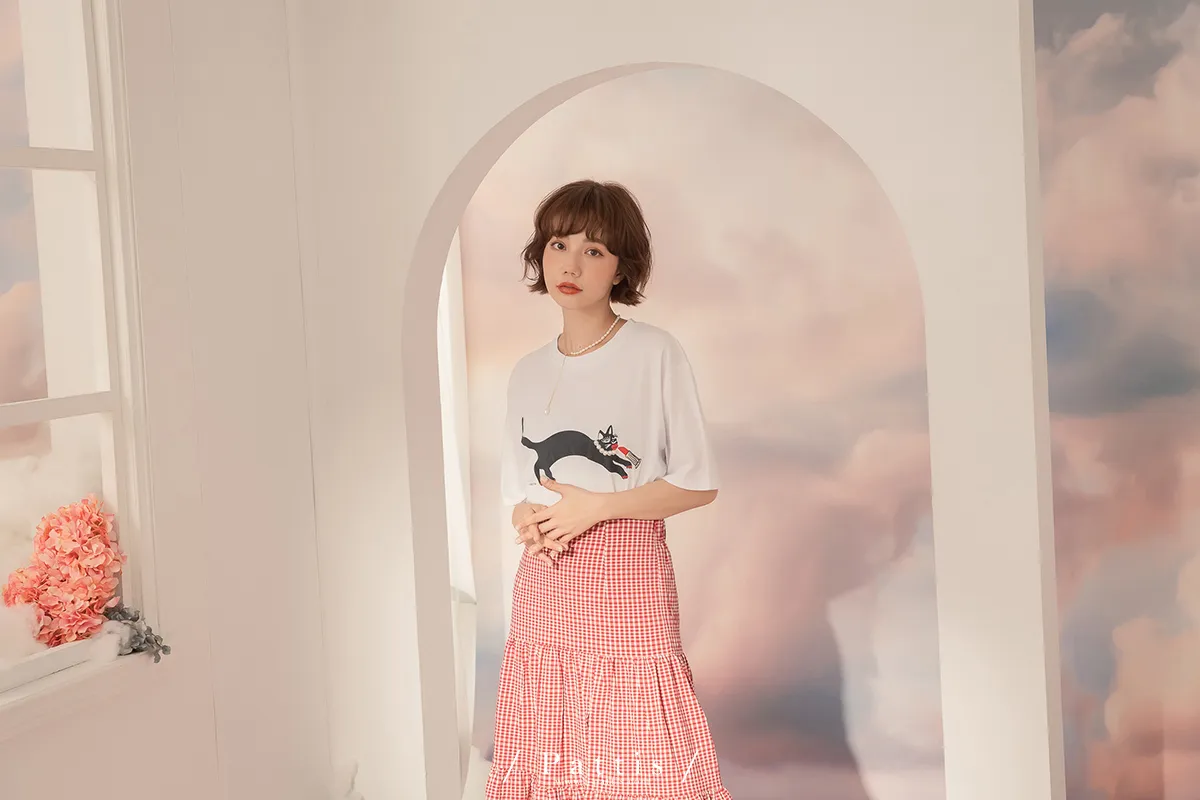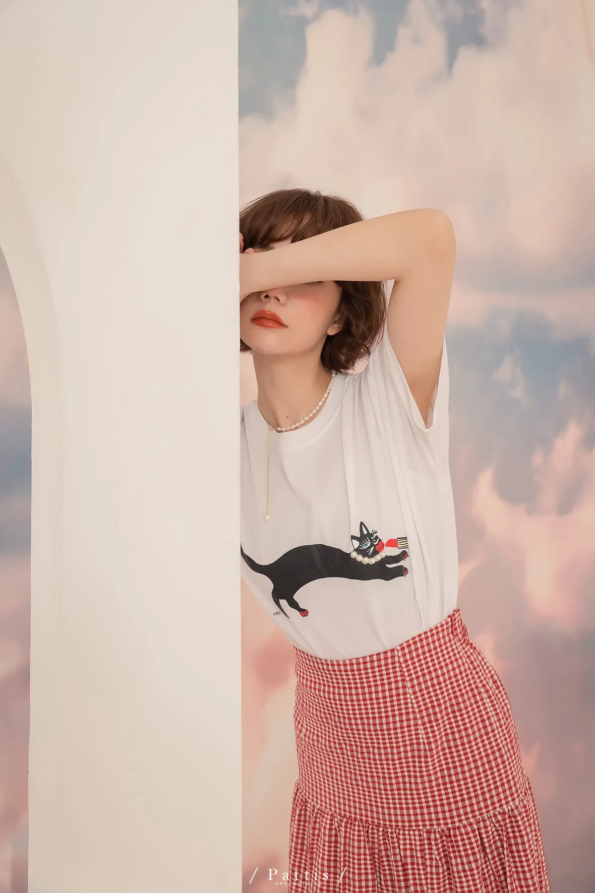 給我親一下 | 立體珍珠塗鴉紅唇貓咪T恤(白)
