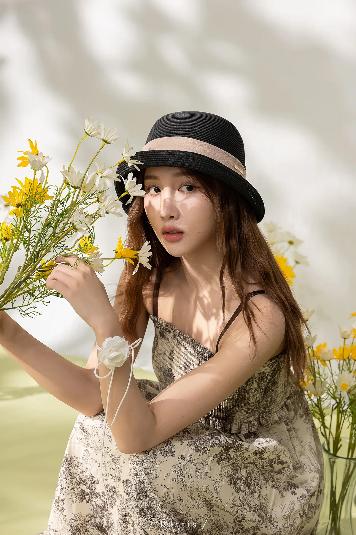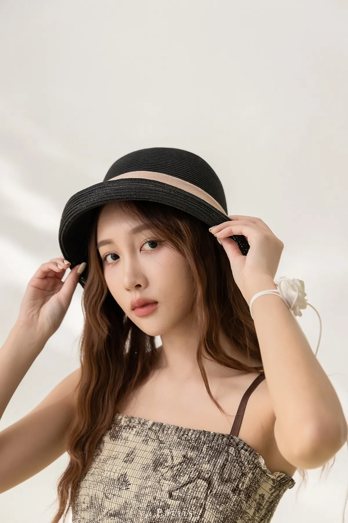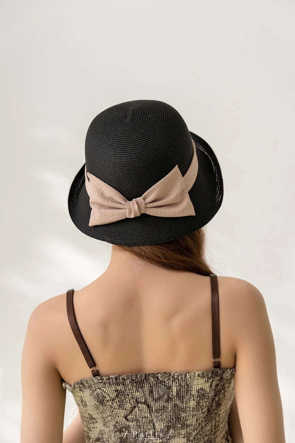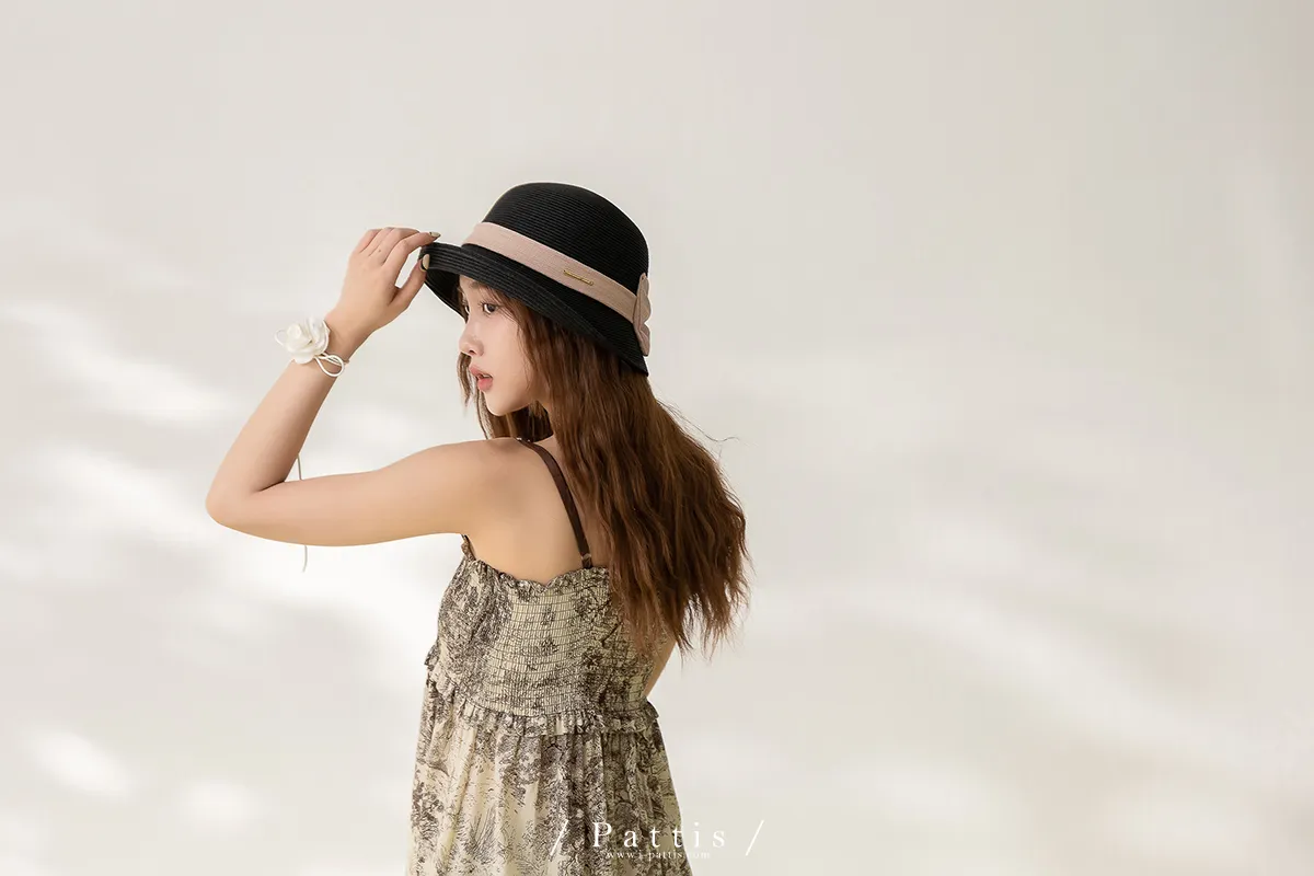 雙色蝴蝶結小金牌圓頂編織草帽(白/棕/黑)
