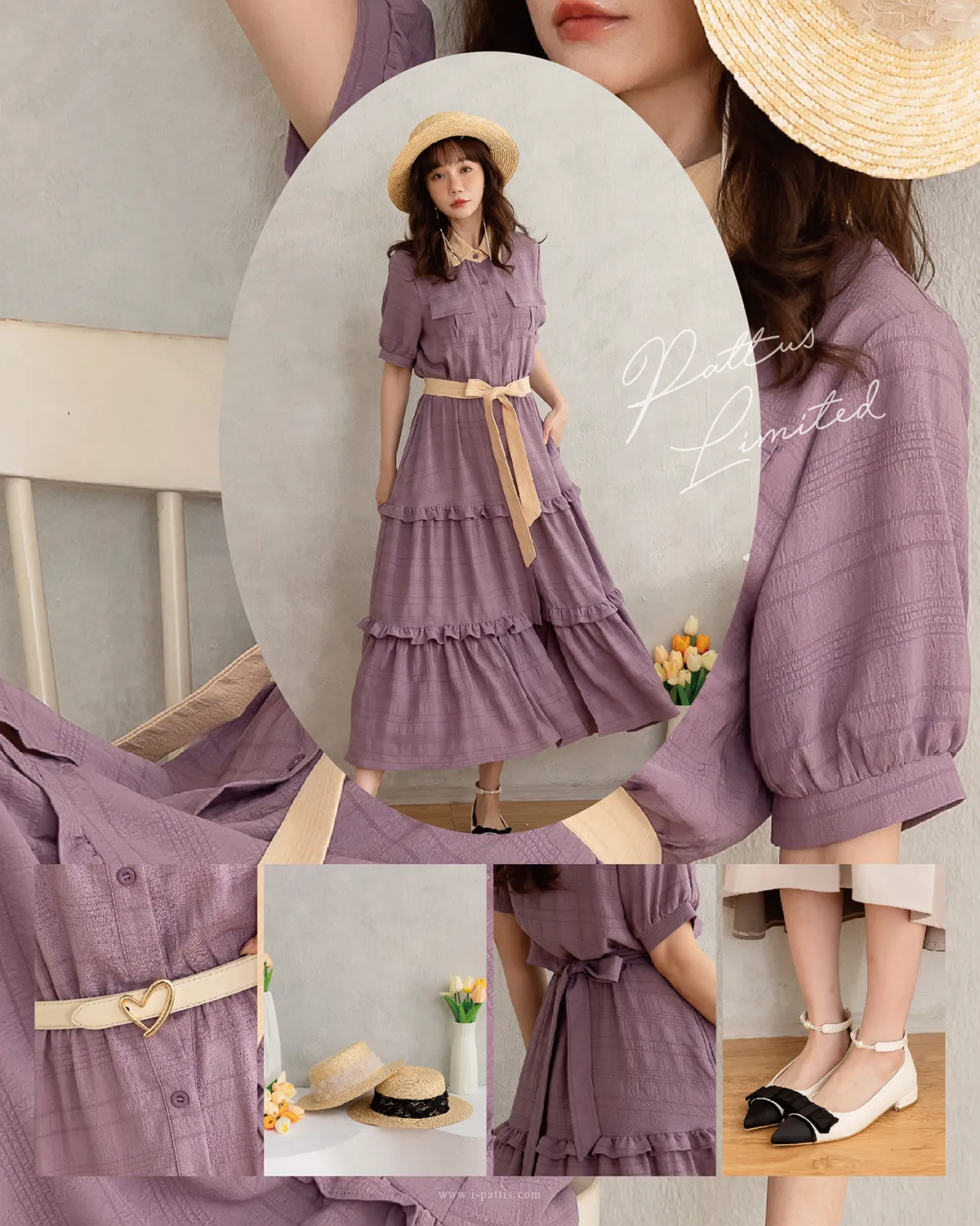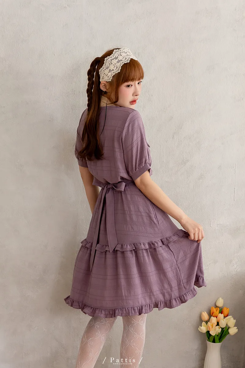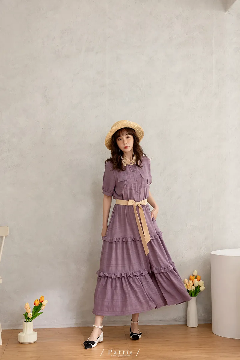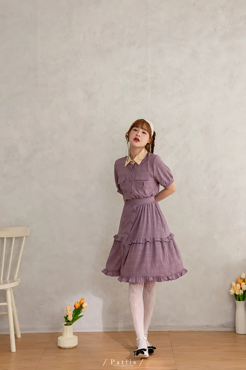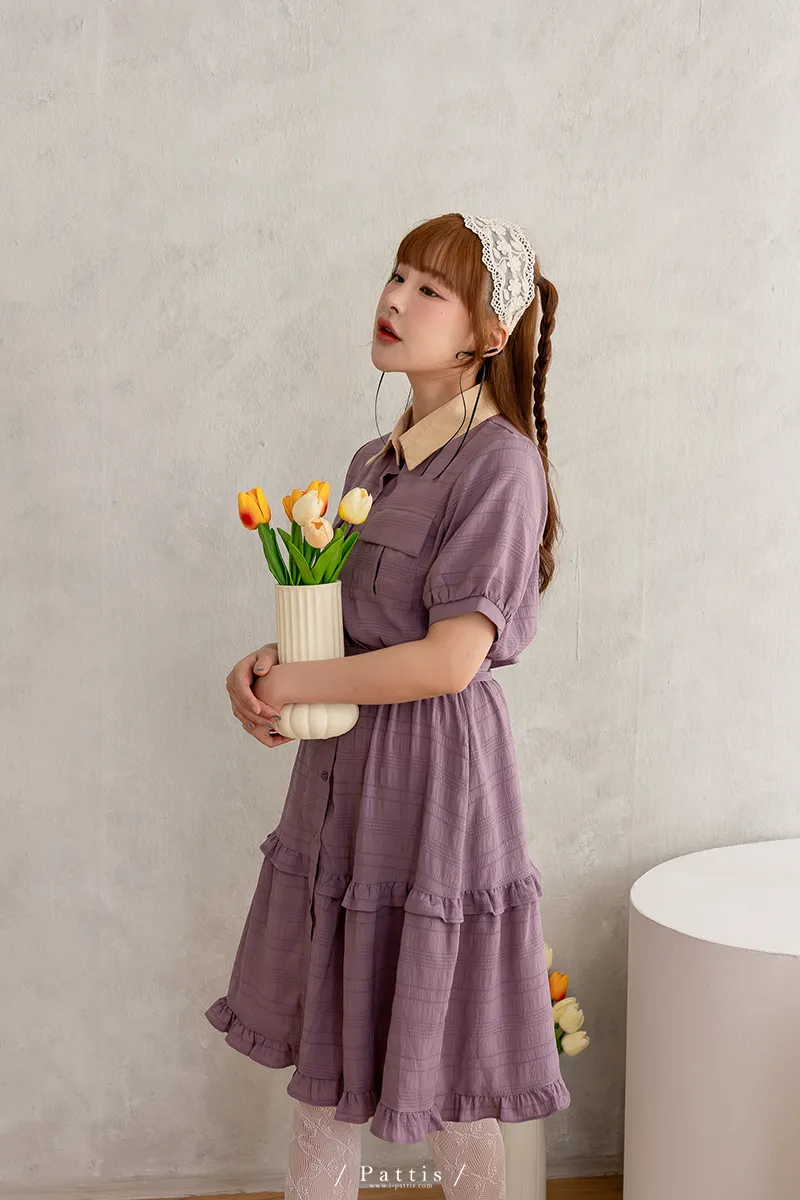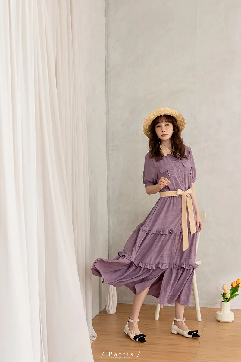 十二點前的輕吻 | 浮雕格紋荷葉可拆2way洋裝(胭花紫荊)
