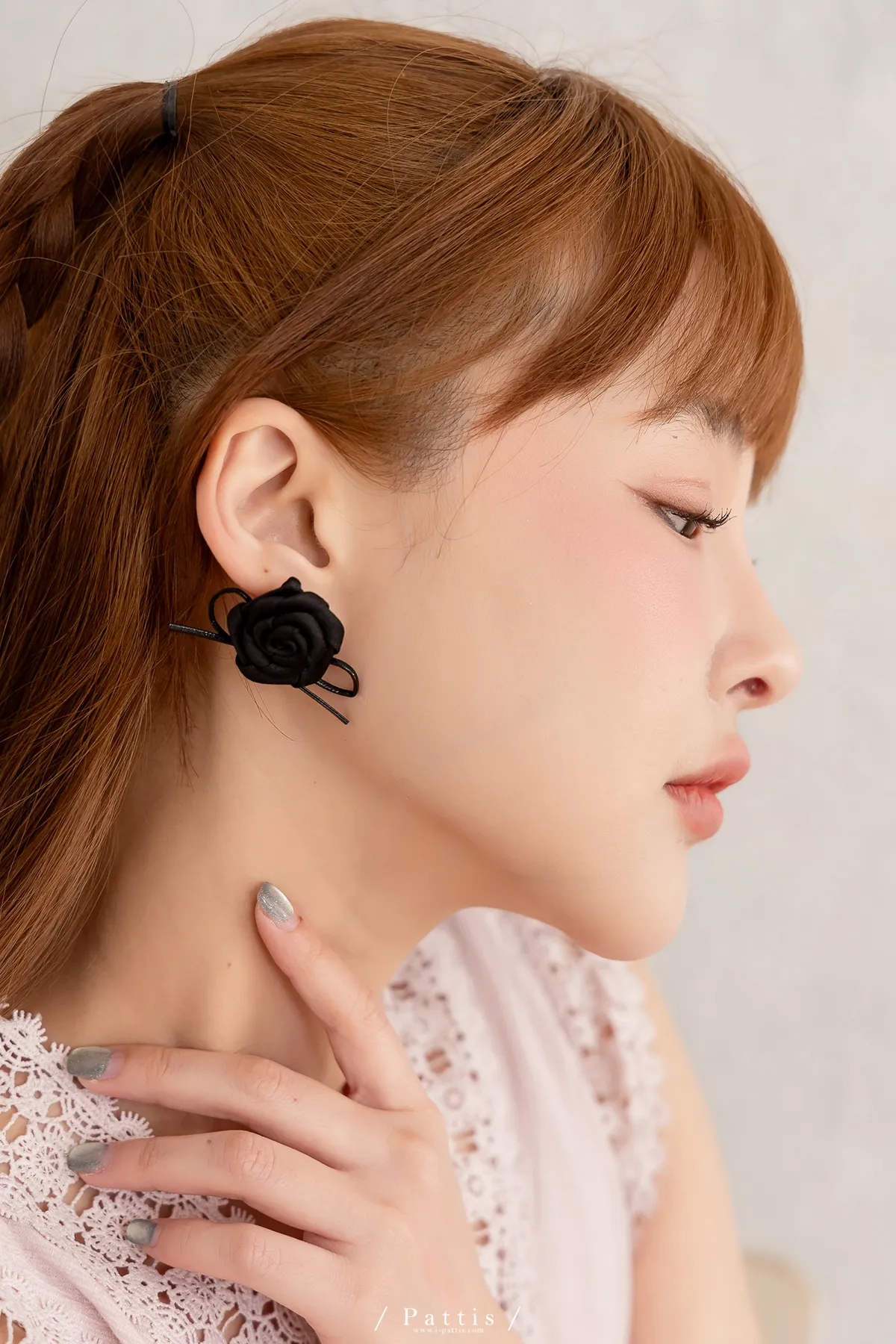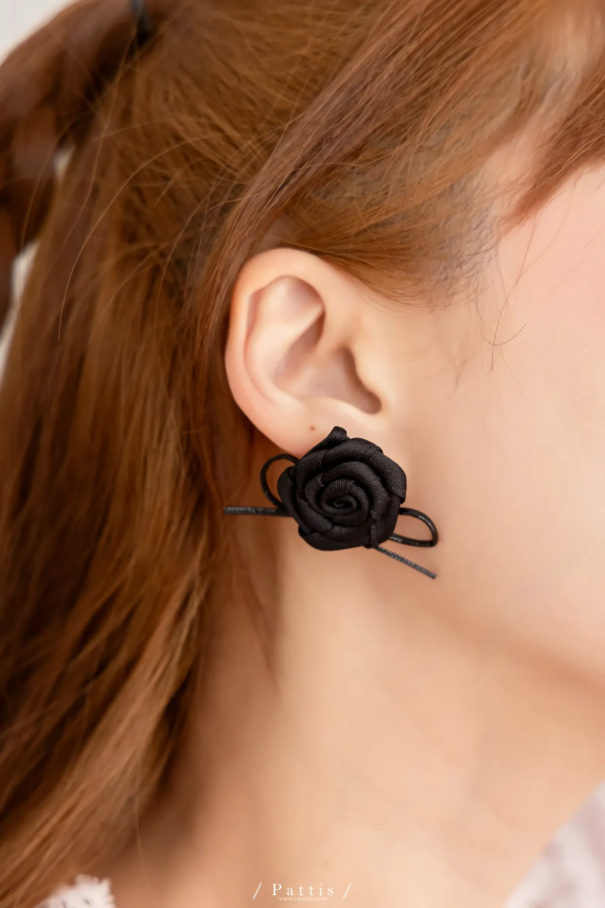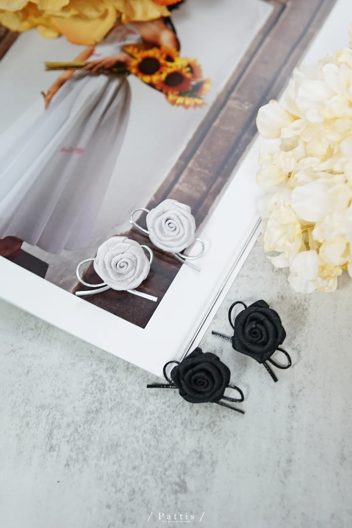 手工玫瑰花緞帶蝴蝶結耳環(銀/黑)