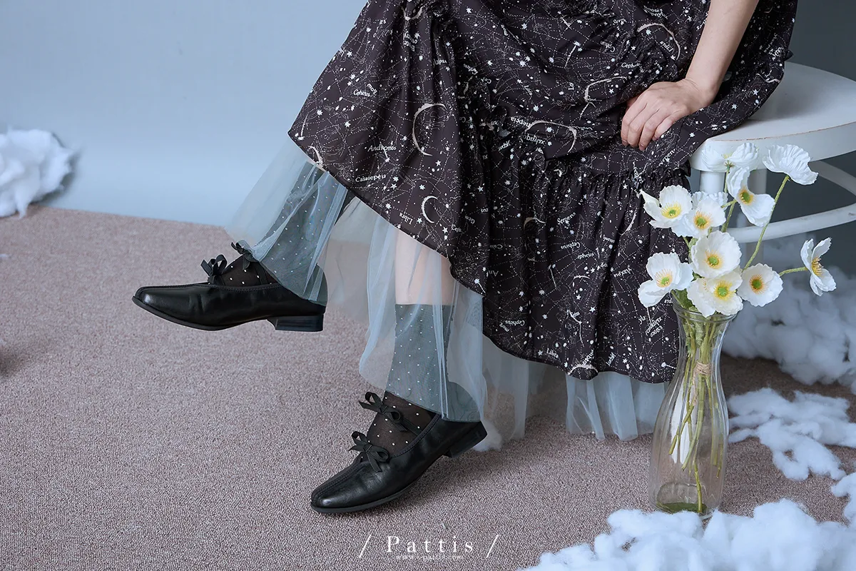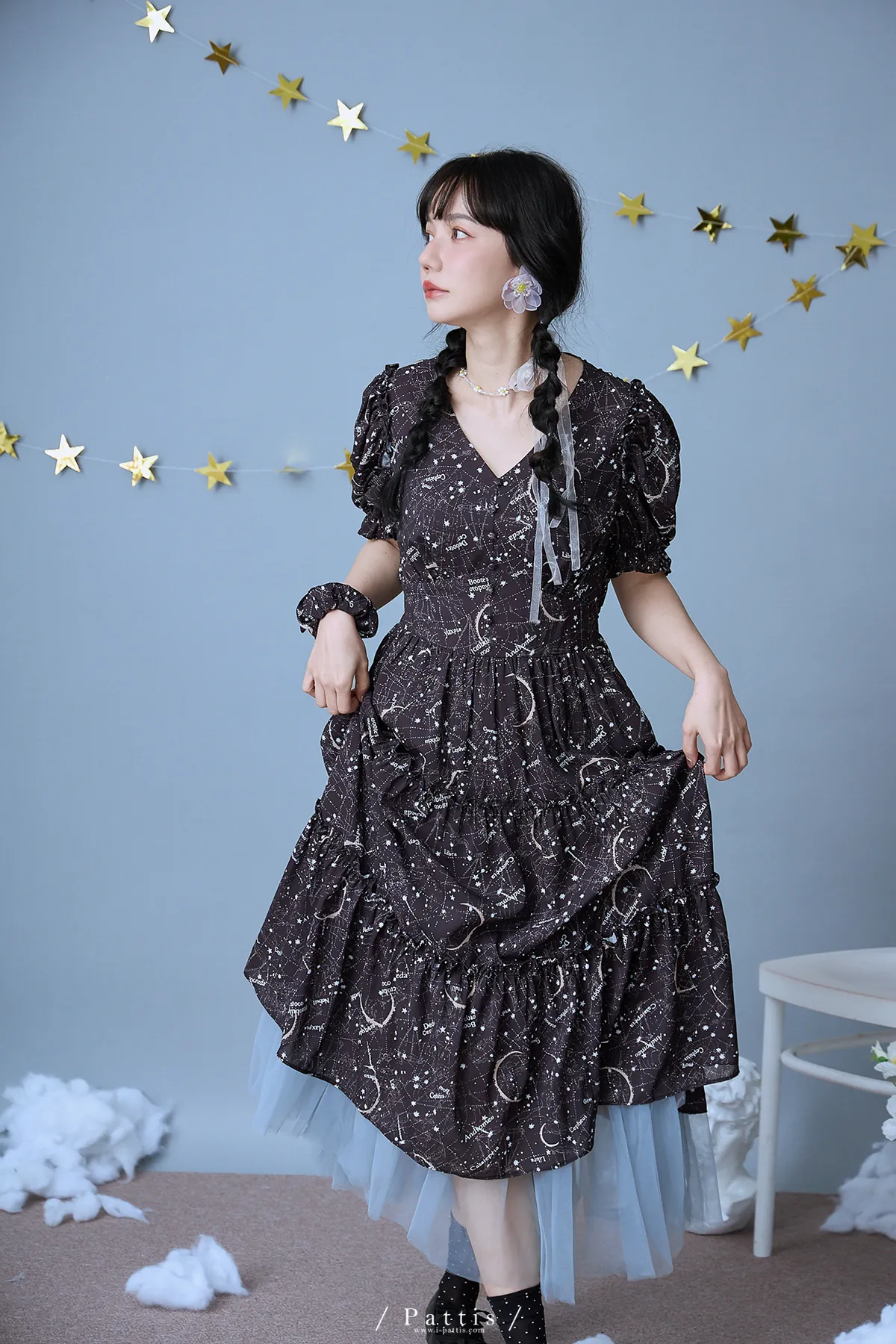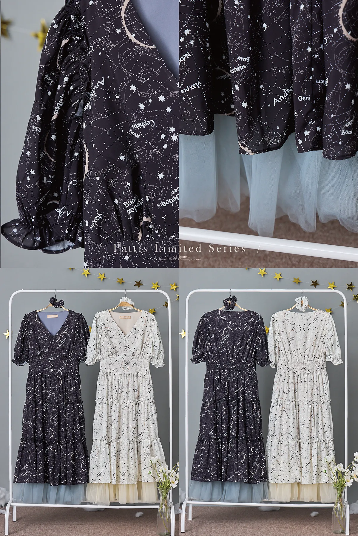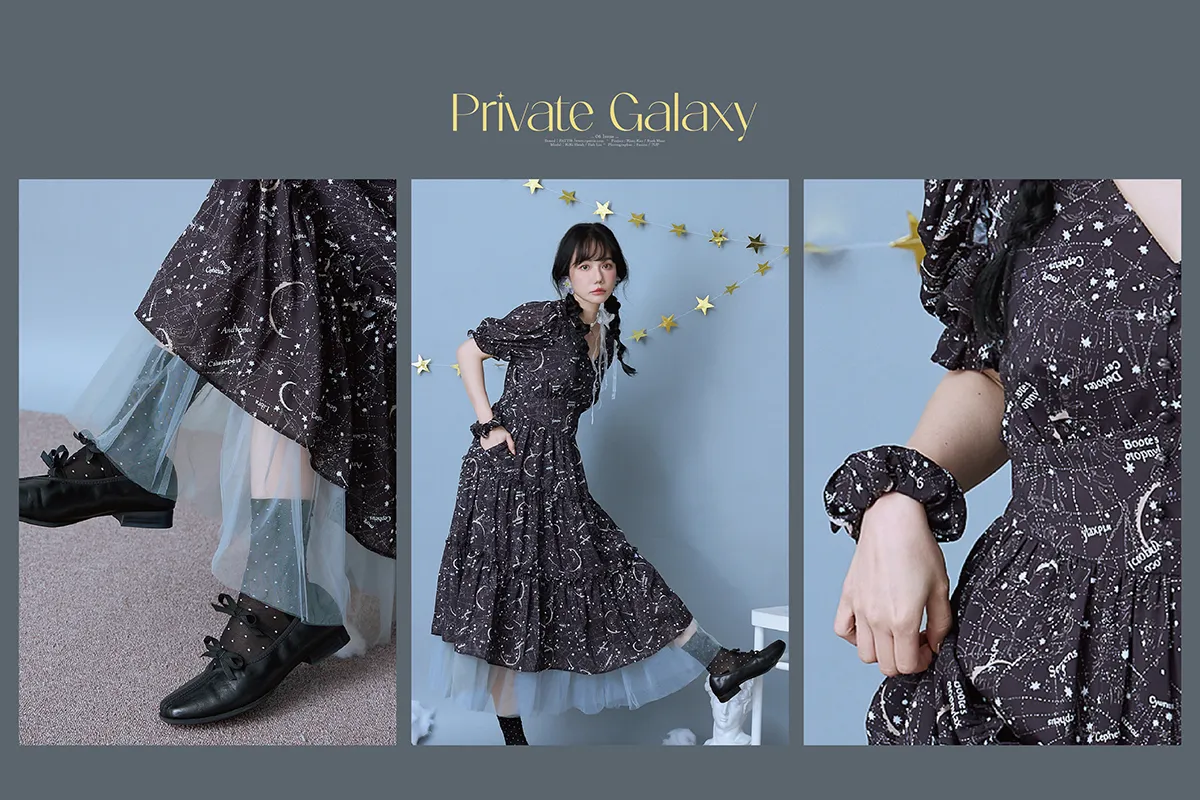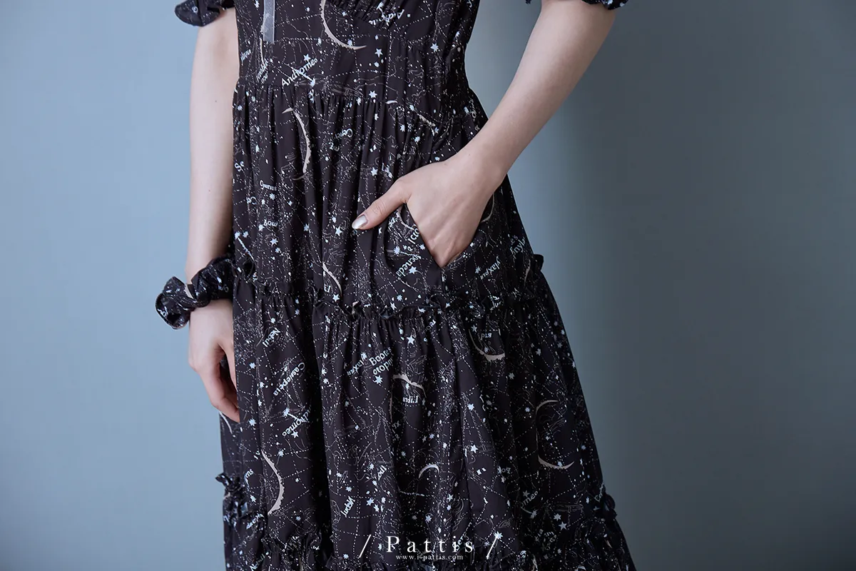 如果繁星墜落白日夢 | 星座印紋字母拼接網紗洋裝(恆星黑)