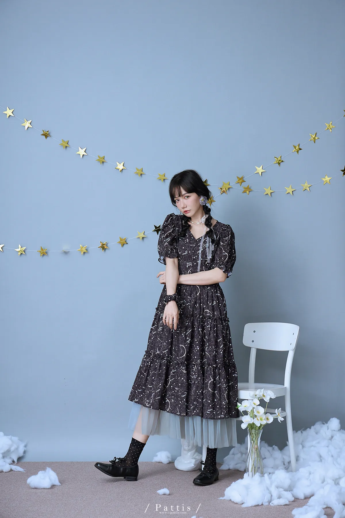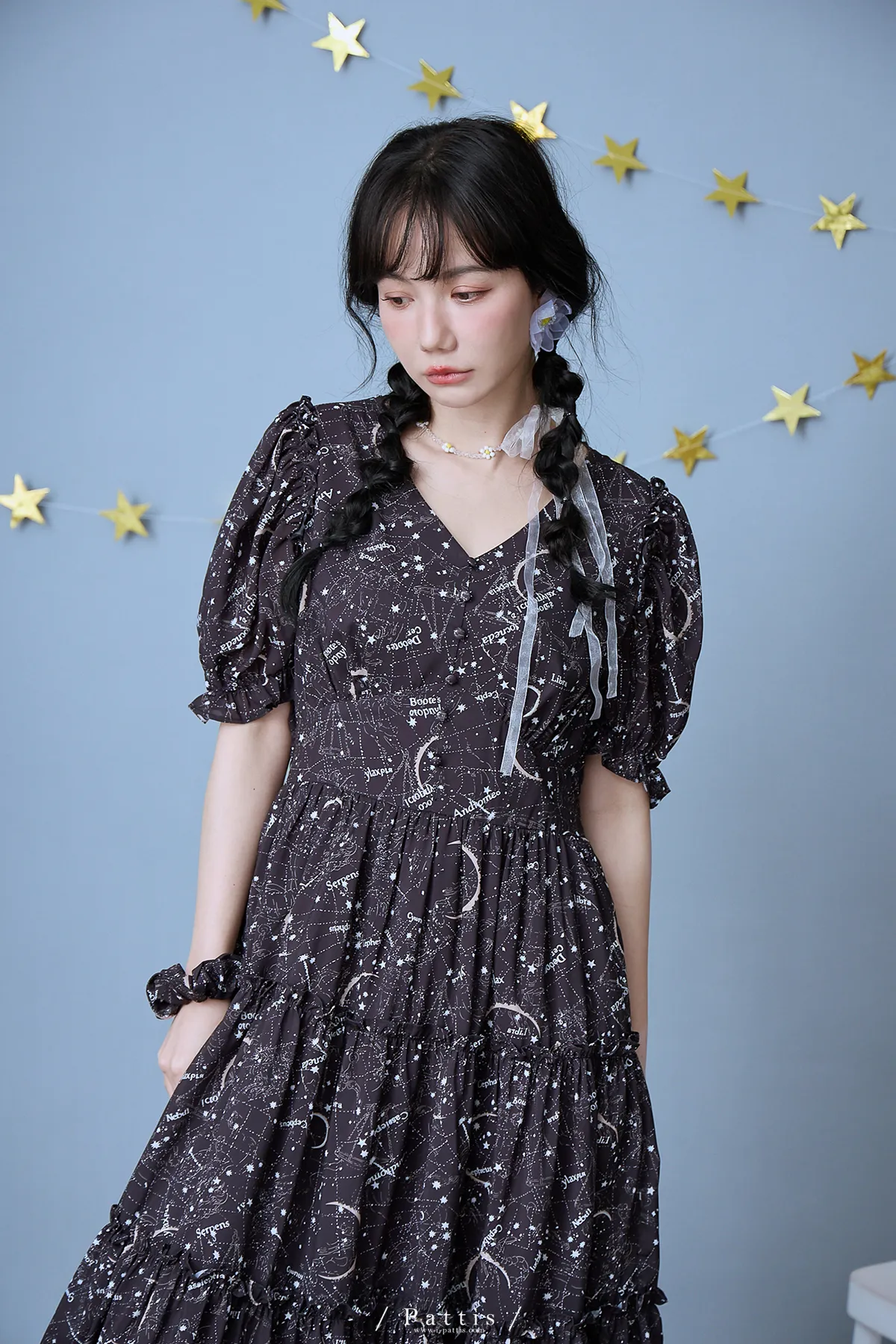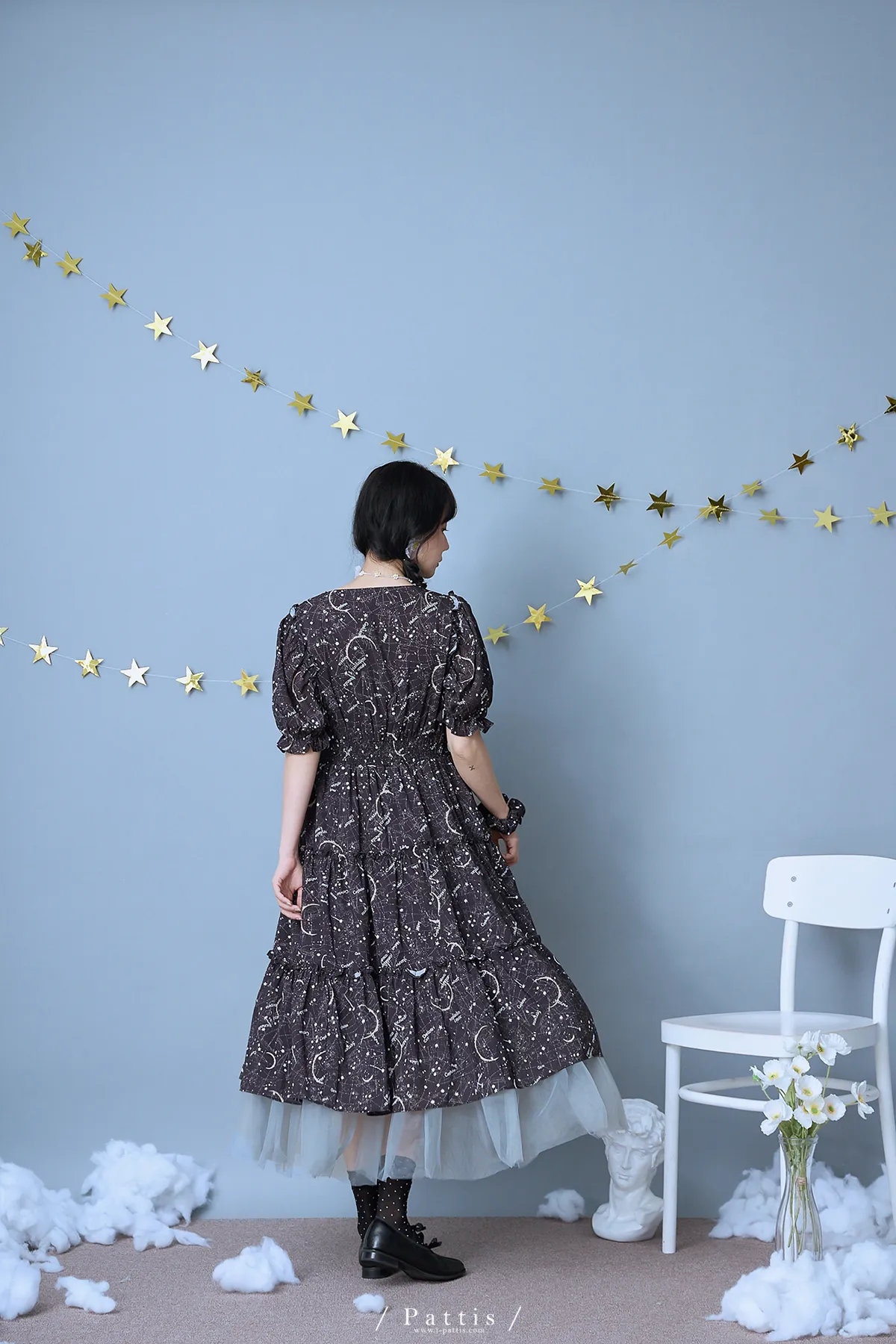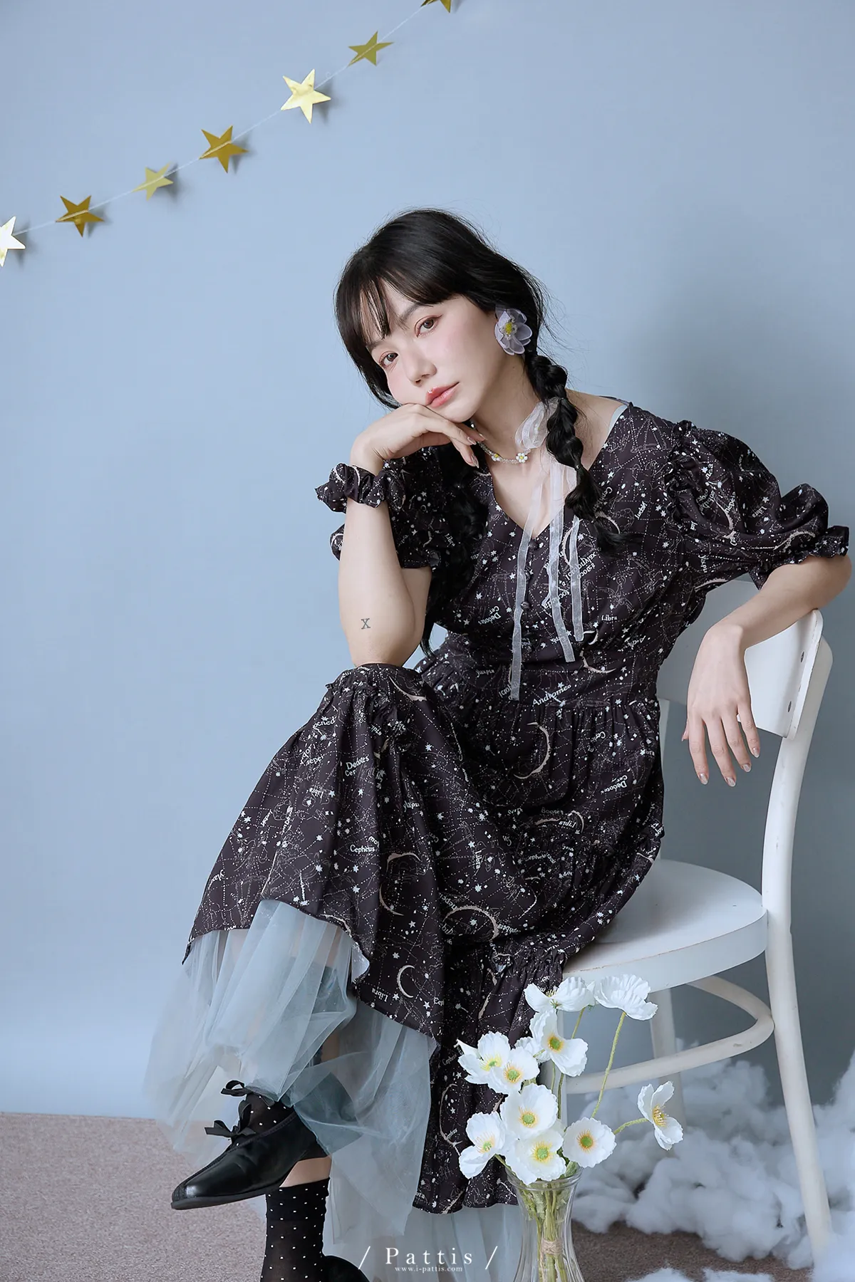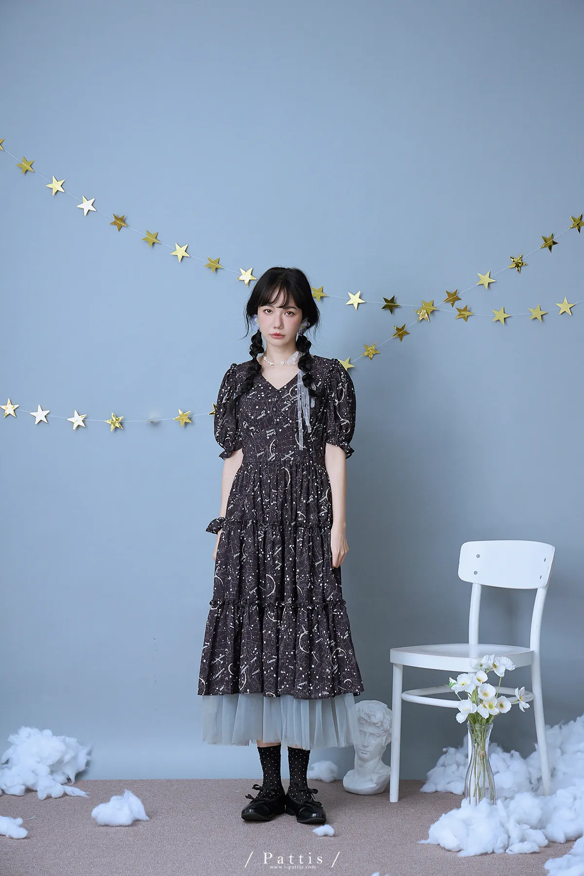 如果繁星墜落白日夢 | 星座印紋字母拼接網紗洋裝(恆星黑)
