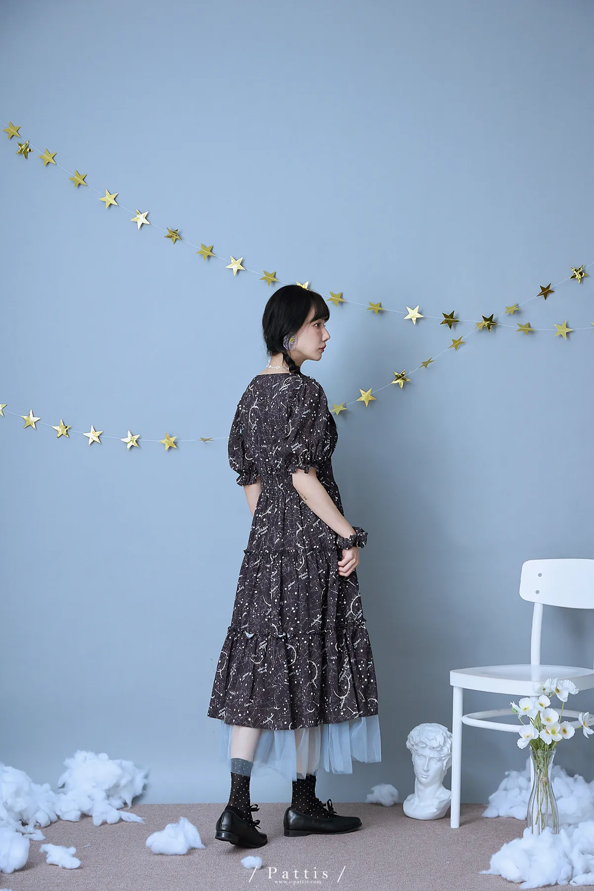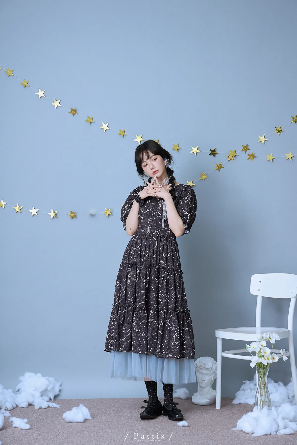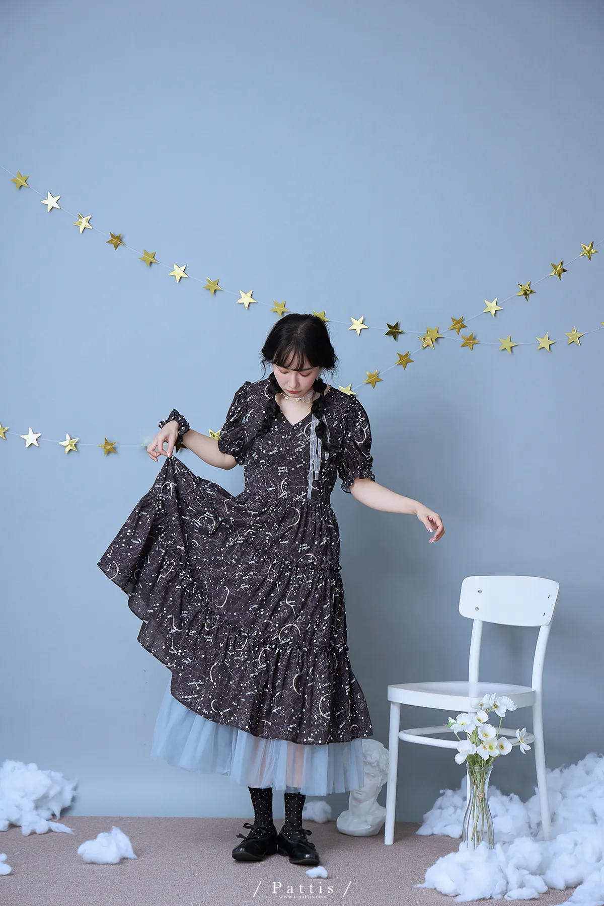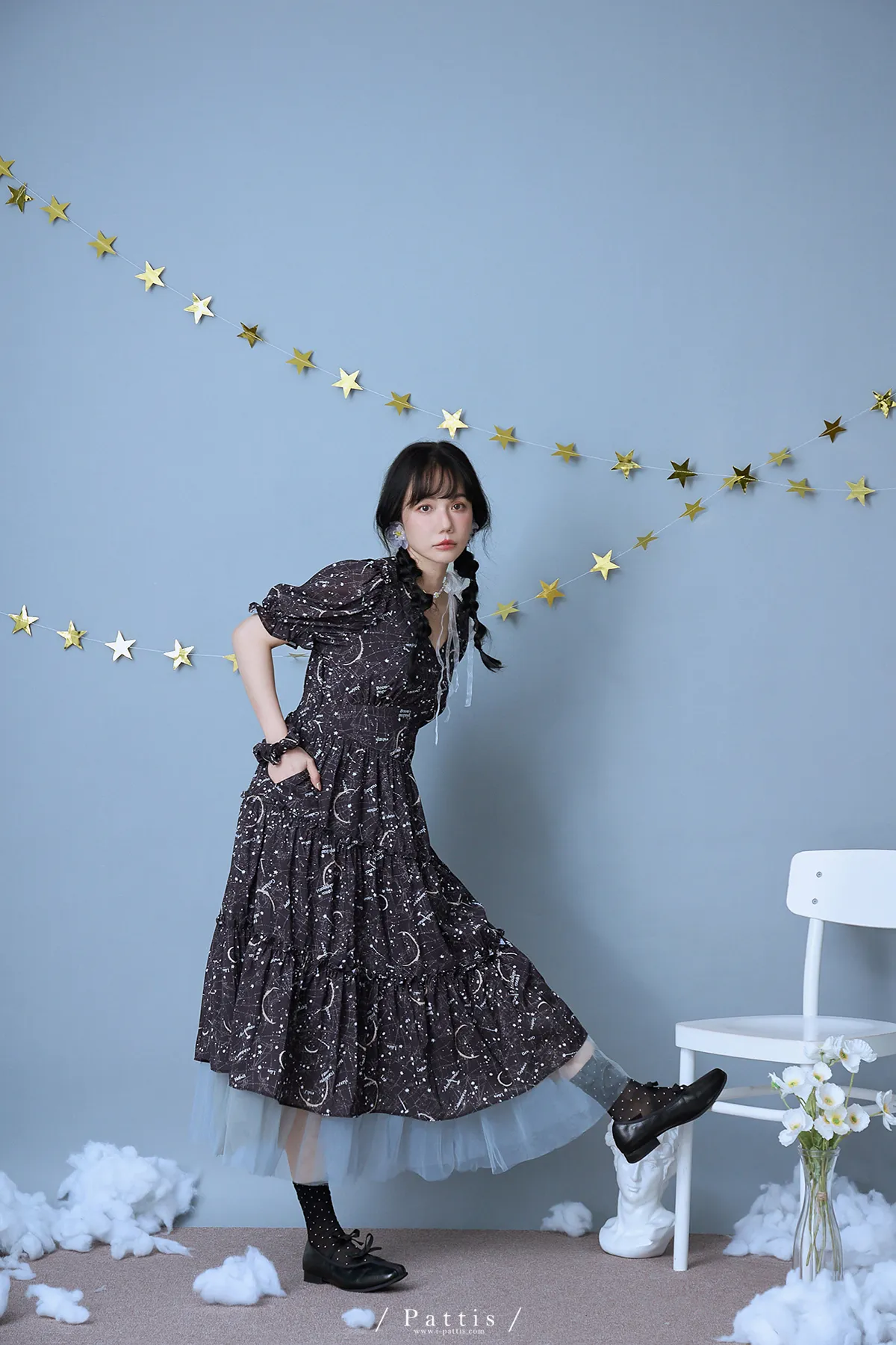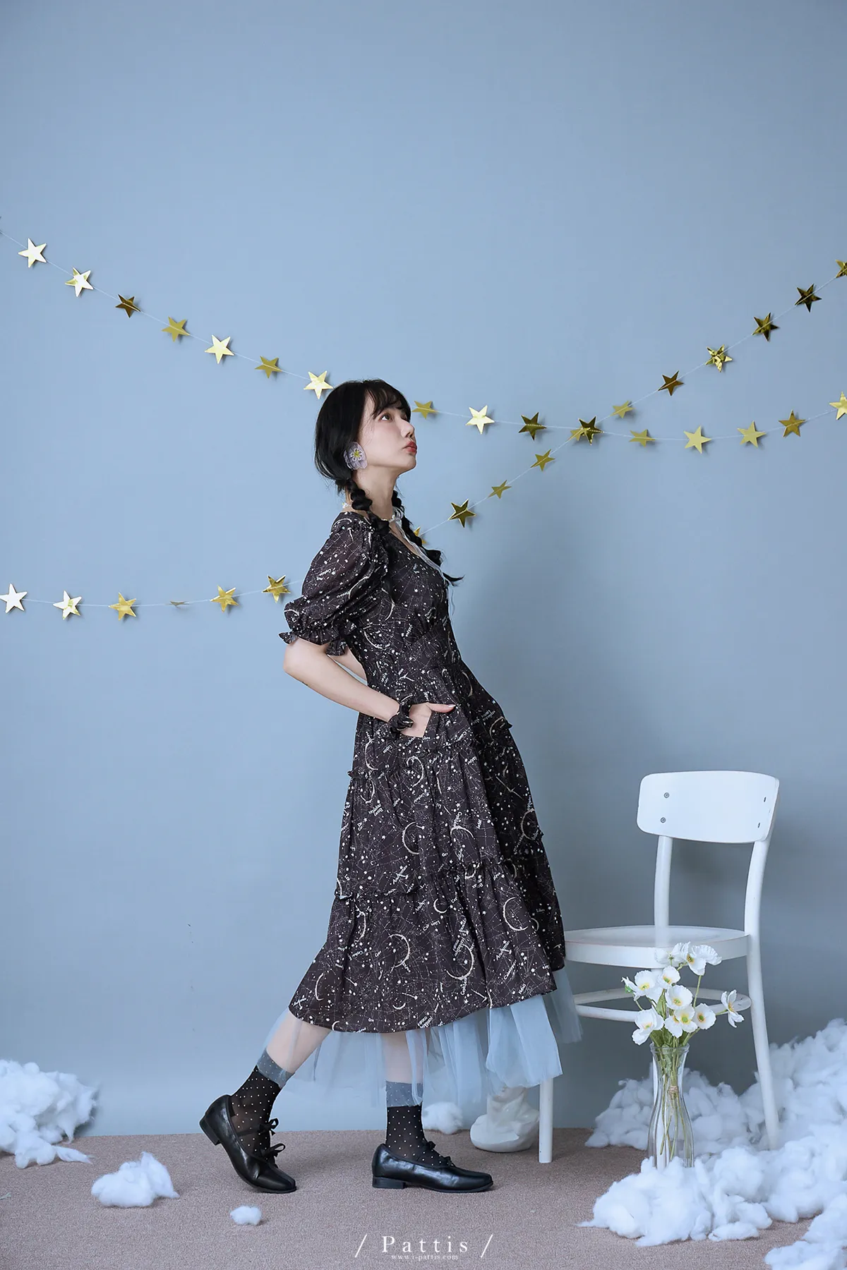 如果繁星墜落白日夢 | 星座印紋字母拼接網紗洋裝(恆星黑)