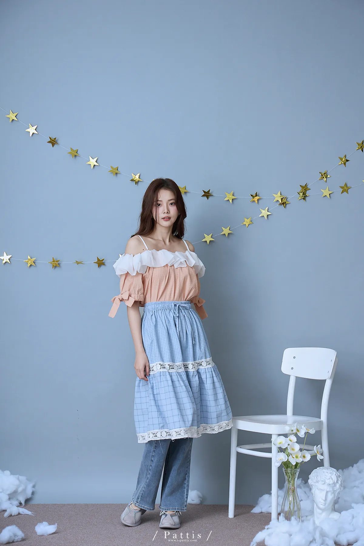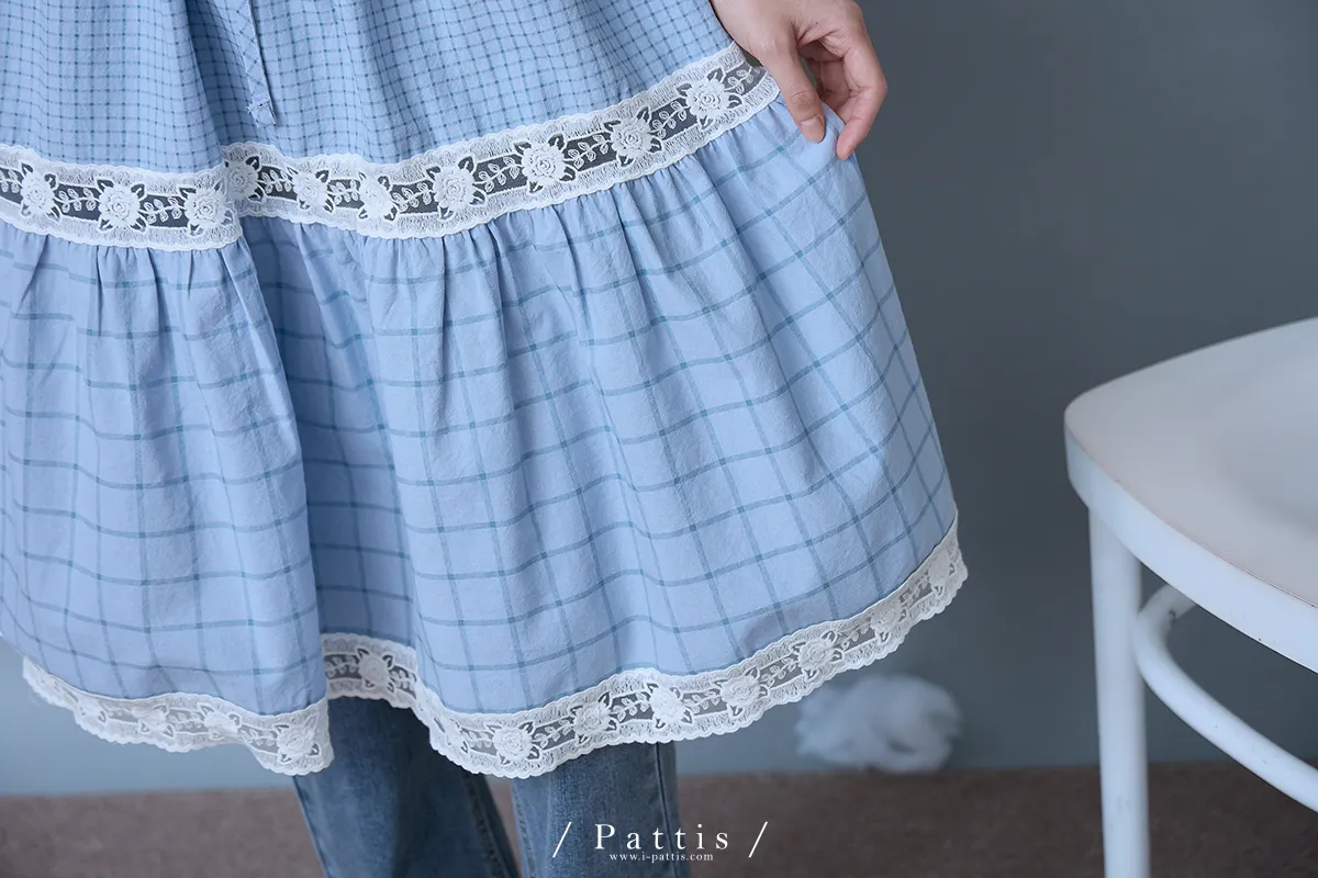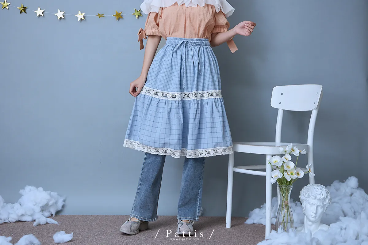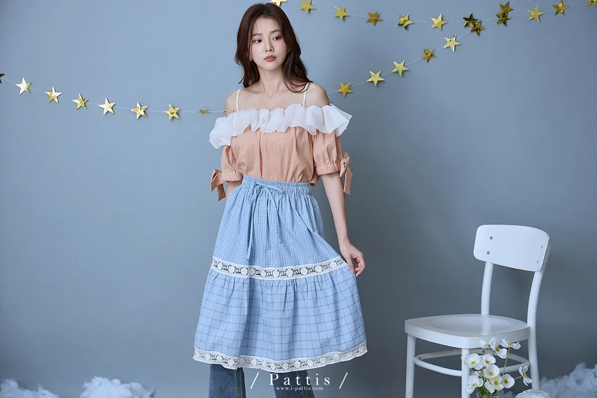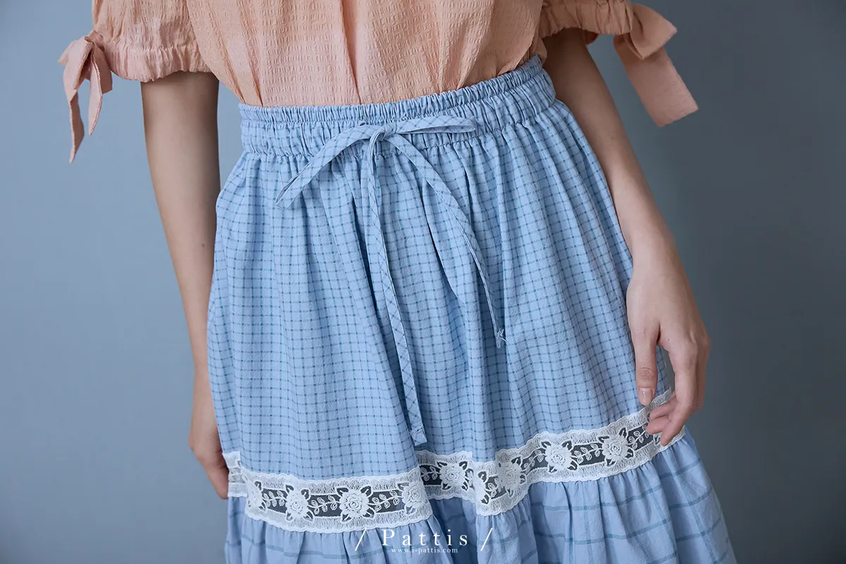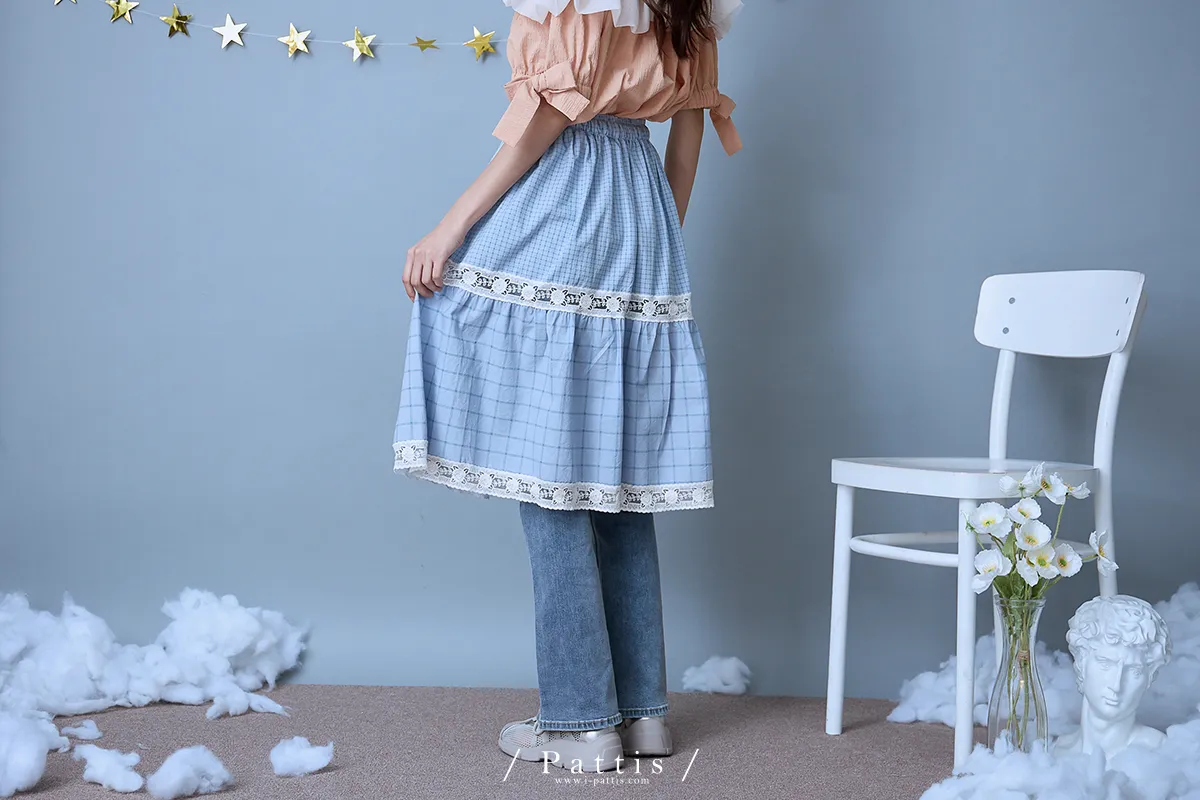 (現貨) 如果那些美好被定格 | 格紋拼接蕾絲鬆緊蛋糕裙(藍白)