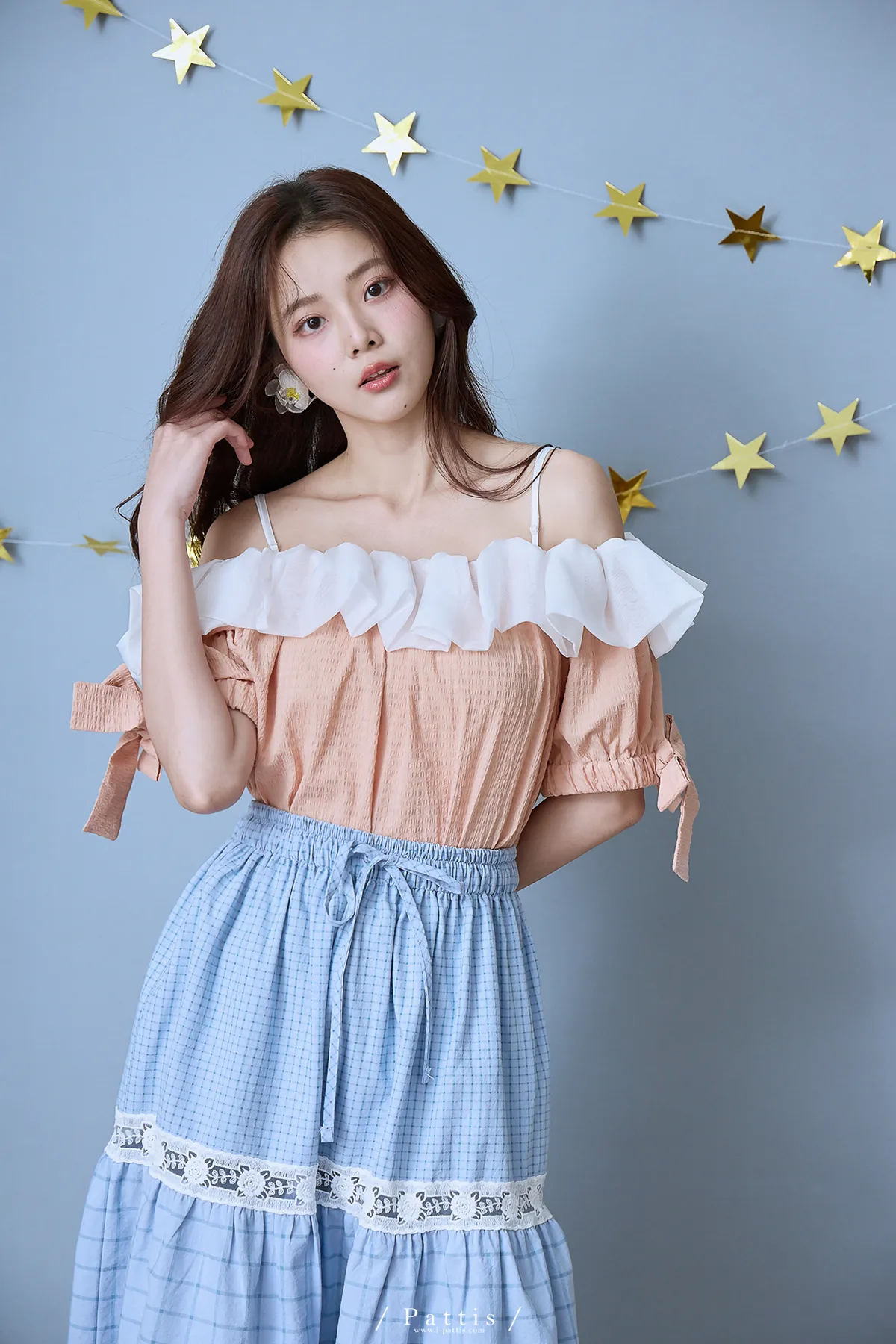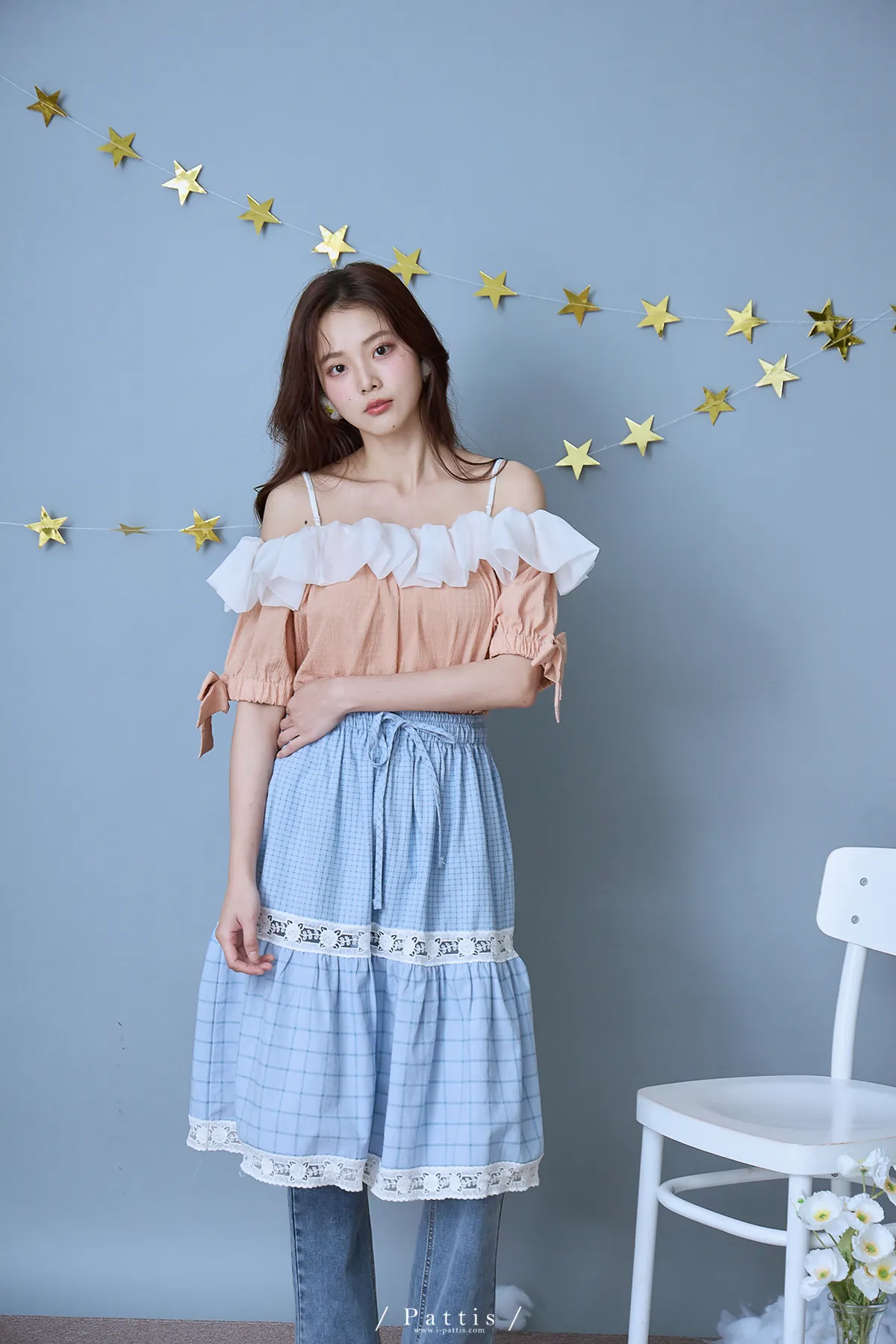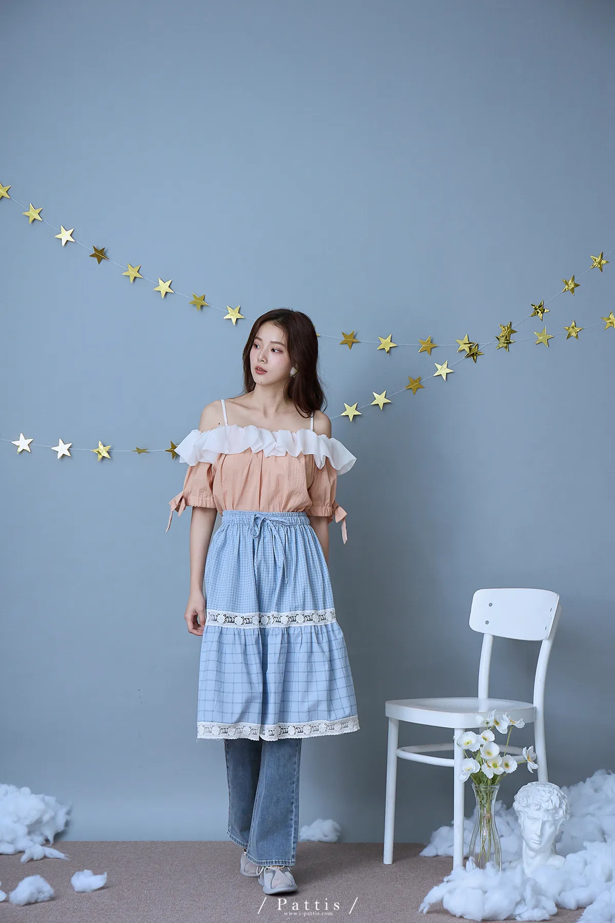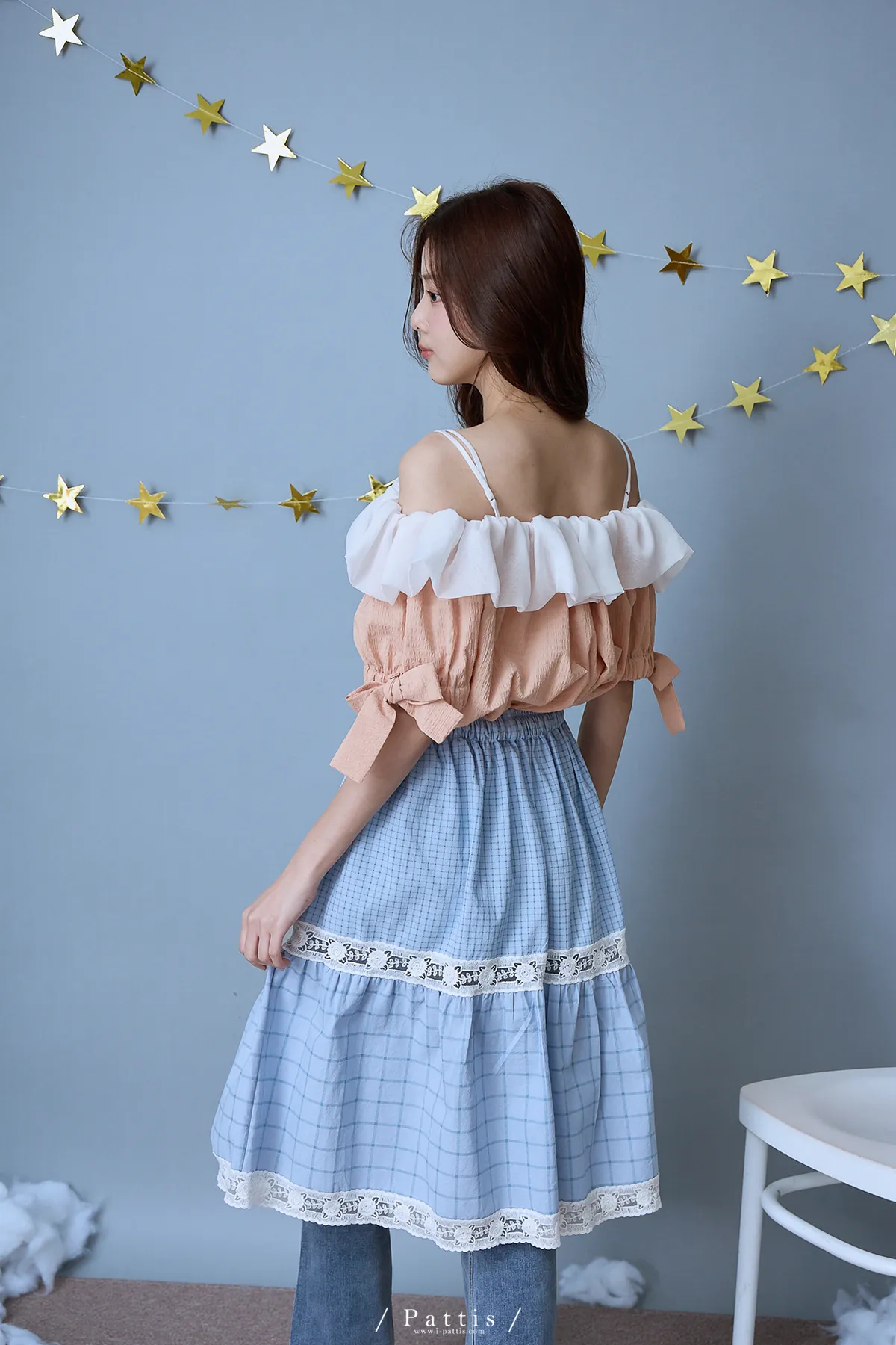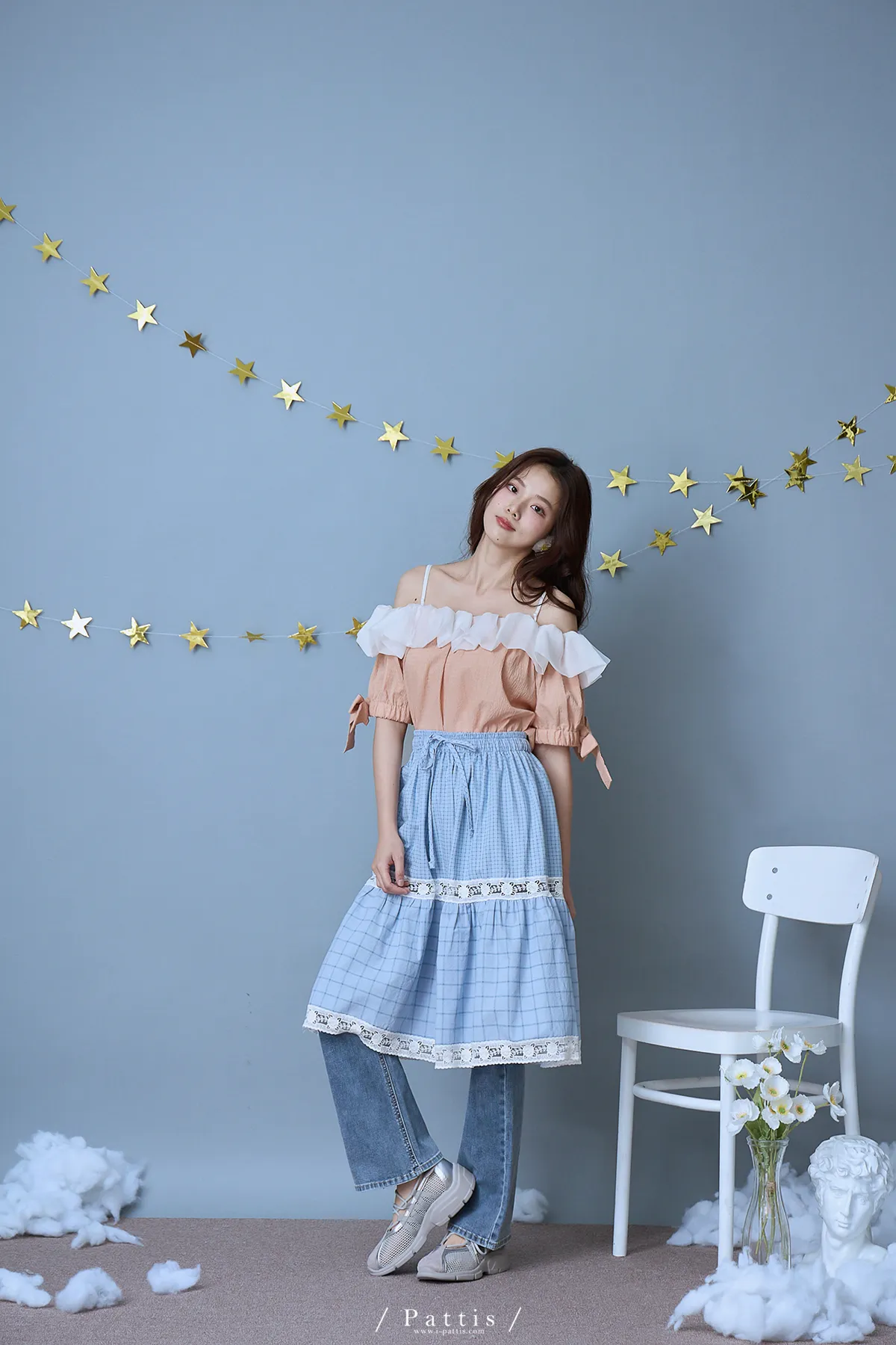 (現貨) 如果那些美好被定格 | 格紋拼接蕾絲鬆緊蛋糕裙(藍白)