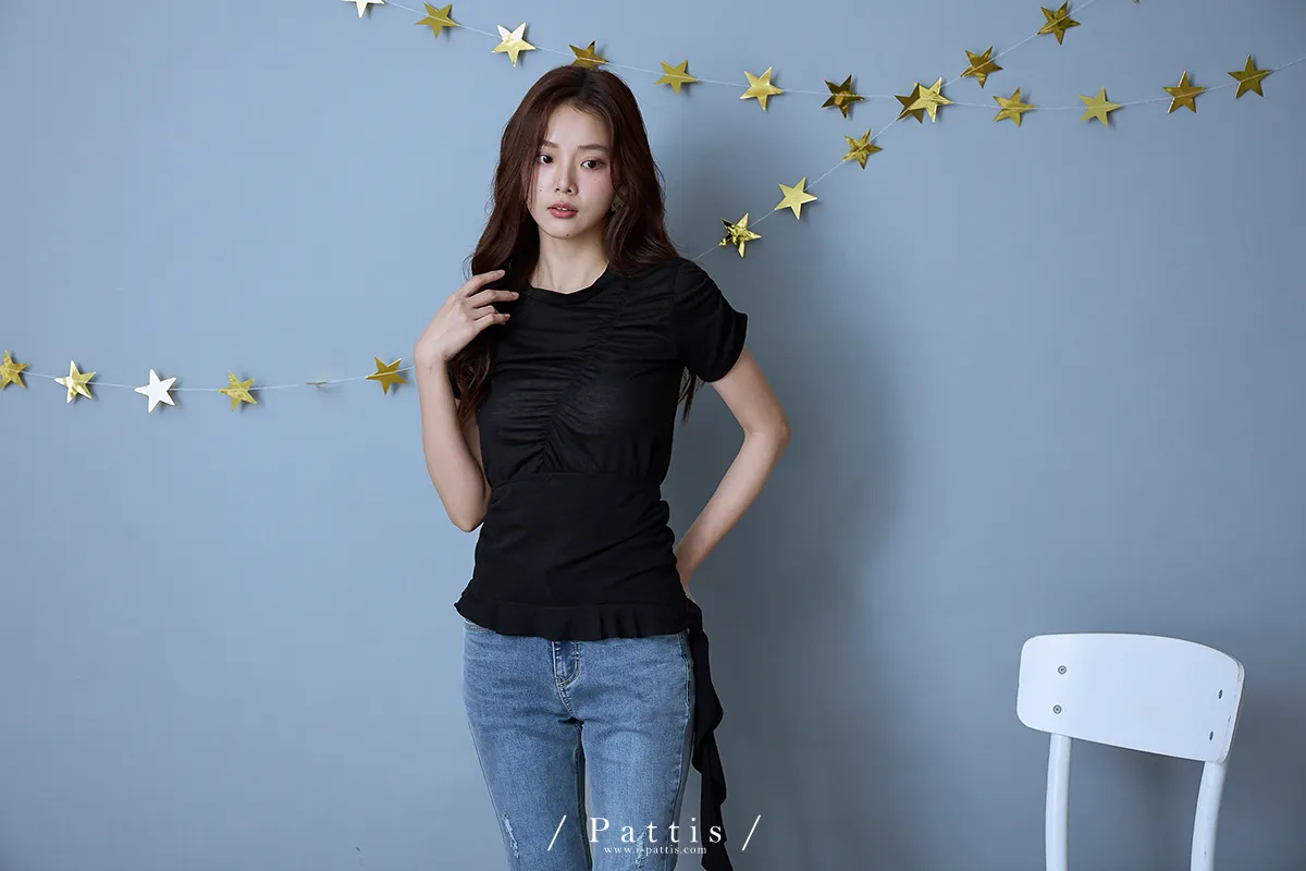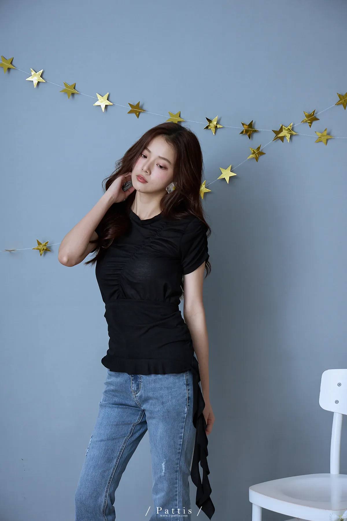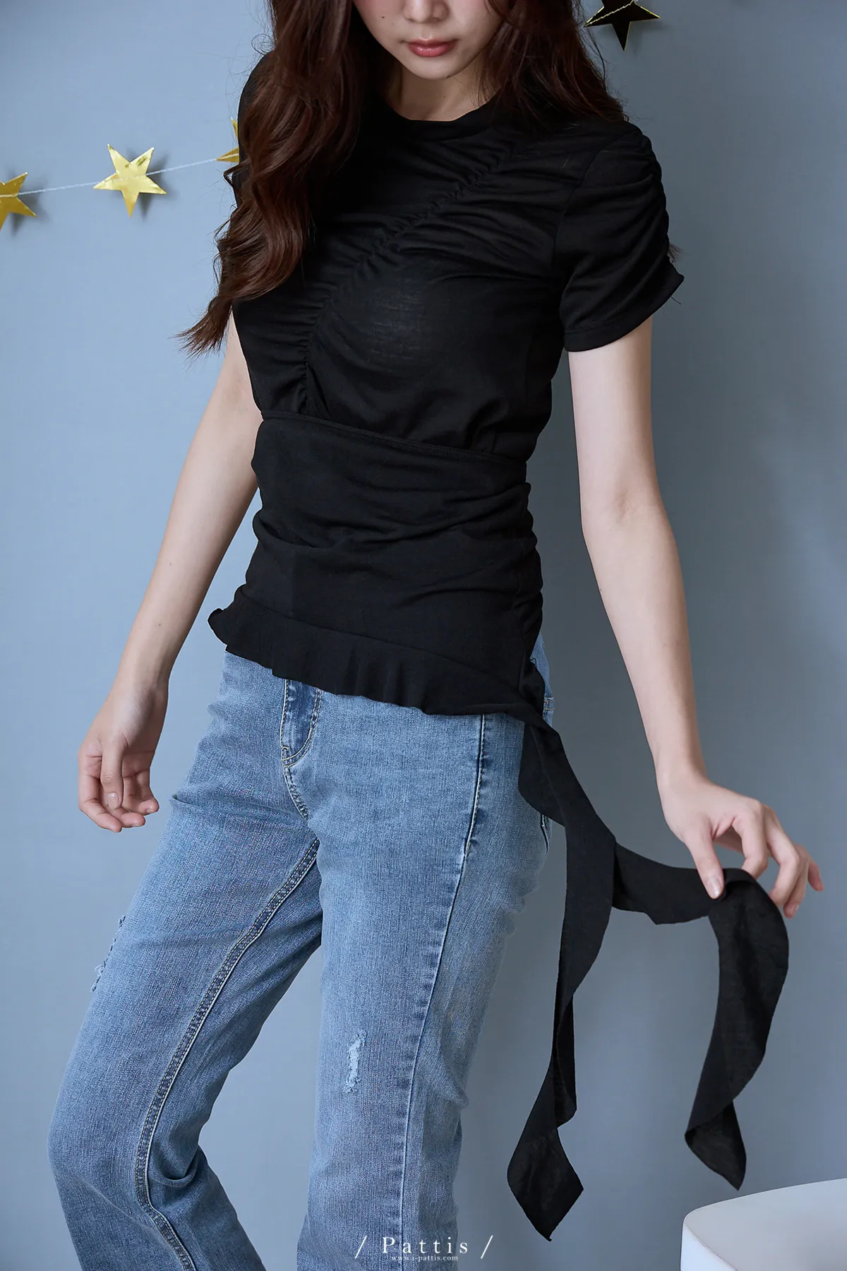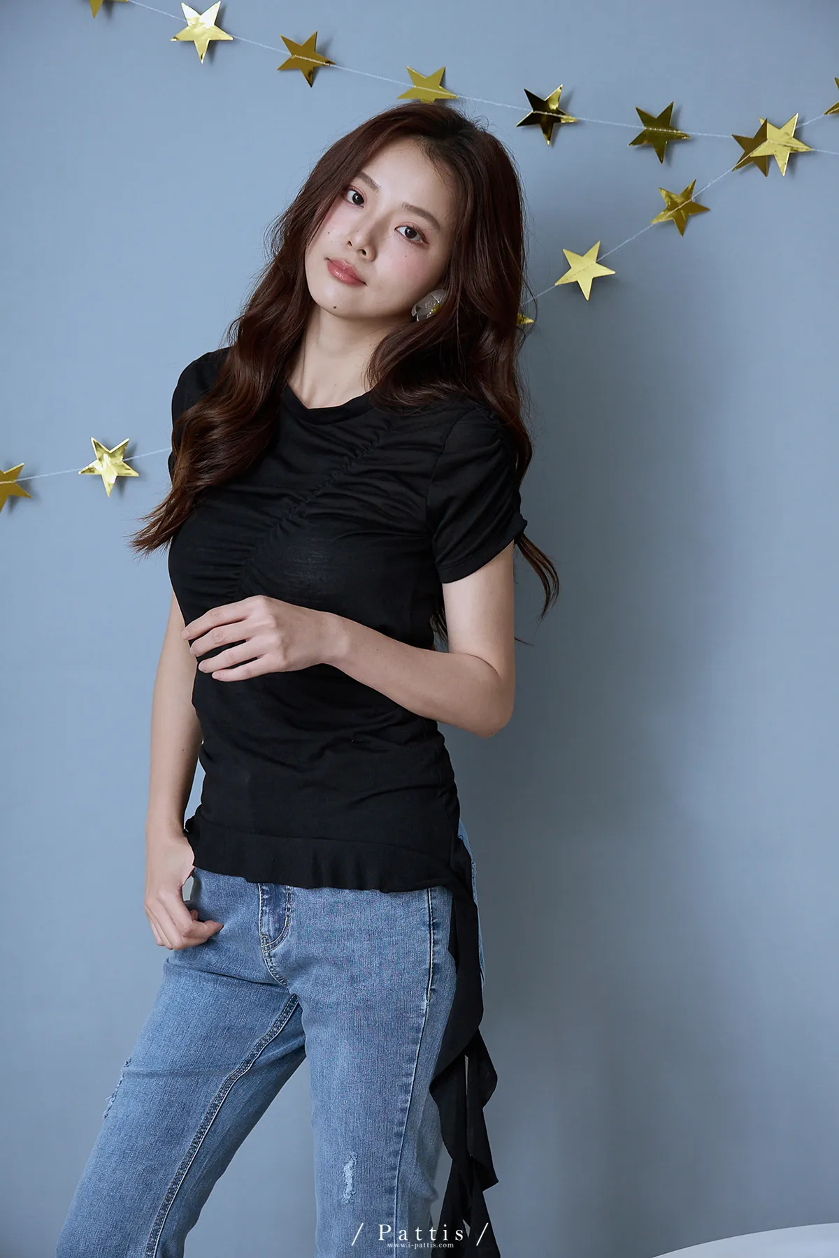 (現貨) 兩件式抓皺圓領上衣+荷葉斜邊背心set(黑)