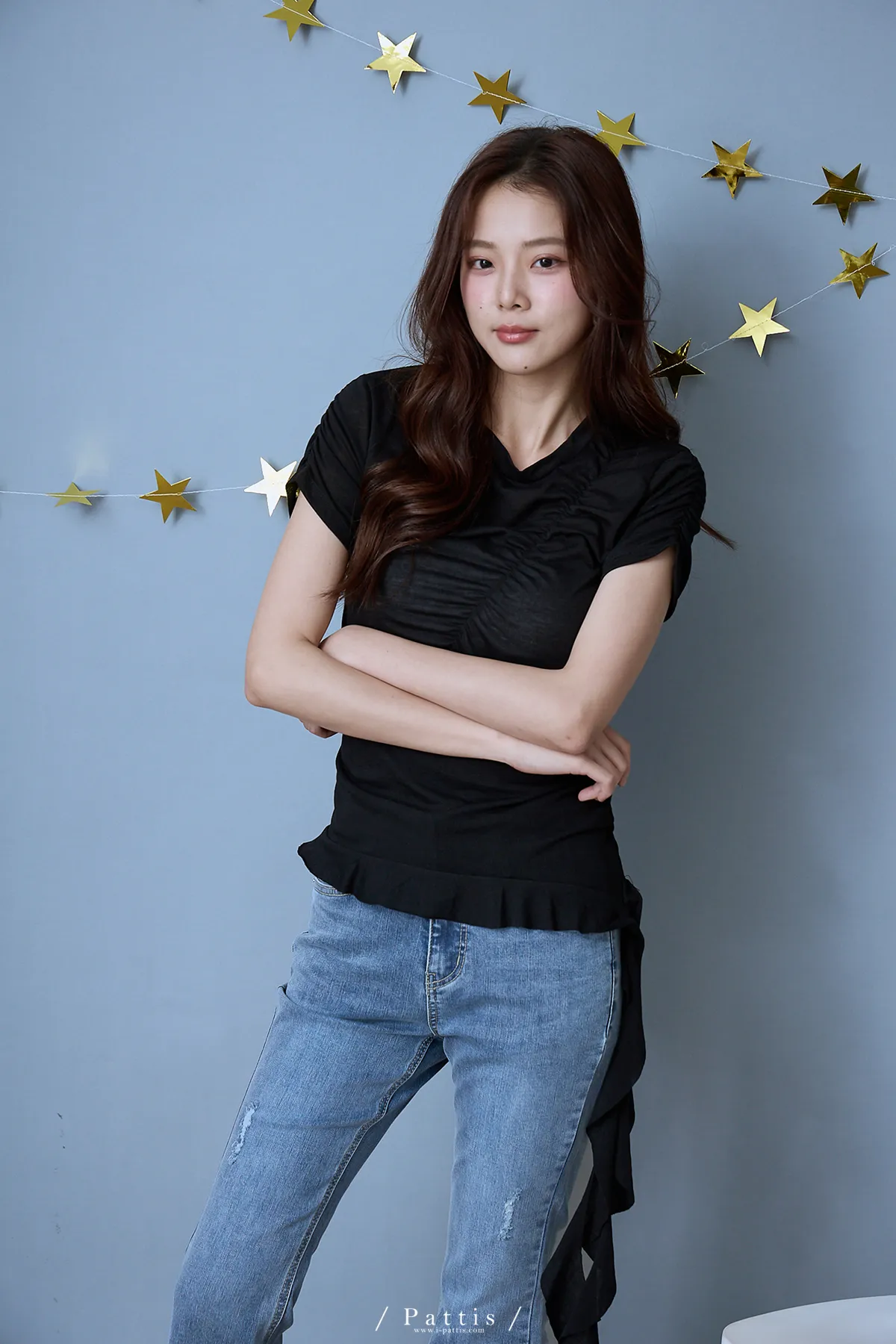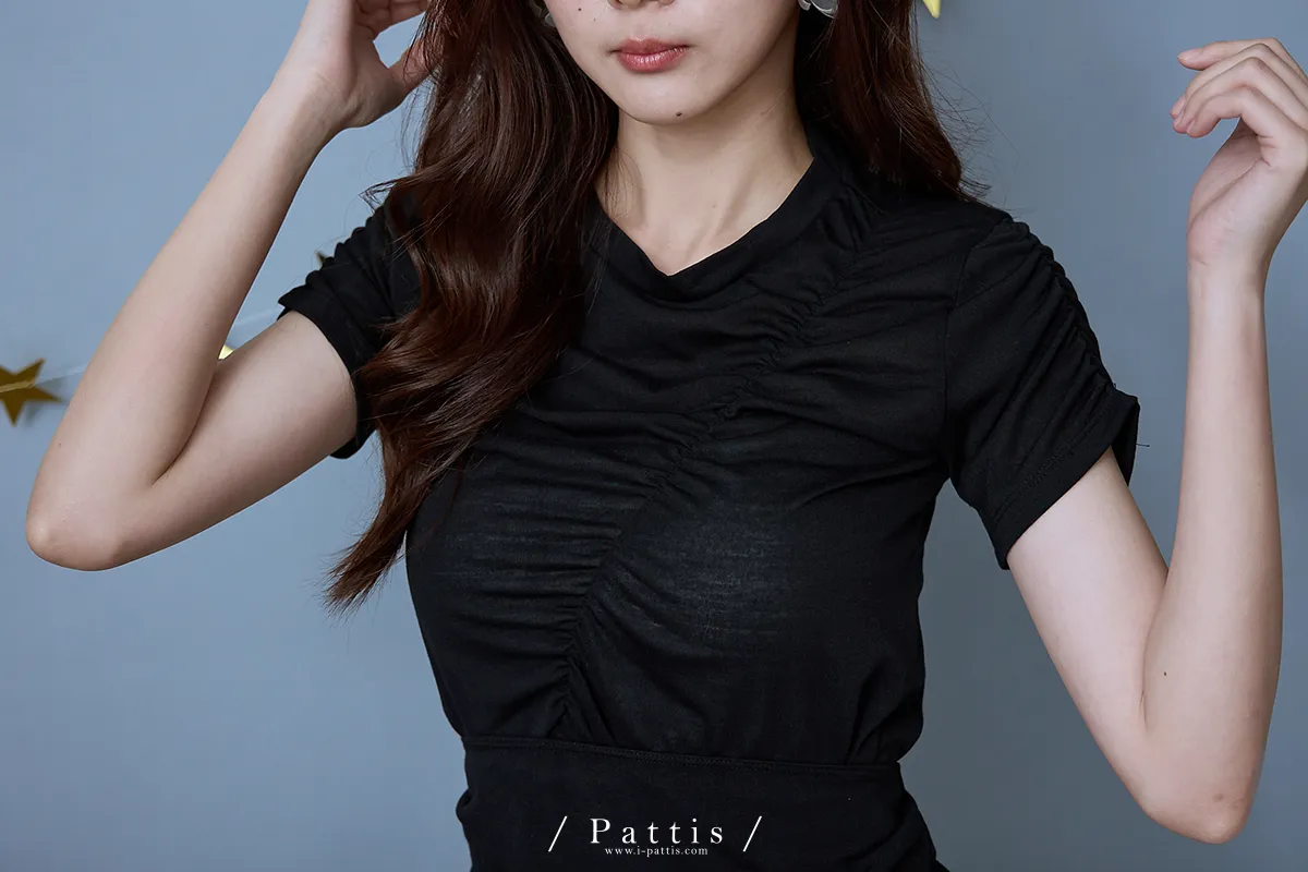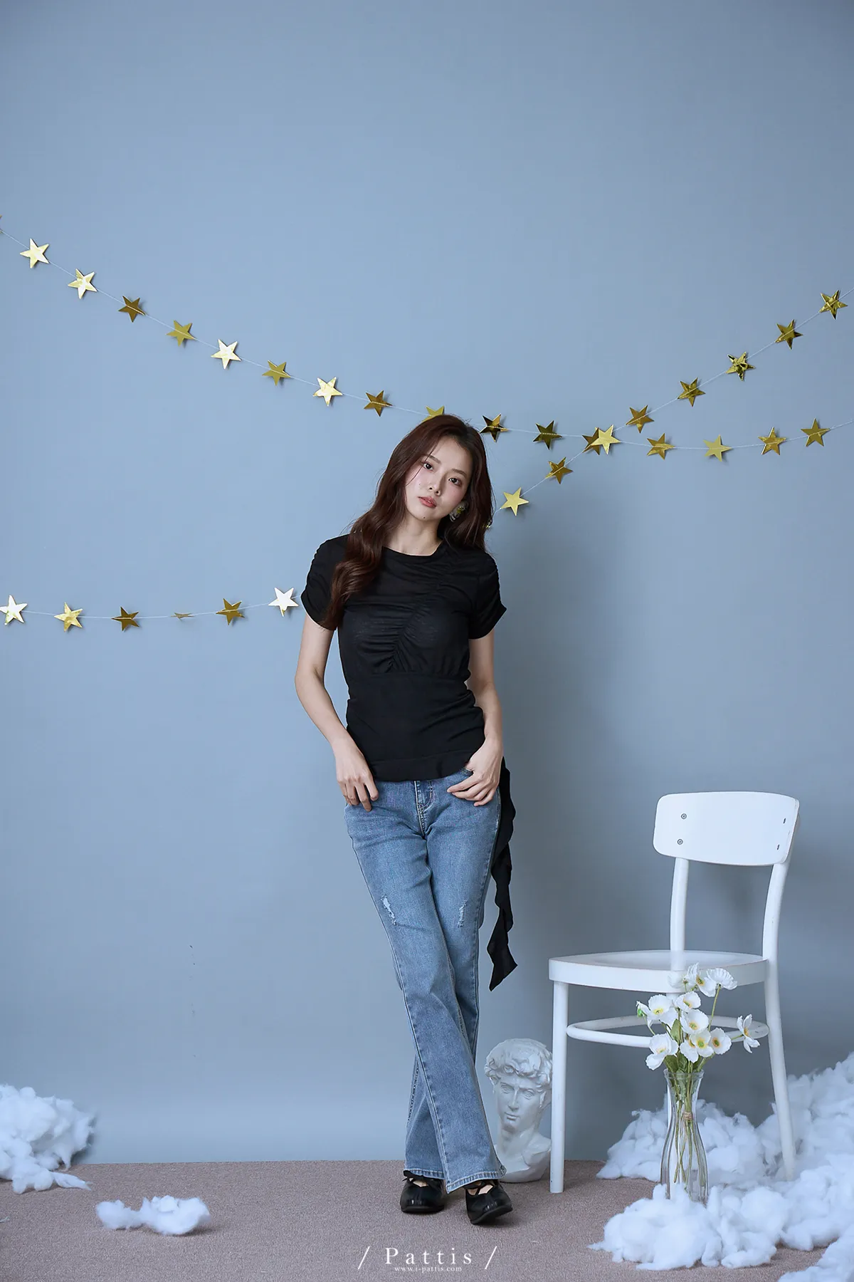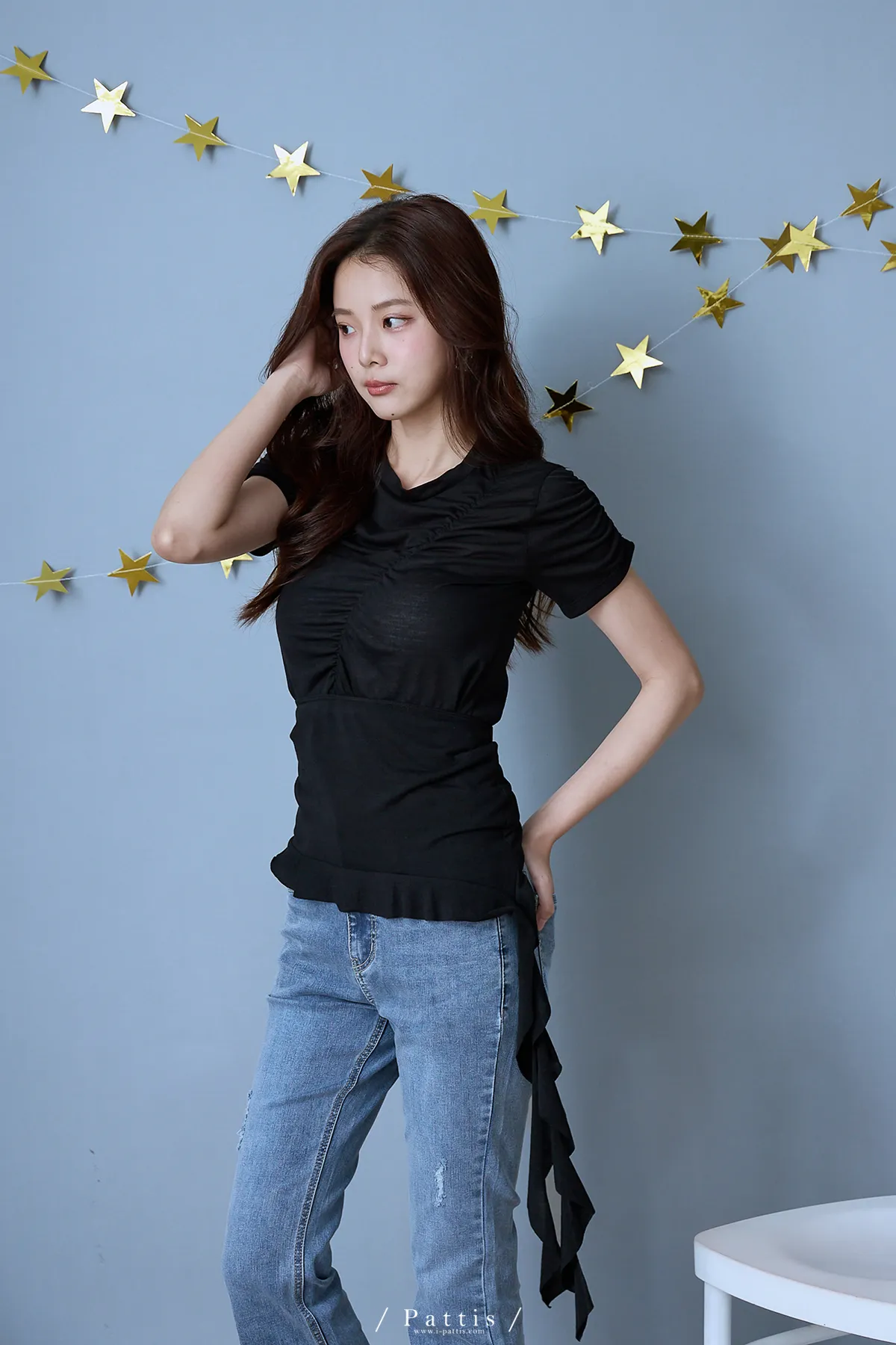 (現貨) 兩件式抓皺圓領上衣+荷葉斜邊背心set(黑)