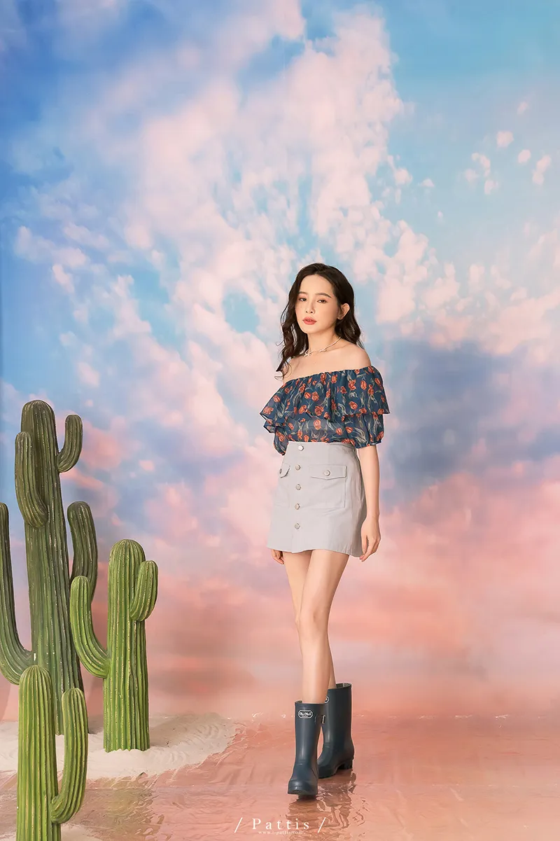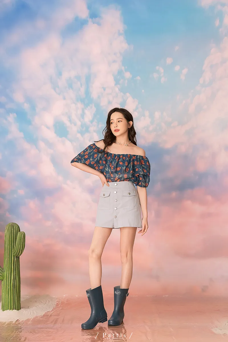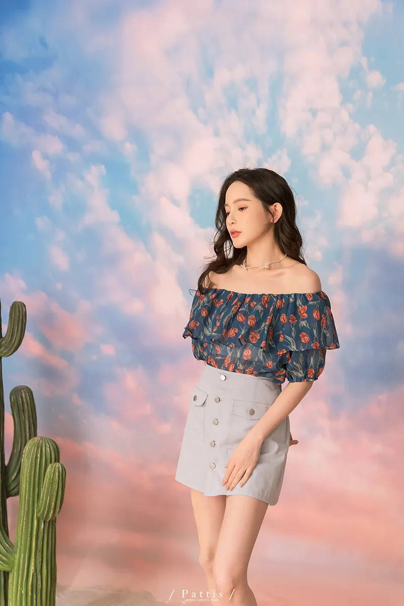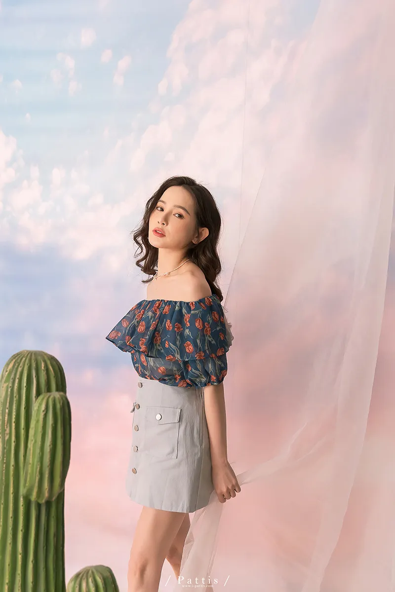 / NG品 原價$870 / *特*鬱金香抓皺2way一字領短袖上衣(藍)