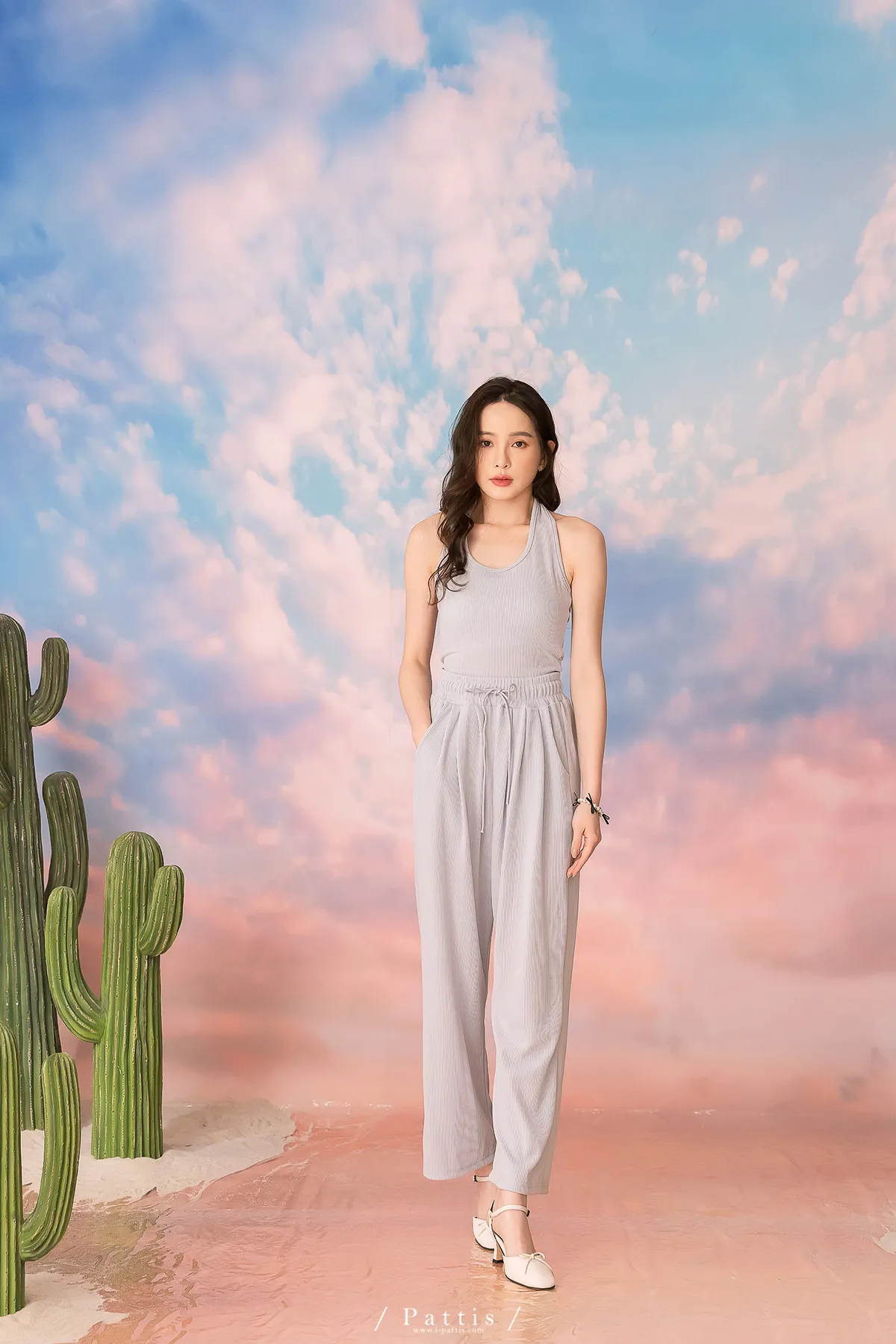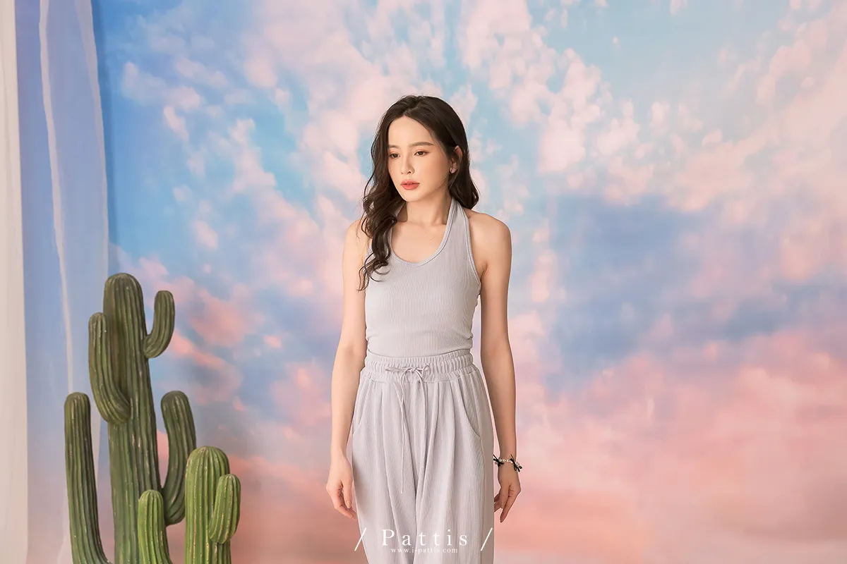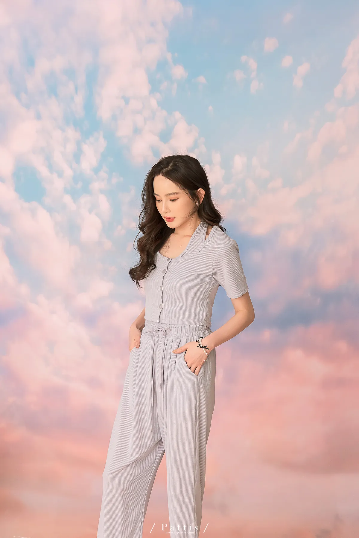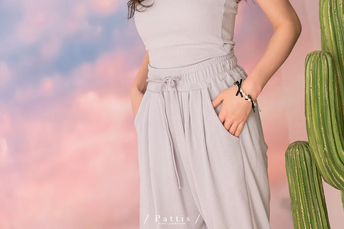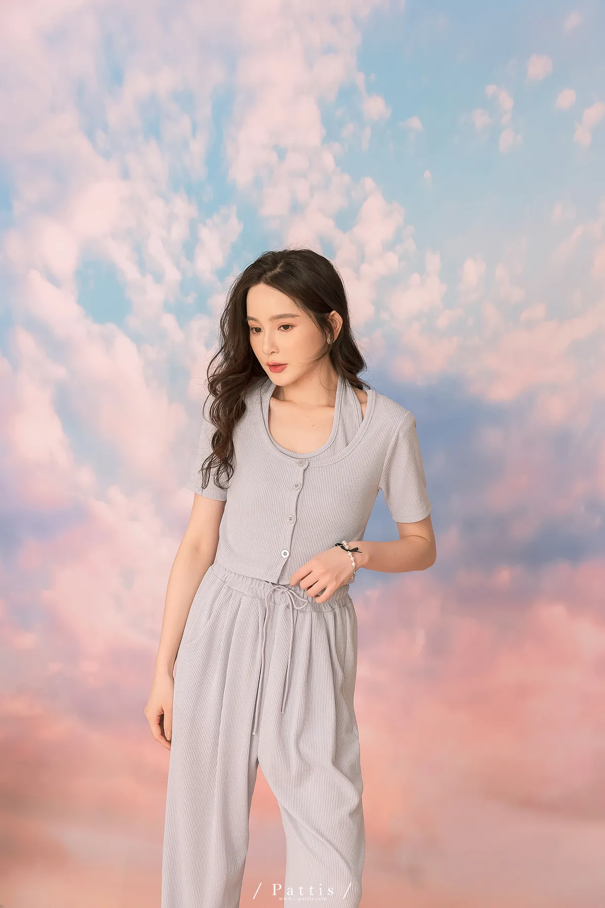 氣泡水與牛奶糖 | 羅紋繞頸背心+短外套+綁帶長褲三件set(淺藍)