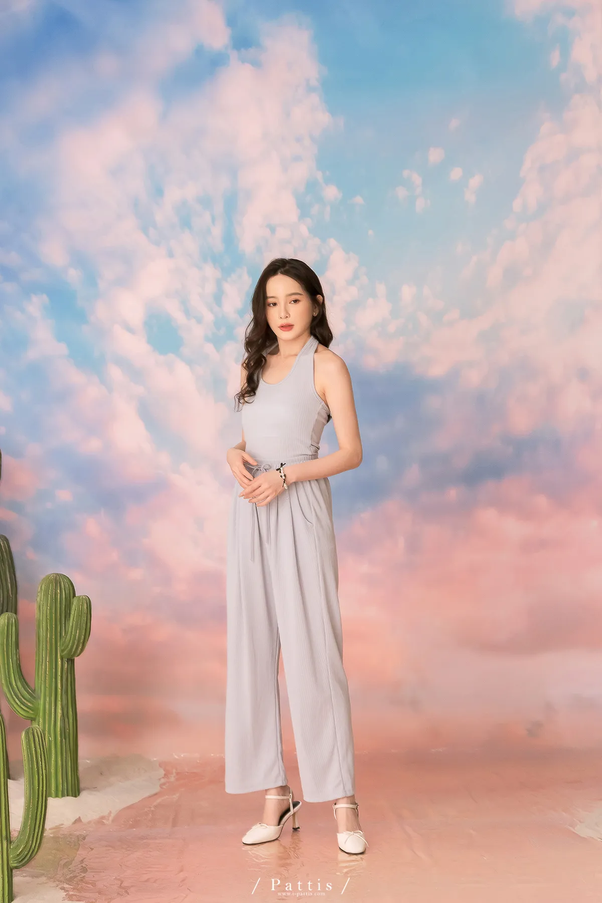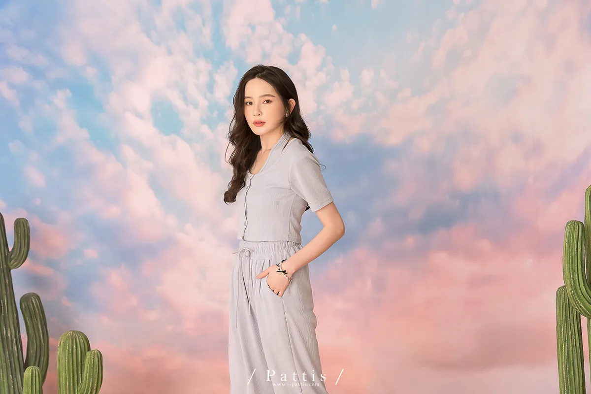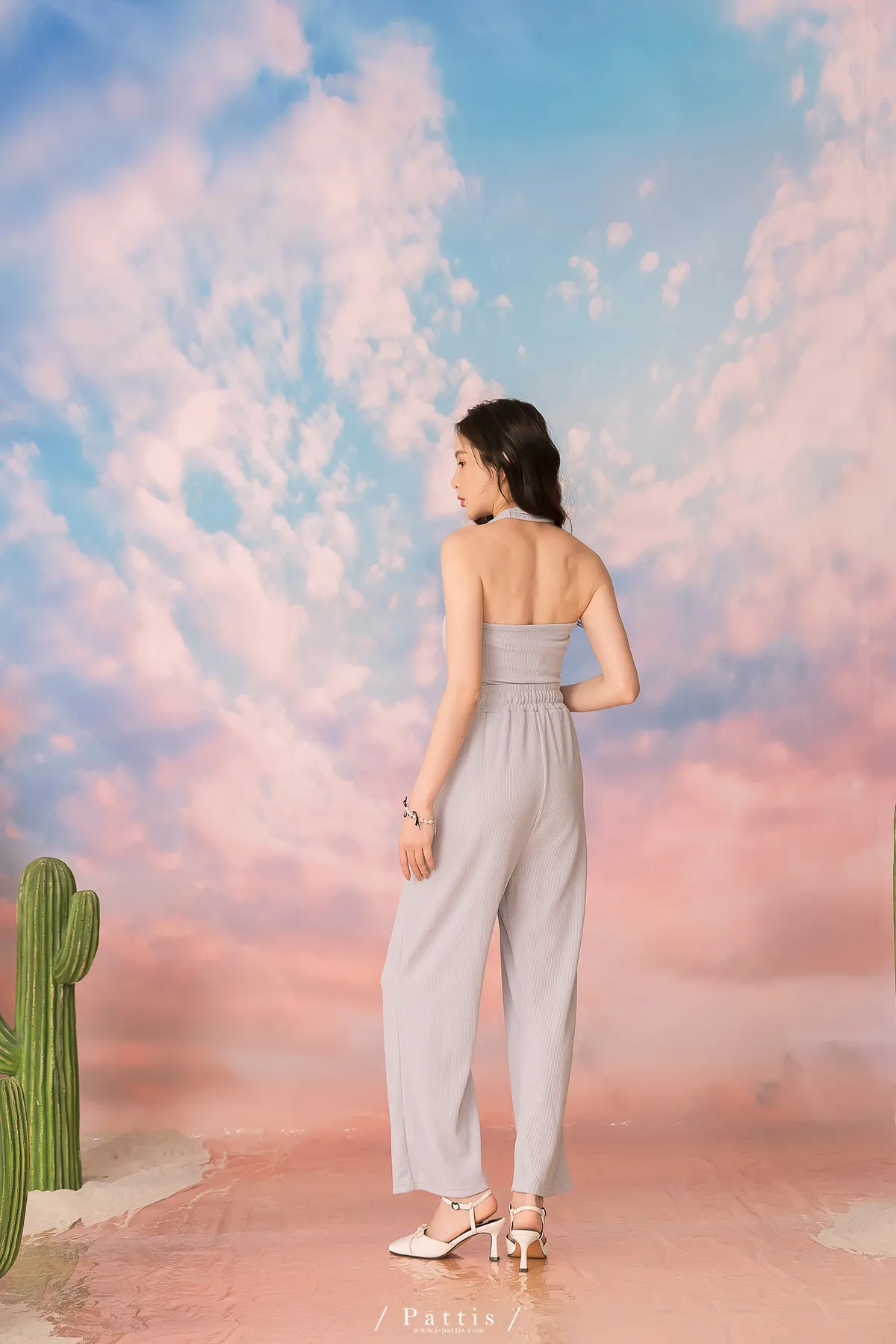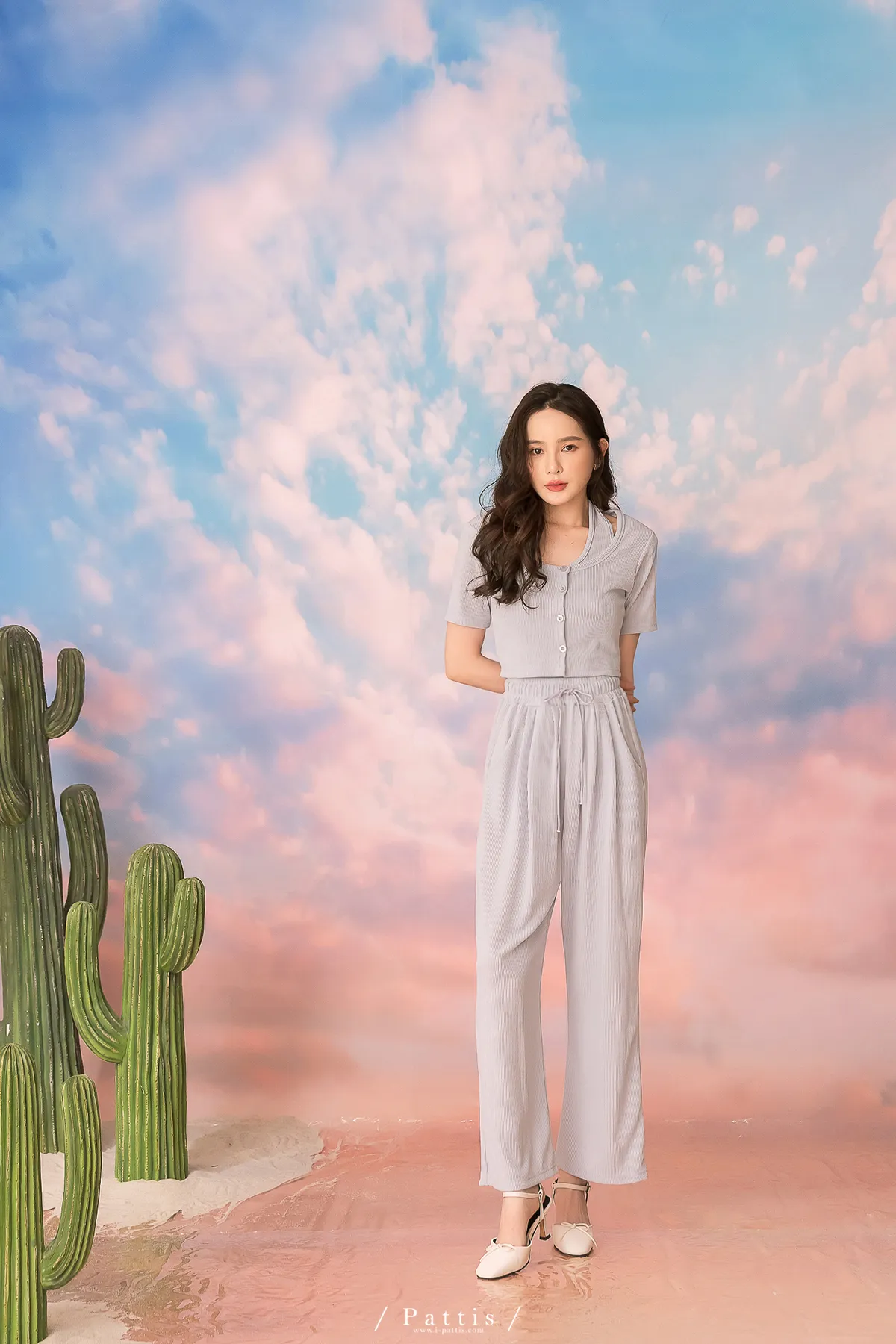 氣泡水與牛奶糖 | 羅紋繞頸背心+短外套+綁帶長褲三件set(淺藍)