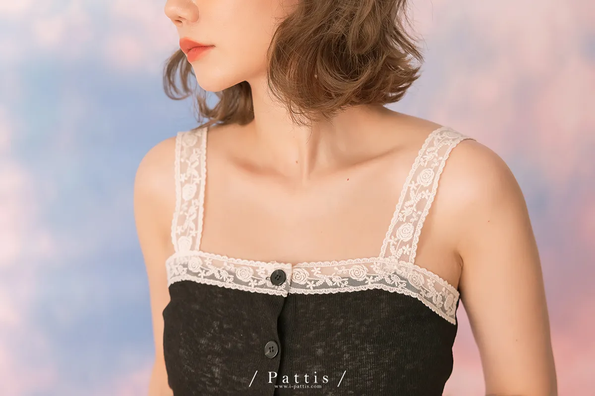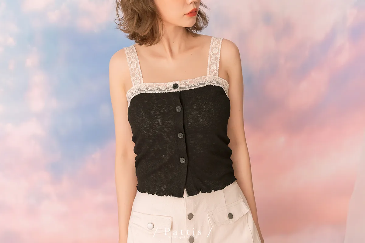 *特*綴蕾絲拼接鈕扣背心彈性上衣(黑)