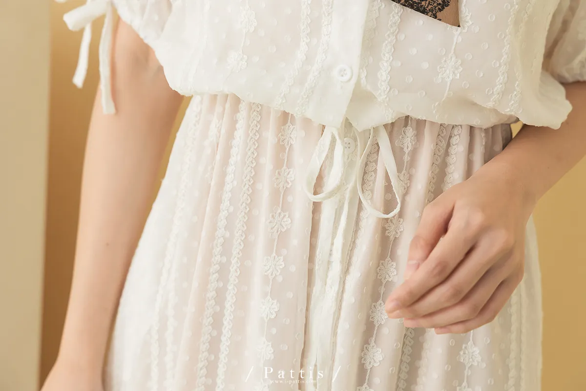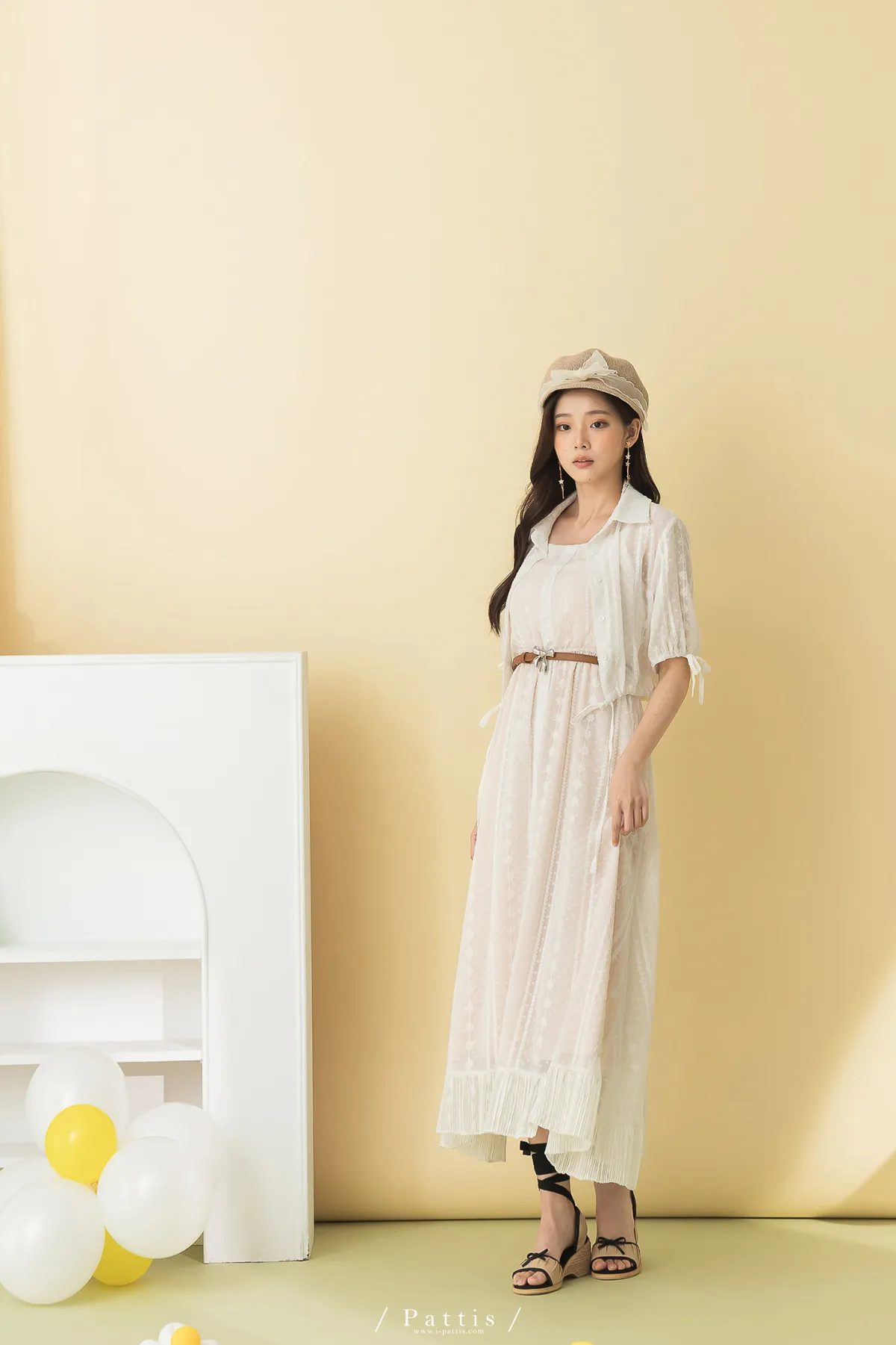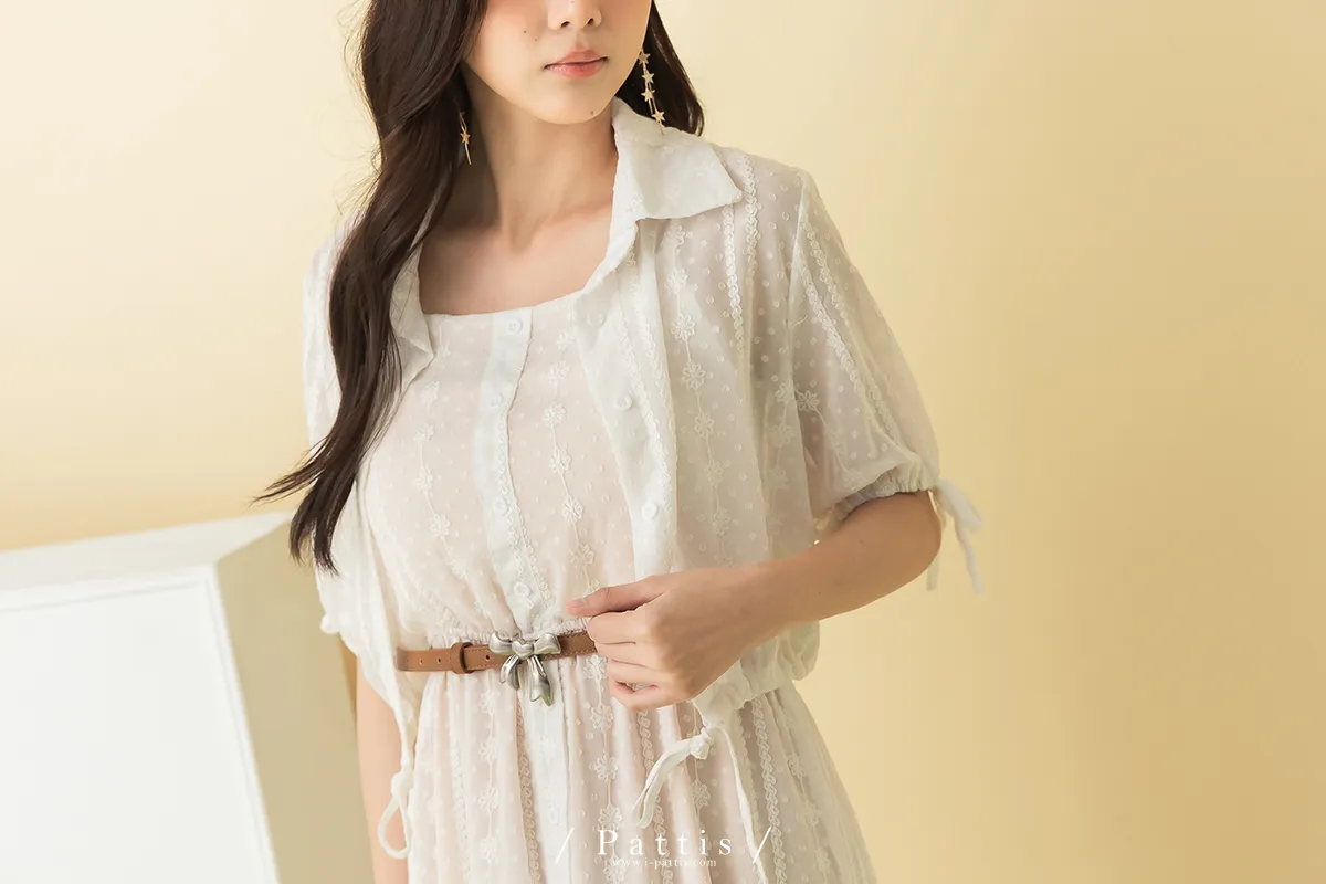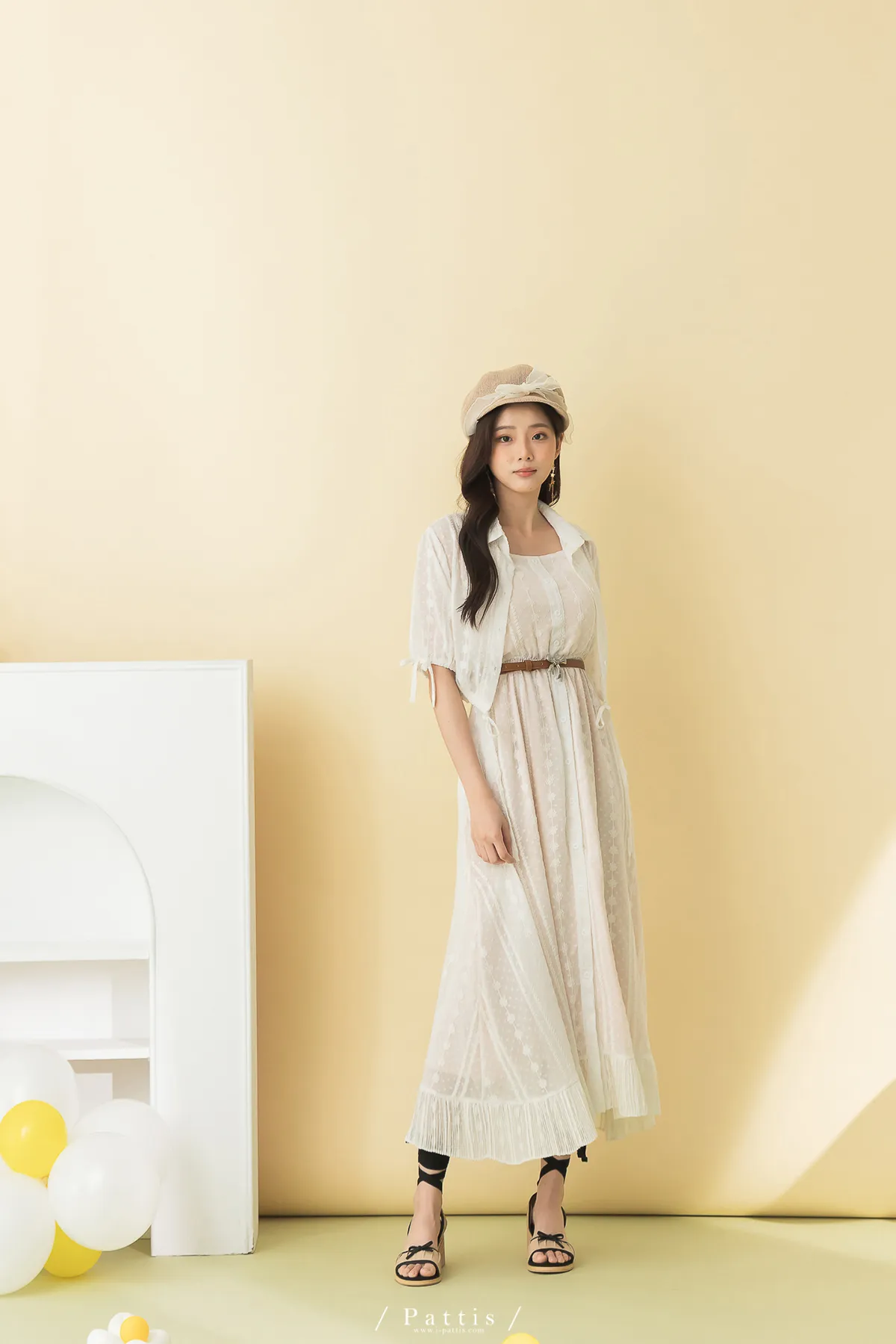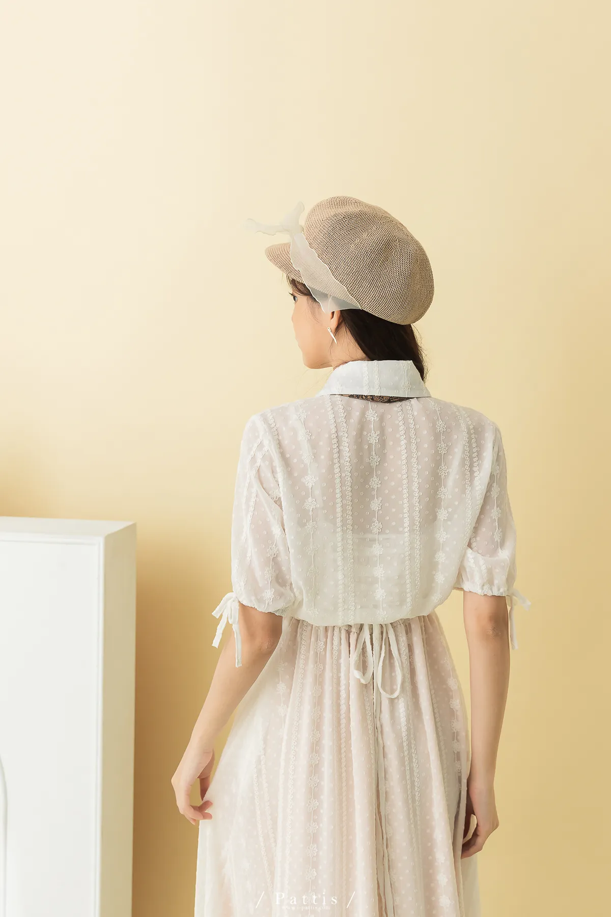 飛花釀成換日線 | 小雛菊浮雕條紋後馬甲洋裝+抽繩蓬袖短外套set(夏晝白)