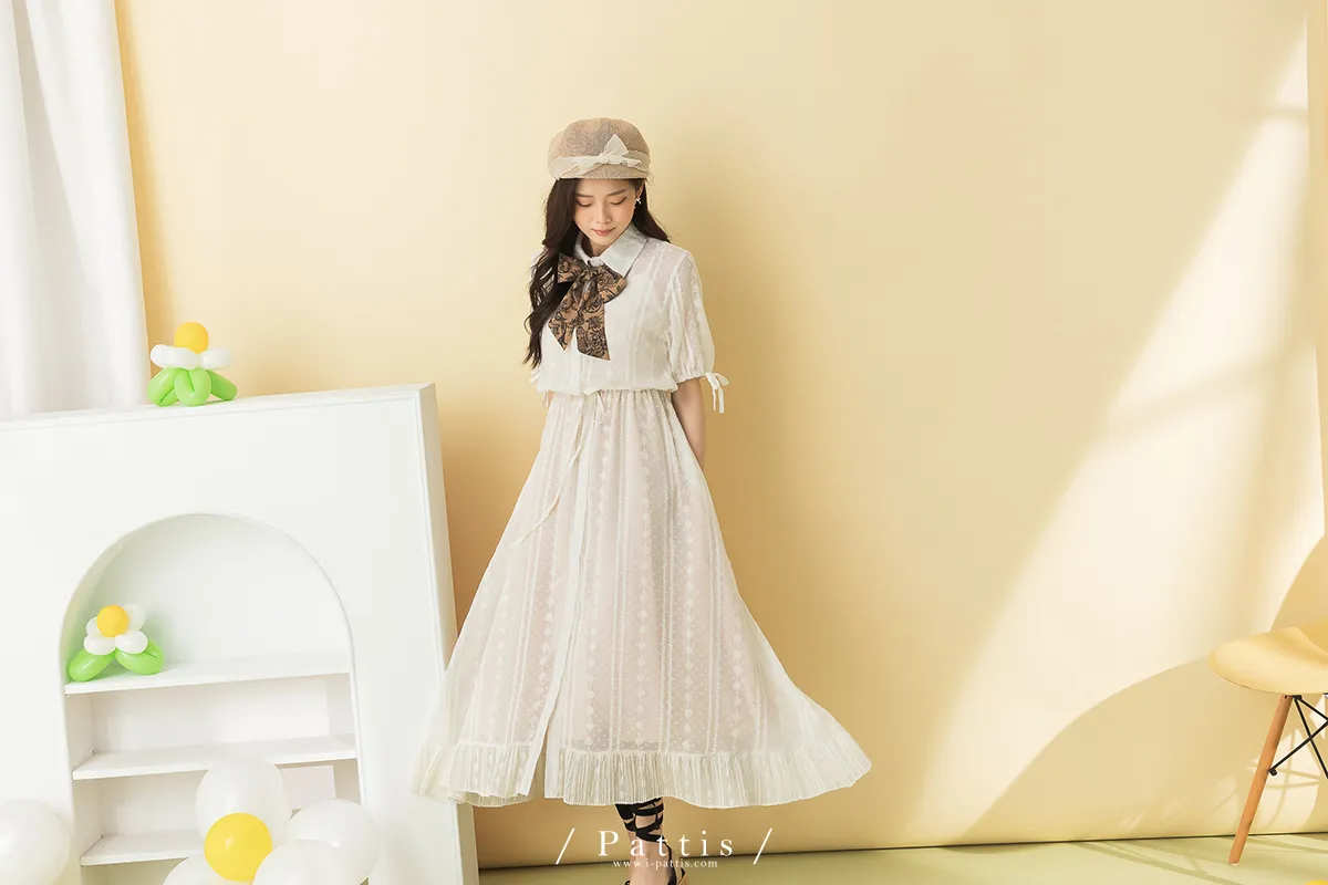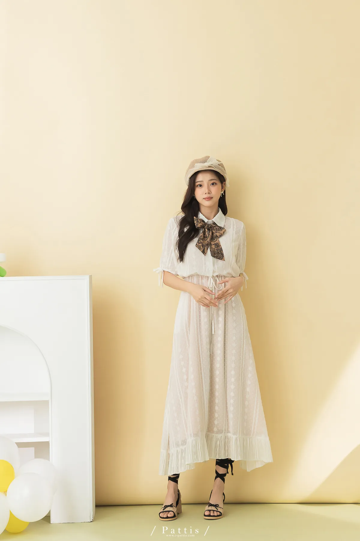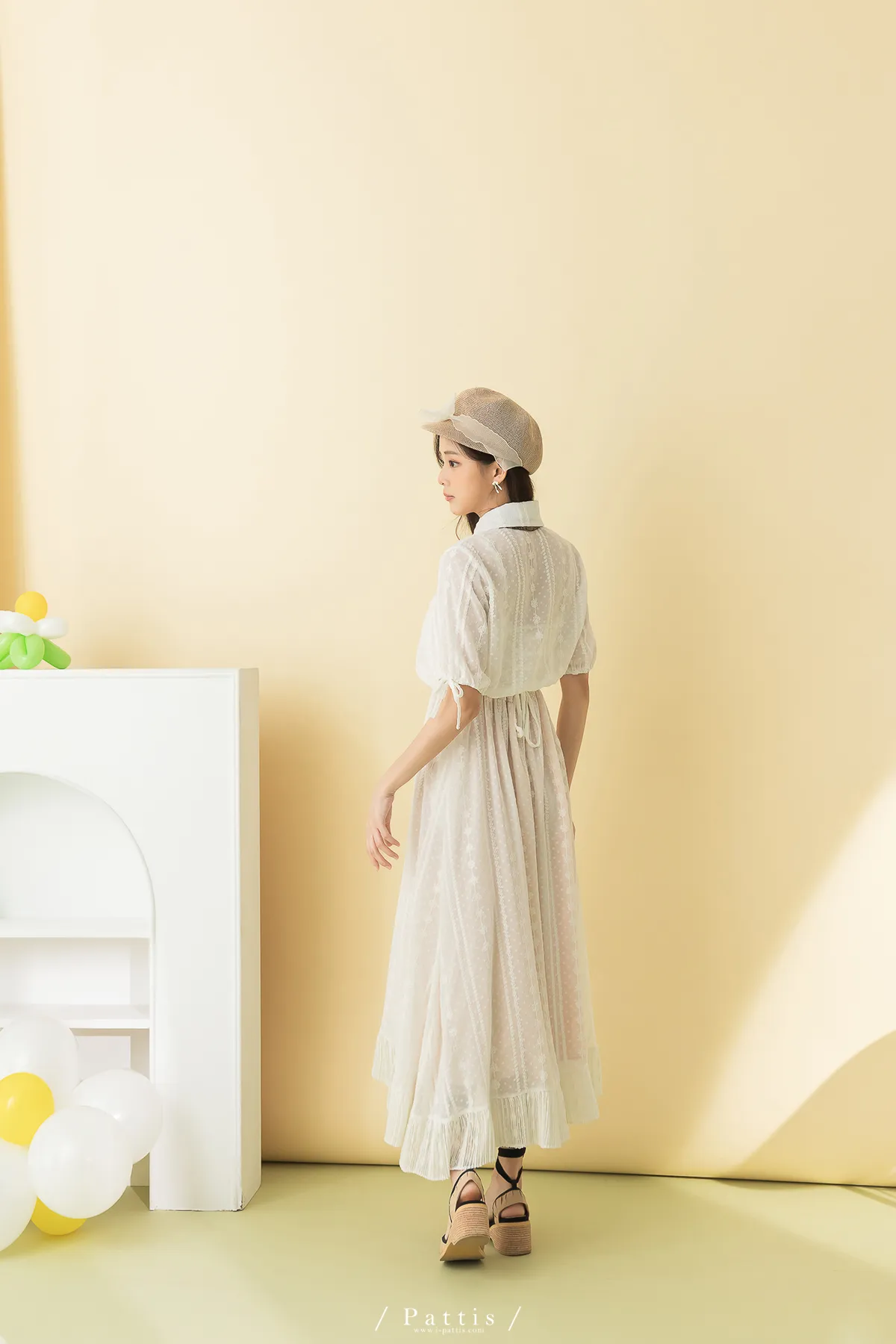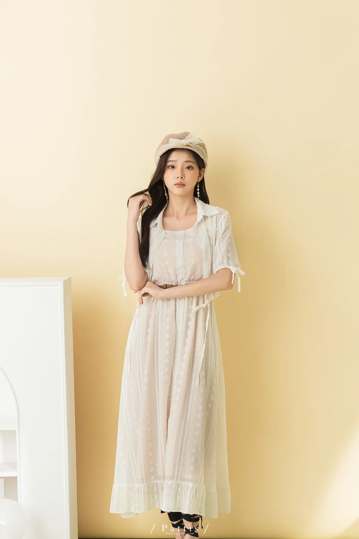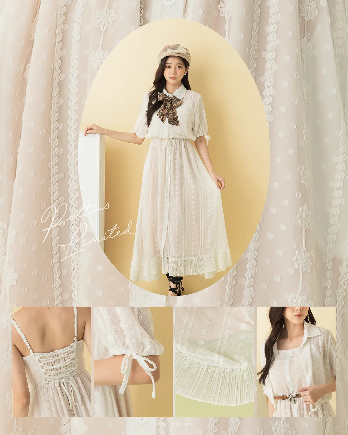 飛花釀成換日線 | 小雛菊浮雕條紋後馬甲洋裝+抽繩蓬袖短外套set(夏晝白)