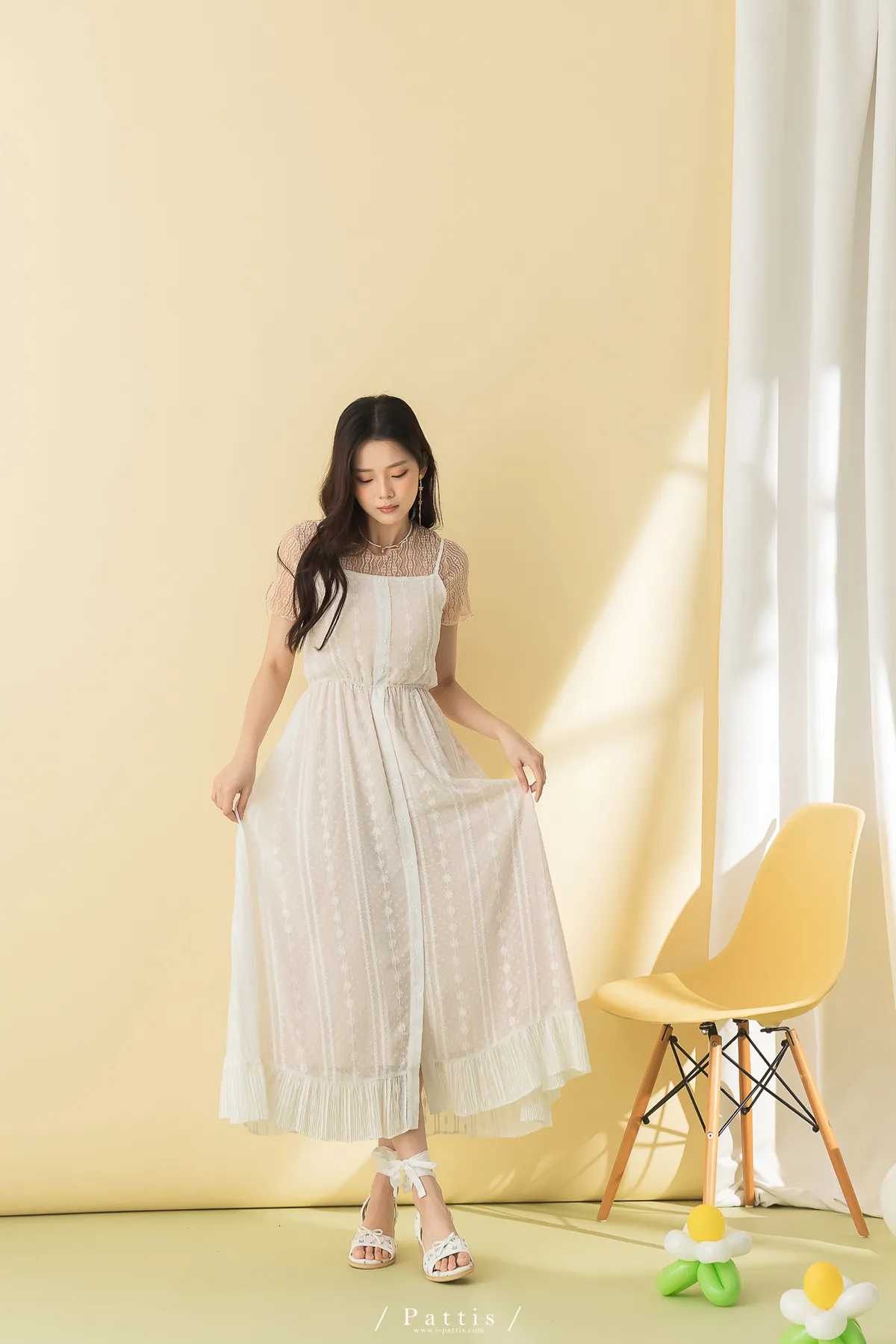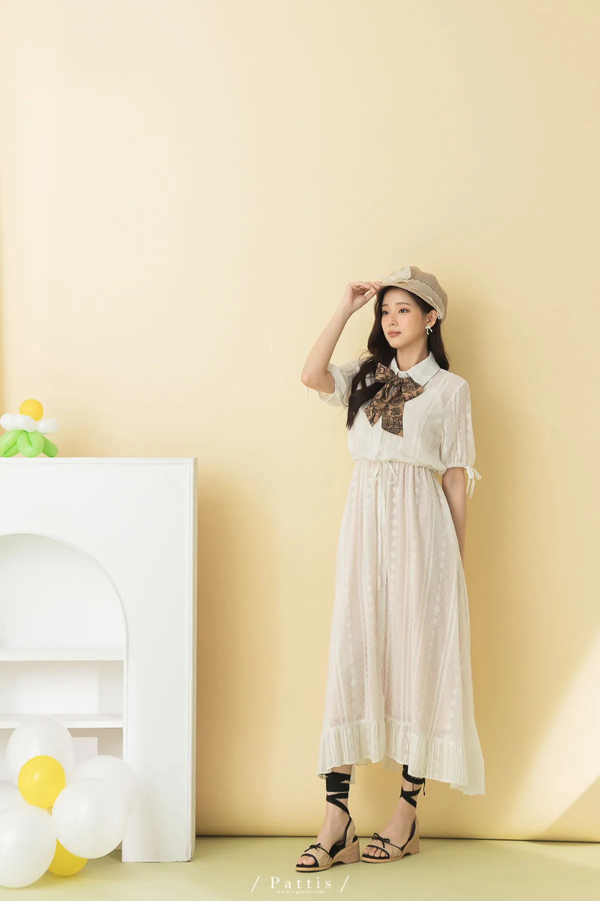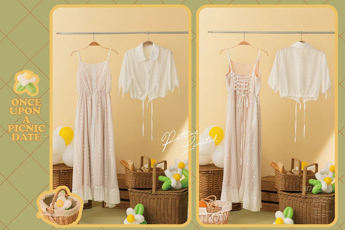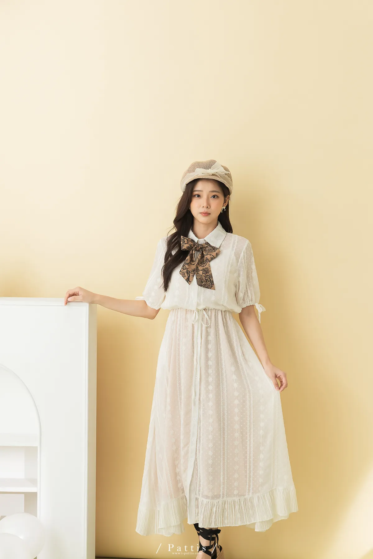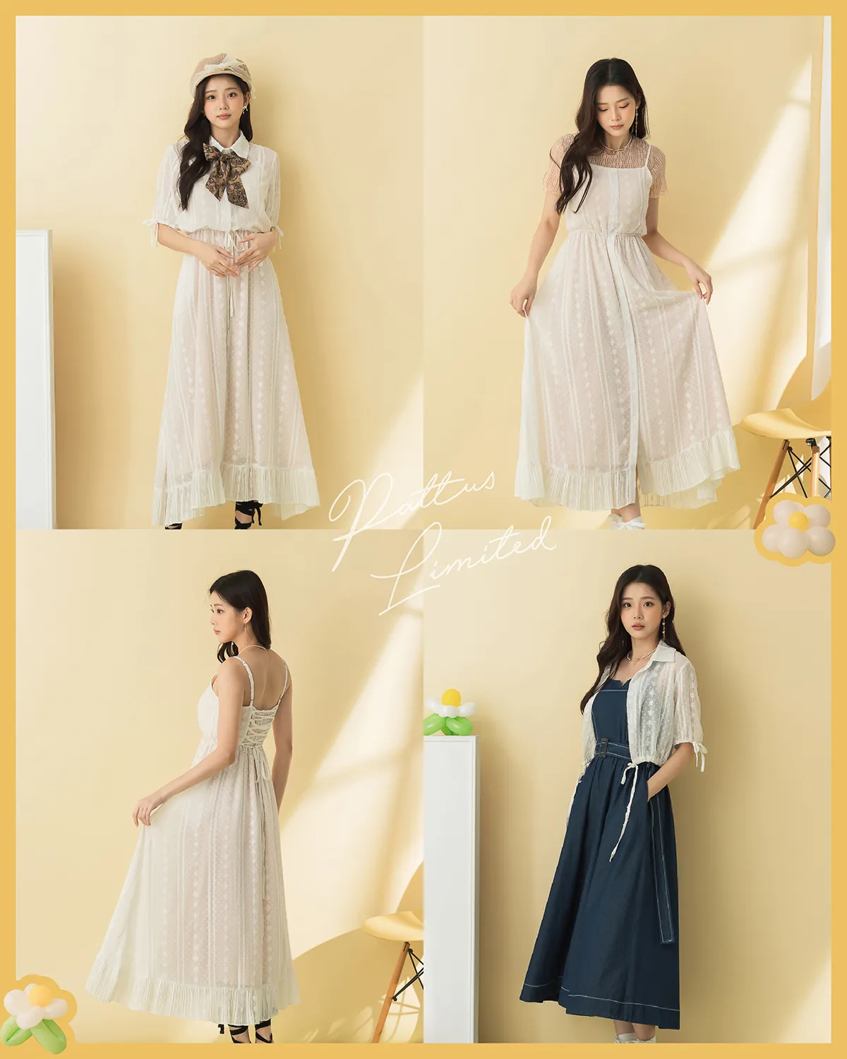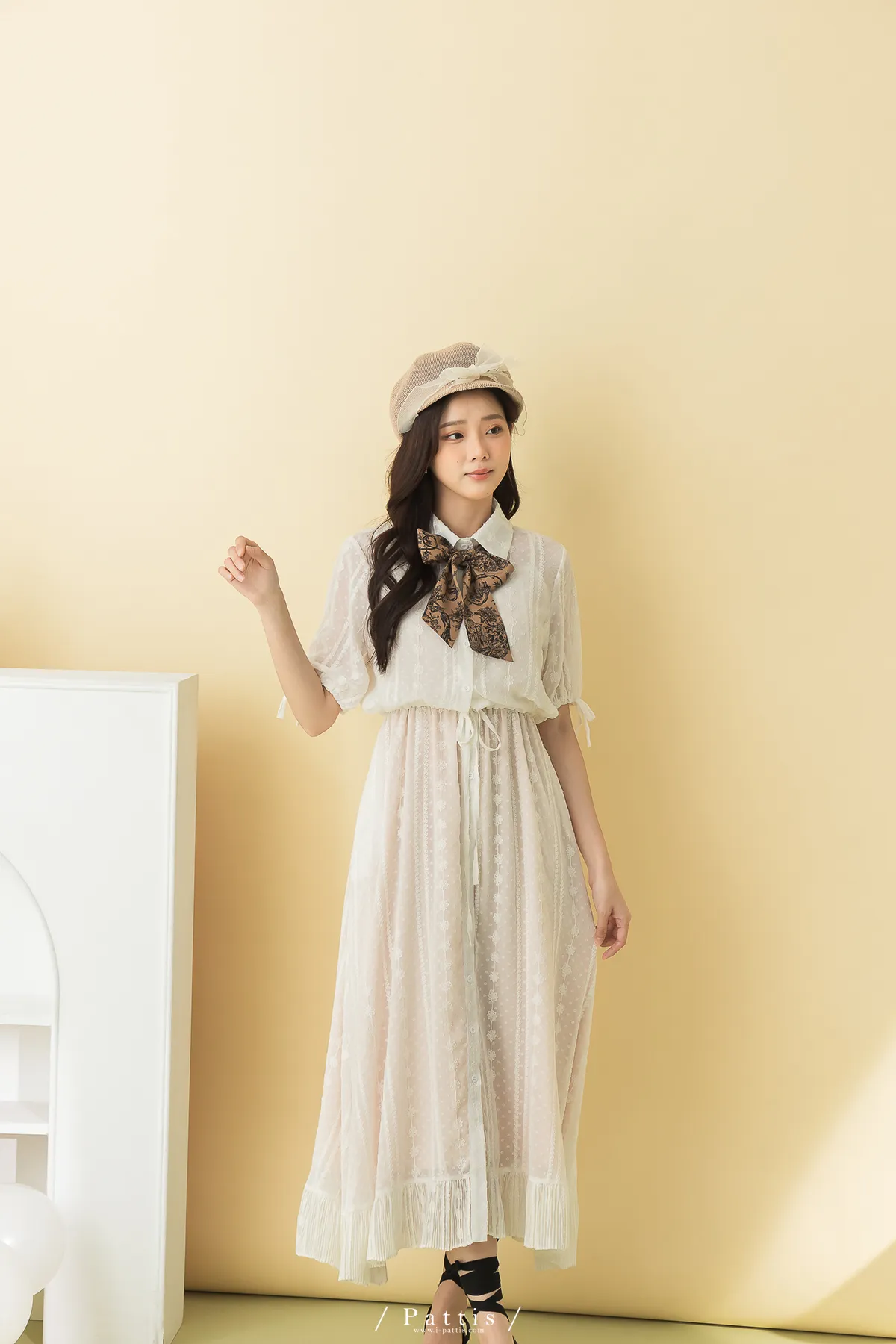 飛花釀成換日線 | 小雛菊浮雕條紋後馬甲洋裝+抽繩蓬袖短外套set(夏晝白)