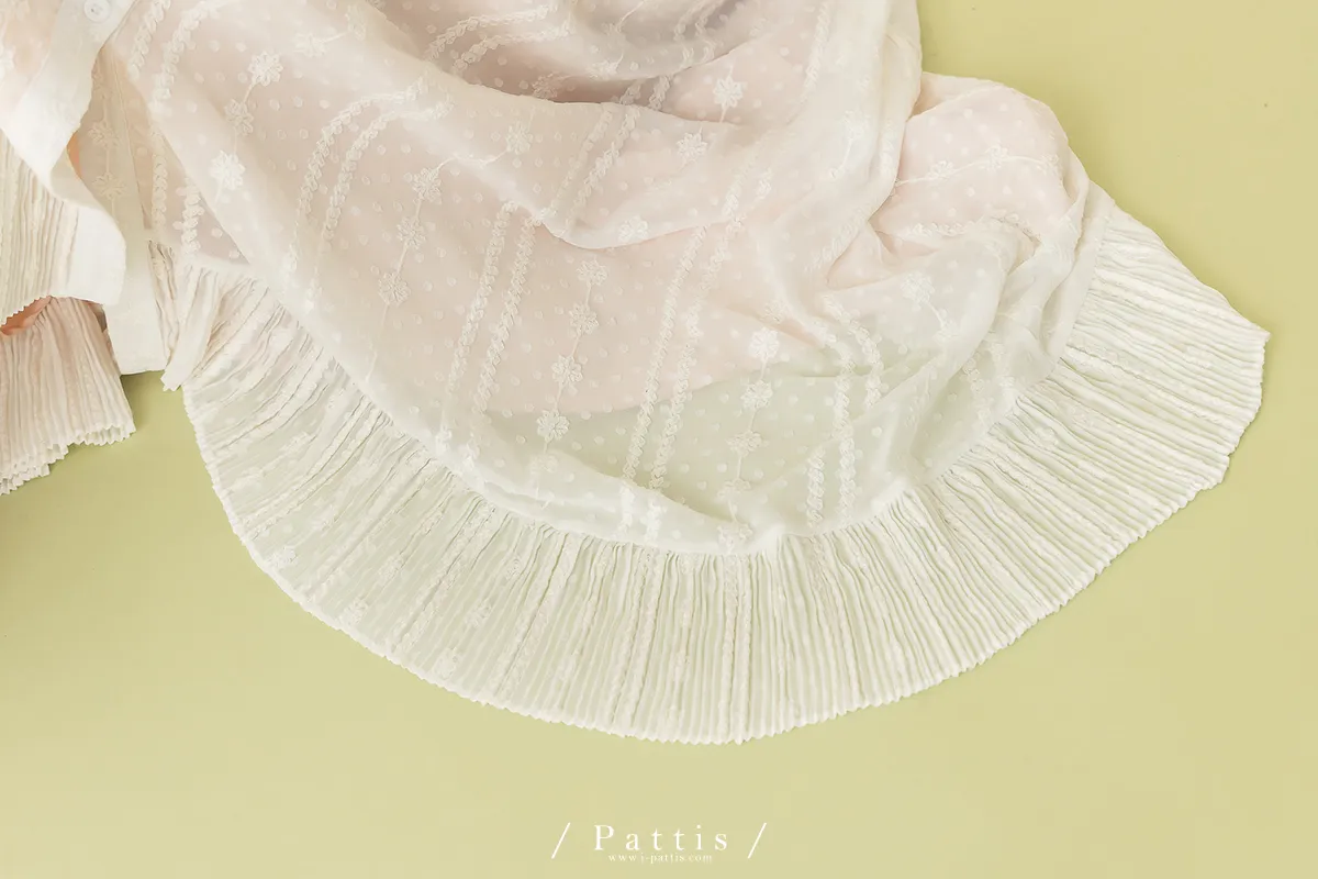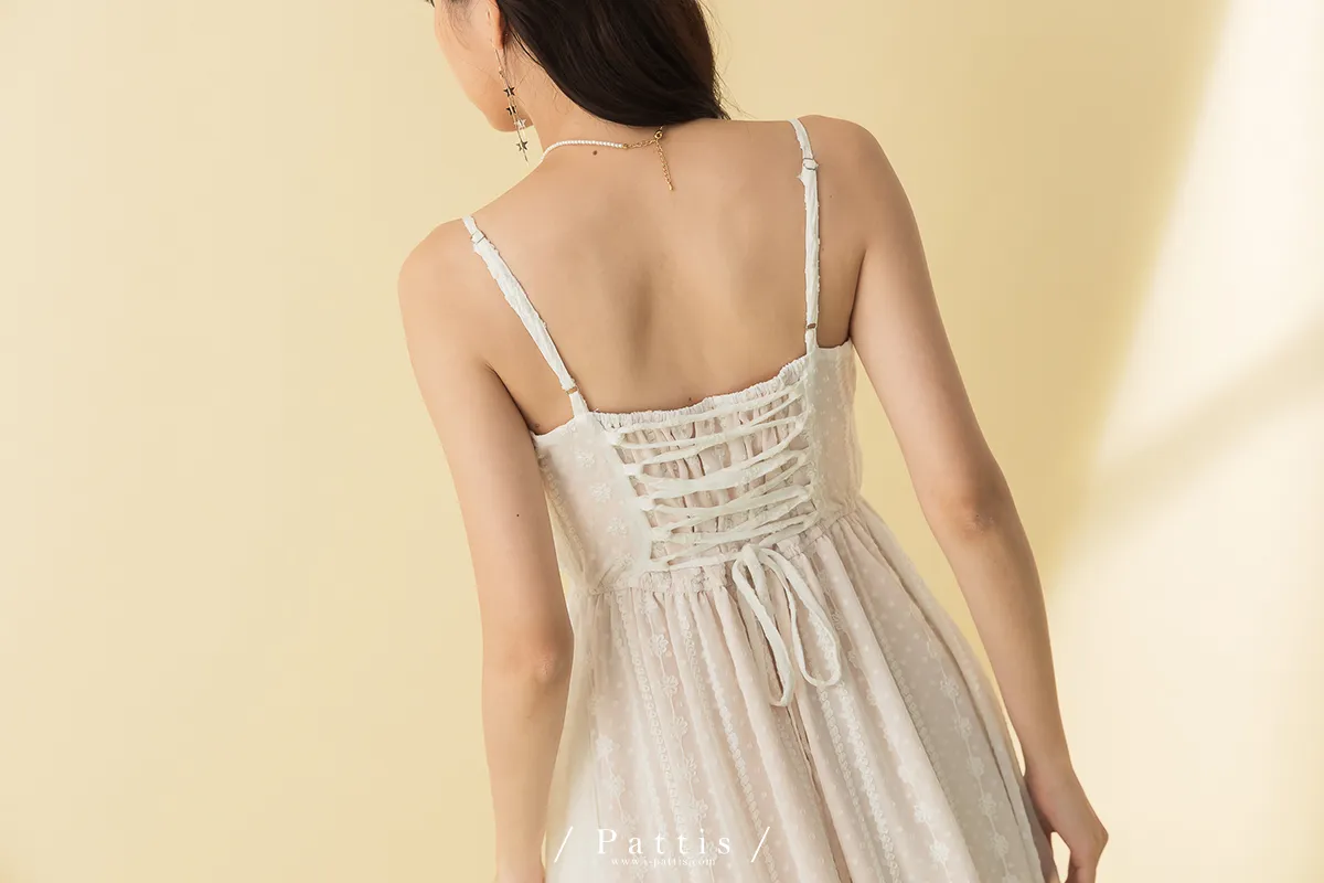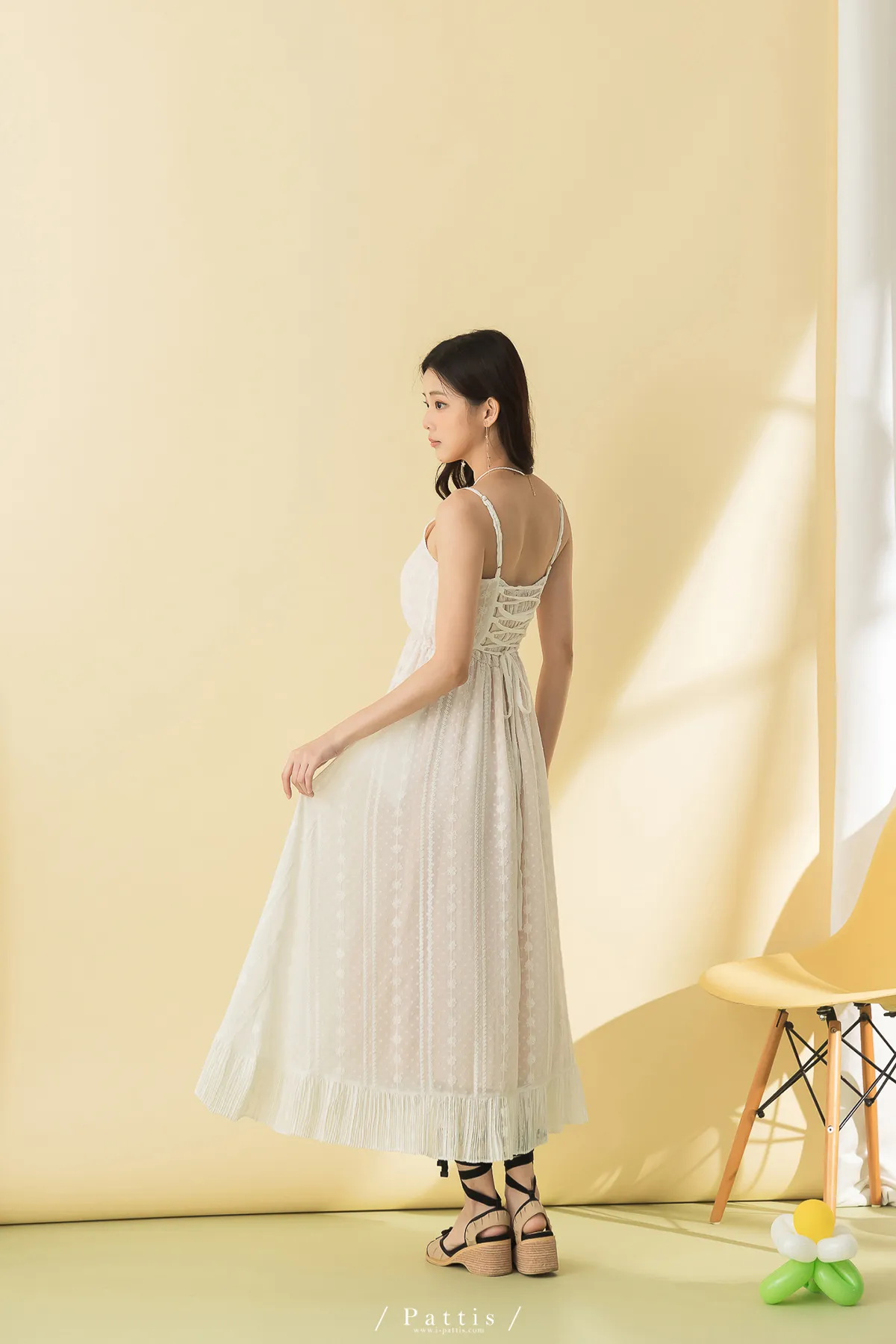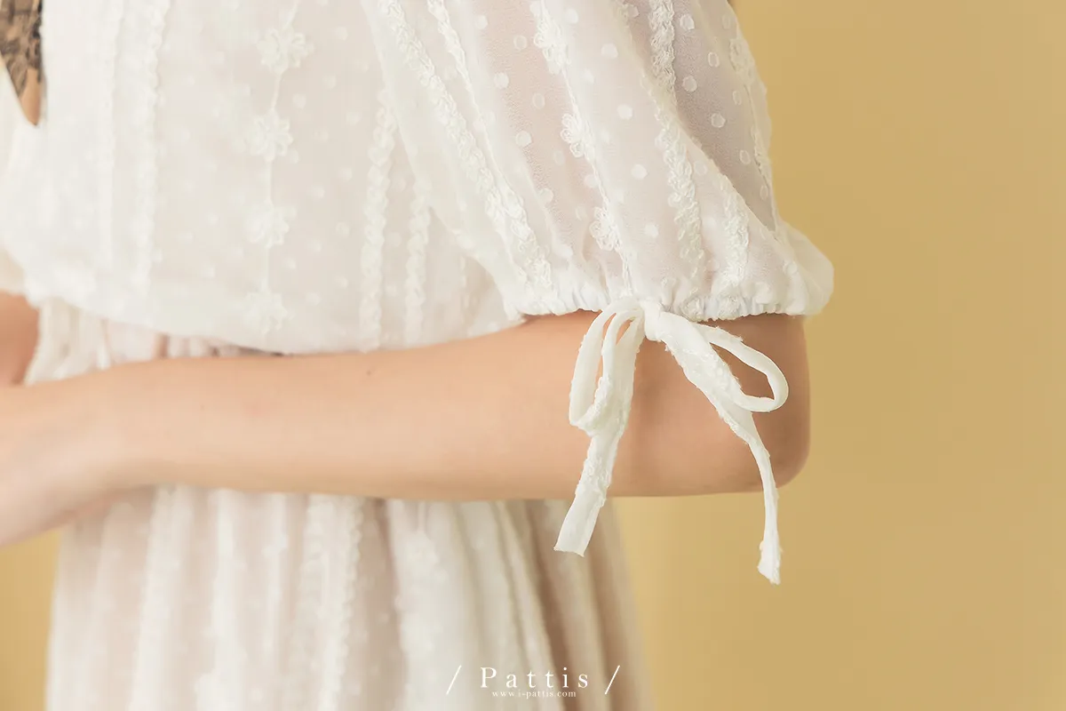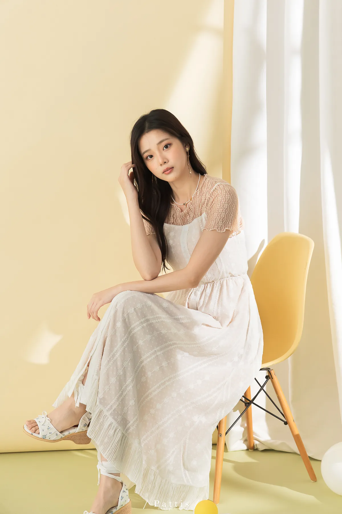 飛花釀成換日線 | 小雛菊浮雕條紋後馬甲洋裝+抽繩蓬袖短外套set(夏晝白)