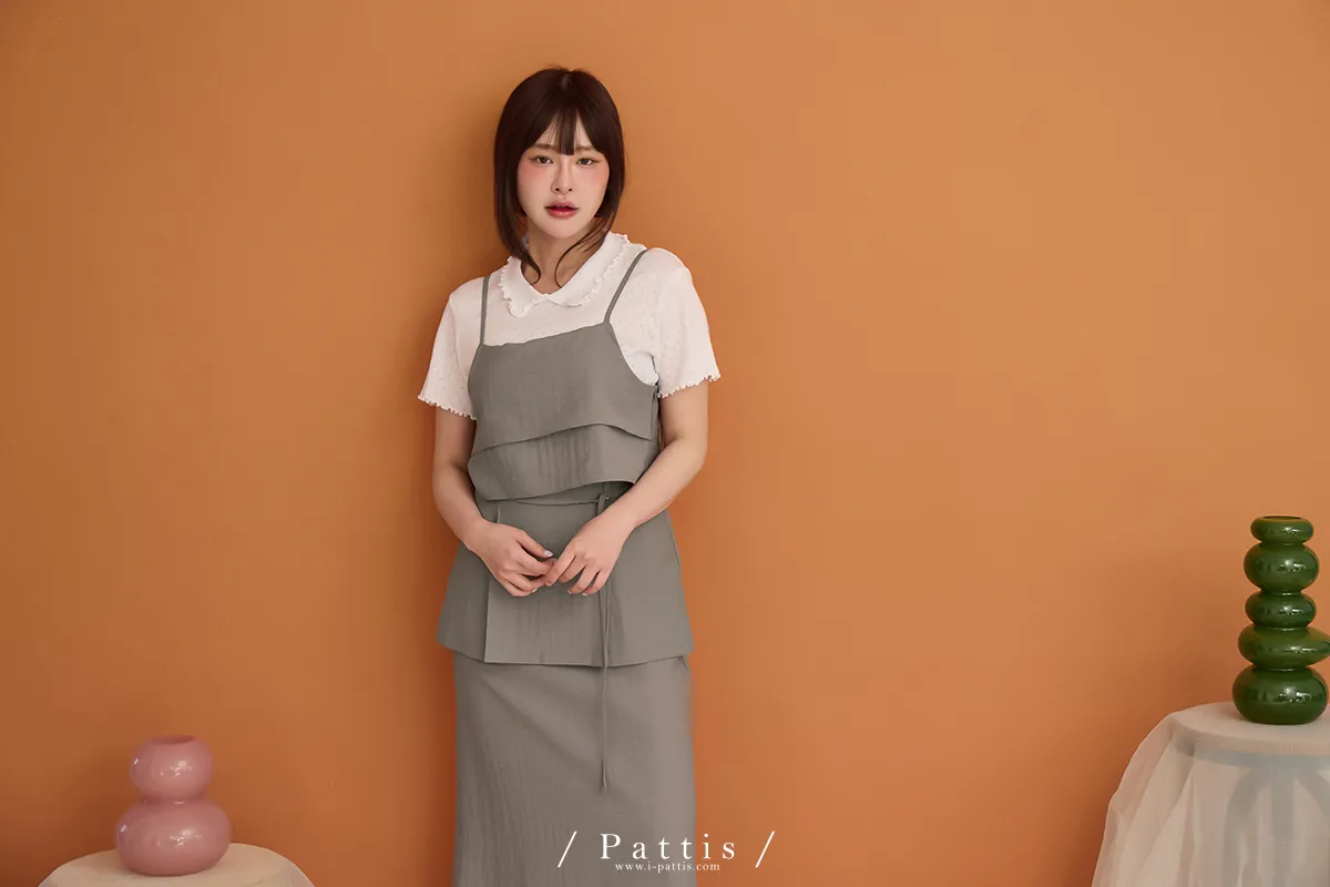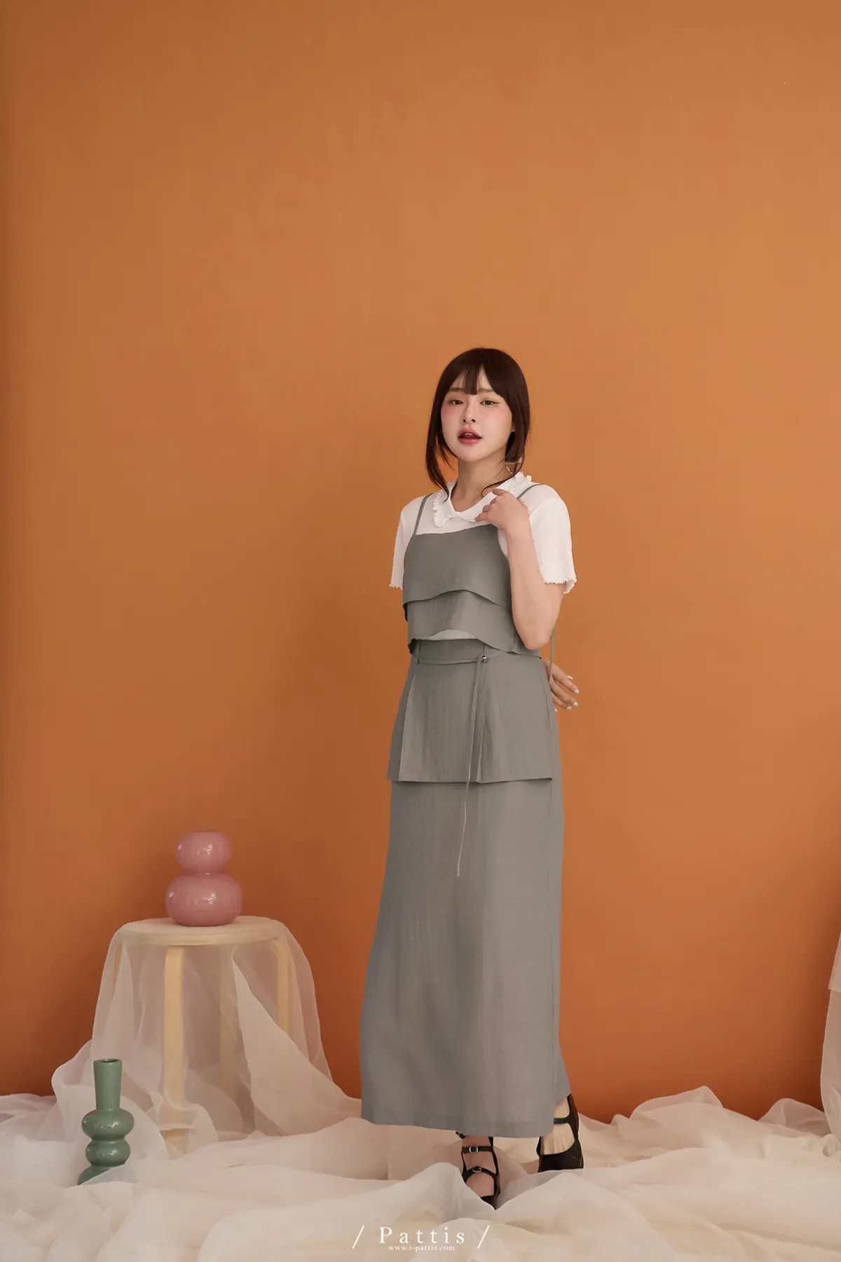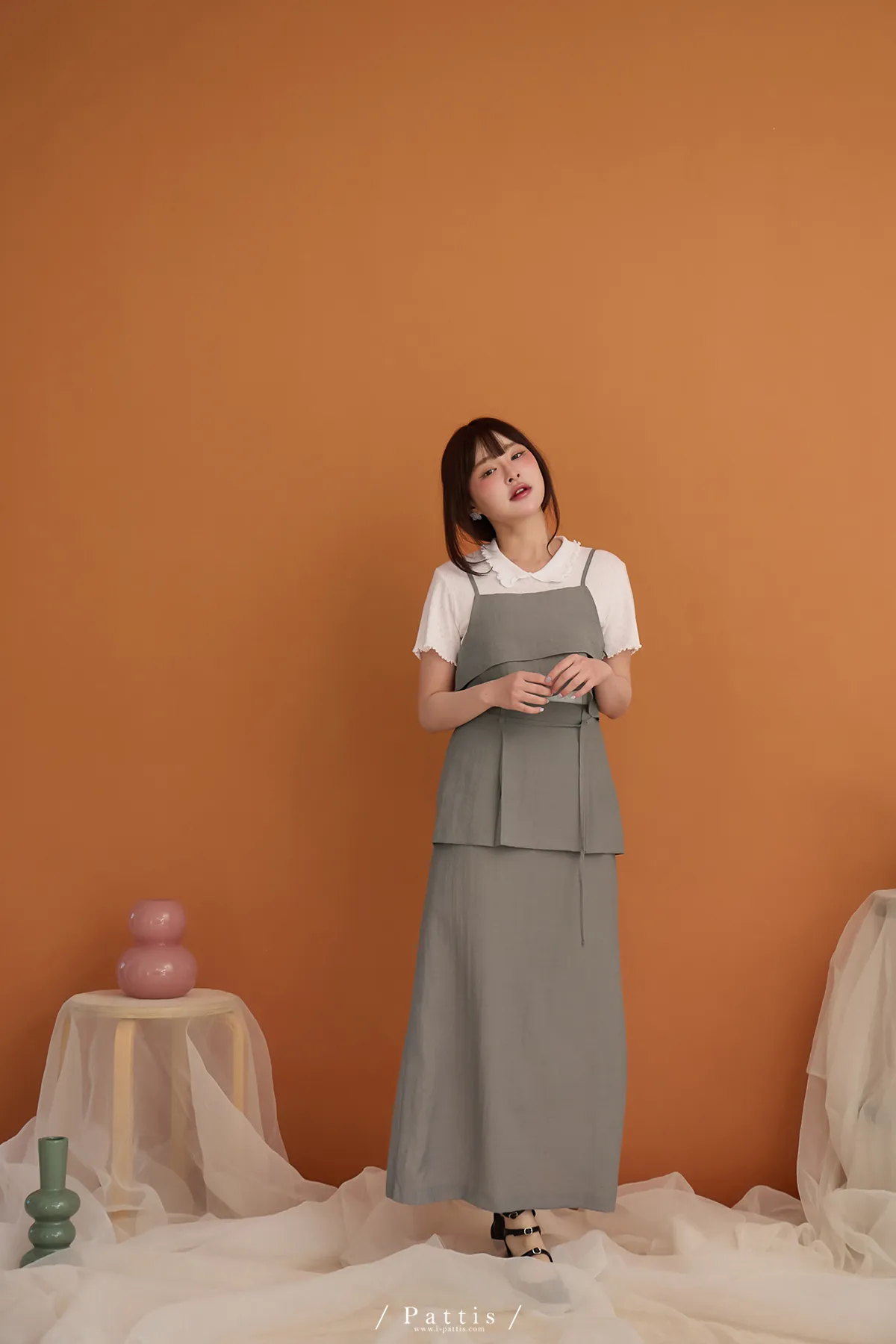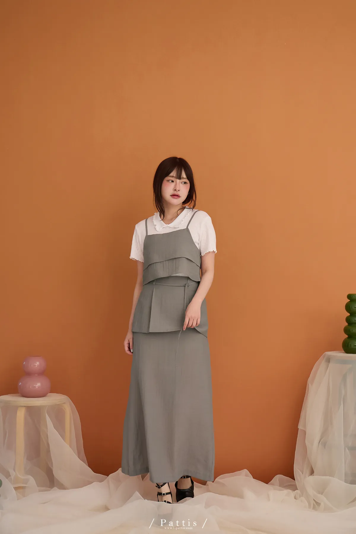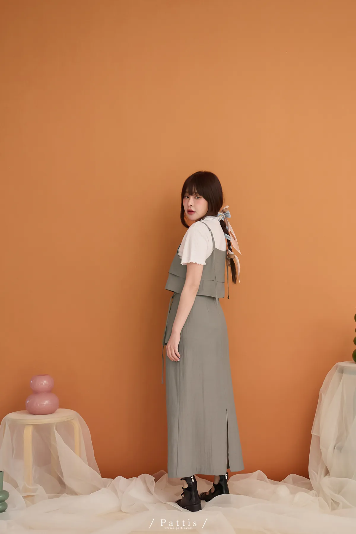 (現貨) 空氣裡的雨茶香 | (可分售)雙層吊帶背心+假兩件長裙set(灰)