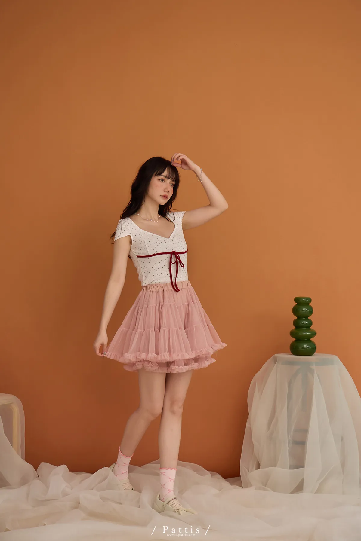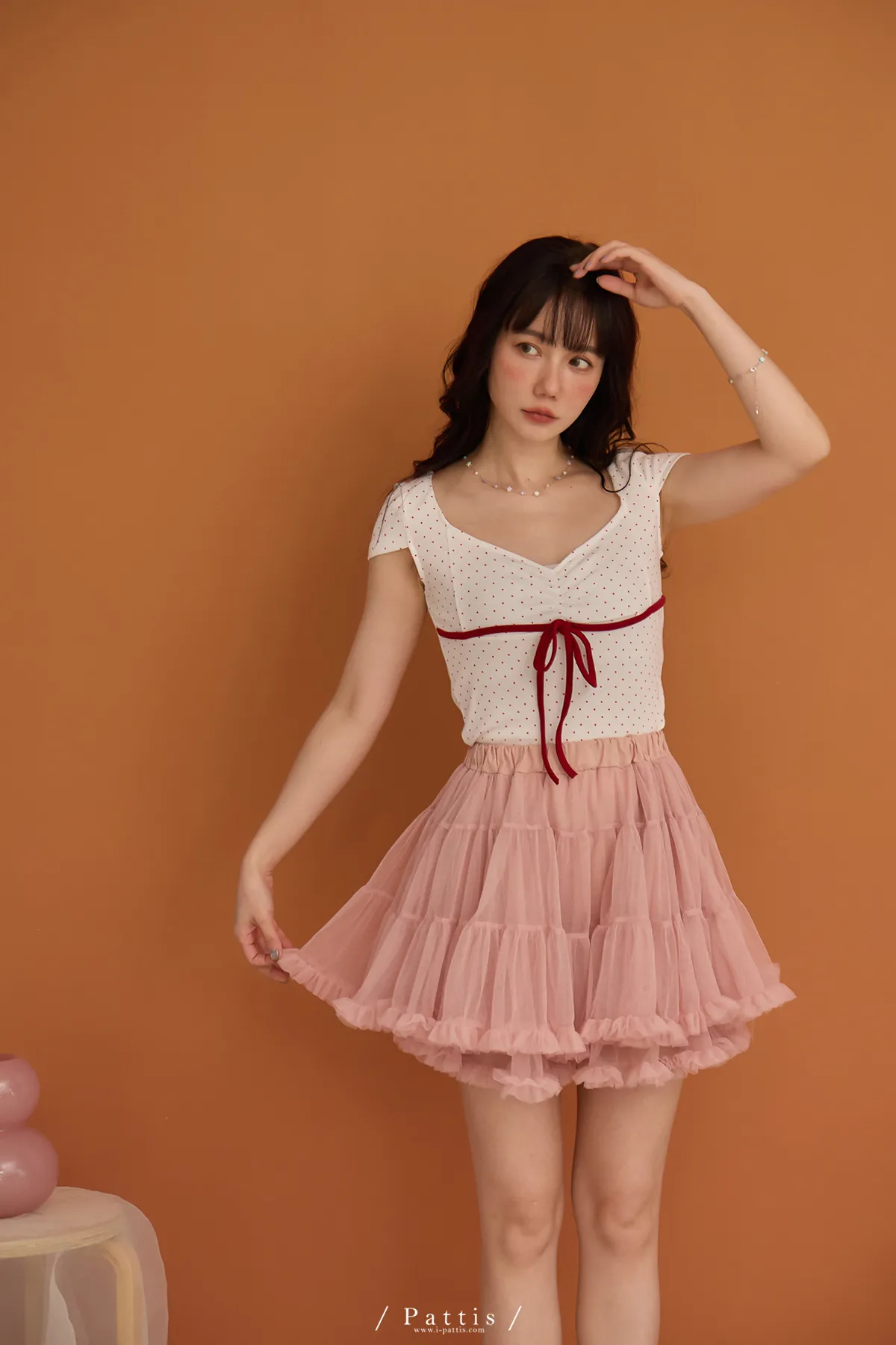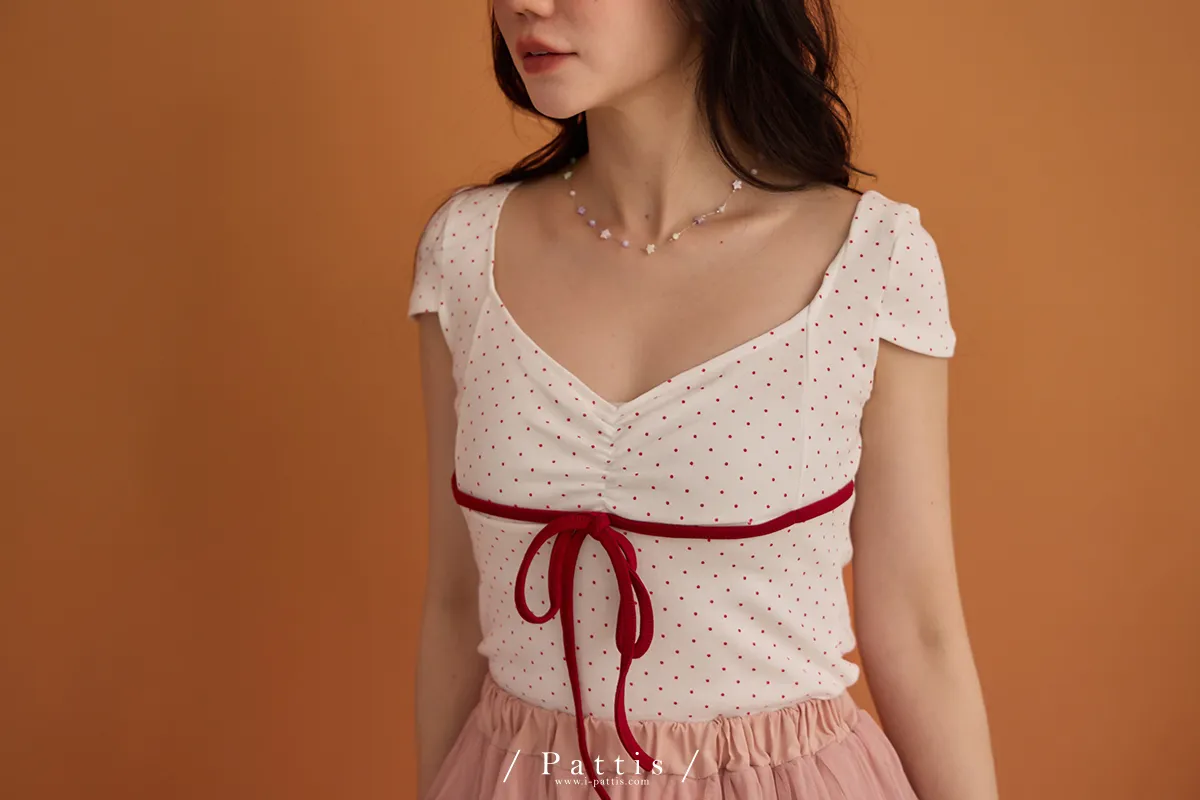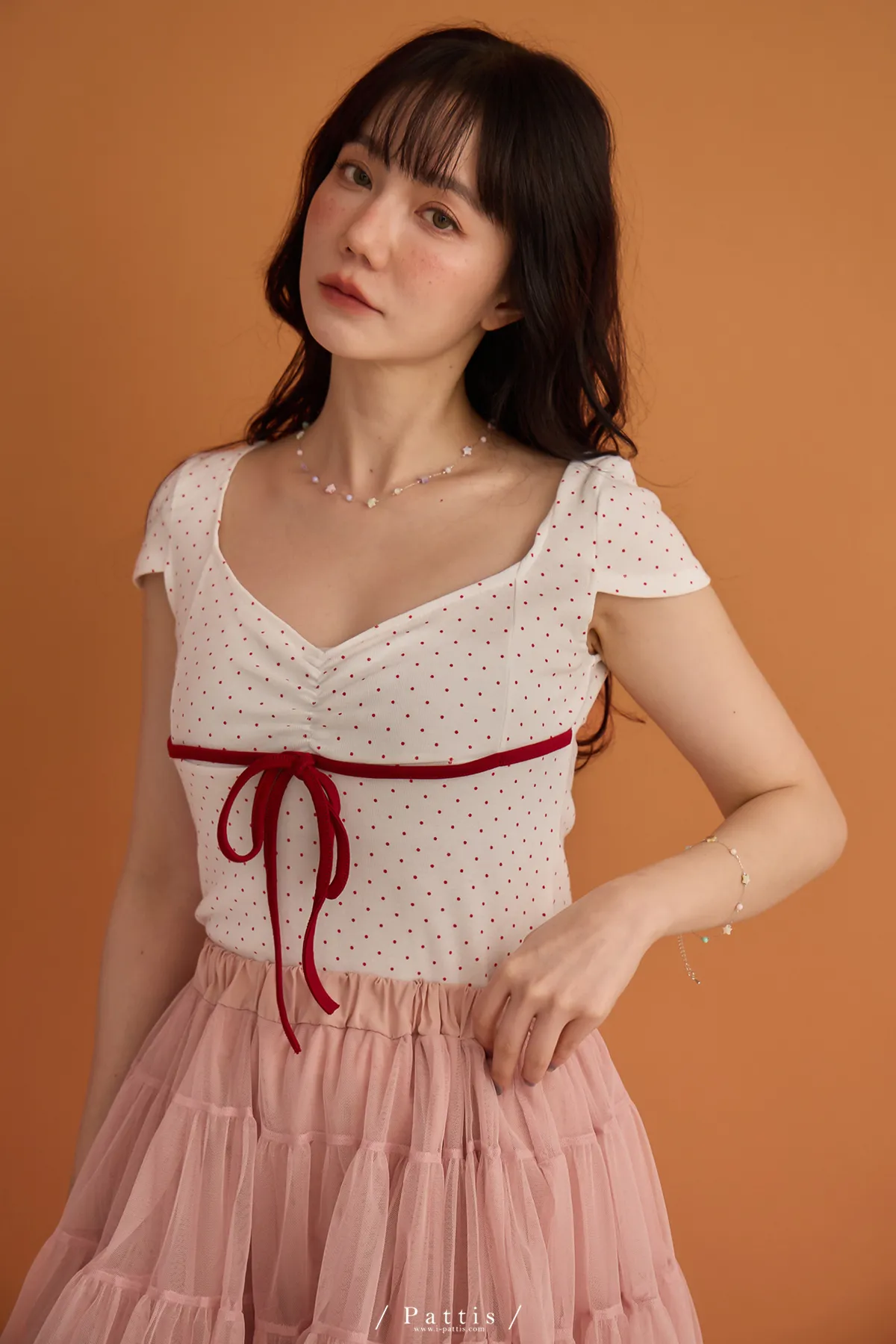 (現貨) 在巴黎交換禮物 | 桃心領小蓋袖點點蝴蝶結短上衣(白)