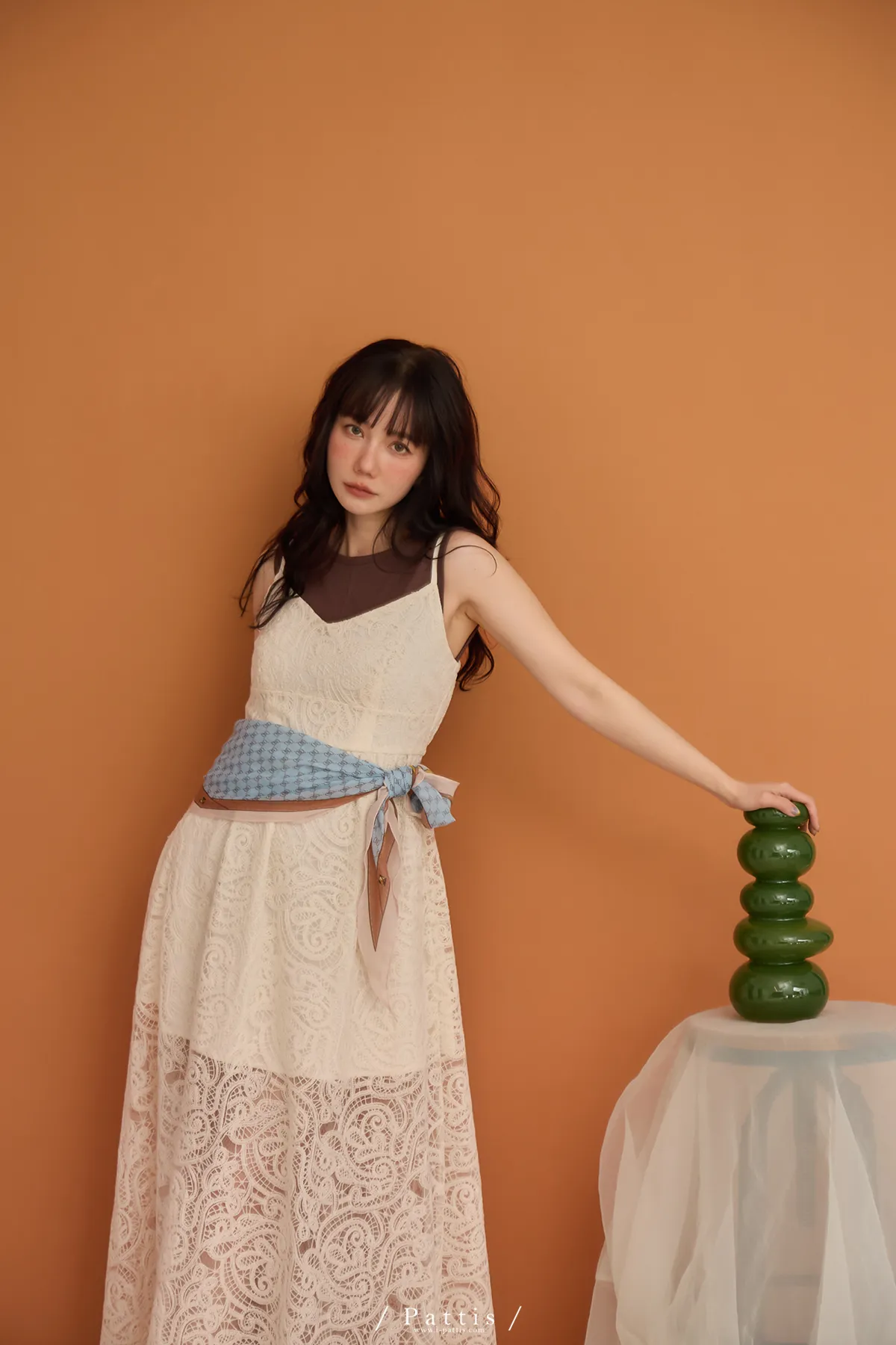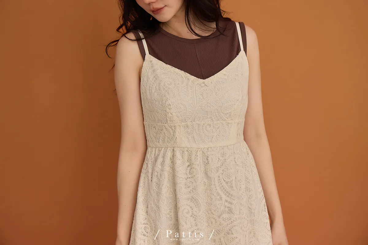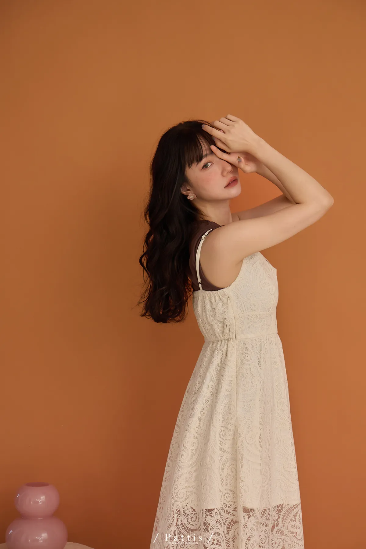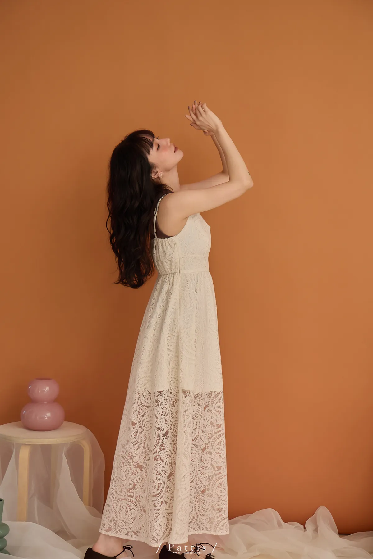 (現貨) 古董室的第二守則 | 佩利斯紋蕾絲高腰細肩帶長洋裝(米杏)