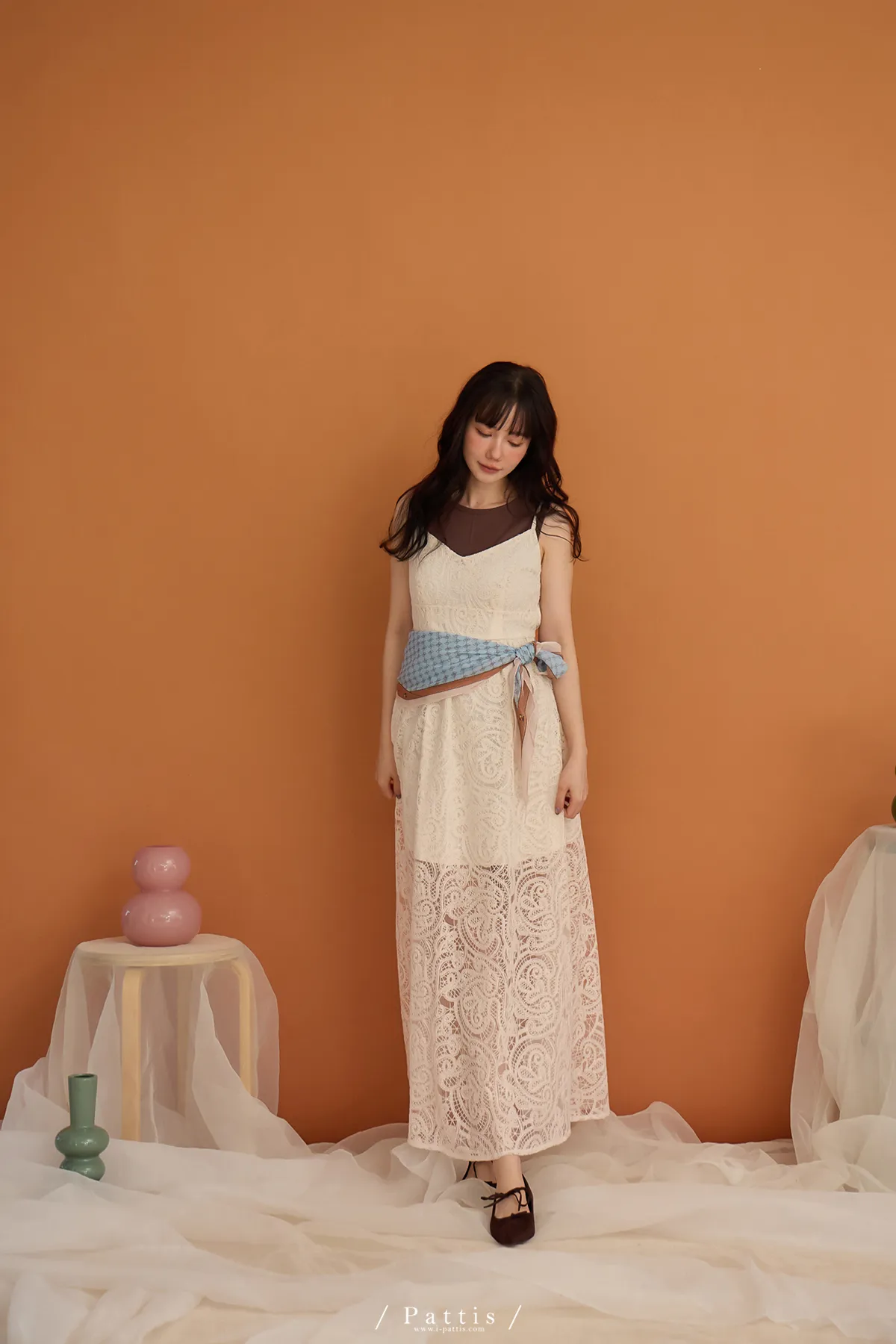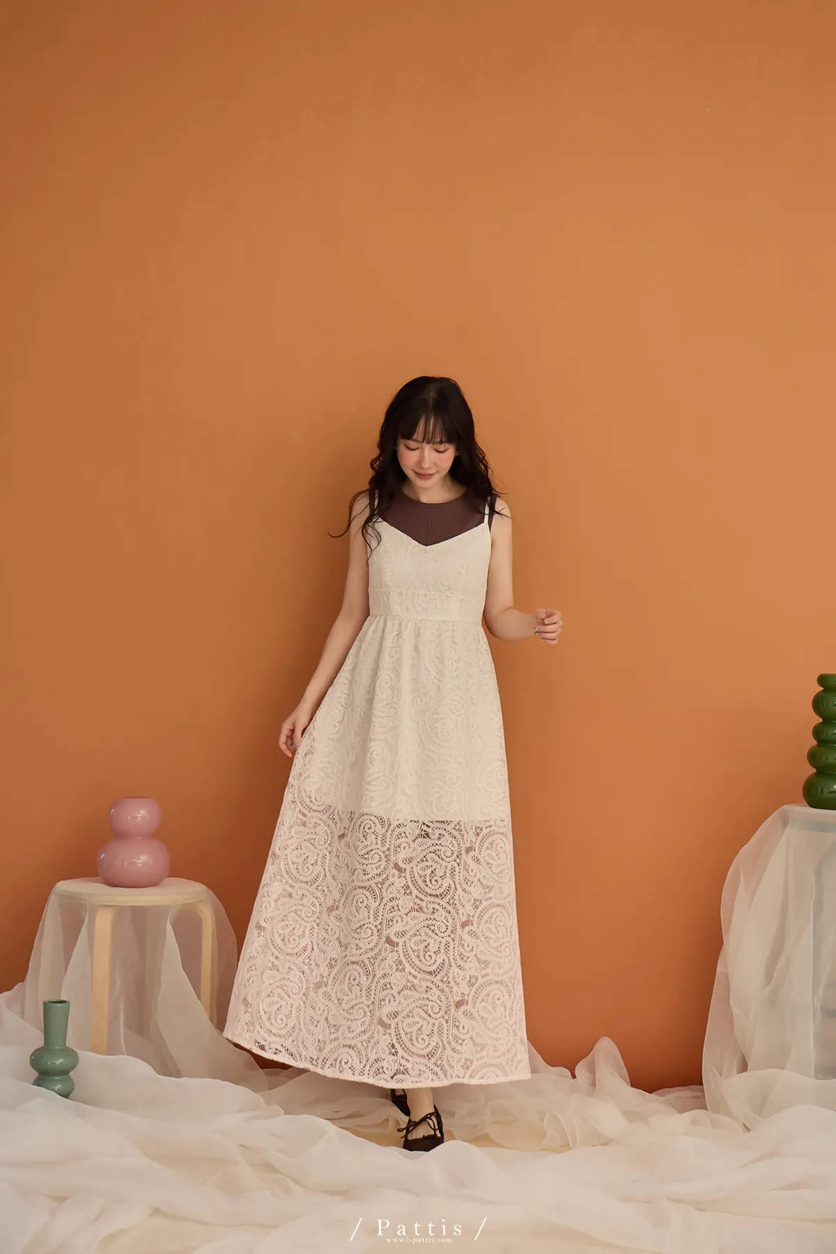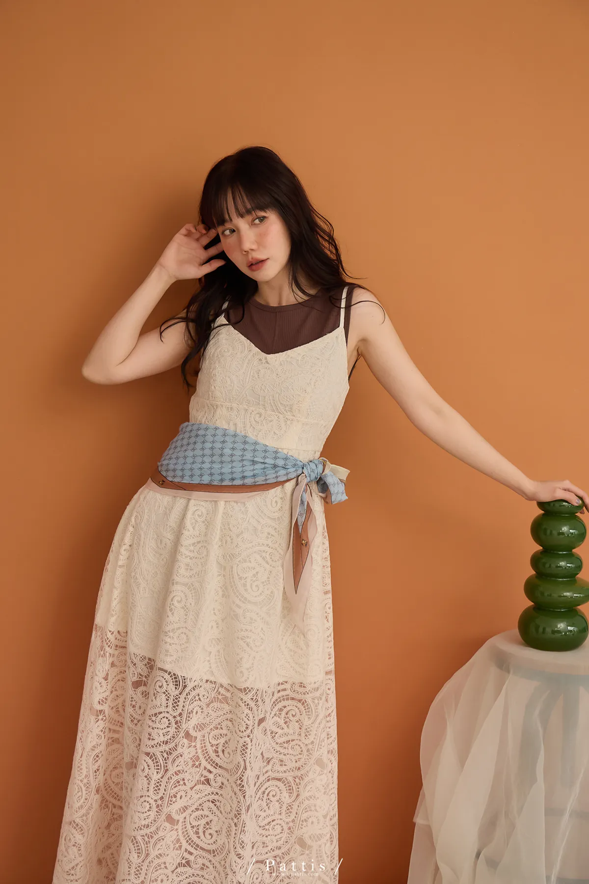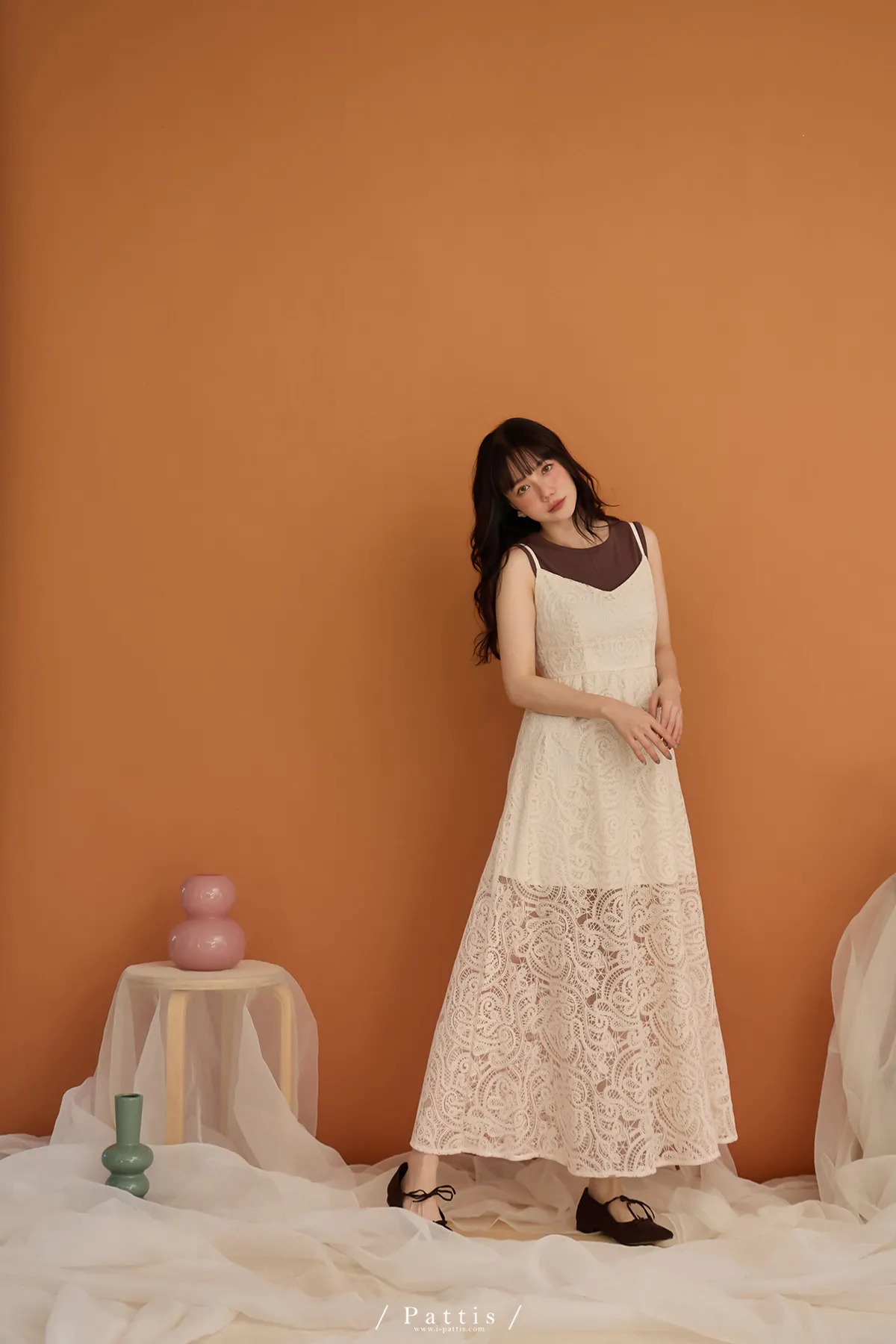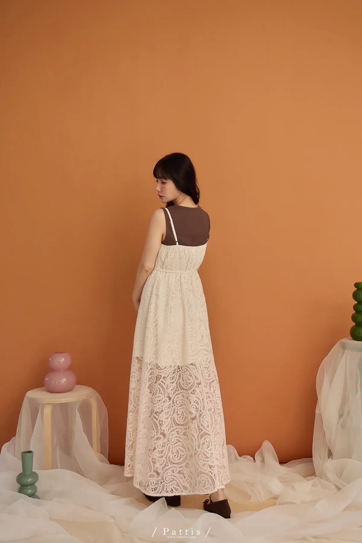 (現貨) 古董室的第二守則 | 佩利斯紋蕾絲高腰細肩帶長洋裝(米杏)