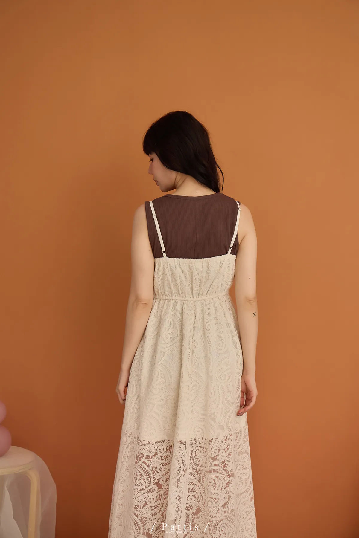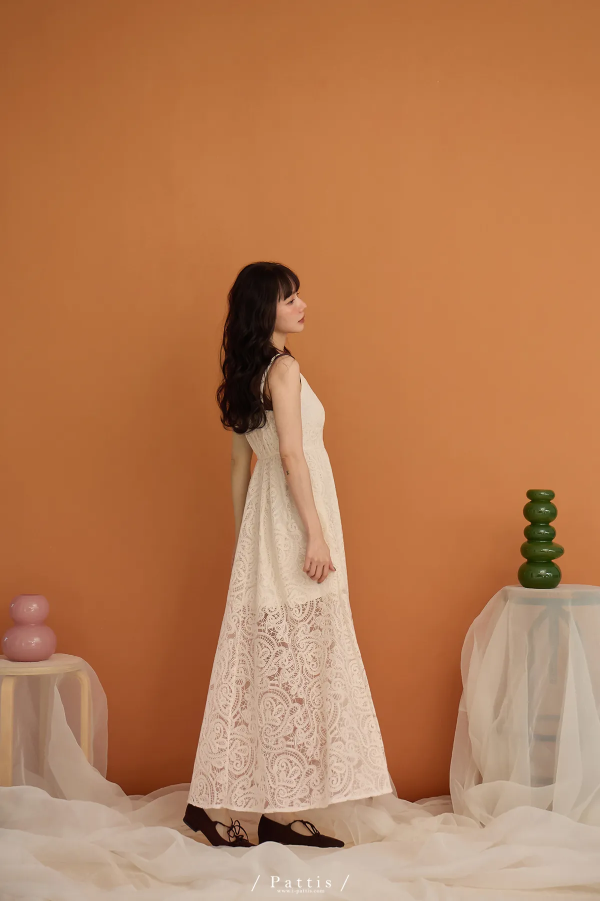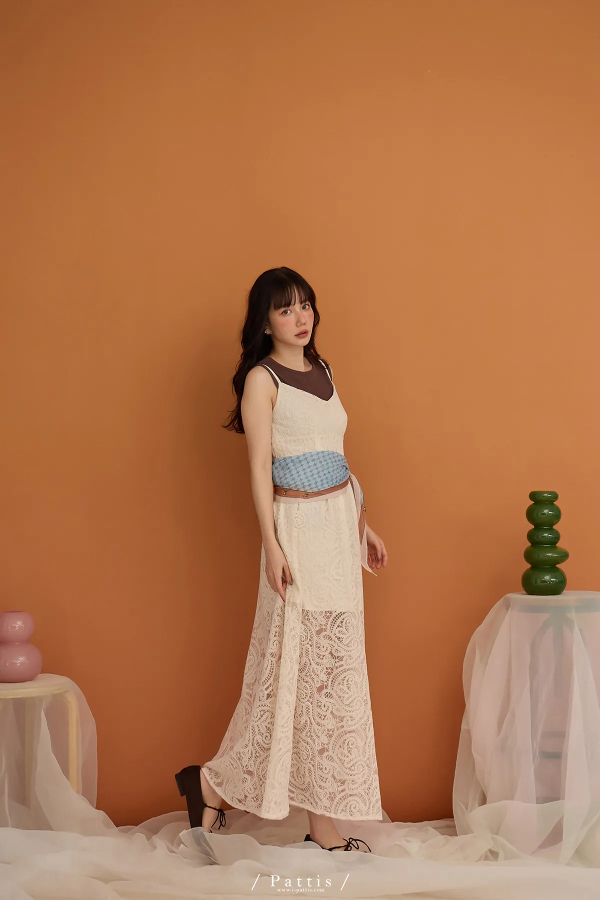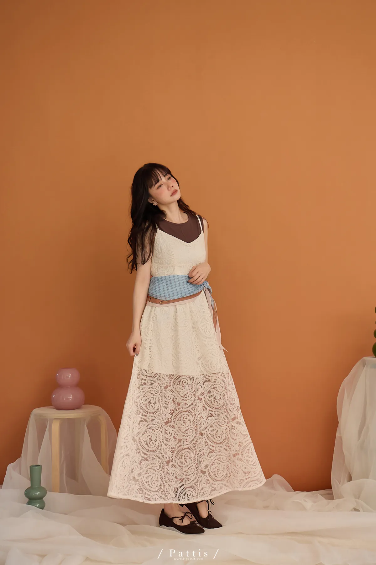 (現貨) 古董室的第二守則 | 佩利斯紋蕾絲高腰細肩帶長洋裝(米杏)