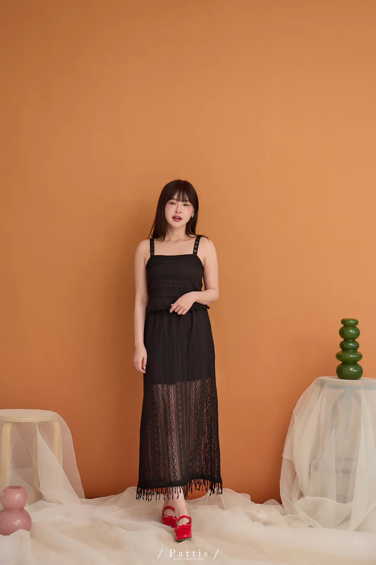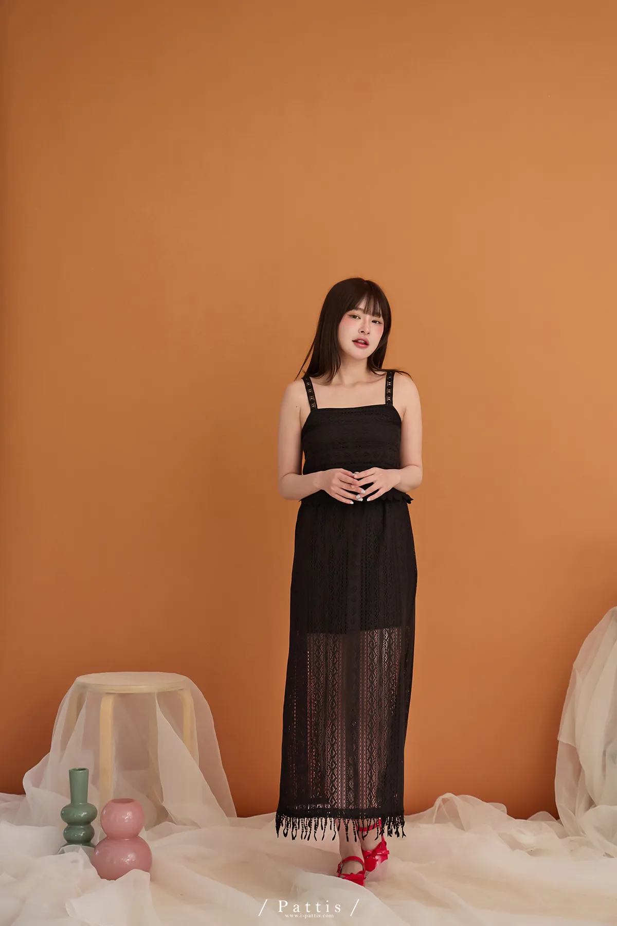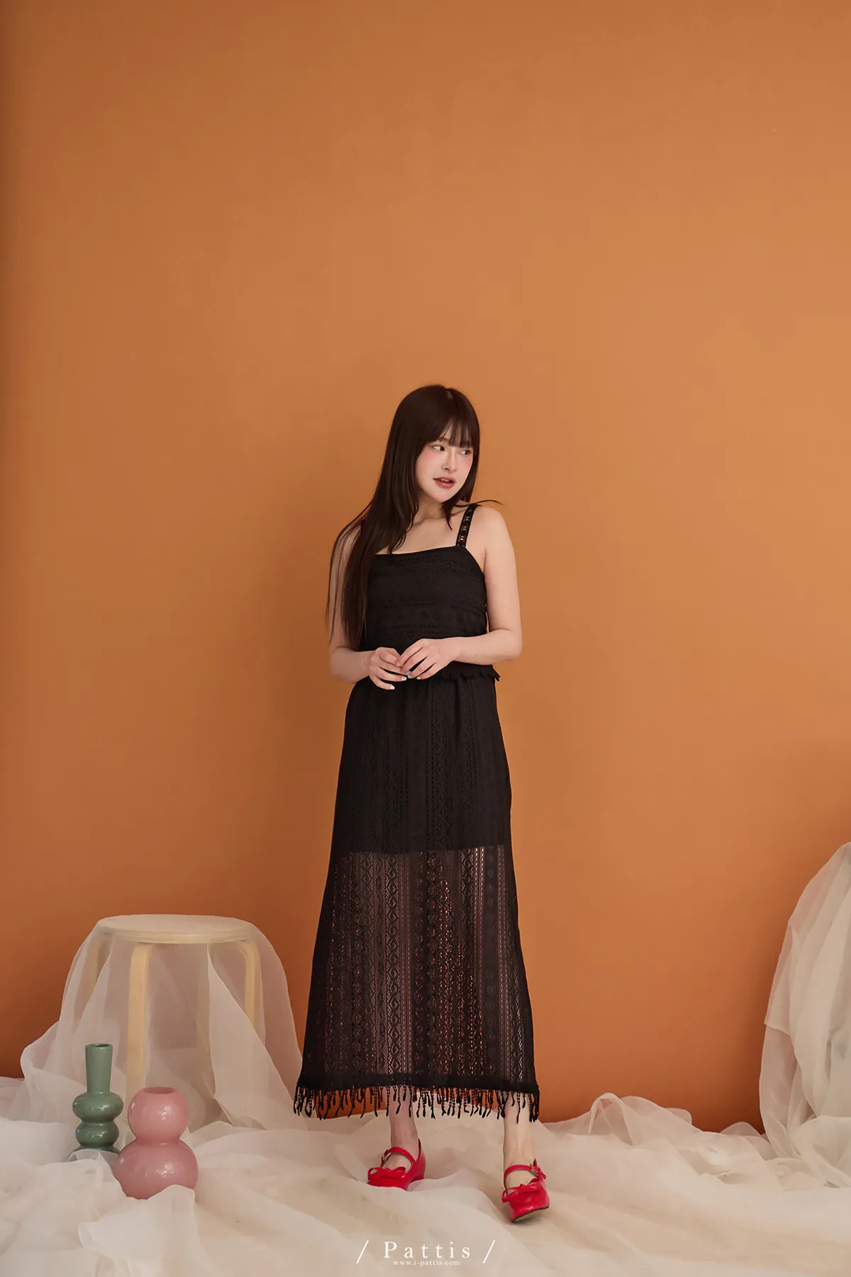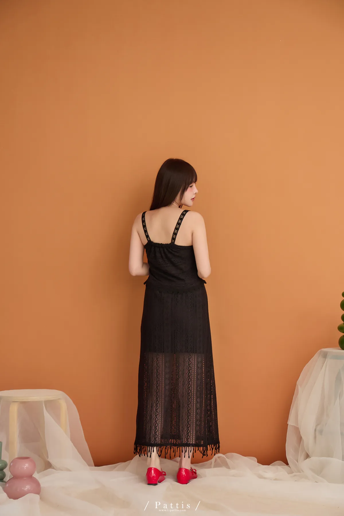 (現貨) 在假期時不接電話 | (可分售)蕾絲刺繡紋吊帶背心+流蘇長裙set(黑)