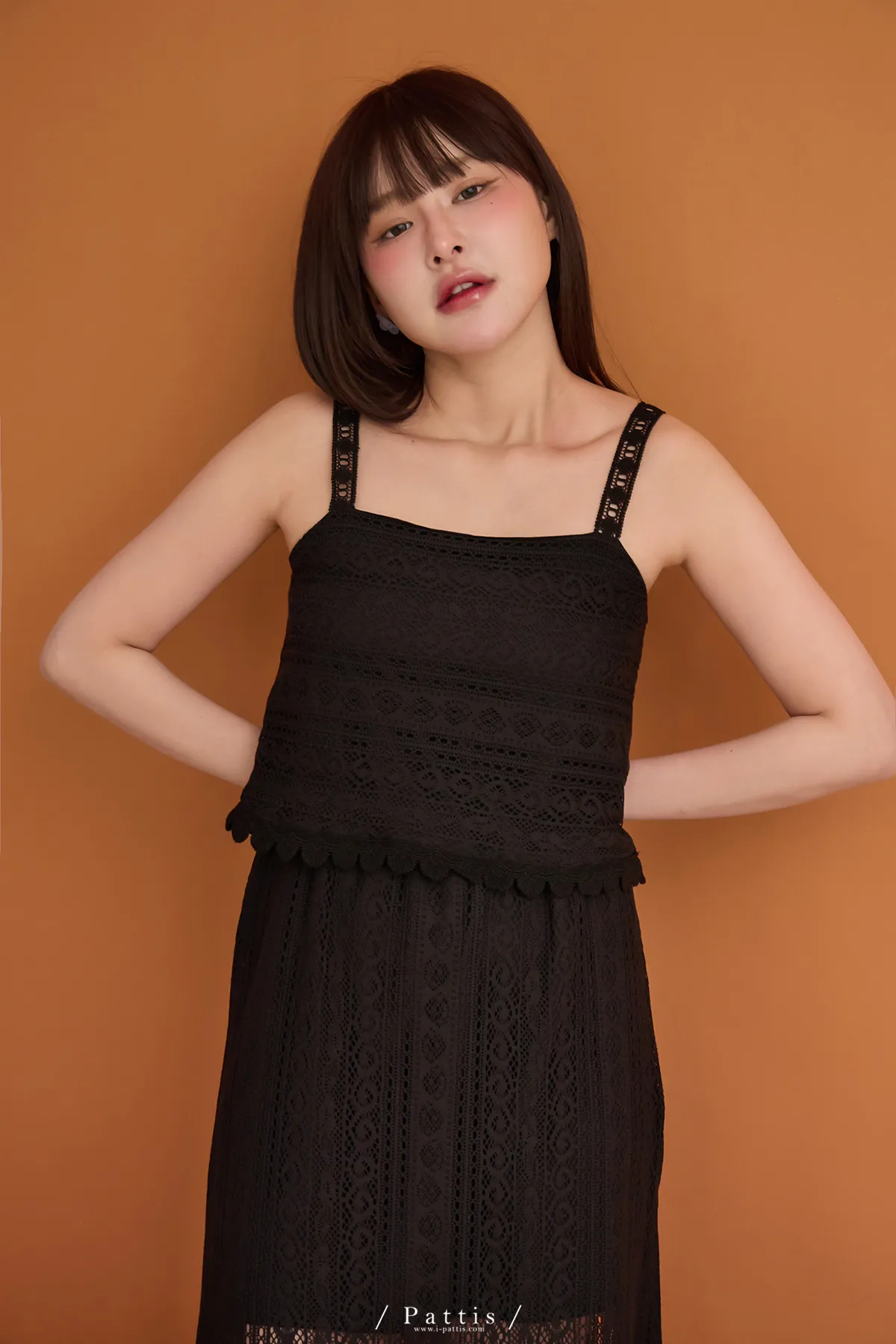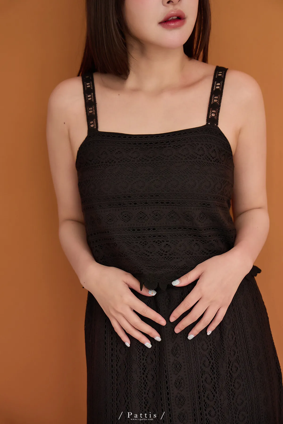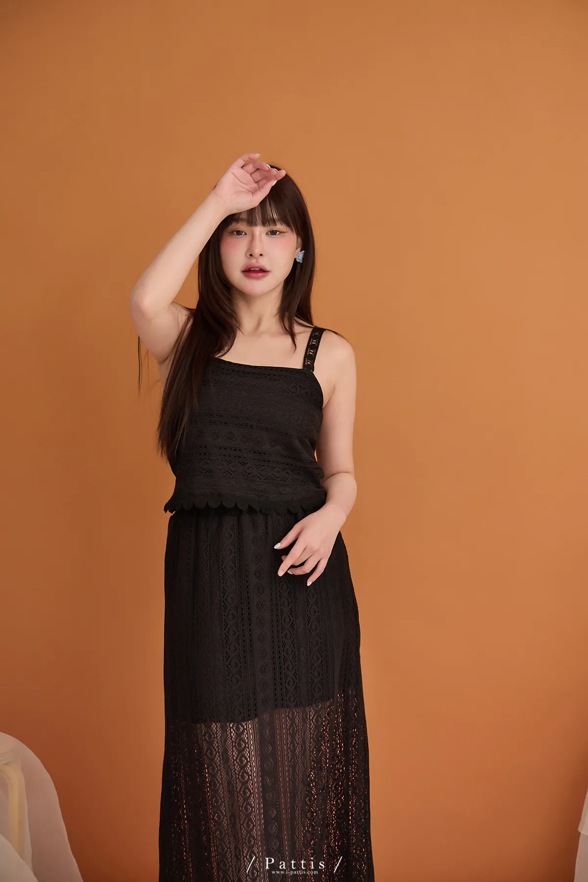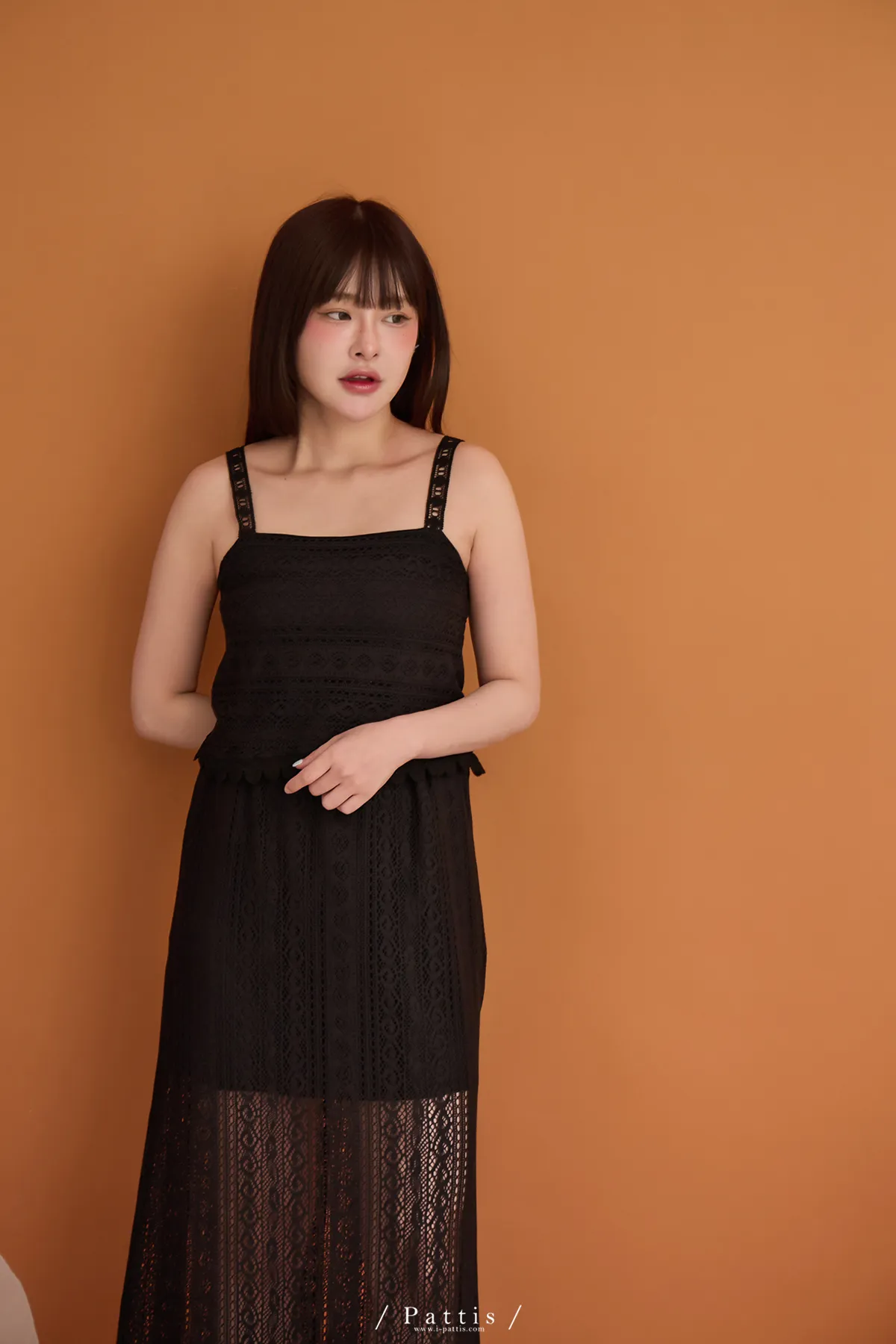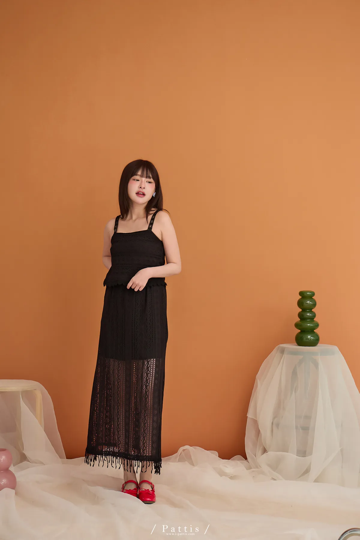 (現貨) 在假期時不接電話 | (可分售)蕾絲刺繡紋吊帶背心+流蘇長裙set(黑)