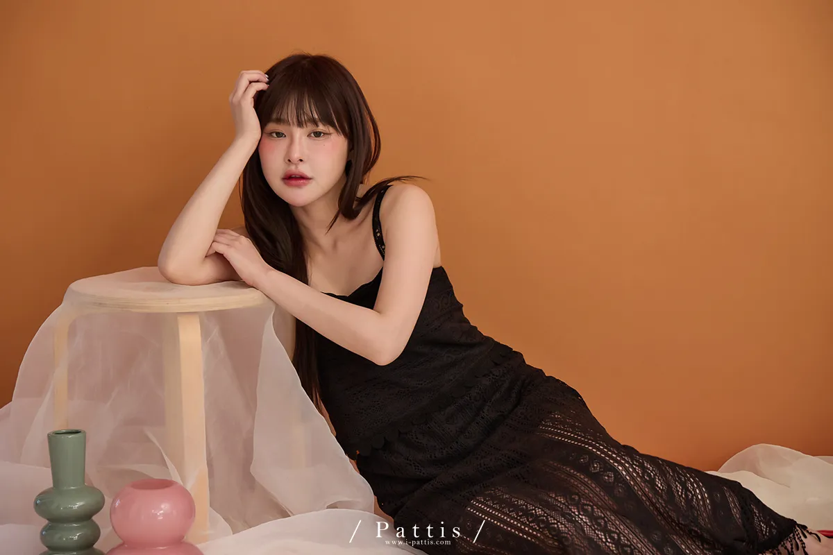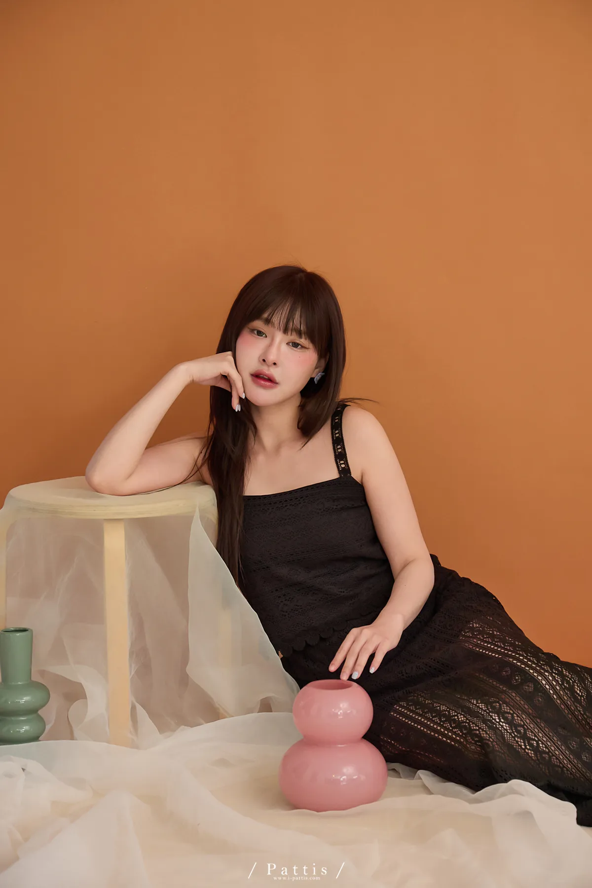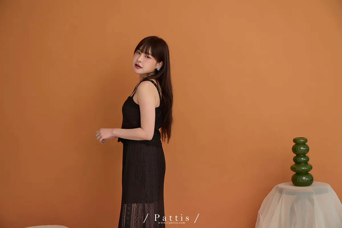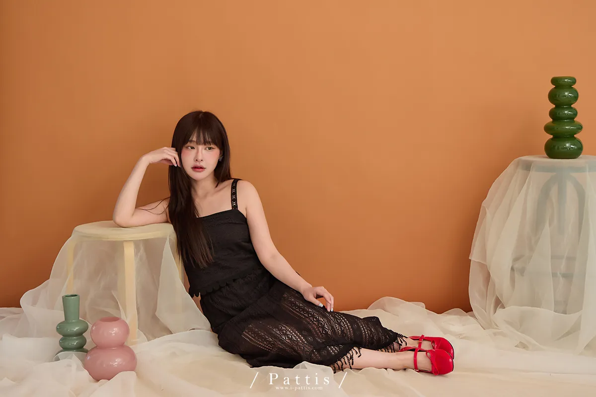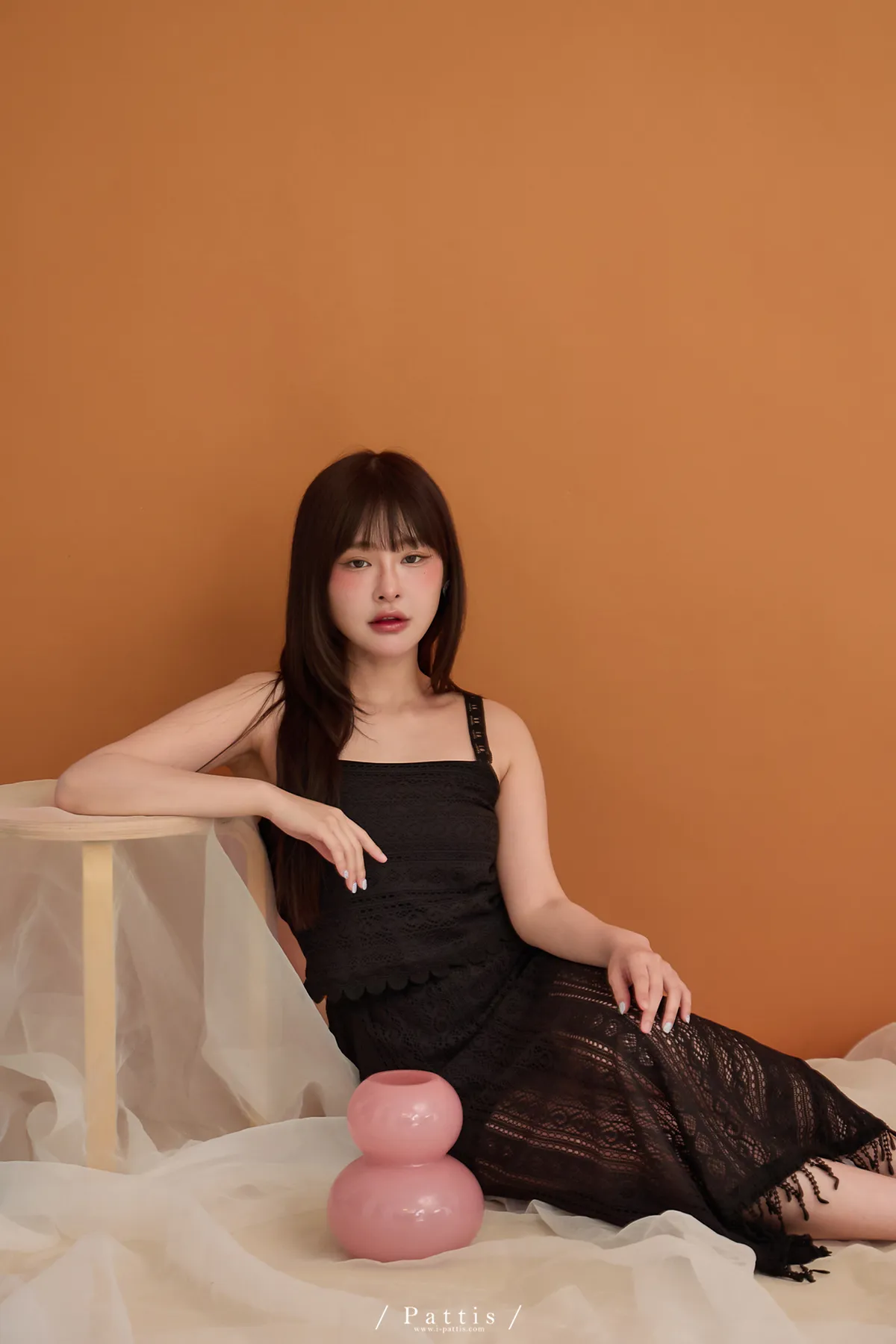 (現貨) 在假期時不接電話 | (可分售)蕾絲刺繡紋吊帶背心+流蘇長裙set(黑)