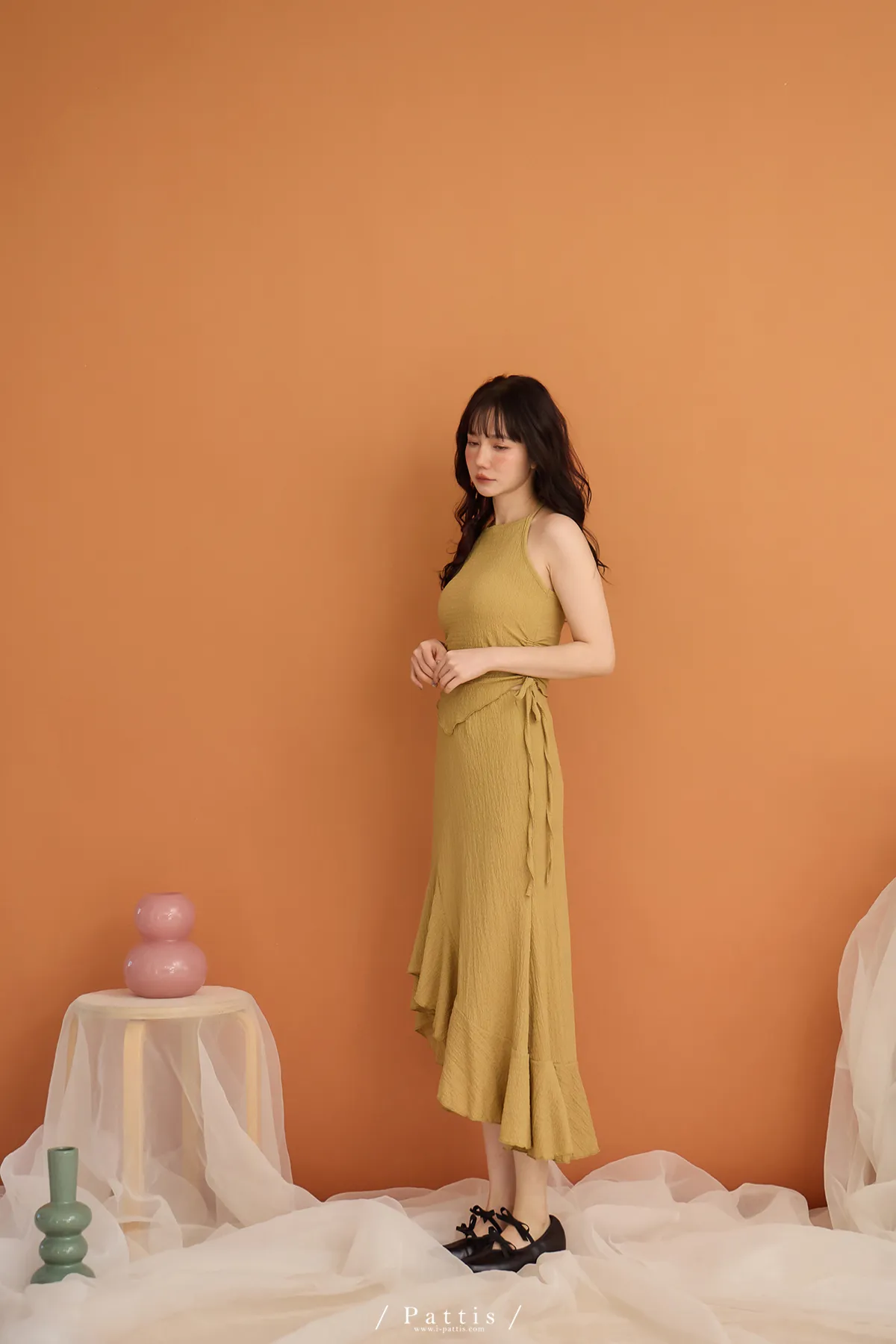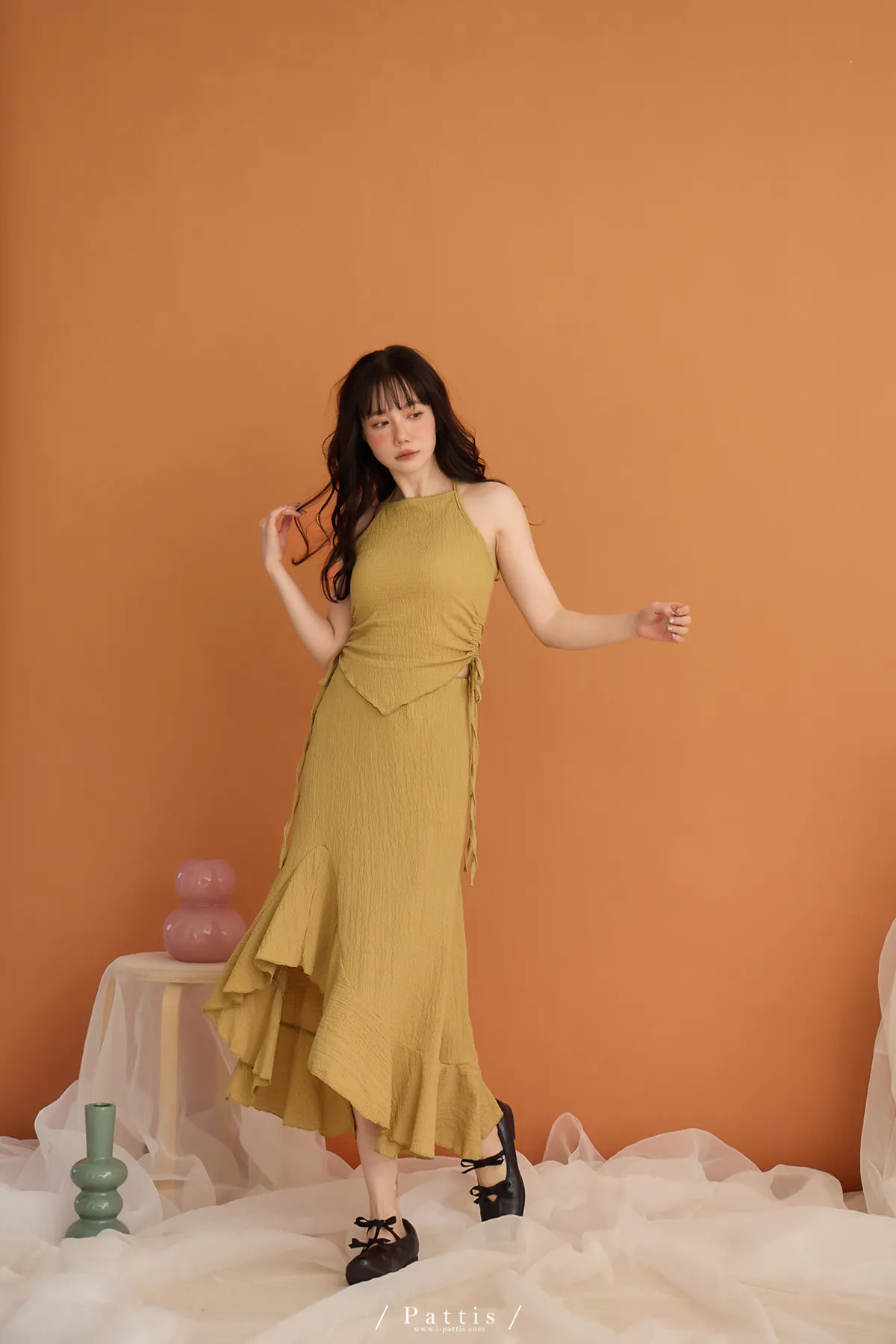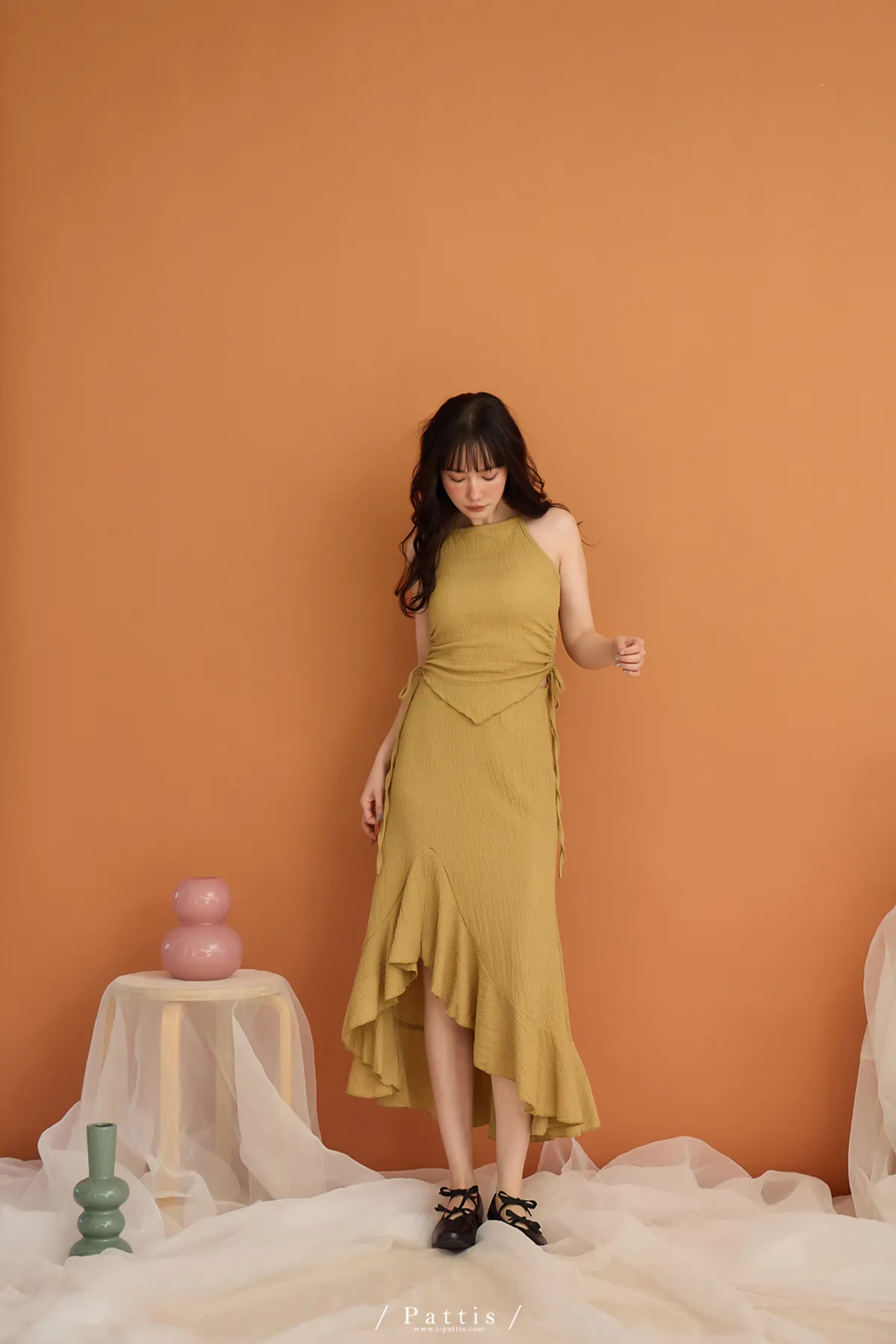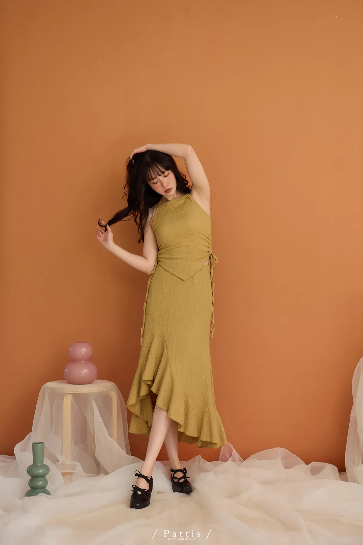 / NG品 原價$1380/削肩V尾上衣+荷葉魚尾裙set(芥末黃)