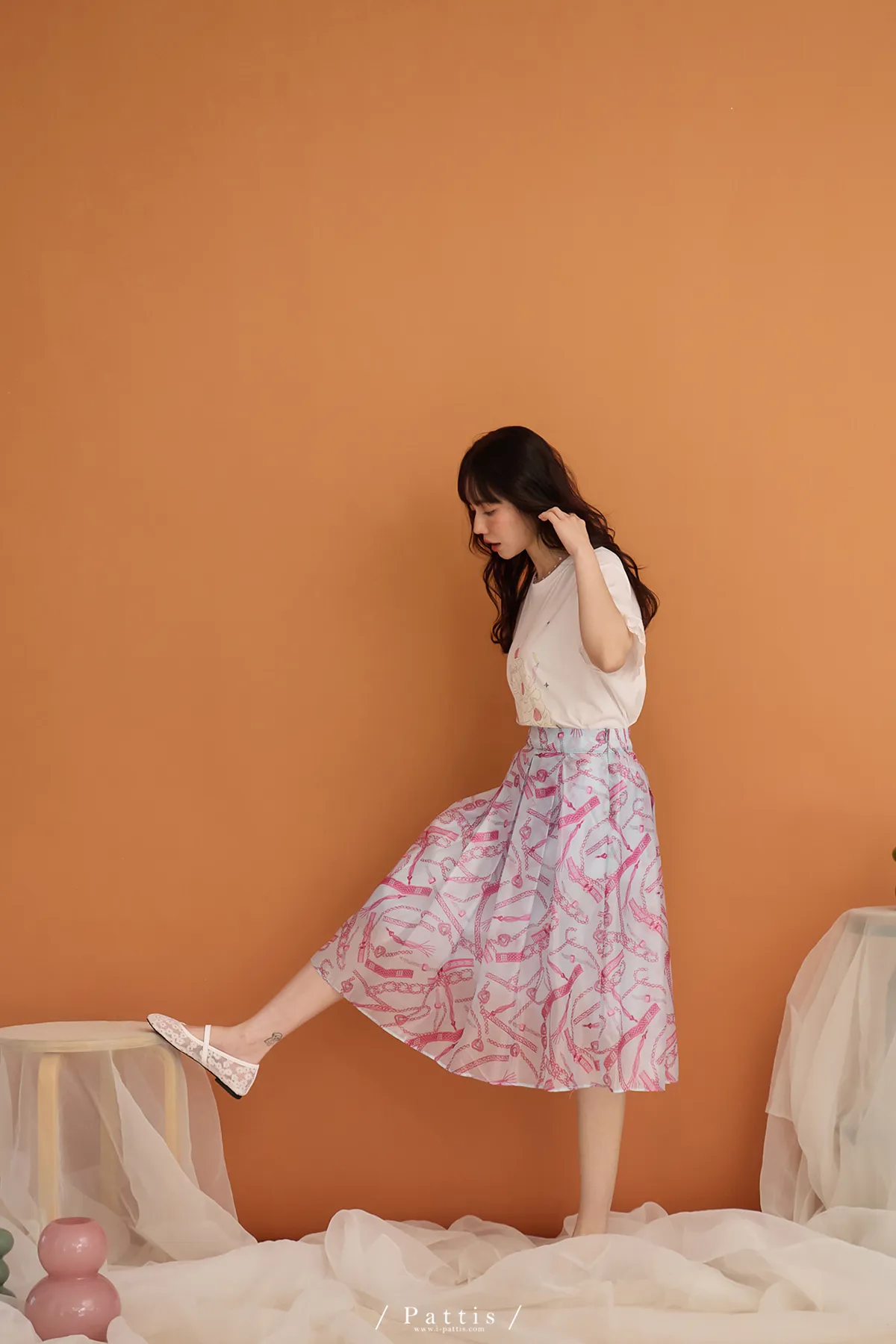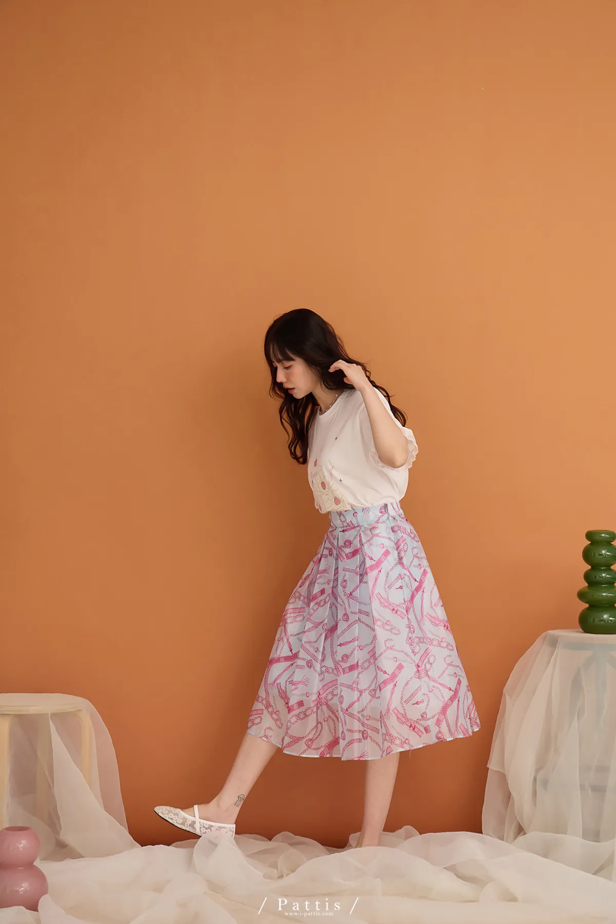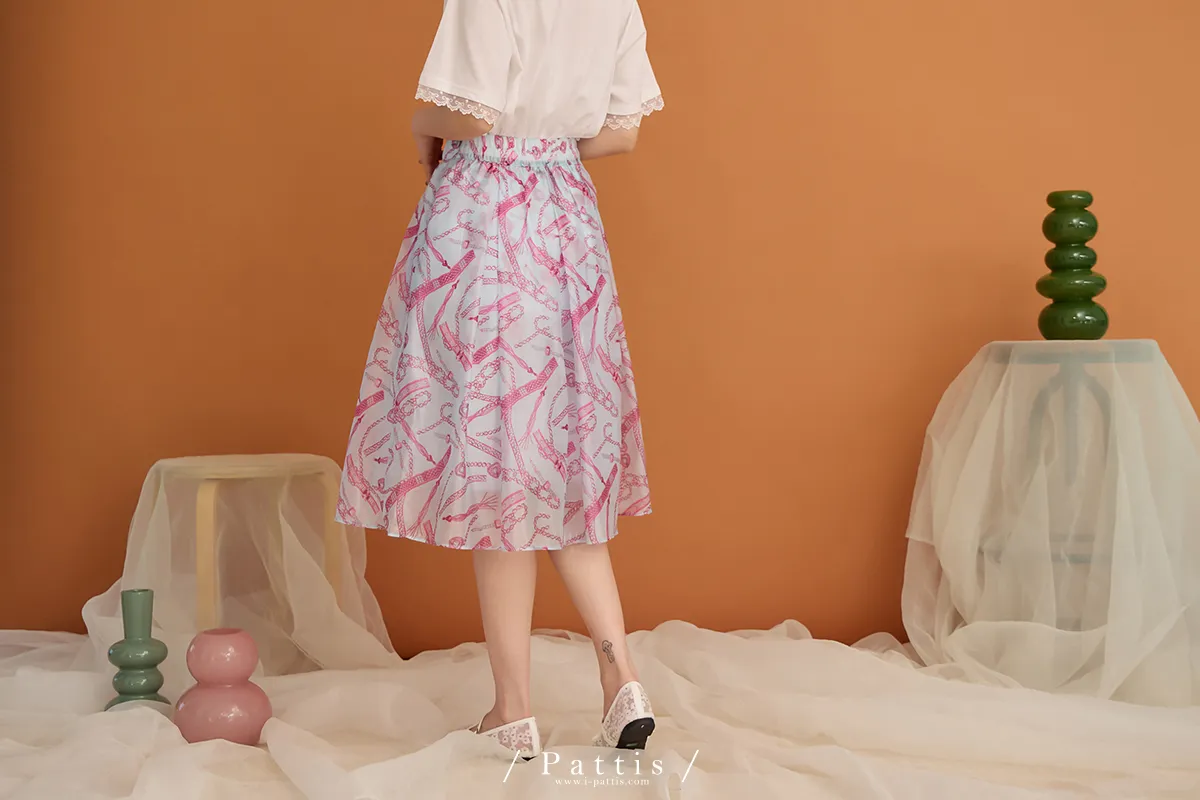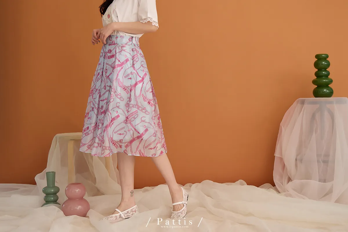 (現貨) 玻璃紙 | 珠寶印花絲光壓褶長裙(桃淺藍)