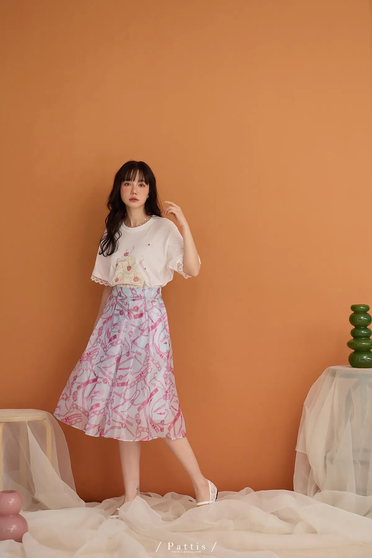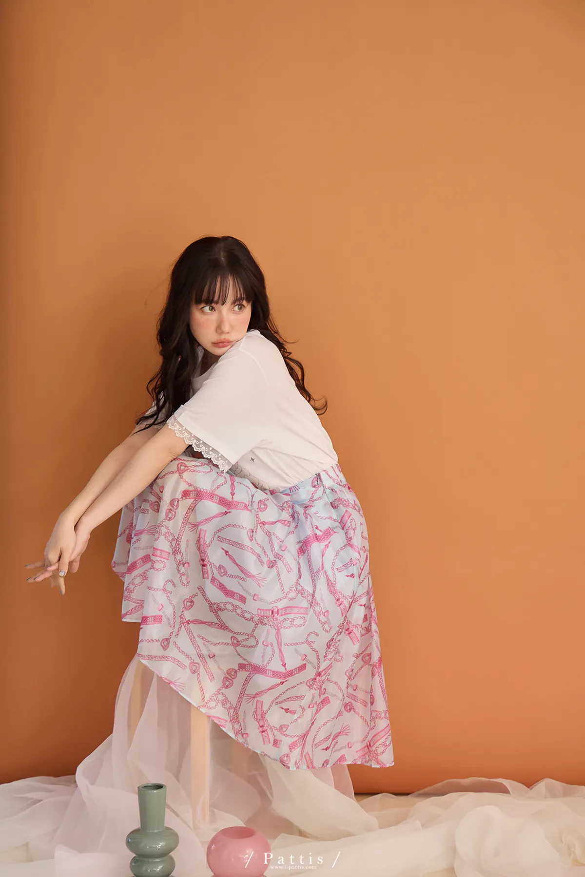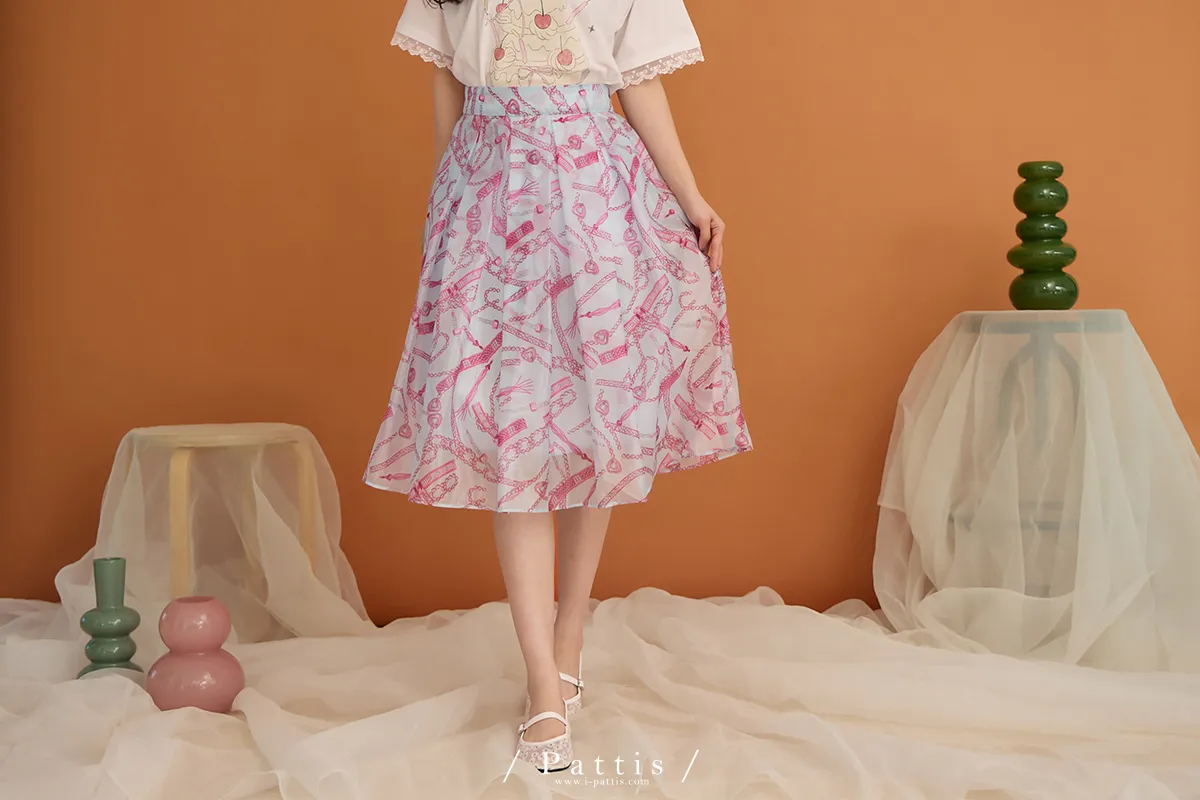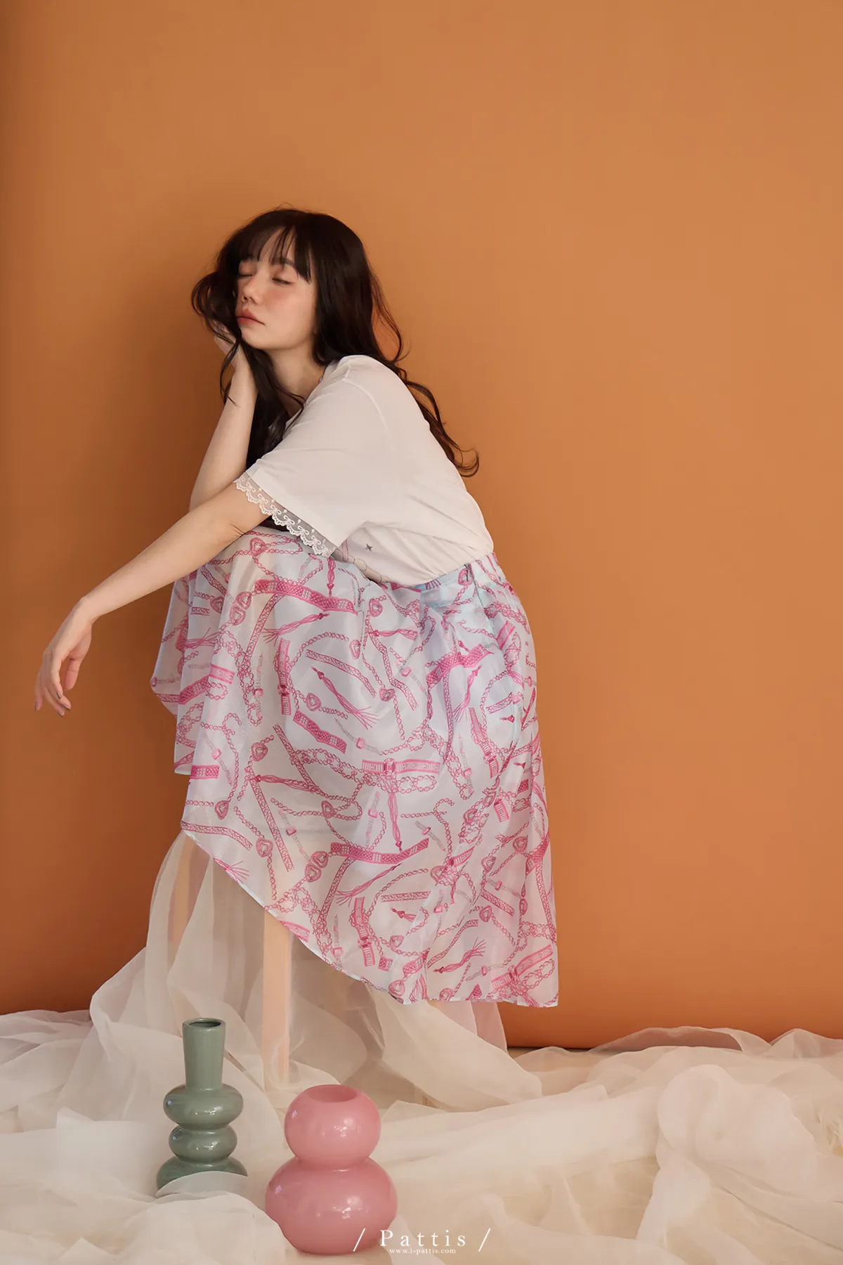 (現貨) 玻璃紙 | 珠寶印花絲光壓褶長裙(桃淺藍)