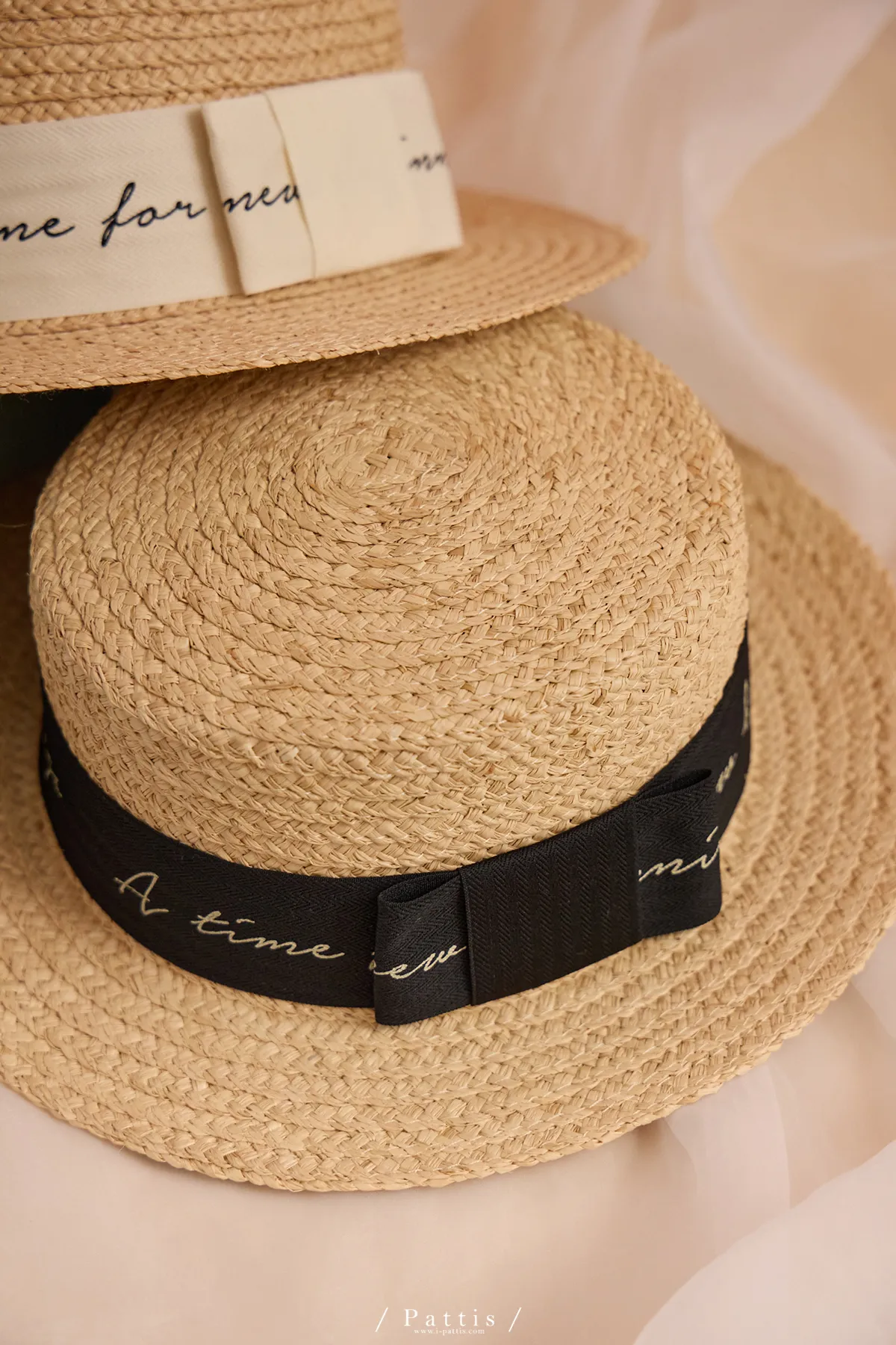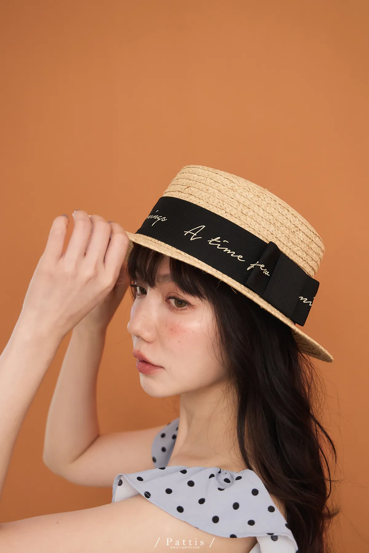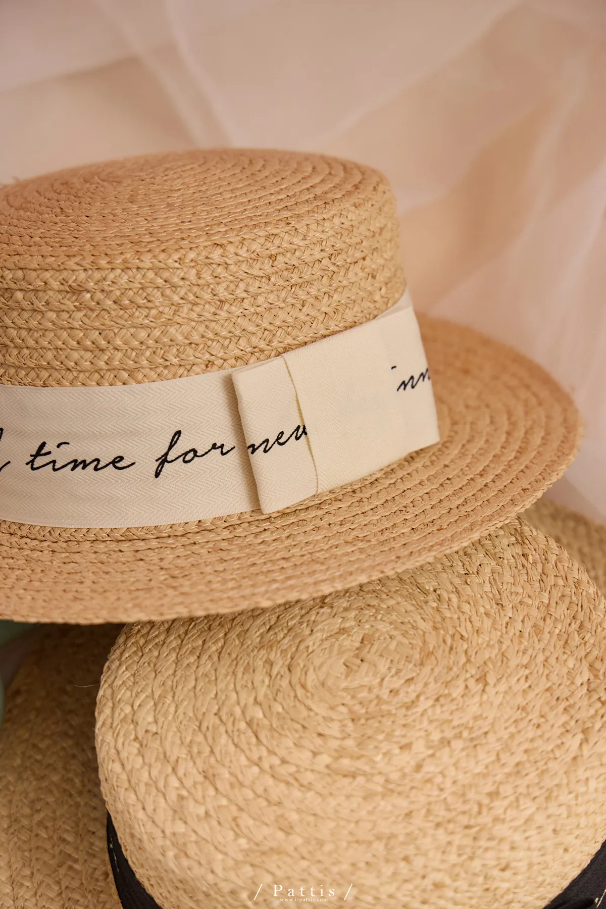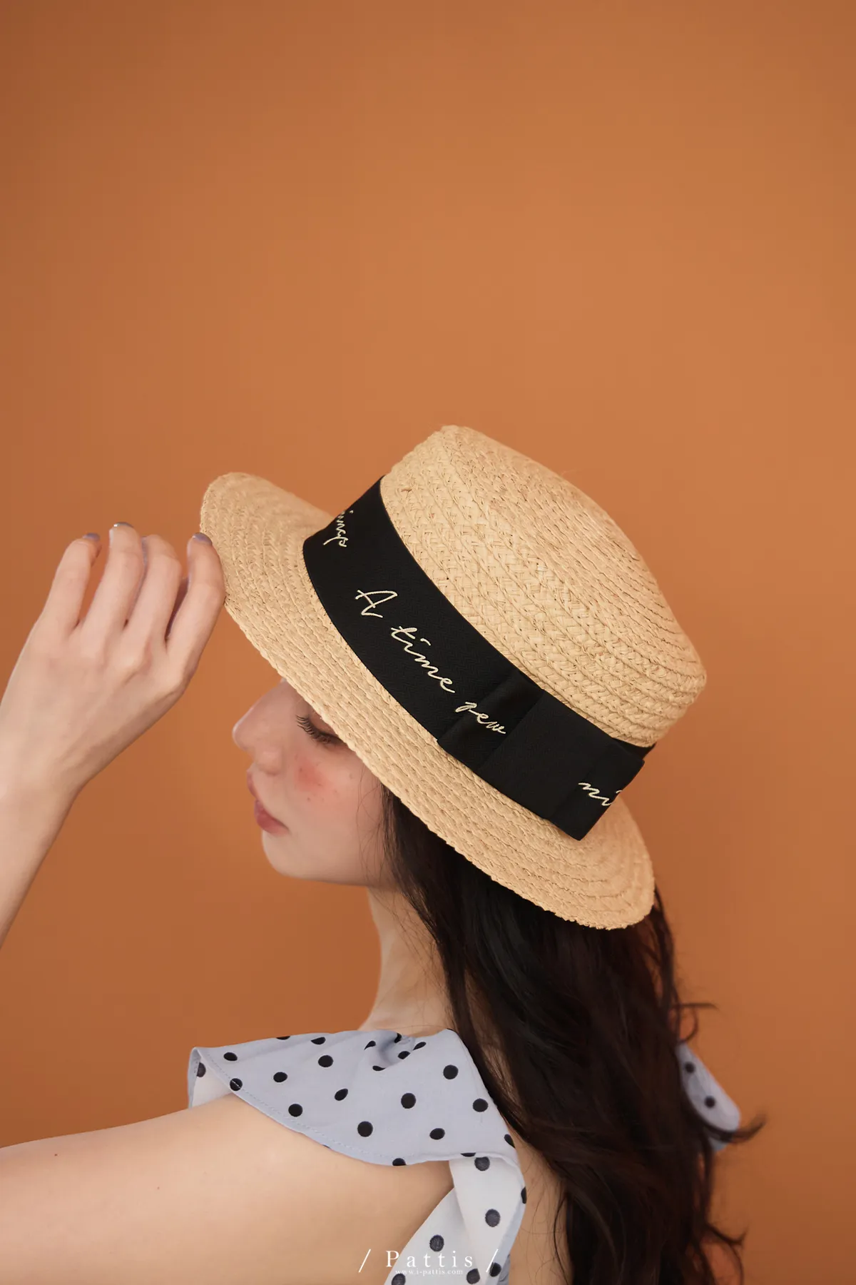 (現貨) 寬緞帶草寫字母編織草帽(米白/黑)