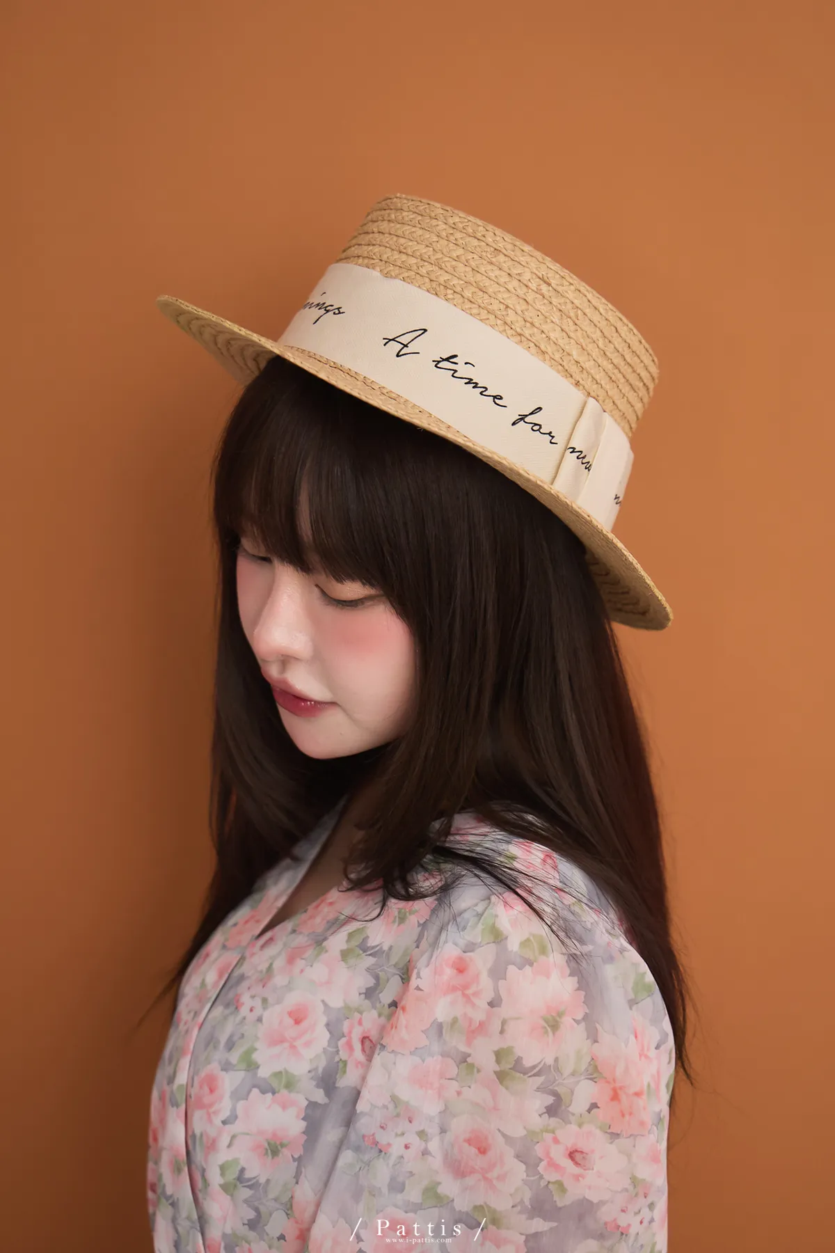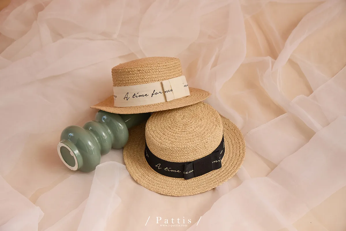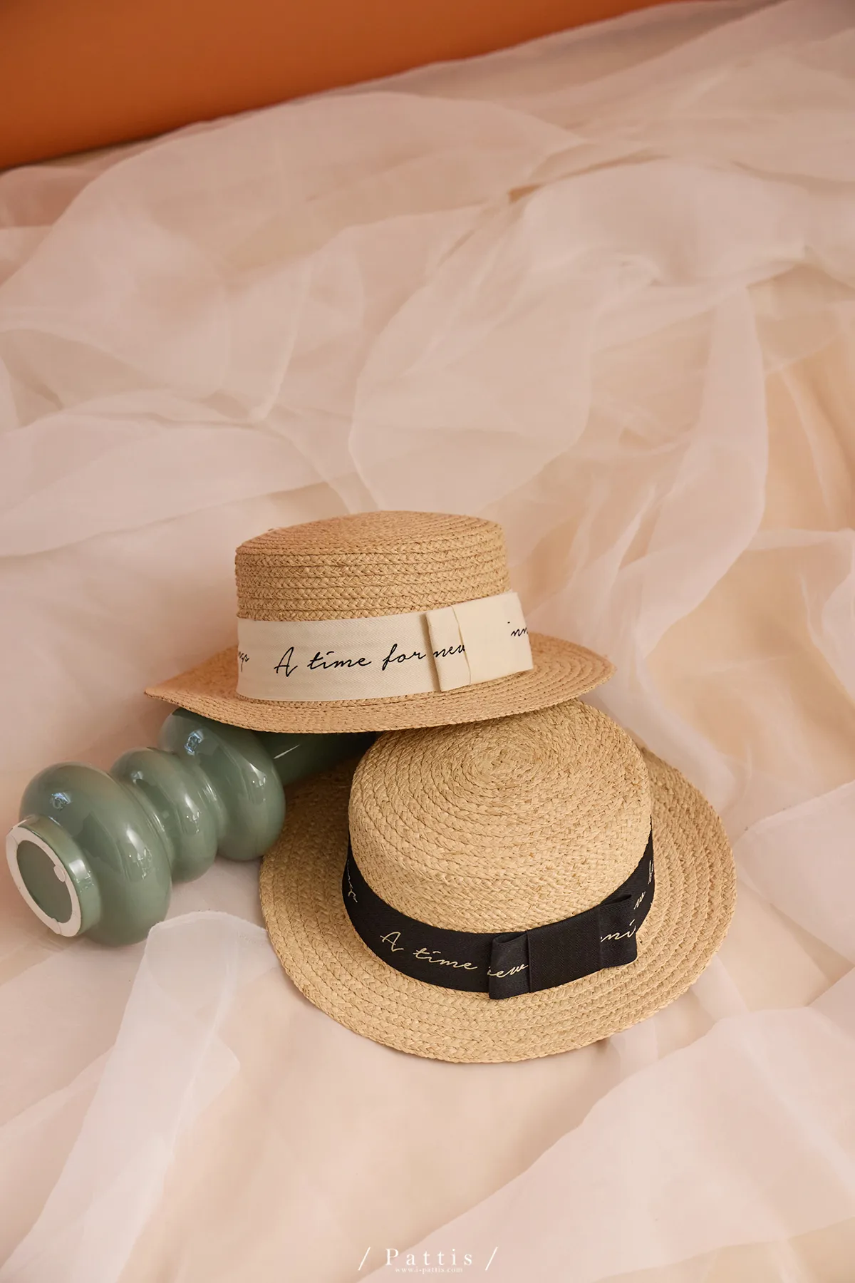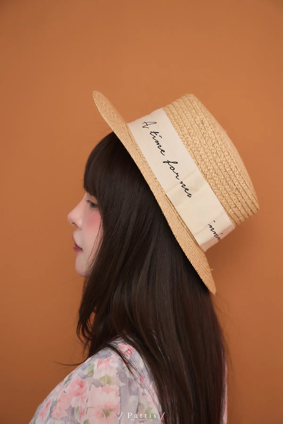 (現貨) 寬緞帶草寫字母編織草帽(米白/黑)