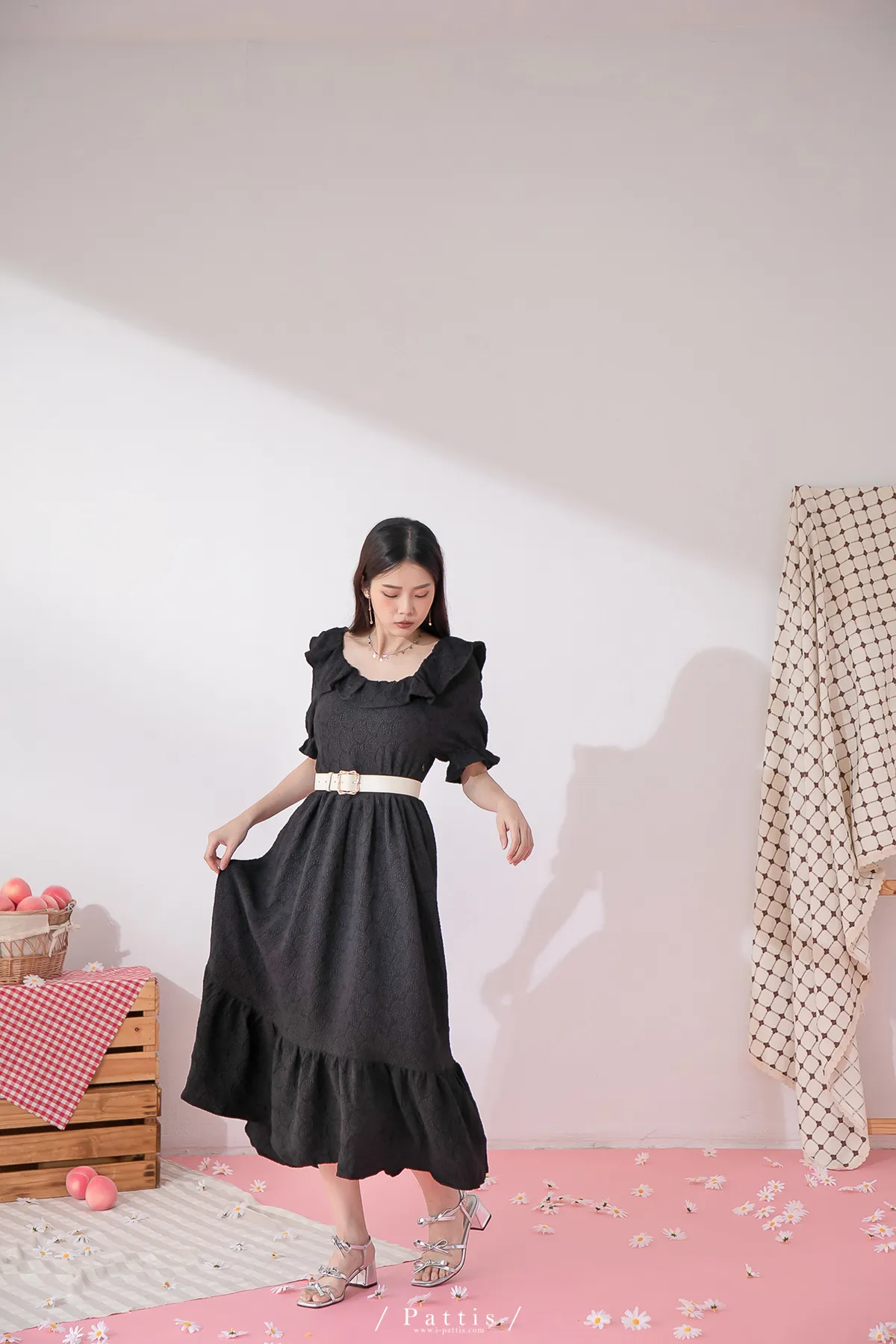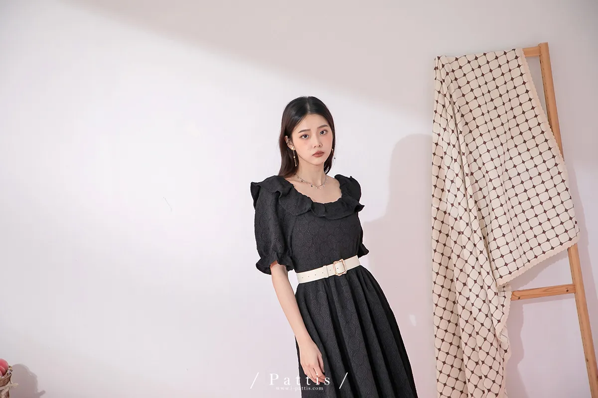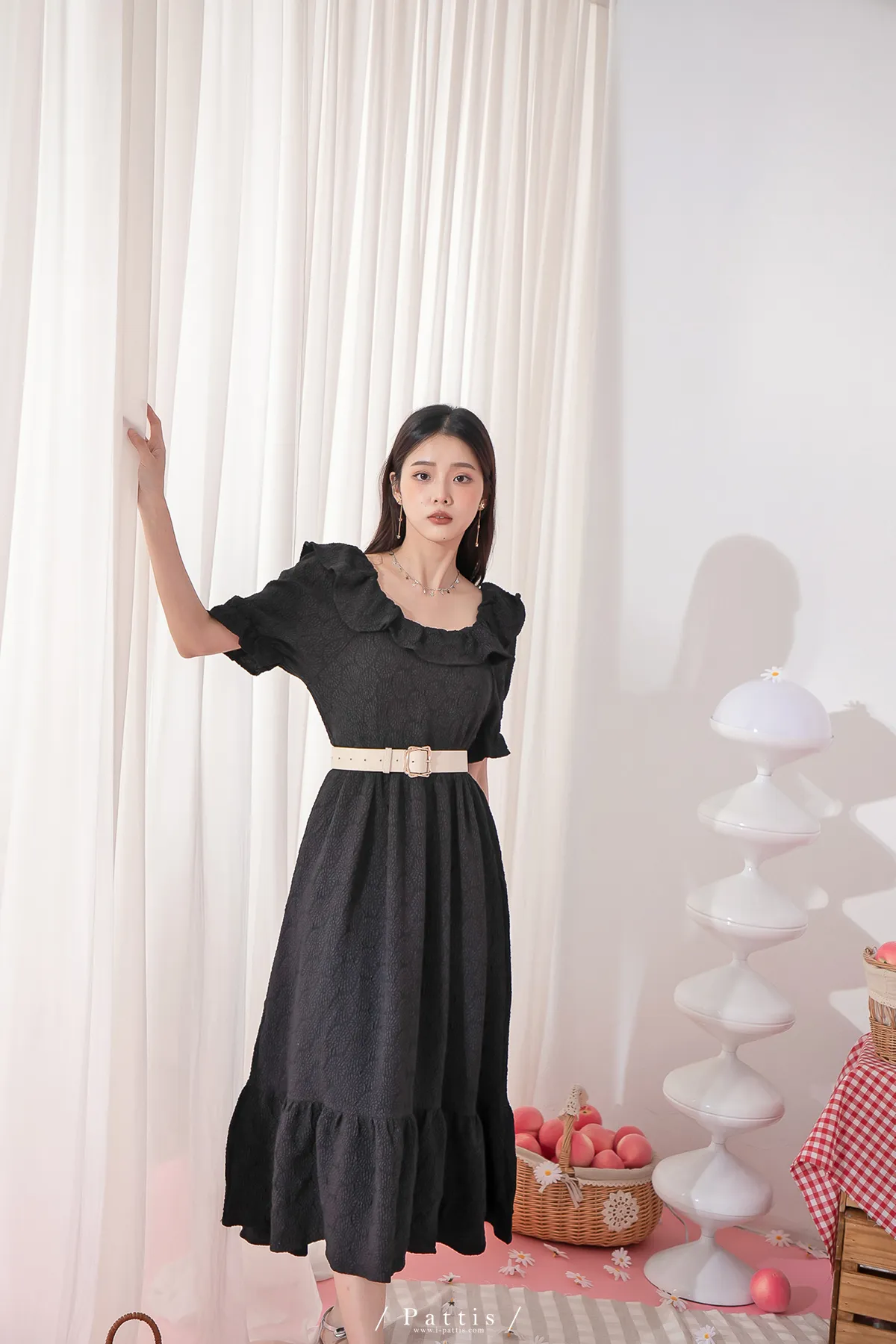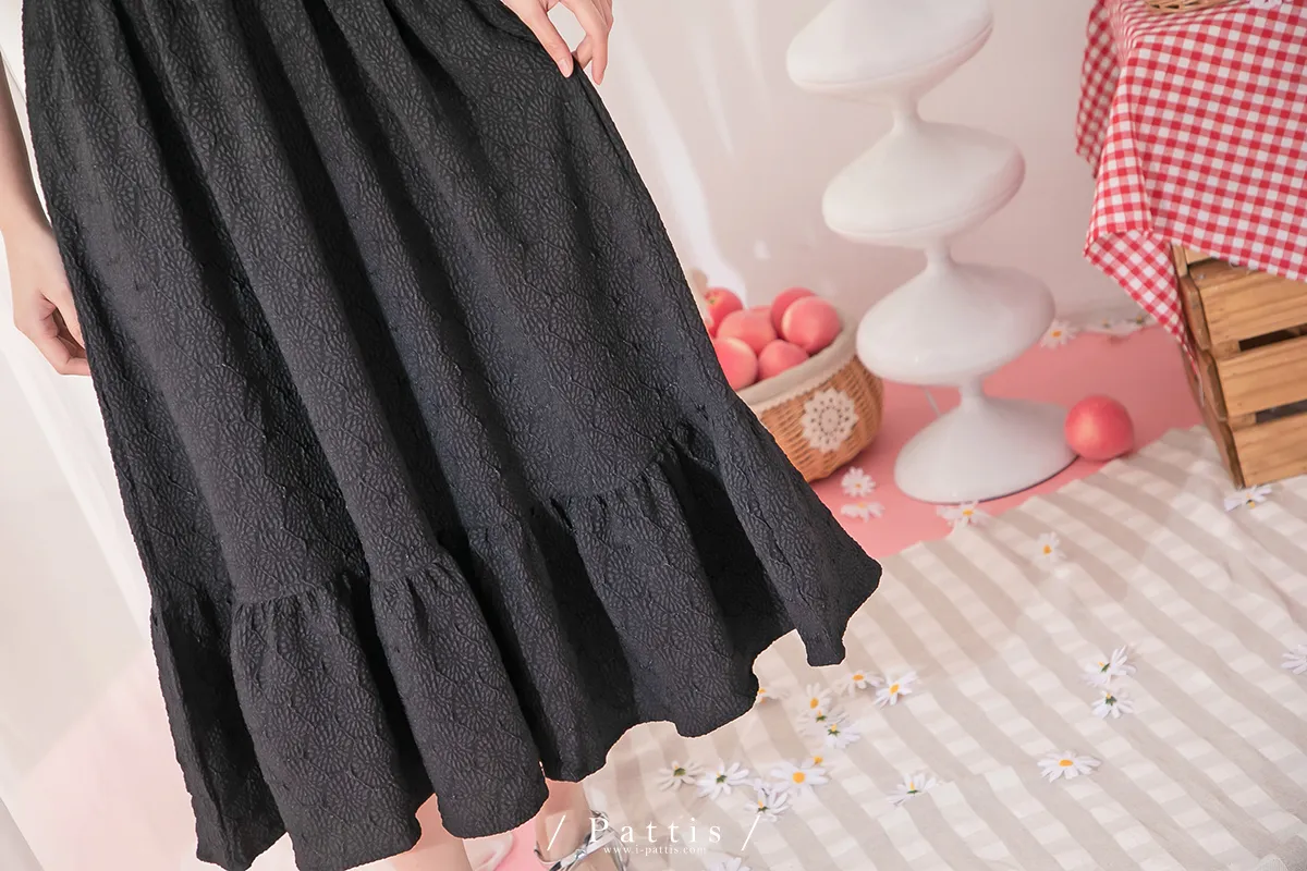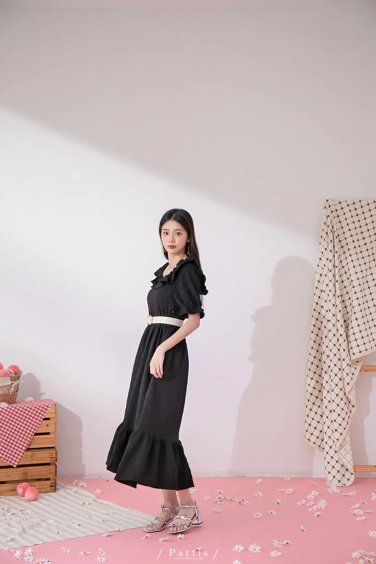 *特SALE*荷葉愛心腰線長洋裝(植花黑)