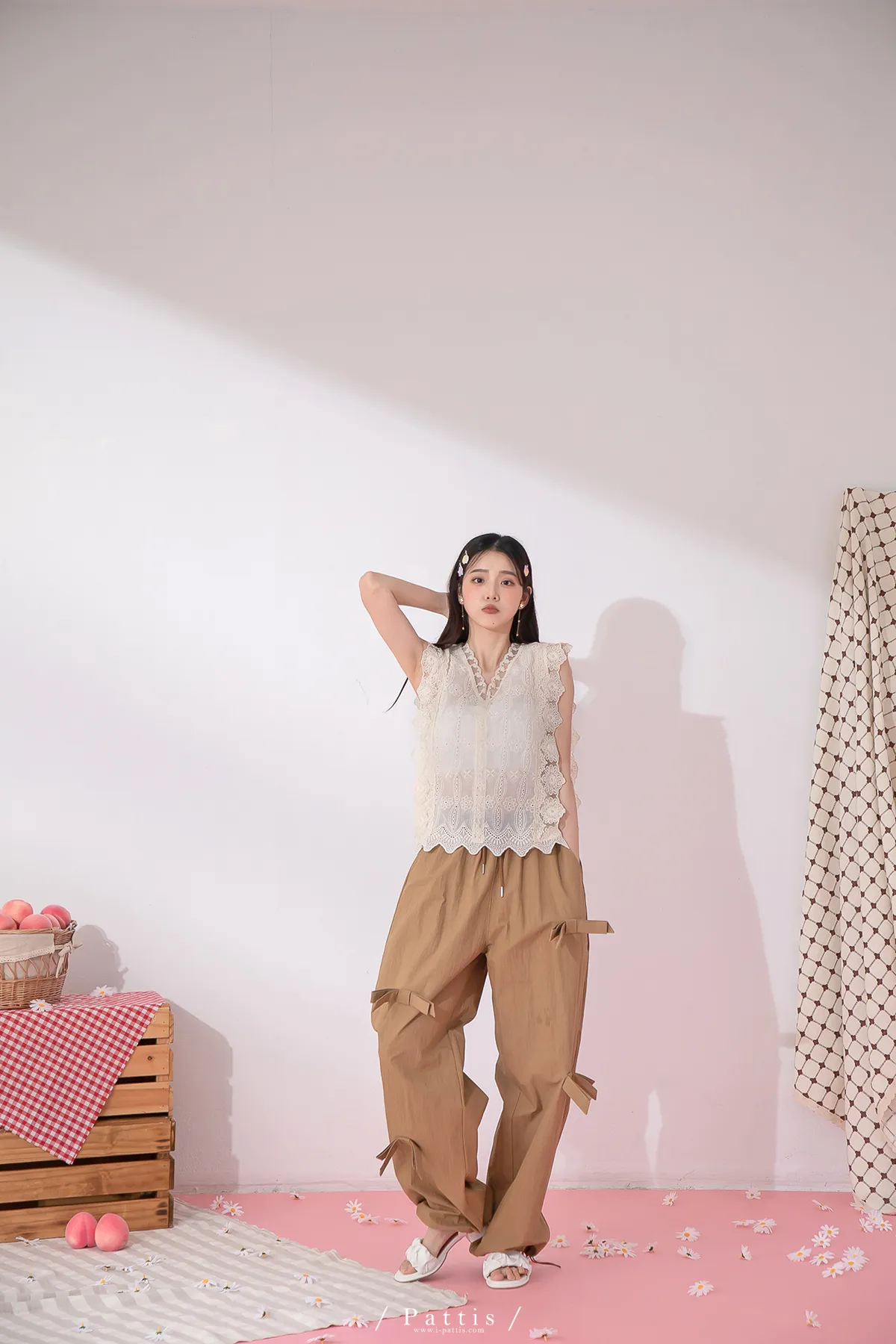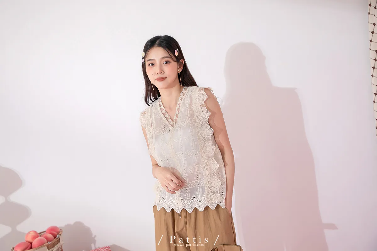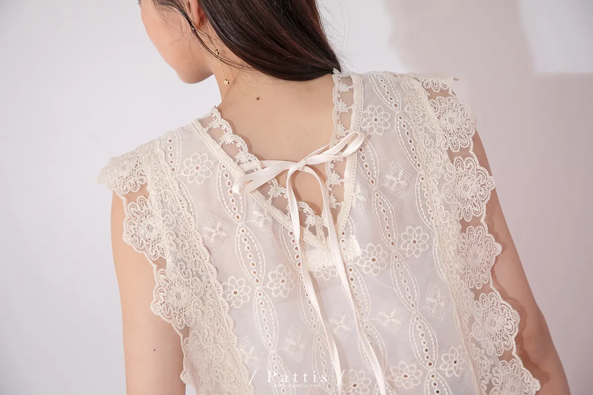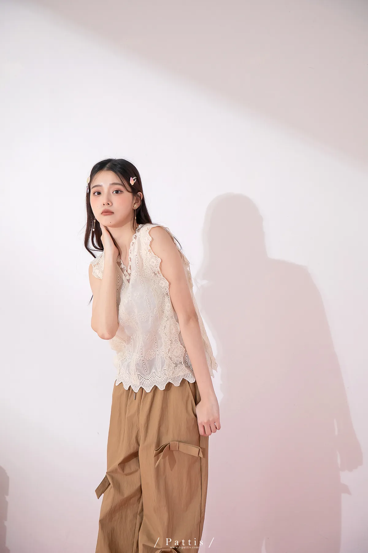 *特SALE*刺繡蕾絲V領綁帶上衣(單一色)