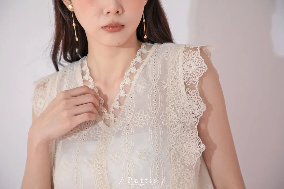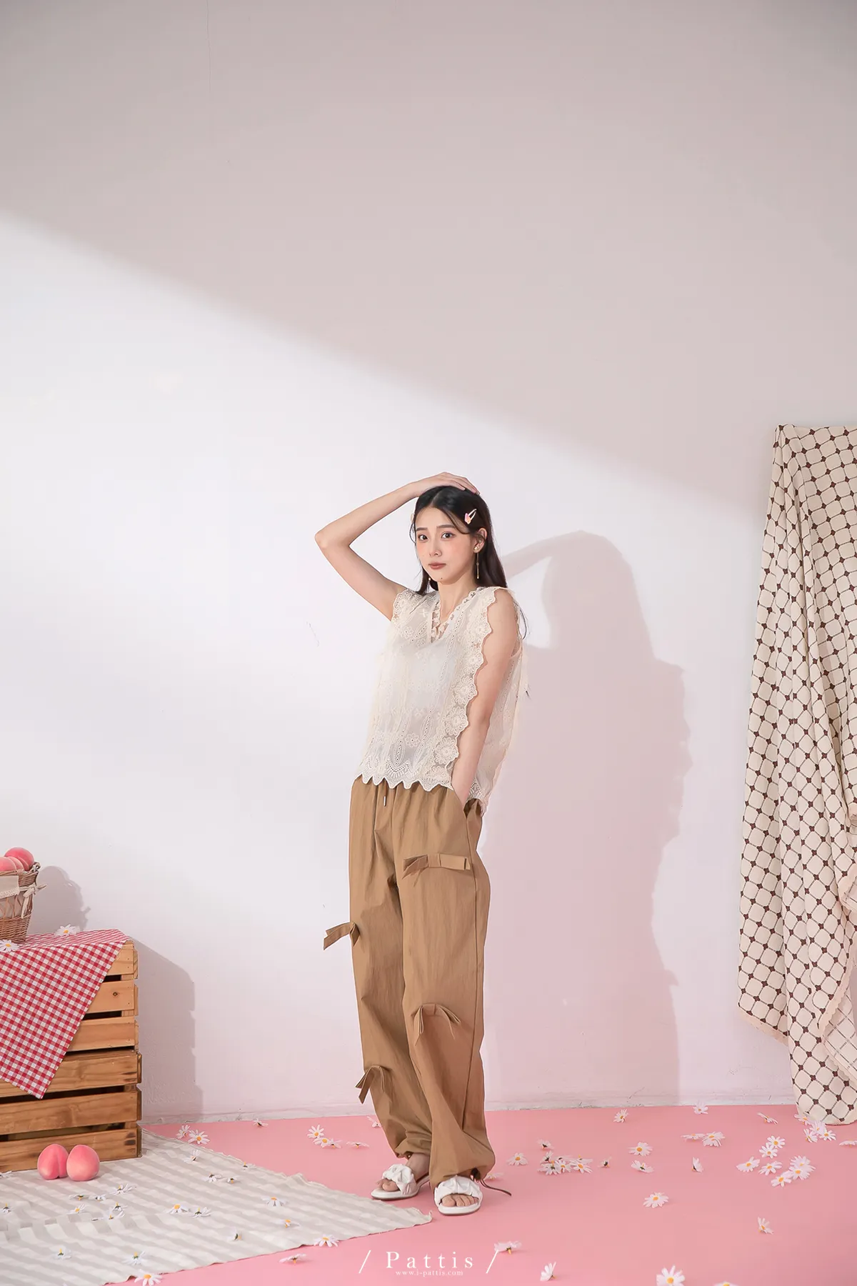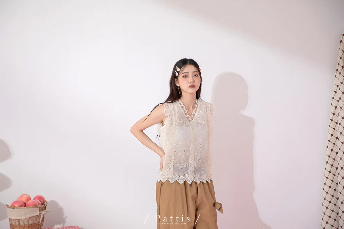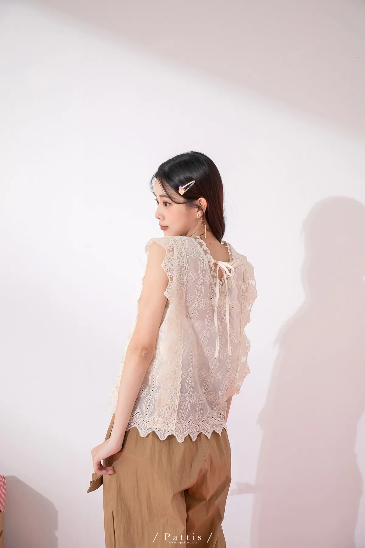 *特SALE*刺繡蕾絲V領綁帶上衣(單一色)