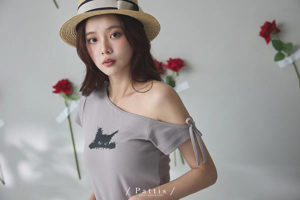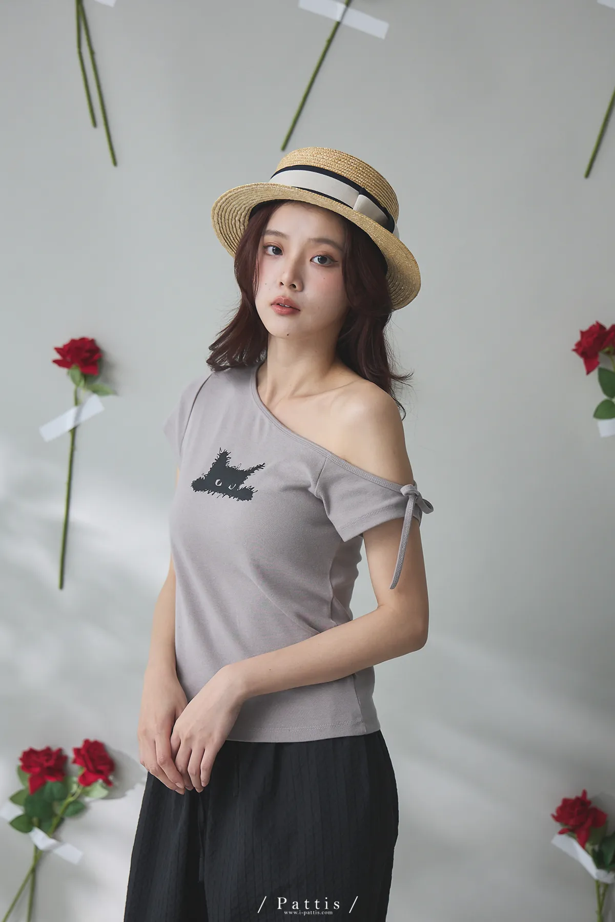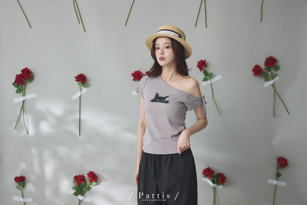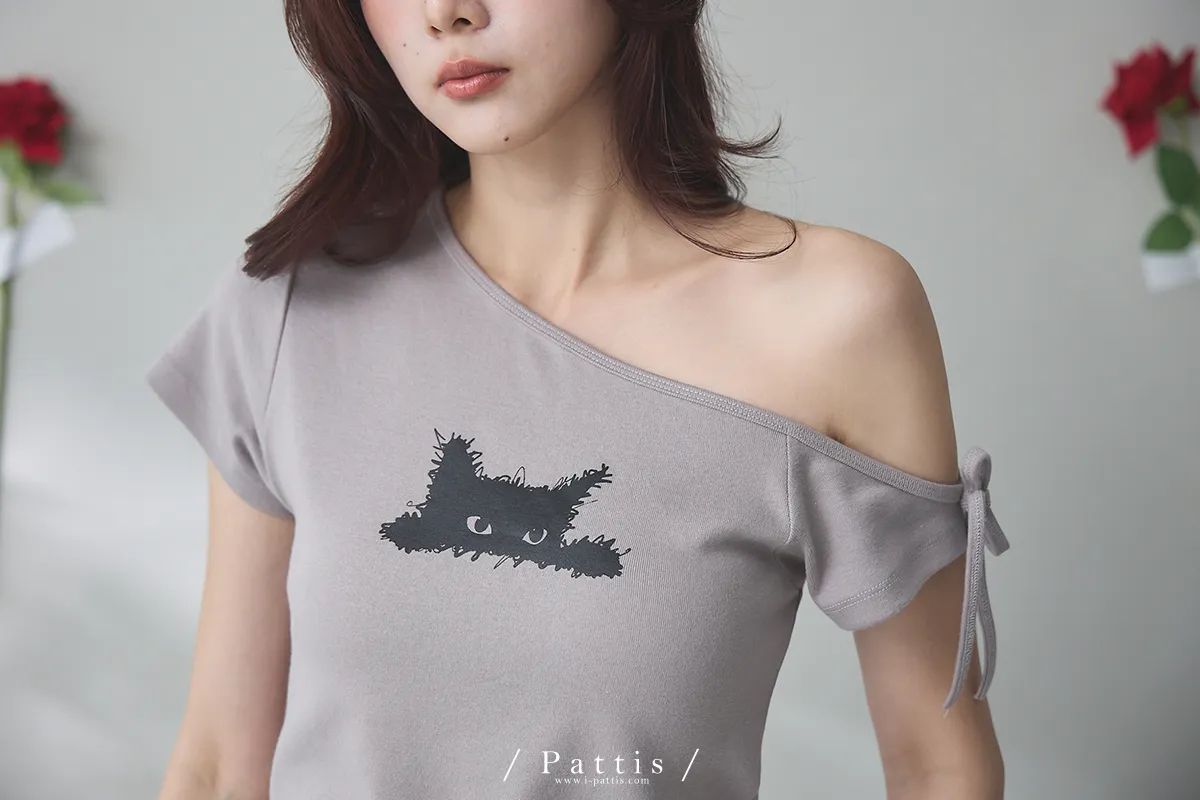 (現貨) 眼睛會是一顆顆星辰 | 小黑貓斜肩綁帶短上衣(灰杏)