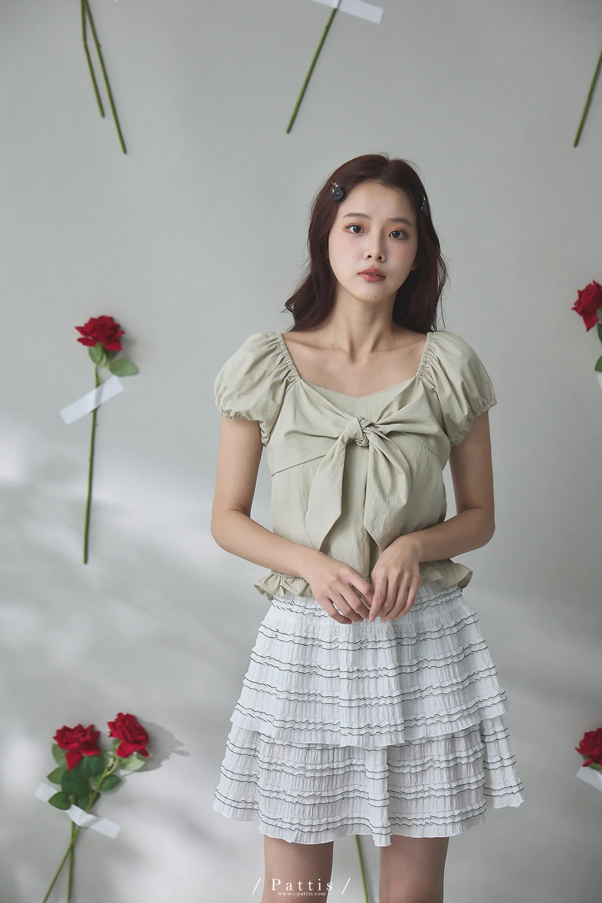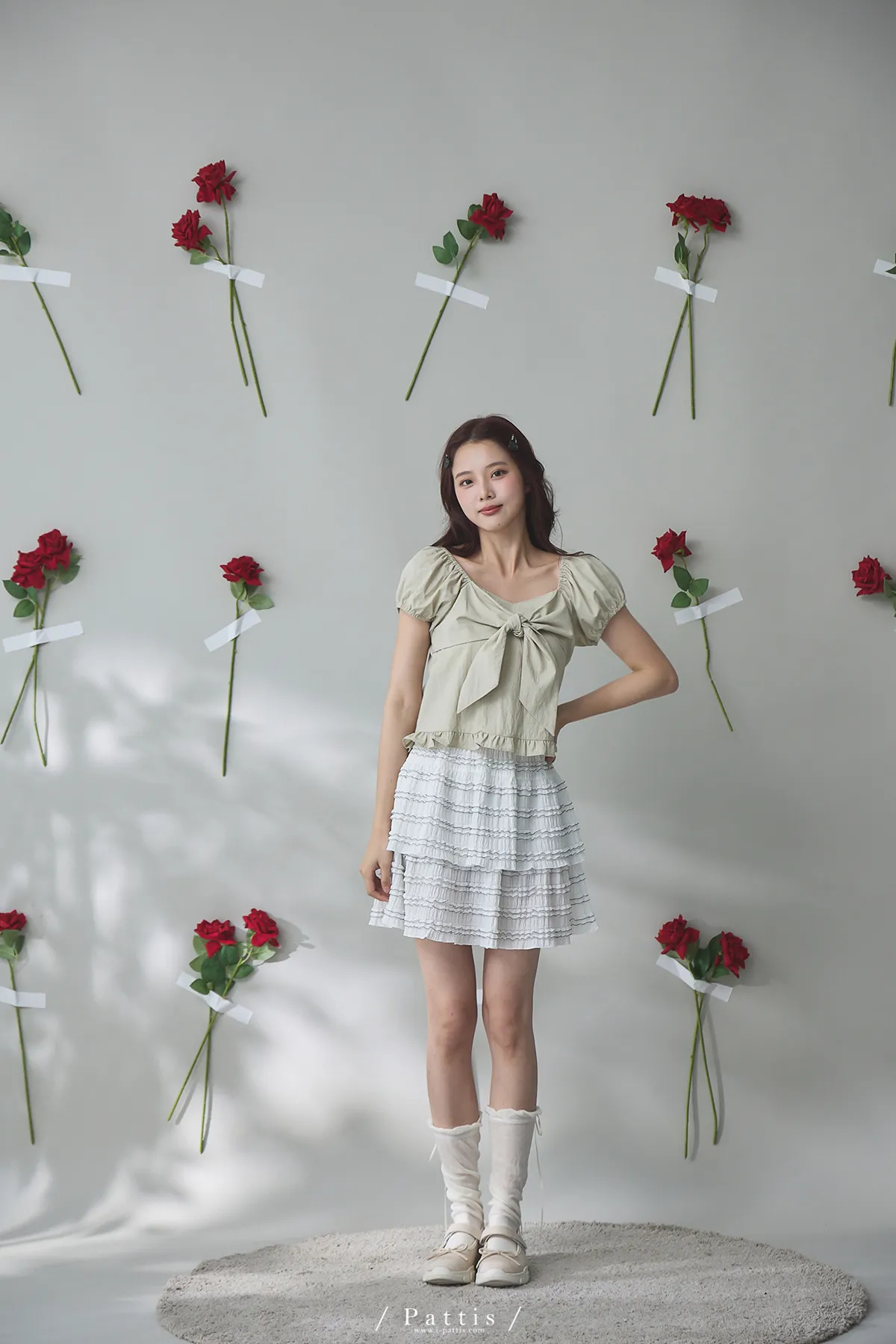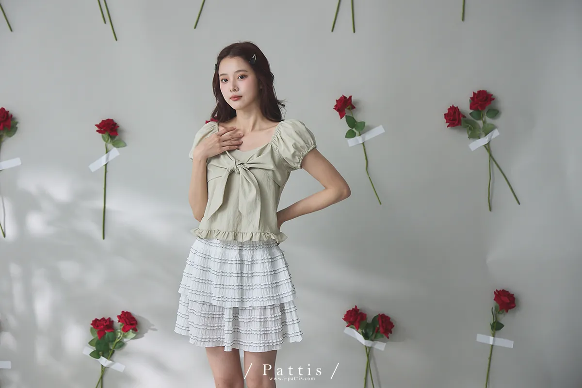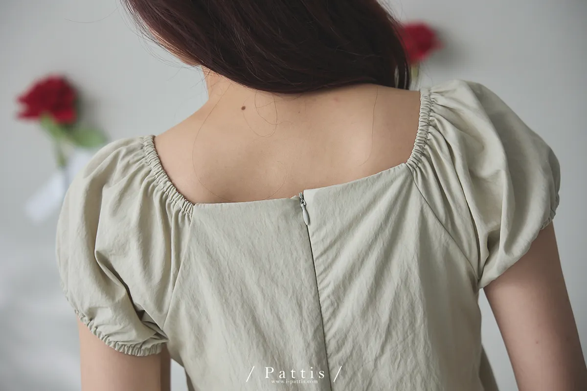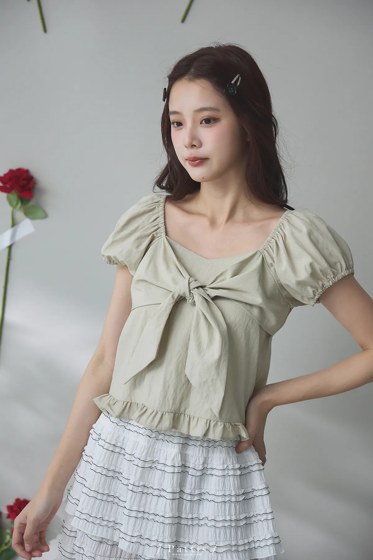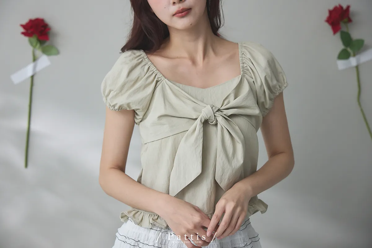 (現貨) 收到一束洋桔梗 | 蓬袖蝴蝶結2way一字領短袖上衣(灰綠)