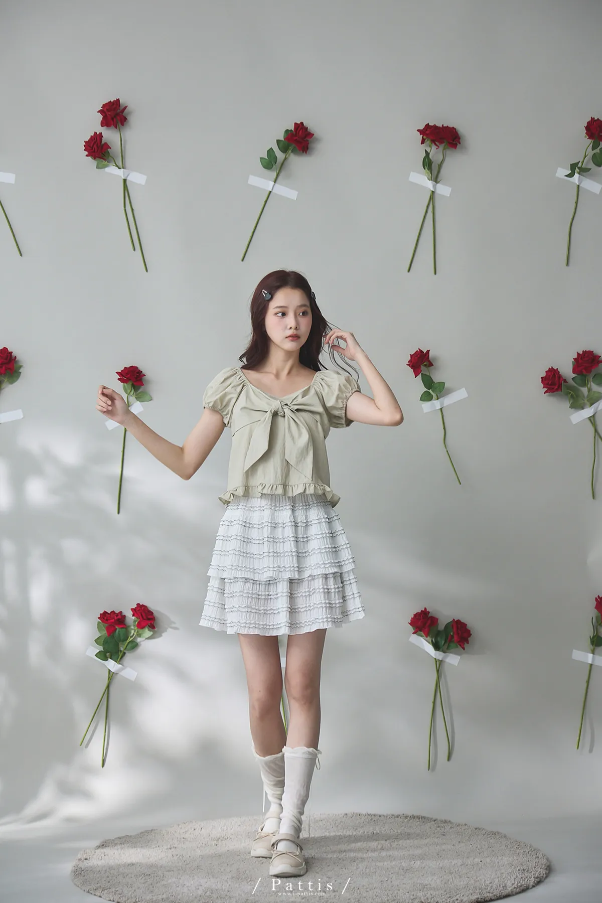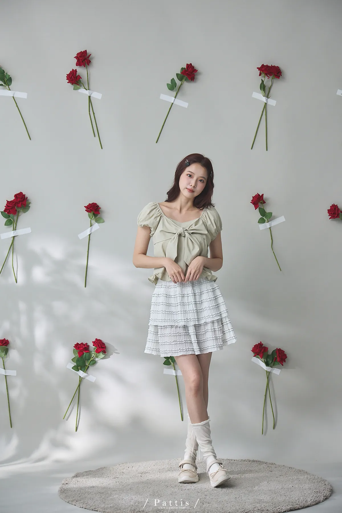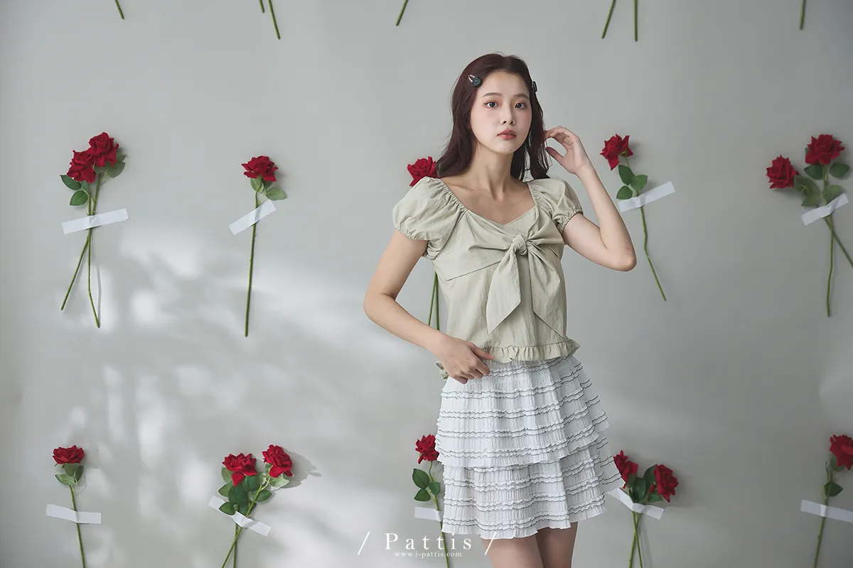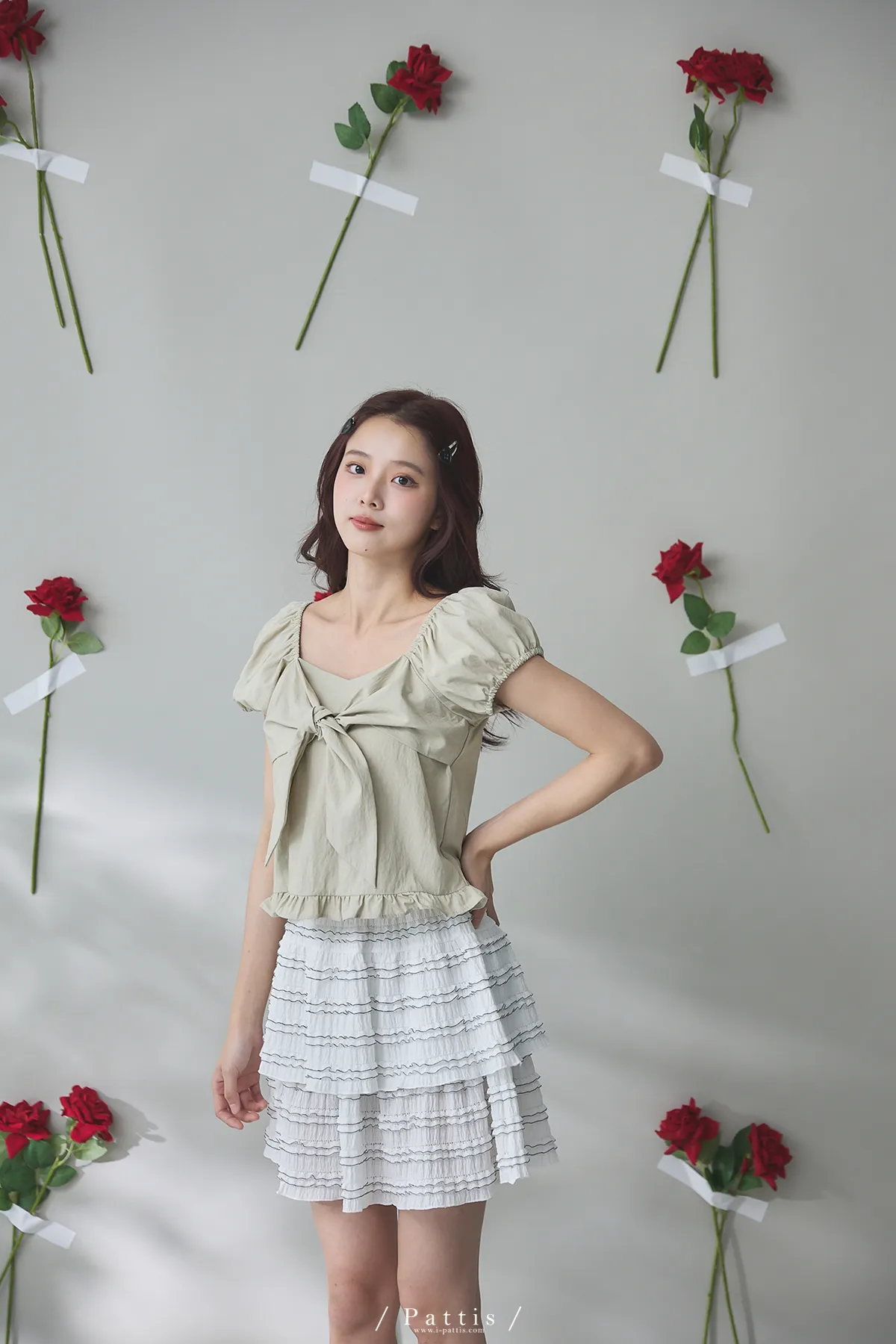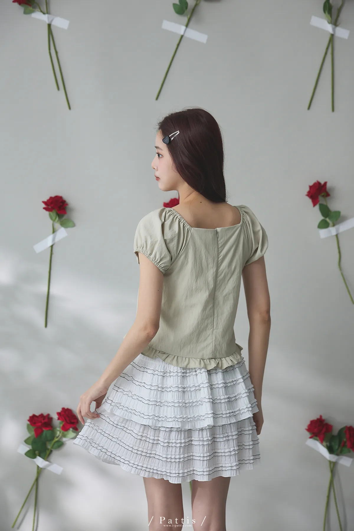 (現貨) 收到一束洋桔梗 | 蓬袖蝴蝶結2way一字領短袖上衣(灰綠)