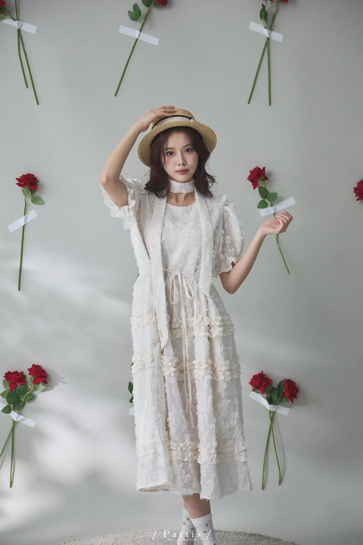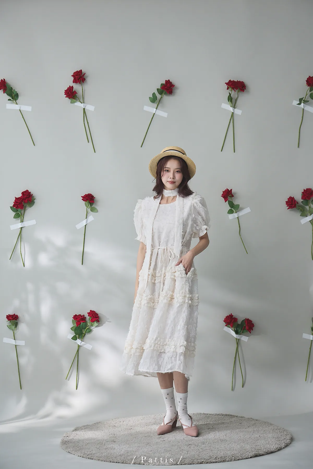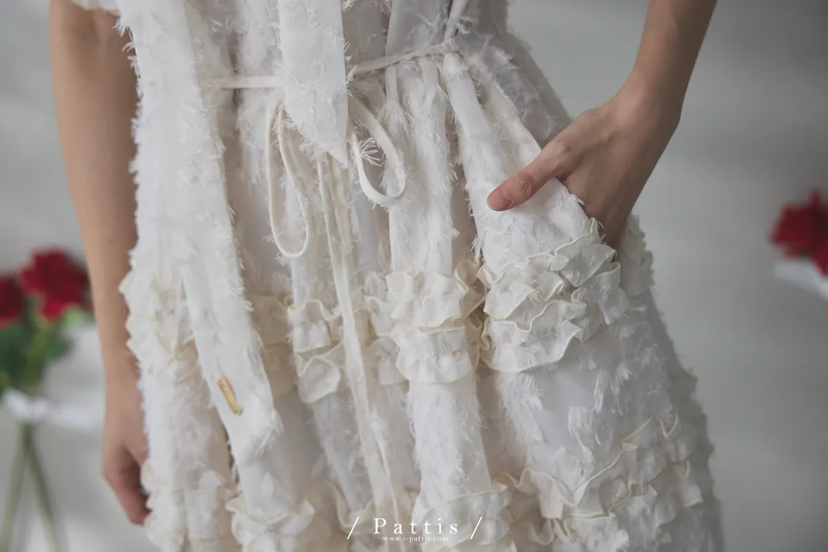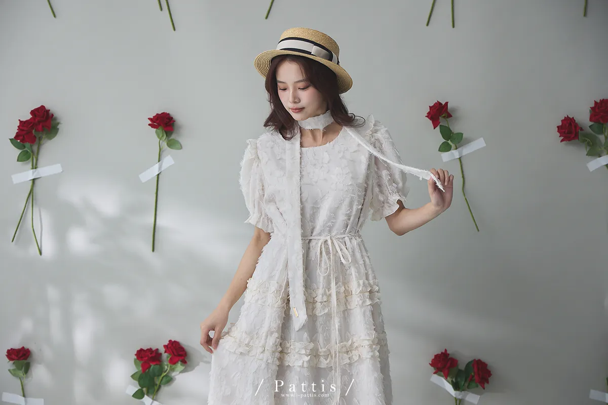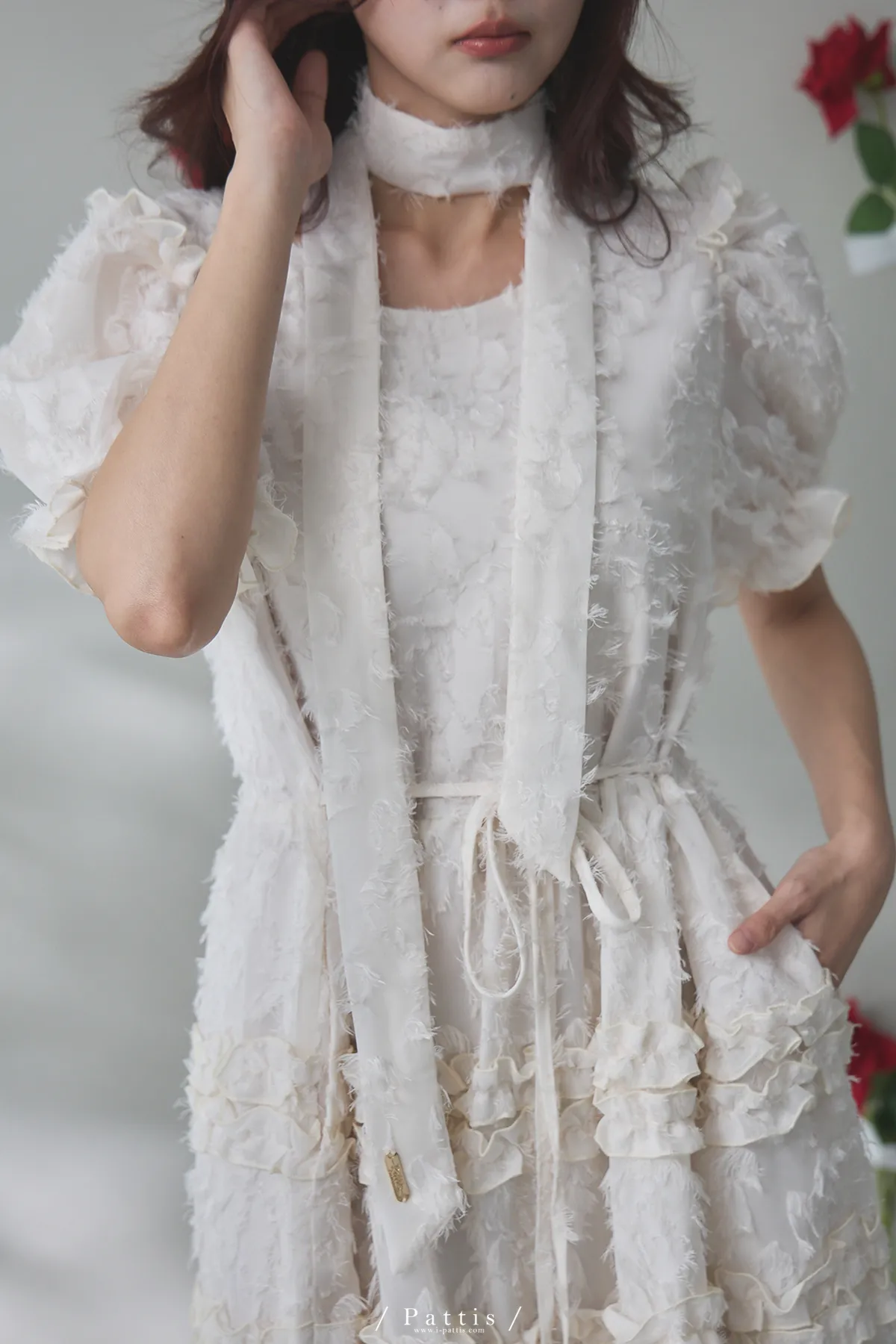 摘一朵花作為簽名檔 | 羽毛浮雕印花蓬袖綁帶荷葉洋裝(白晝月光)